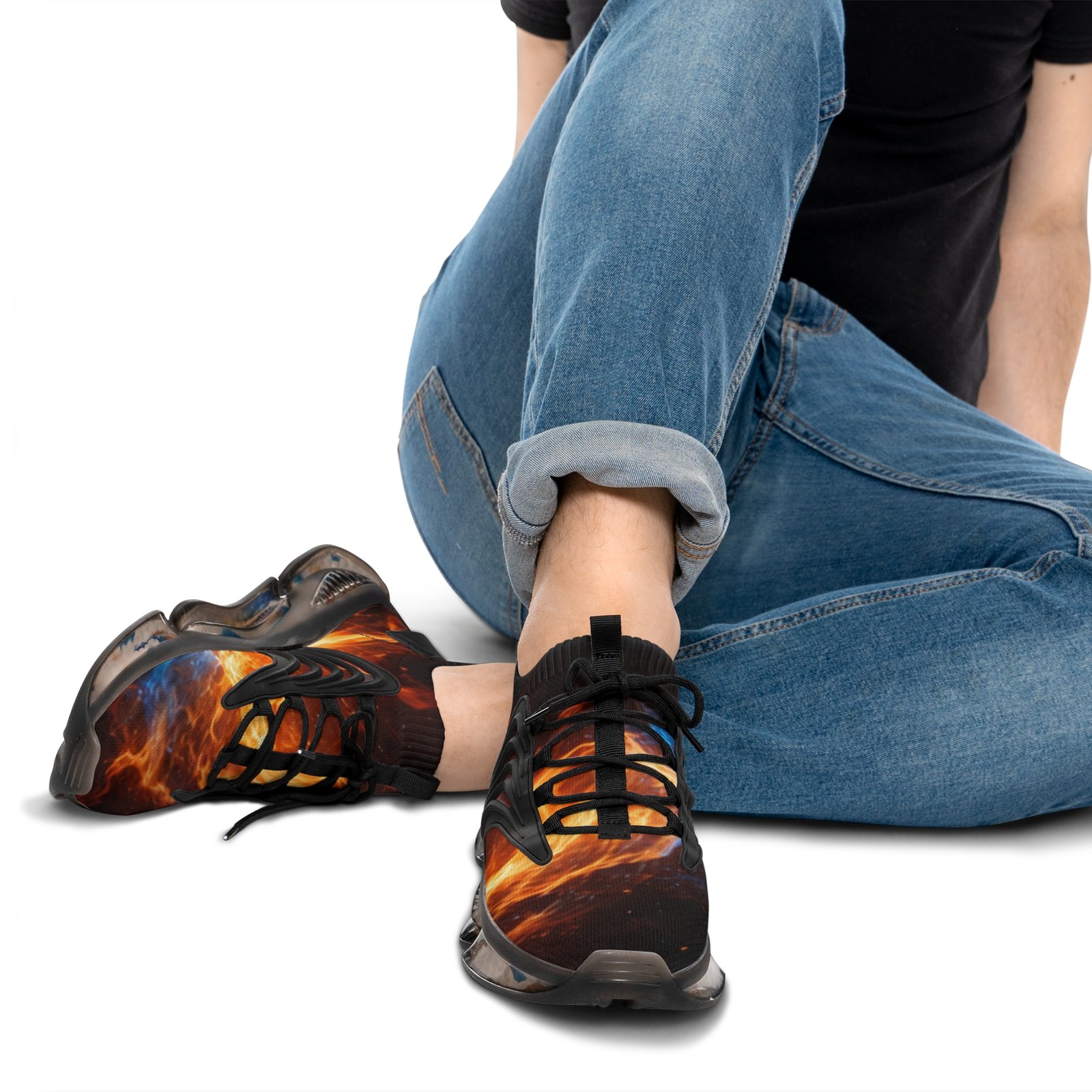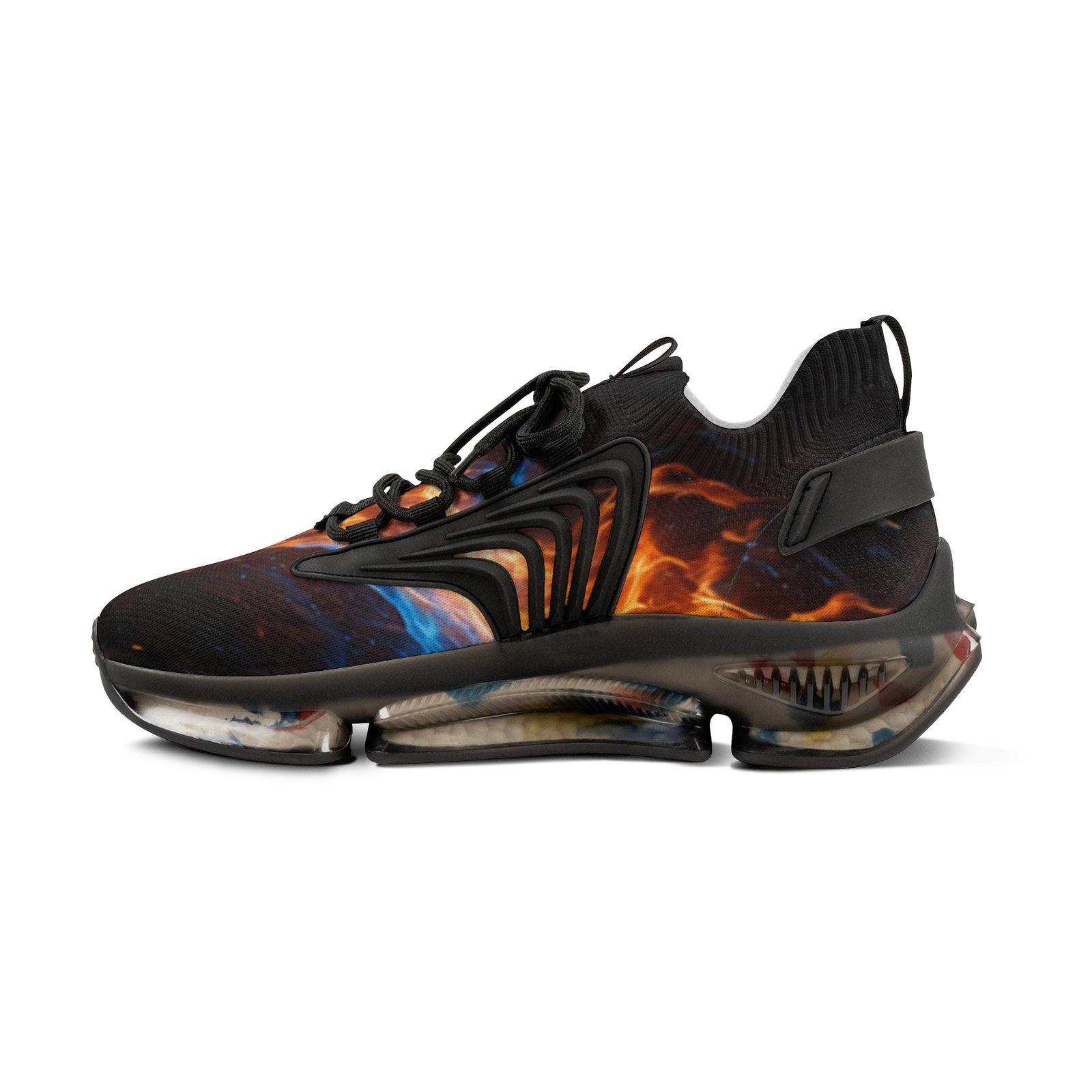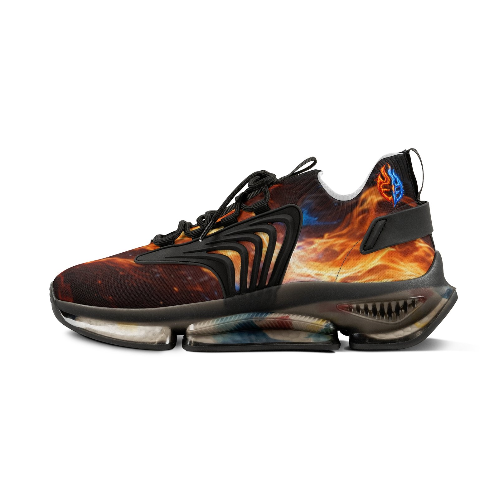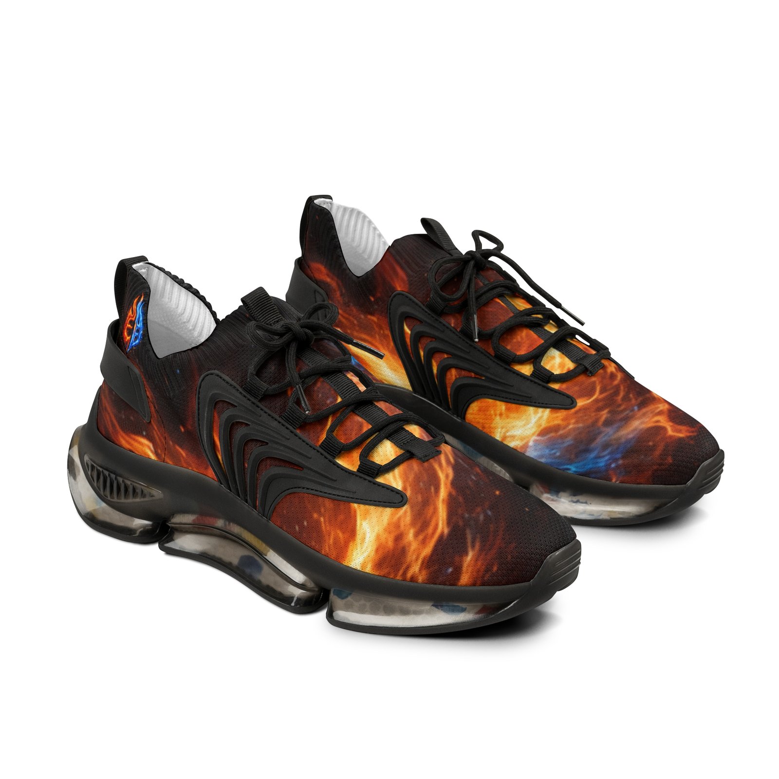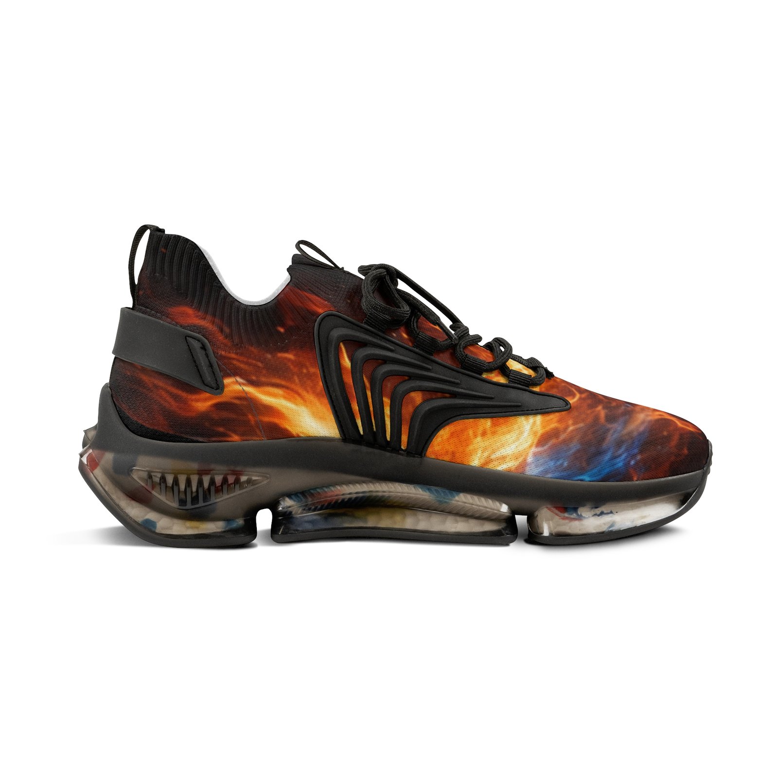 Lightweight mesh sneakers that blend bold, dynamic graphics with everyday comfort. The breathable knit upper carries an all-over fiery print that feels energetic and expressive. A soft, deodorant memory-foam insole cushions each step and helps keep feet cool. The EVA-backed sole with TPU shock-absorbing layer adds flexible support while KPU overlays reinforce high-wear areas for weather-ready durability. Clean lace-up styling and contrasting black or white detailing let the design pop, whether you’re pacing city streets or heading out for a weekend of creative errands. Product features – All-over print on breathable mesh-knit polyester upper – Deodorant memory-foam insole for breathability and cushioning – EVA + TPU sole with shock-absorbing layer for lightweight support – Durable KPU (polyurethane elastomer) decorative overlays – Lace-up closure with black or white detailing and matching stitching Care instructions – To maintain clean, use warm water with dish soap to clean off any dirt spots. It’s not necessary to soak the whole item. For hard-to-clean spots, use a soft-bristled brush.