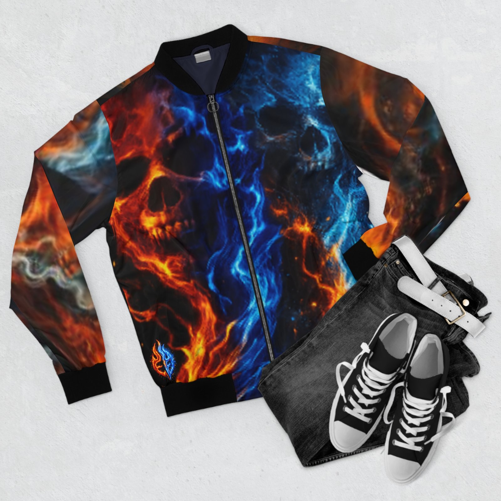 A bold, all-over print bomber that brings heat and edge to street-ready outfits. Vivid flames and skulls wrap the jacket in high-contrast orange and blue, creating a living, smoky scene that moves with you. The rib knit collar, cuffs and hem add structure while a full metal zipper and lined welt pockets give practical polish. Wear it to stand out at night rides, shows, or when you want a sharp, rebellious layer that feels lived-in from the first wear.