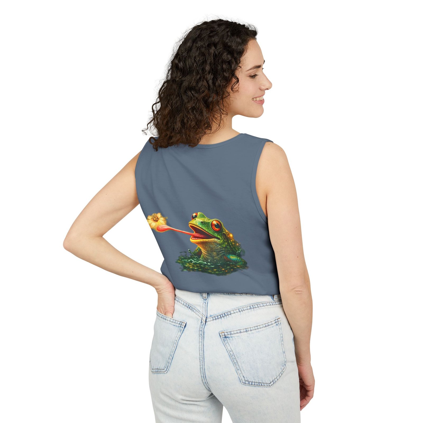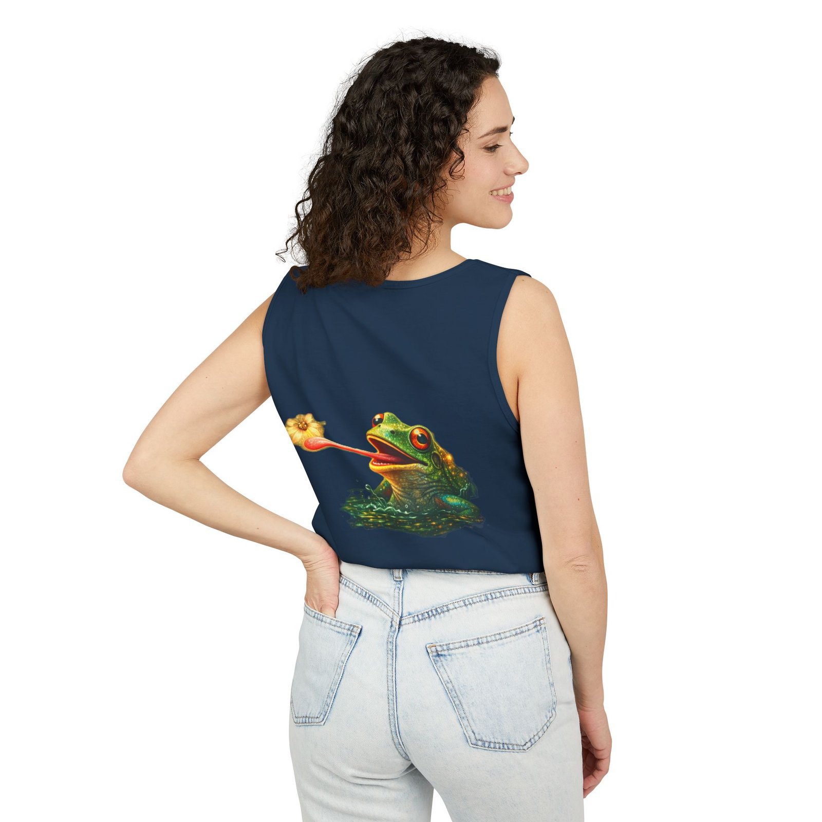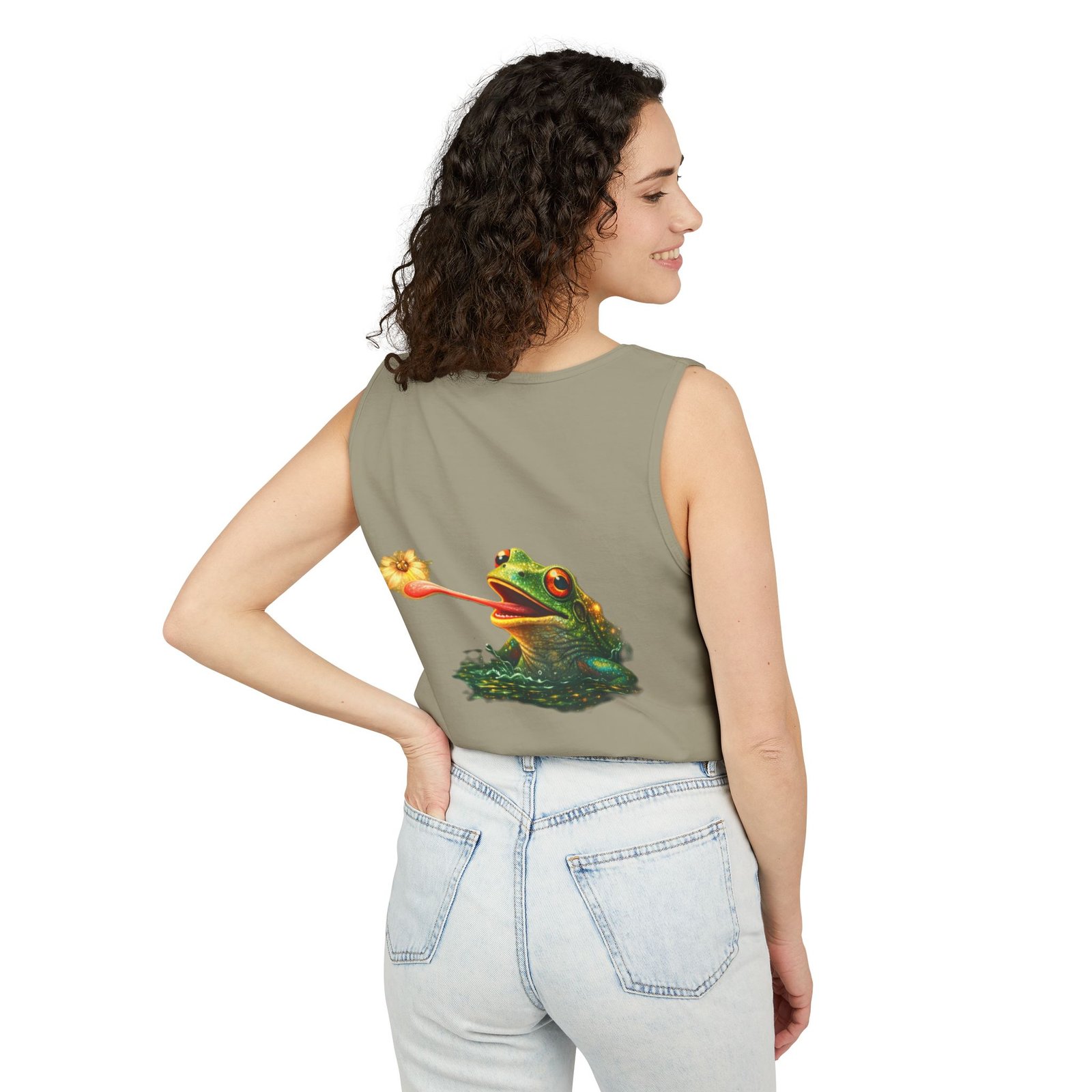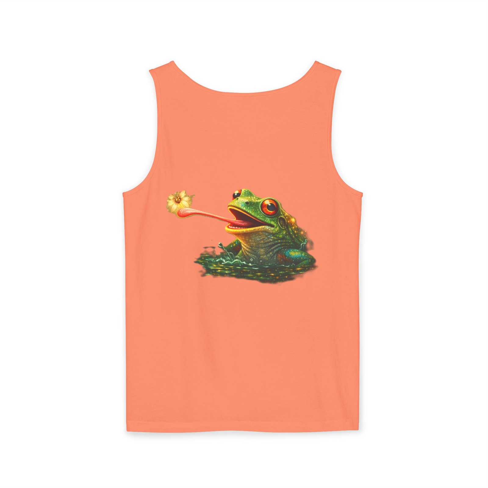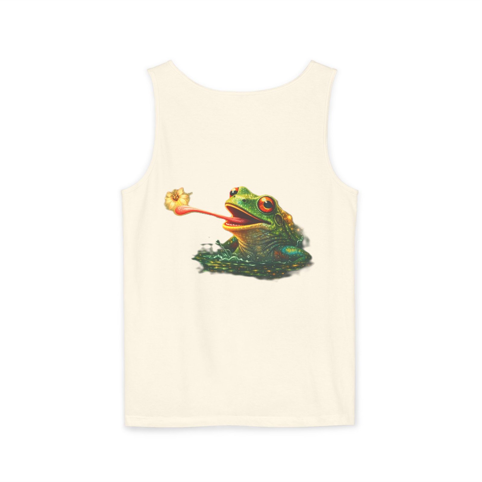 Light, breathable, and quietly playful — this garment-dyed tank brings a sunlit, outdoorsy vibe to slow afternoons and warm-weather adventures. A small crest on the chest hints at woodland mischief, while the back features a vivid frog mid-snap, tongue stretched toward a tiny golden prize. It sits relaxed across the shoulders and moves with you, whether you’re wandering a river trail, tending a summer garden, or lingering on a porch at dusk. The softened, lived-in color and comfortable medium-weight cotton make it easy to layer or wear on its own — a casually expressive piece for someone who loves nature, storytelling, and a little unexpected charm.