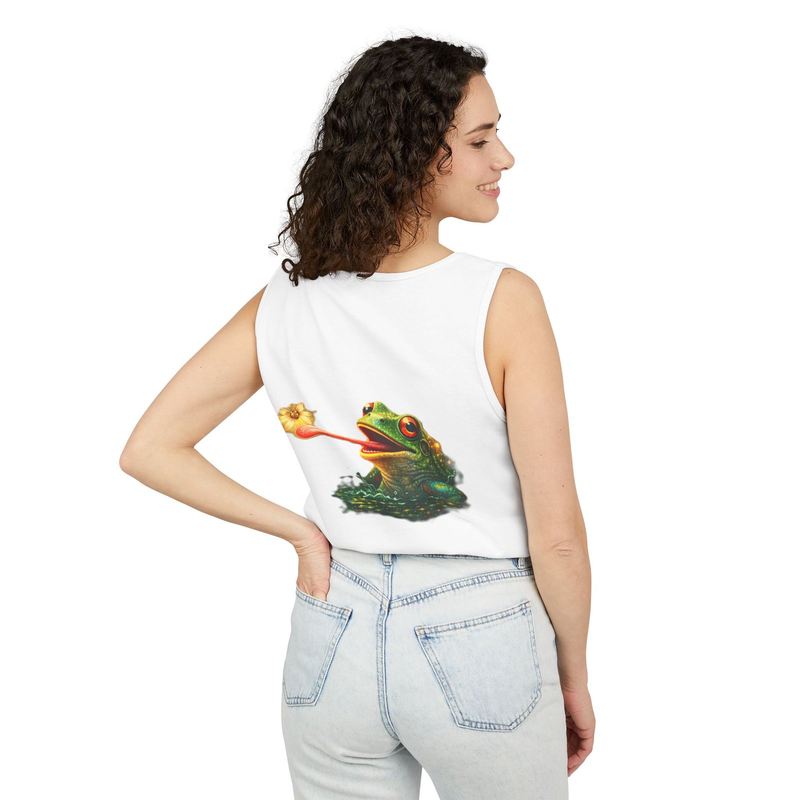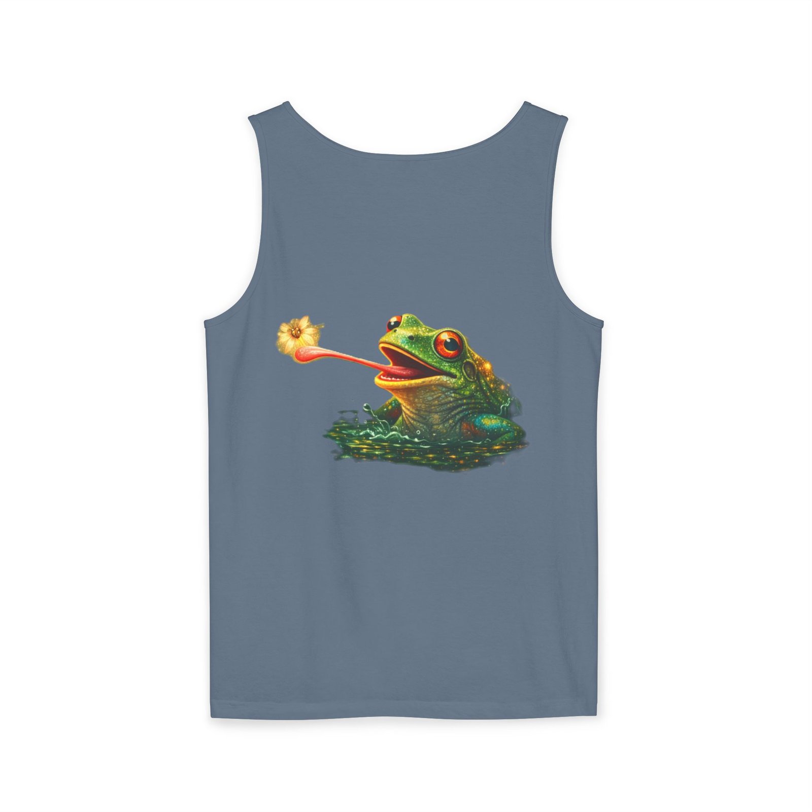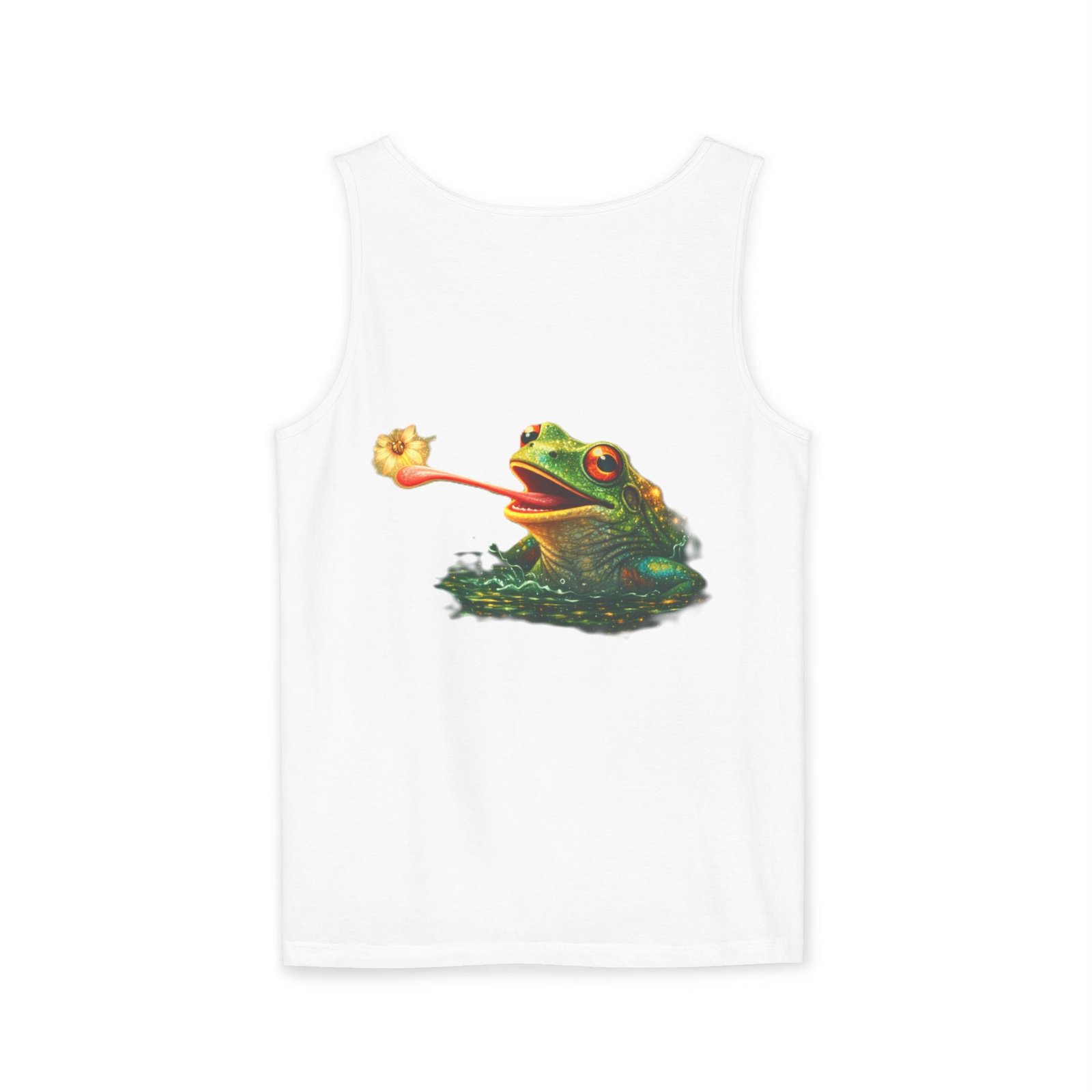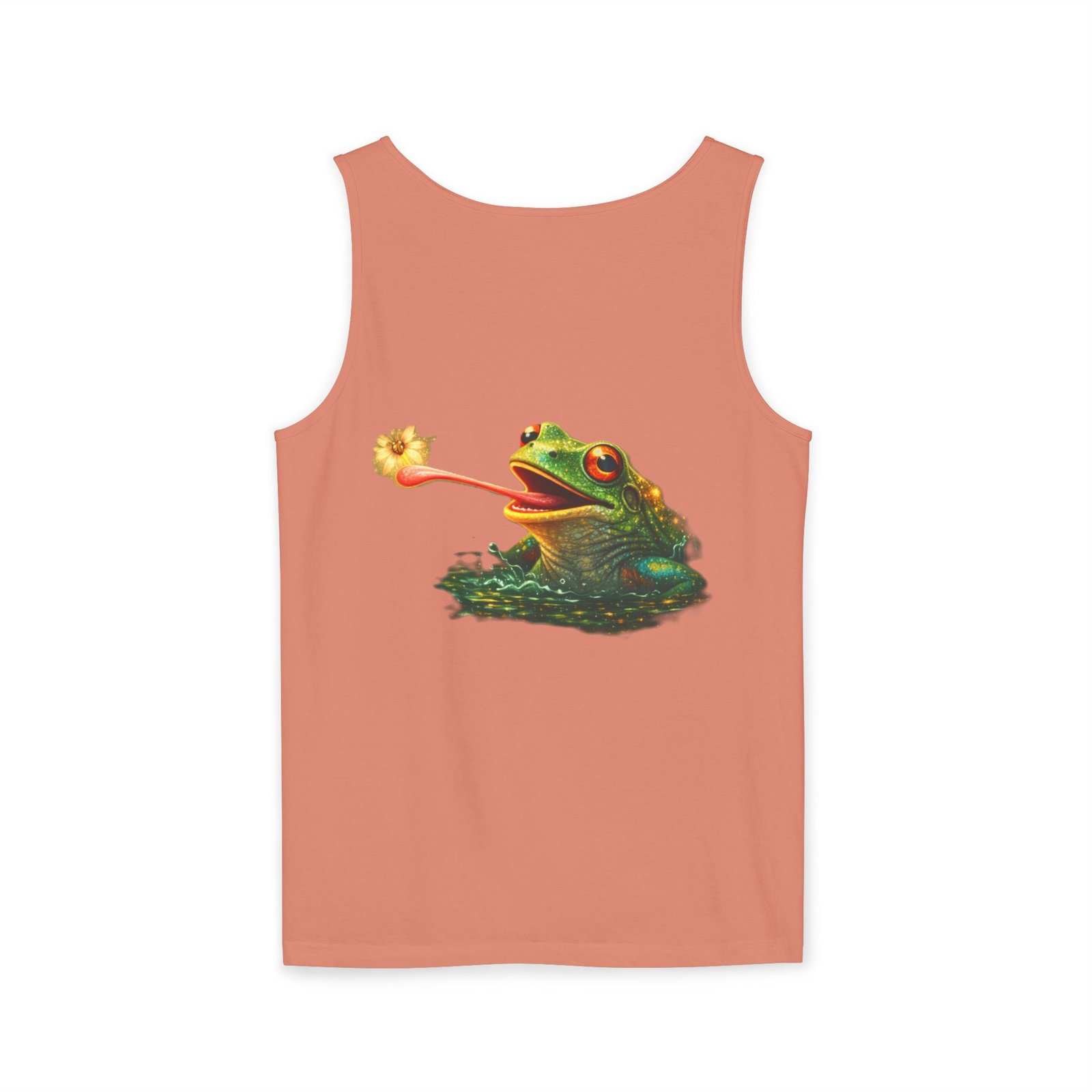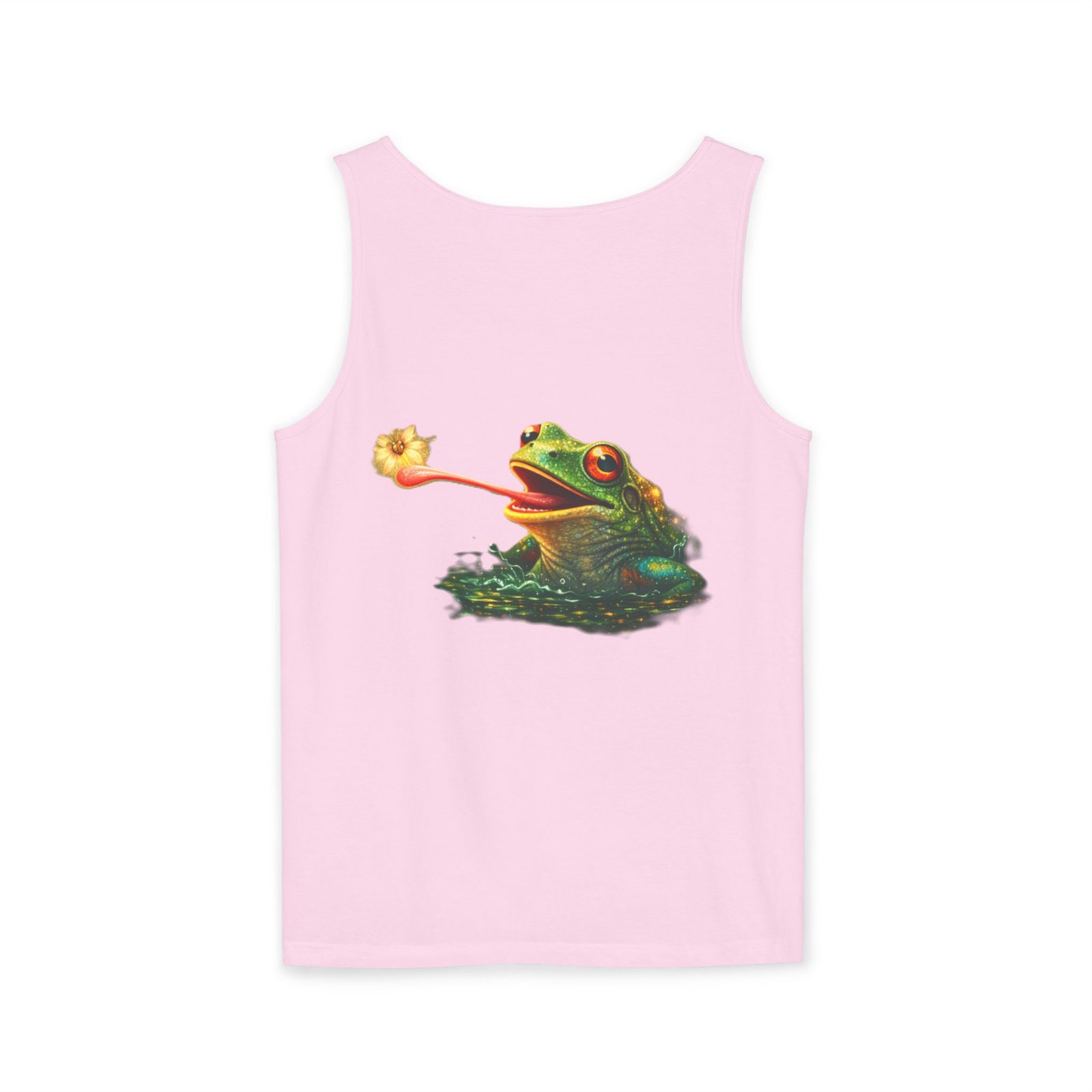 Light, breathable, and quietly playful — this garment-dyed tank brings a sunlit, outdoorsy vibe to slow afternoons and warm-weather adventures. A small crest on the chest hints at woodland mischief, while the back features a vivid frog mid-snap, tongue stretched toward a tiny golden prize. It sits relaxed across the shoulders and moves with you, whether you’re wandering a river trail, tending a summer garden, or lingering on a porch at dusk. The softened, lived-in color and comfortable medium-weight cotton make it easy to layer or wear on its own — a casually expressive piece for someone who loves nature, storytelling, and a little unexpected charm.