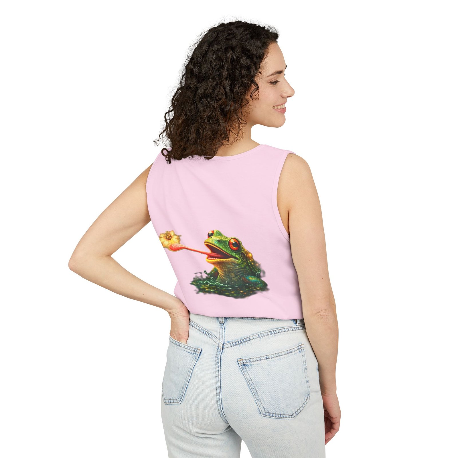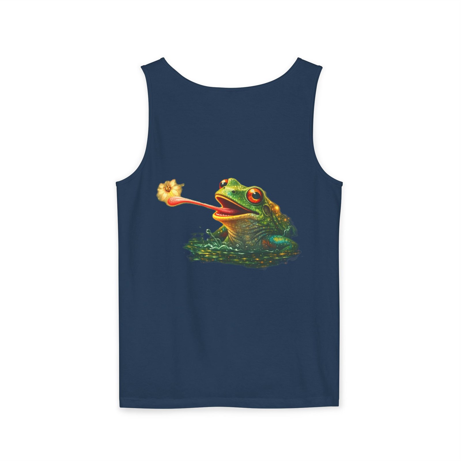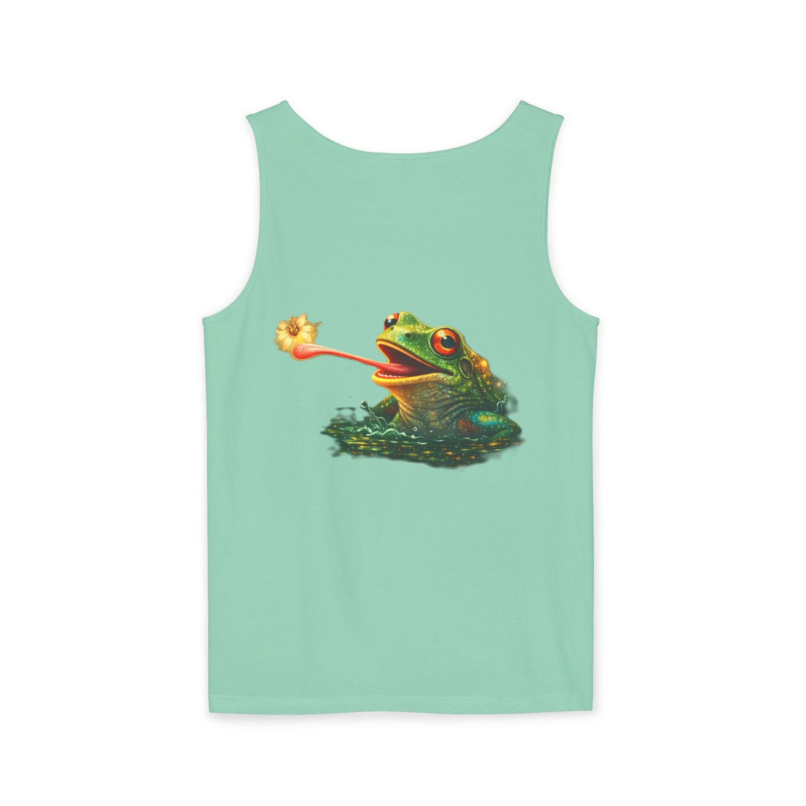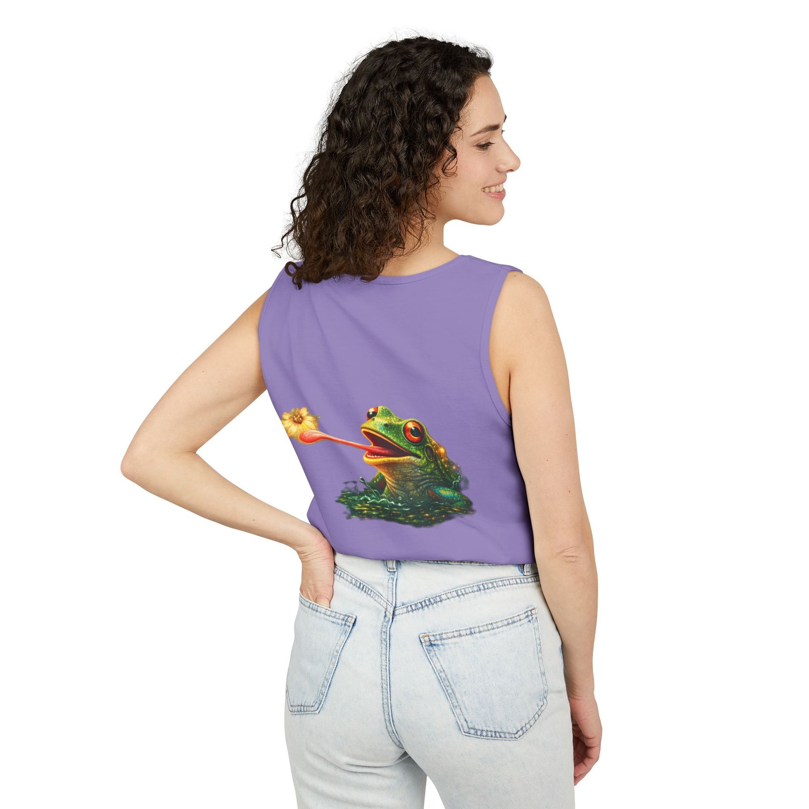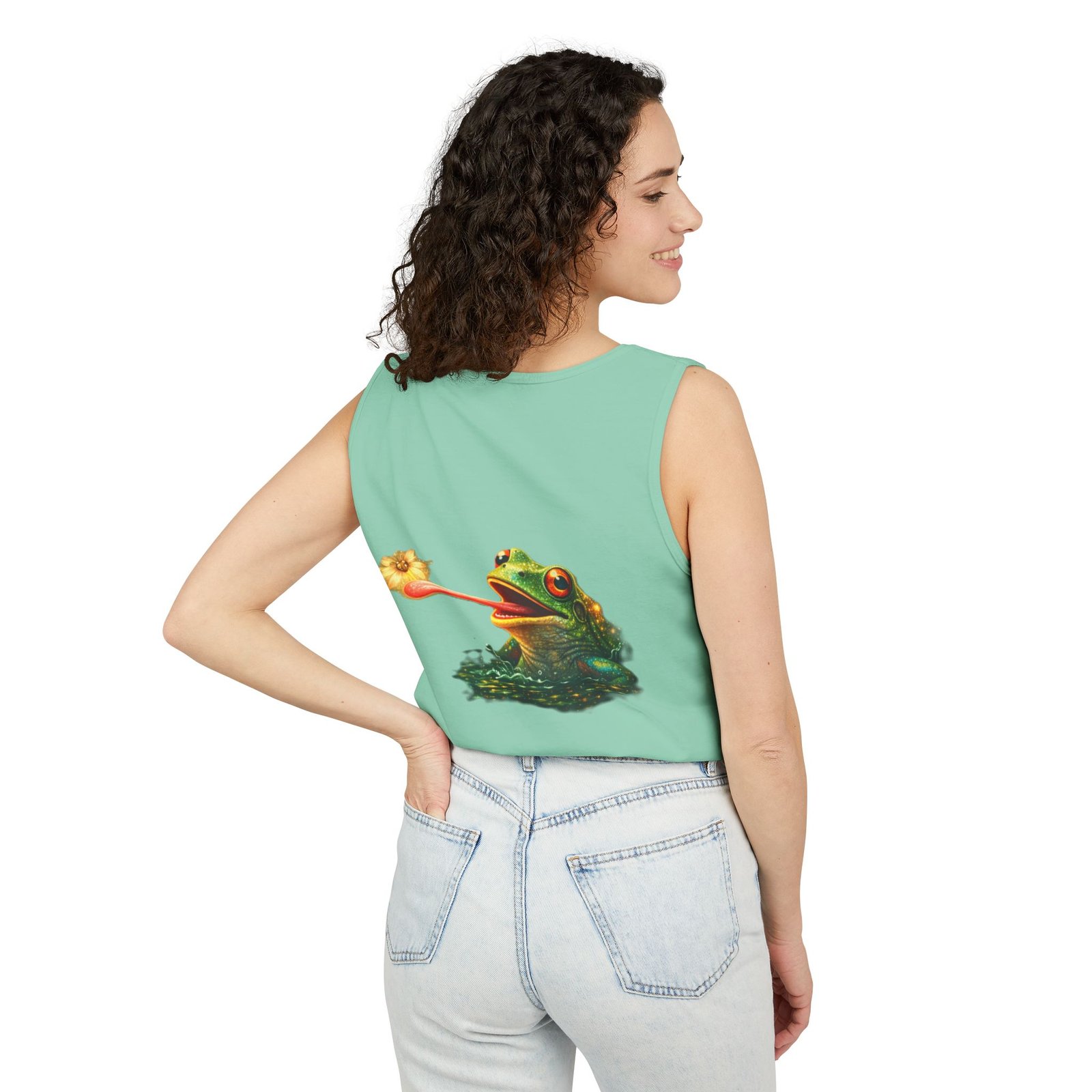 Light, breathable, and quietly playful — this garment-dyed tank brings a sunlit, outdoorsy vibe to slow afternoons and warm-weather adventures. A small crest on the chest hints at woodland mischief, while the back features a vivid frog mid-snap, tongue stretched toward a tiny golden prize. It sits relaxed across the shoulders and moves with you, whether you’re wandering a river trail, tending a summer garden, or lingering on a porch at dusk. The softened, lived-in color and comfortable medium-weight cotton make it easy to layer or wear on its own — a casually expressive piece for someone who loves nature, storytelling, and a little unexpected charm.