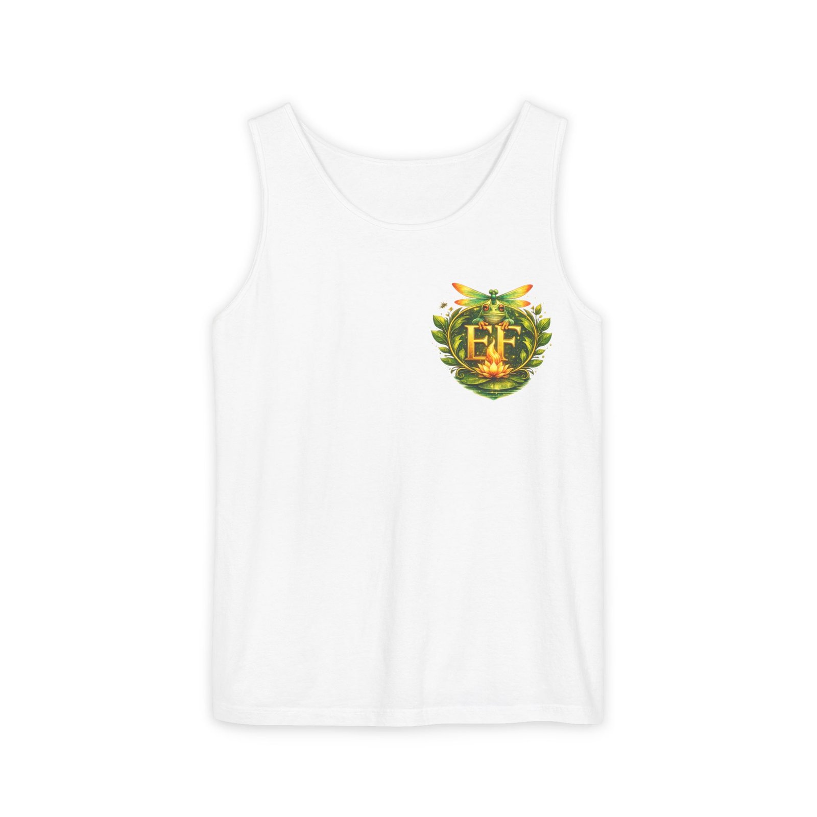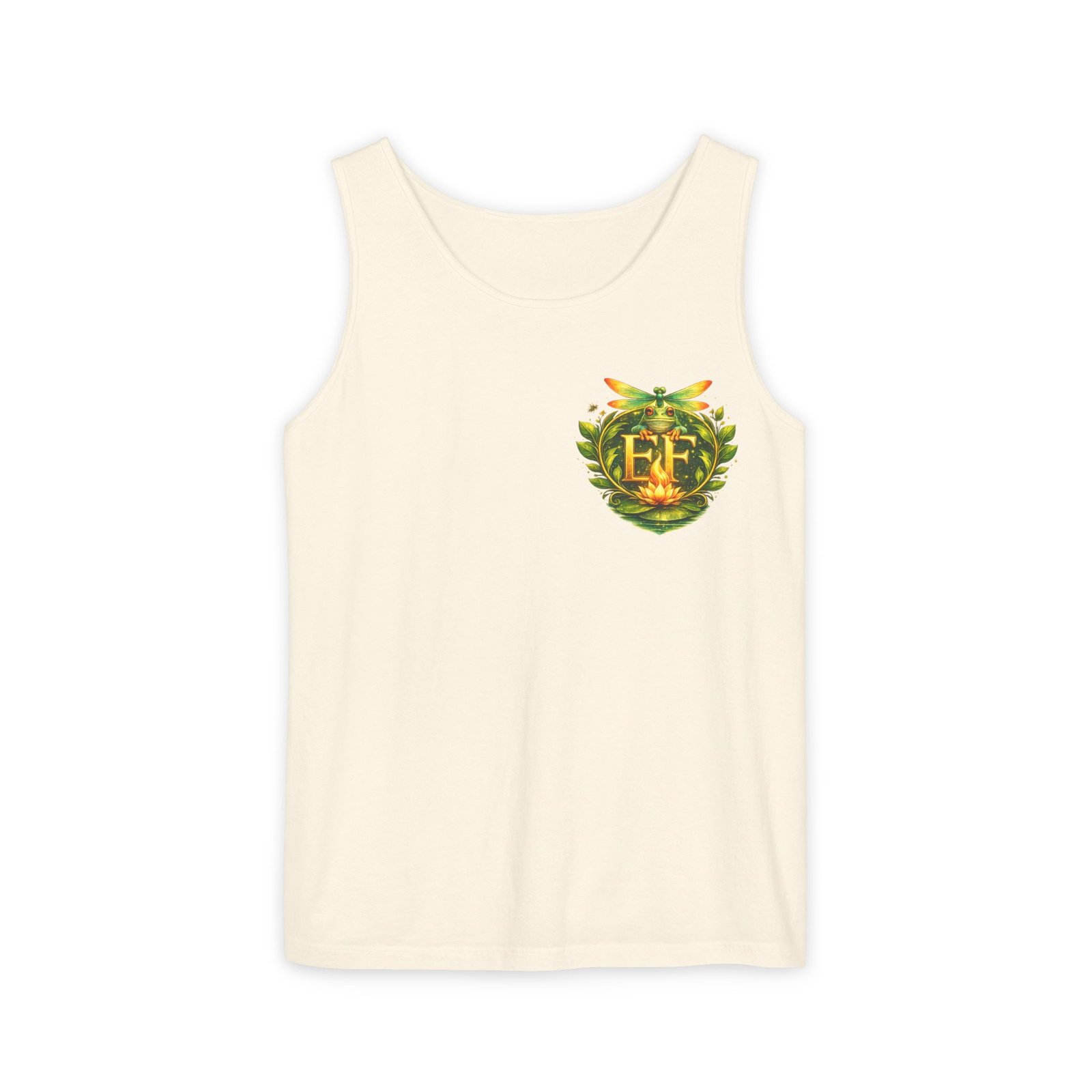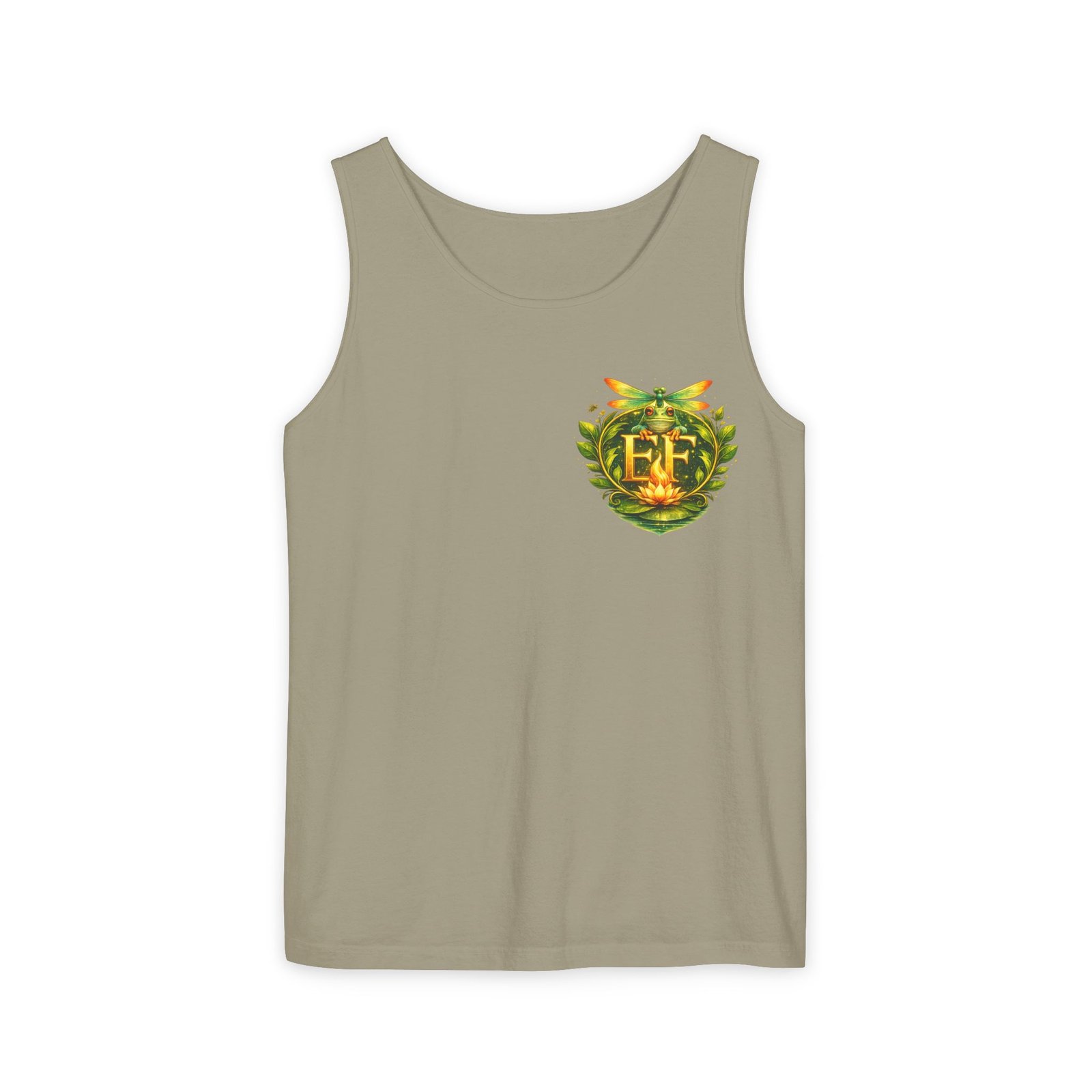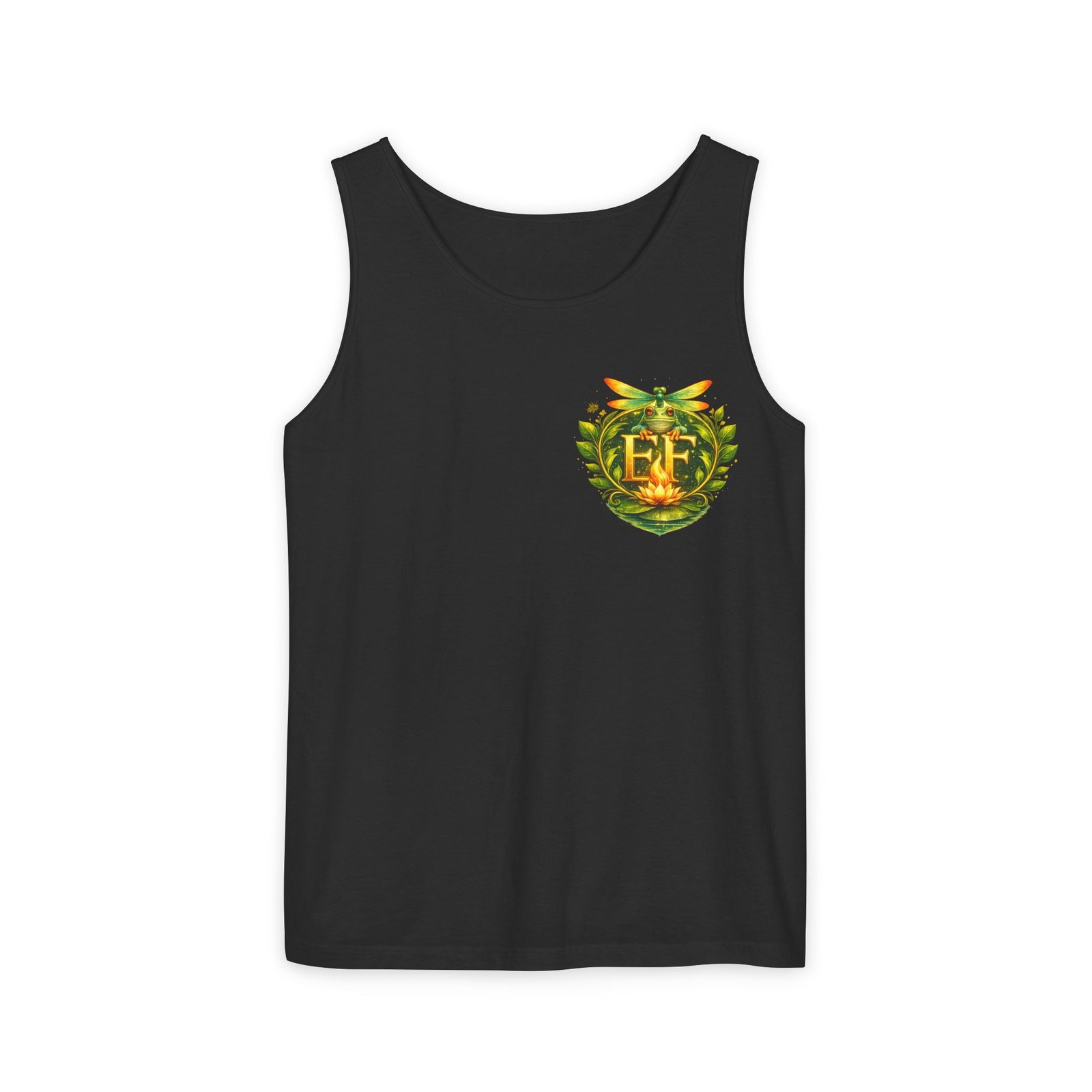Light, breathable, and quietly playful — this garment-dyed tank brings a sunlit, outdoorsy vibe to slow afternoons and warm-weather adventures. A small crest on the chest hints at woodland mischief, while the back features a vivid frog mid-snap, tongue stretched toward a tiny golden prize. It sits relaxed across the shoulders and moves with you, whether you’re wandering a river trail, tending a summer garden, or lingering on a porch at dusk. The softened, lived-in color and comfortable medium-weight cotton make it easy to layer or wear on its own — a casually expressive piece for someone who loves nature, storytelling, and a little unexpected charm.
