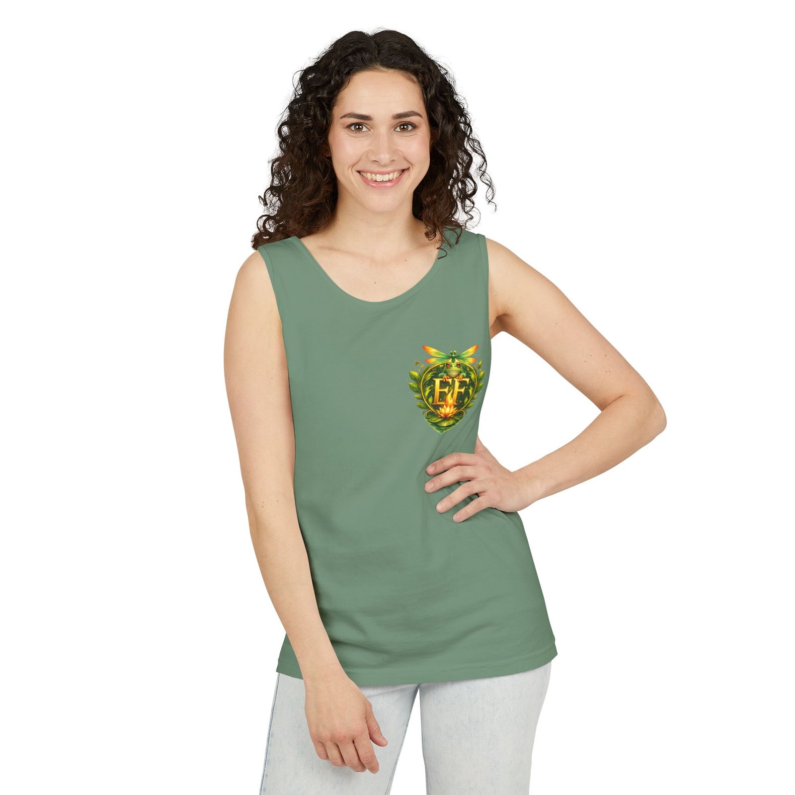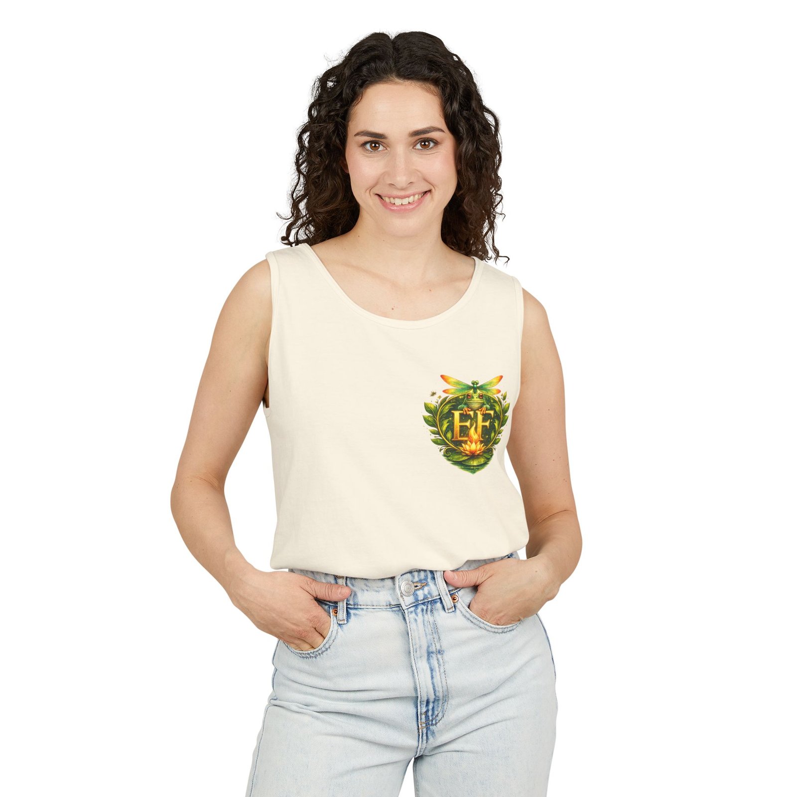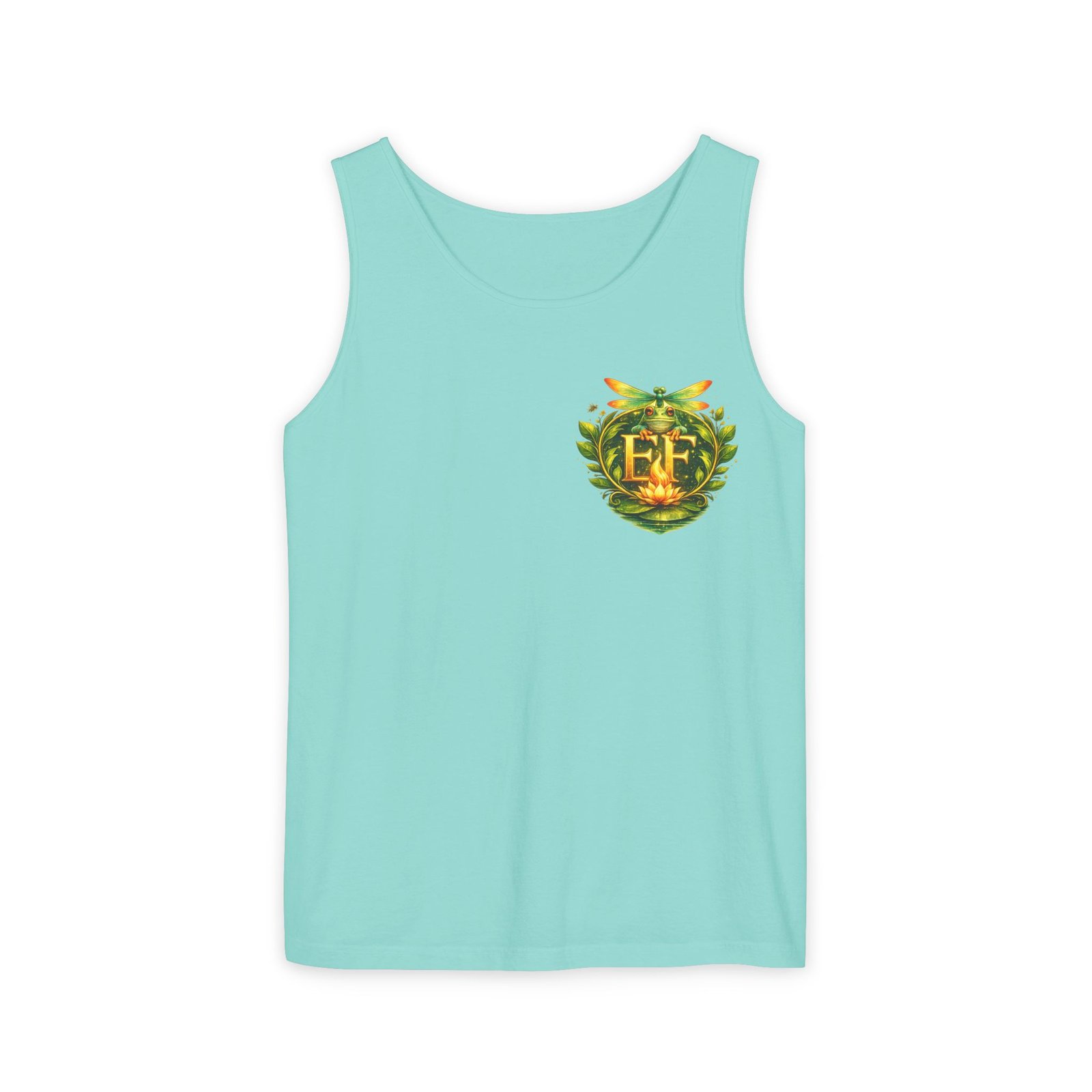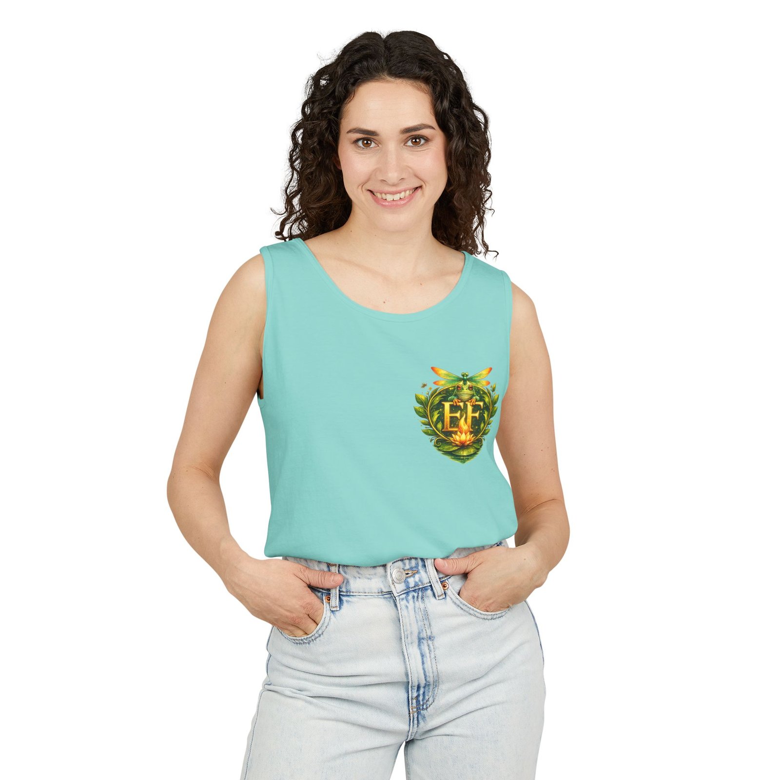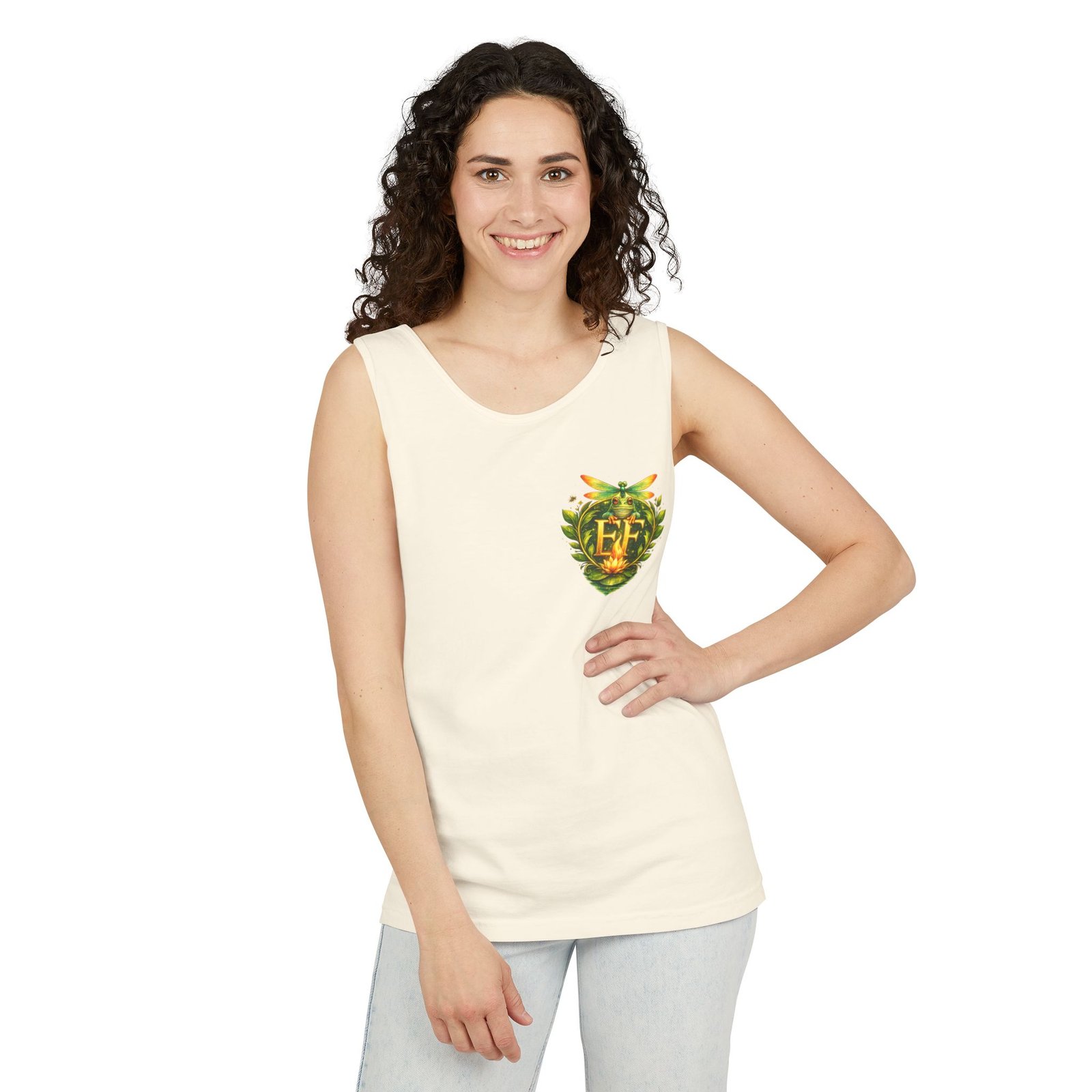 Light, breathable, and quietly playful — this garment-dyed tank brings a sunlit, outdoorsy vibe to slow afternoons and warm-weather adventures. A small crest on the chest hints at woodland mischief, while the back features a vivid frog mid-snap, tongue stretched toward a tiny golden prize. It sits relaxed across the shoulders and moves with you, whether you’re wandering a river trail, tending a summer garden, or lingering on a porch at dusk. The softened, lived-in color and comfortable medium-weight cotton make it easy to layer or wear on its own — a casually expressive piece for someone who loves nature, storytelling, and a little unexpected charm.
