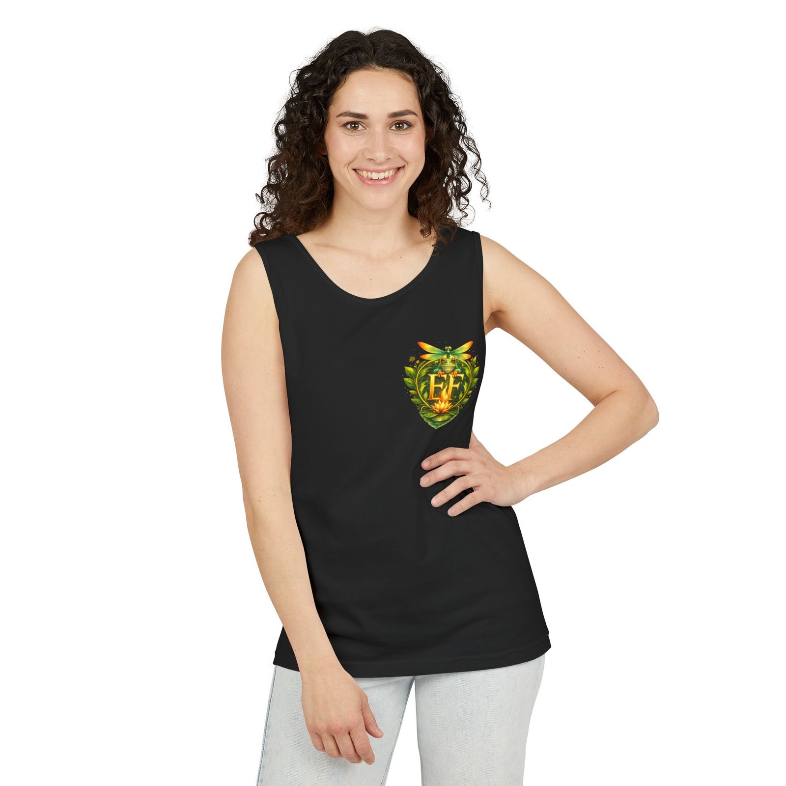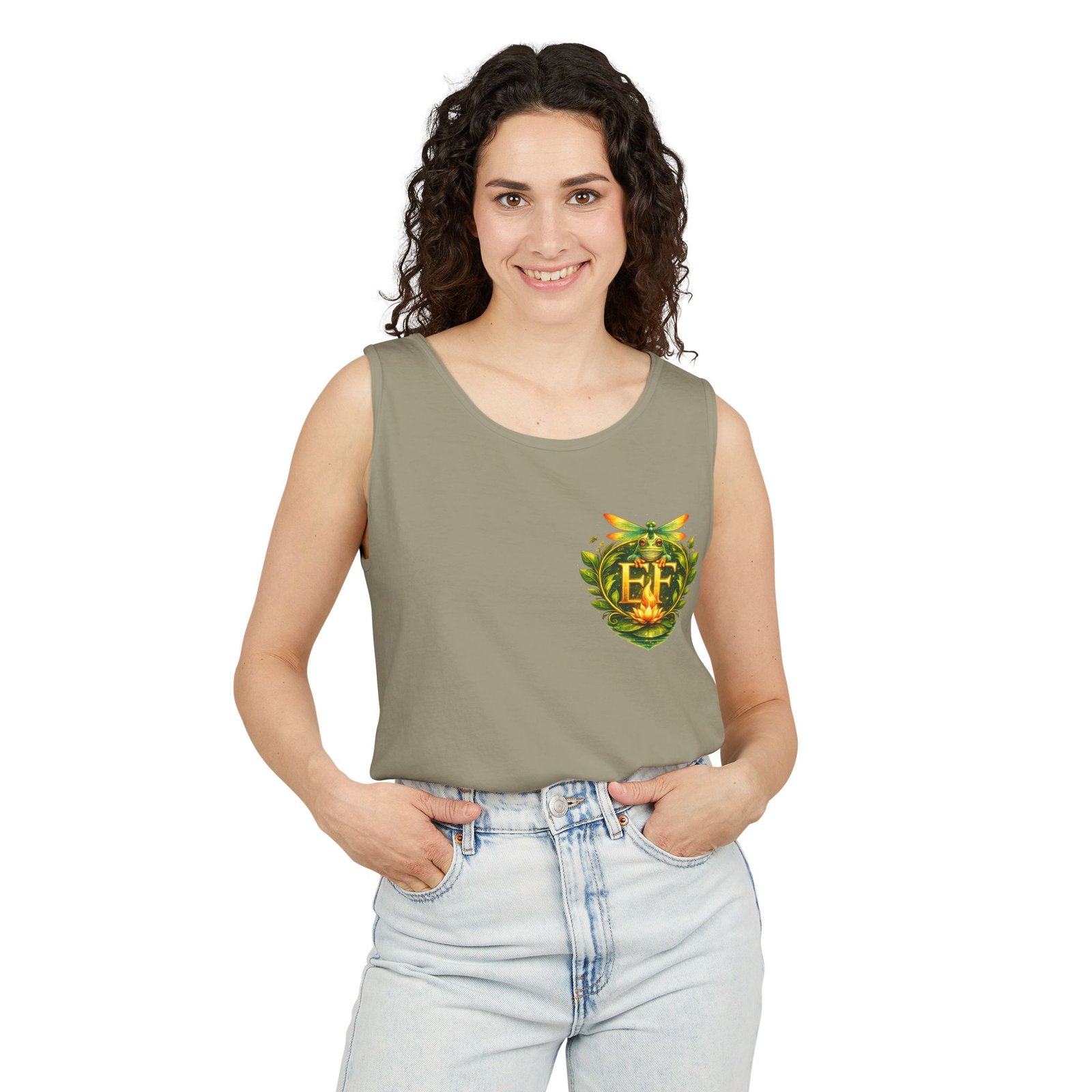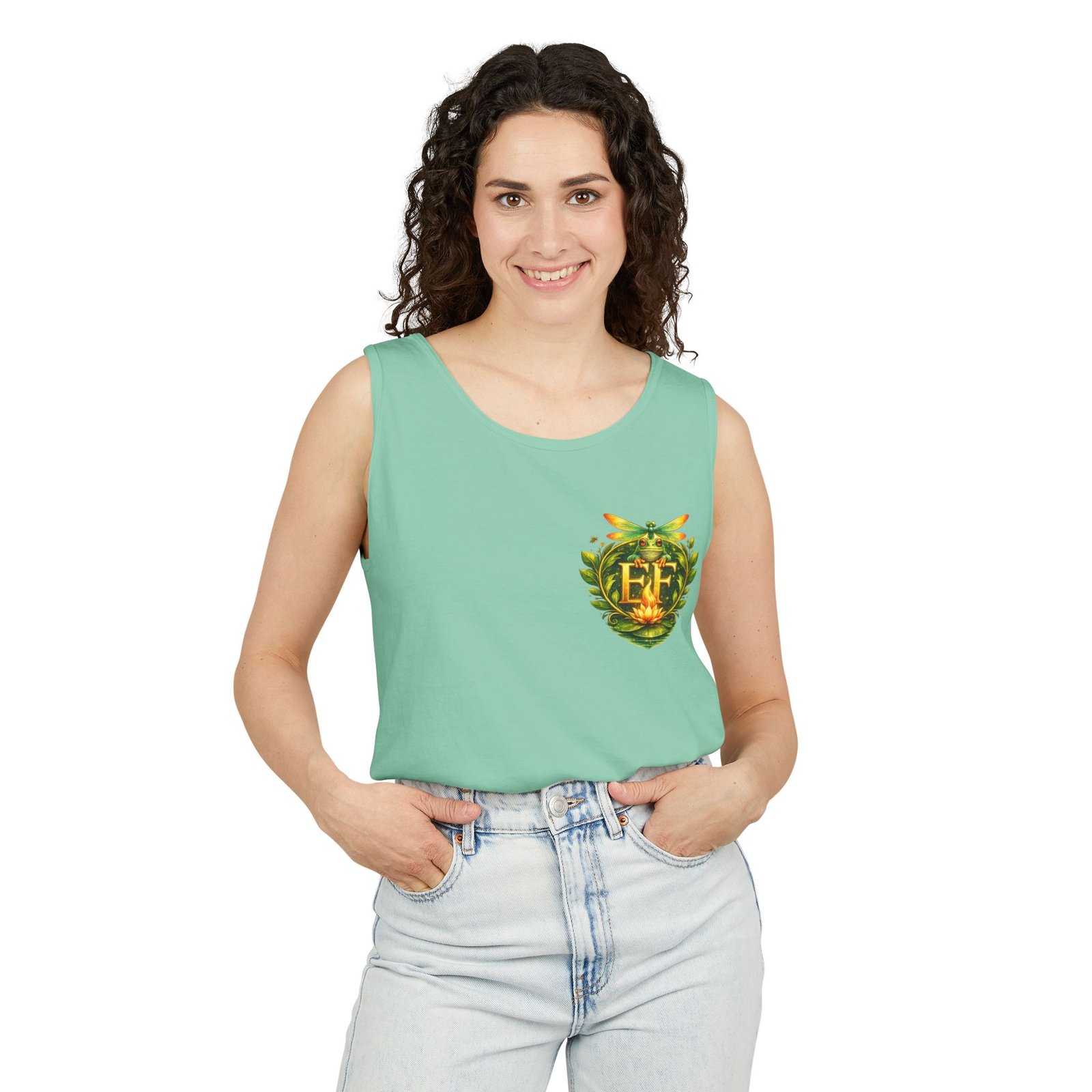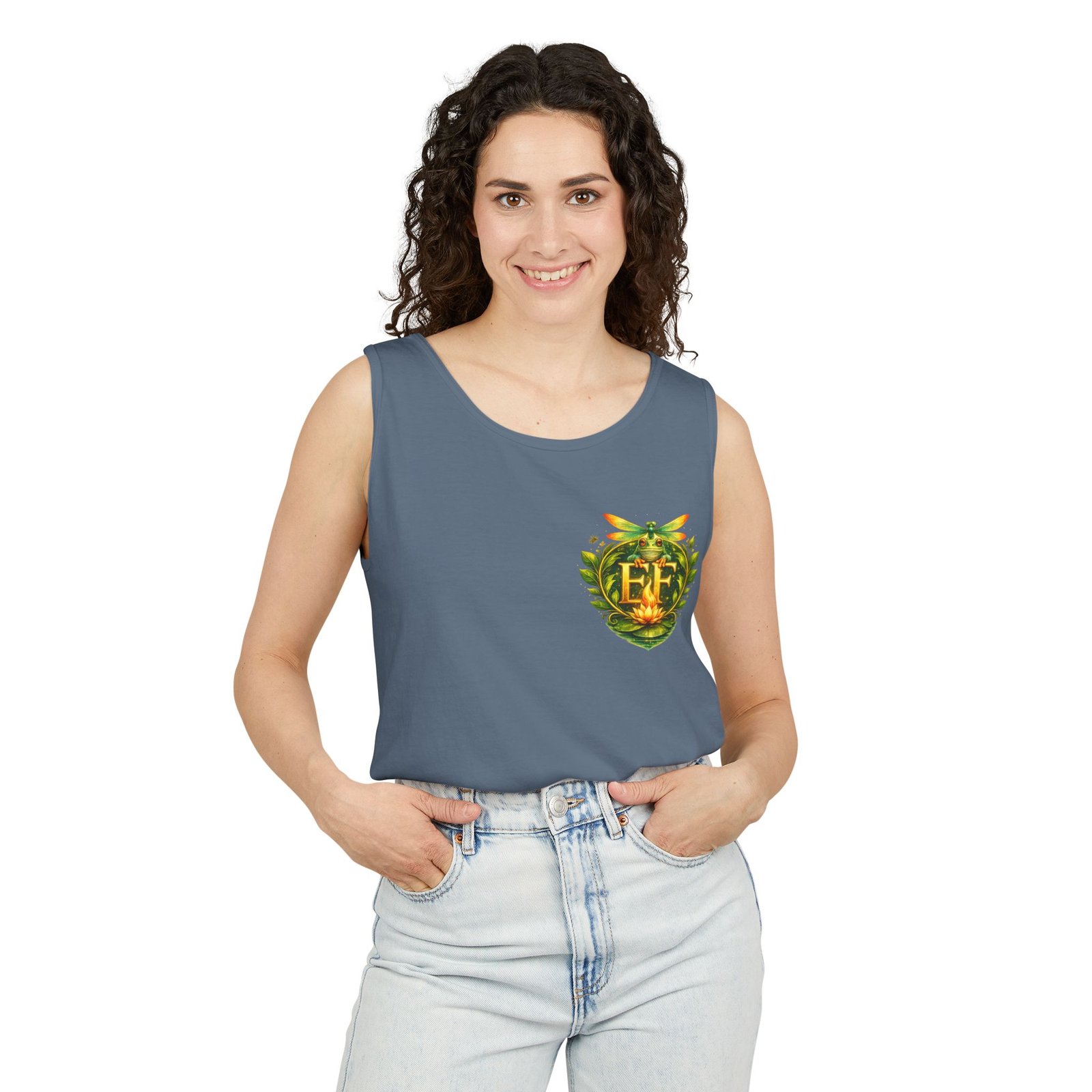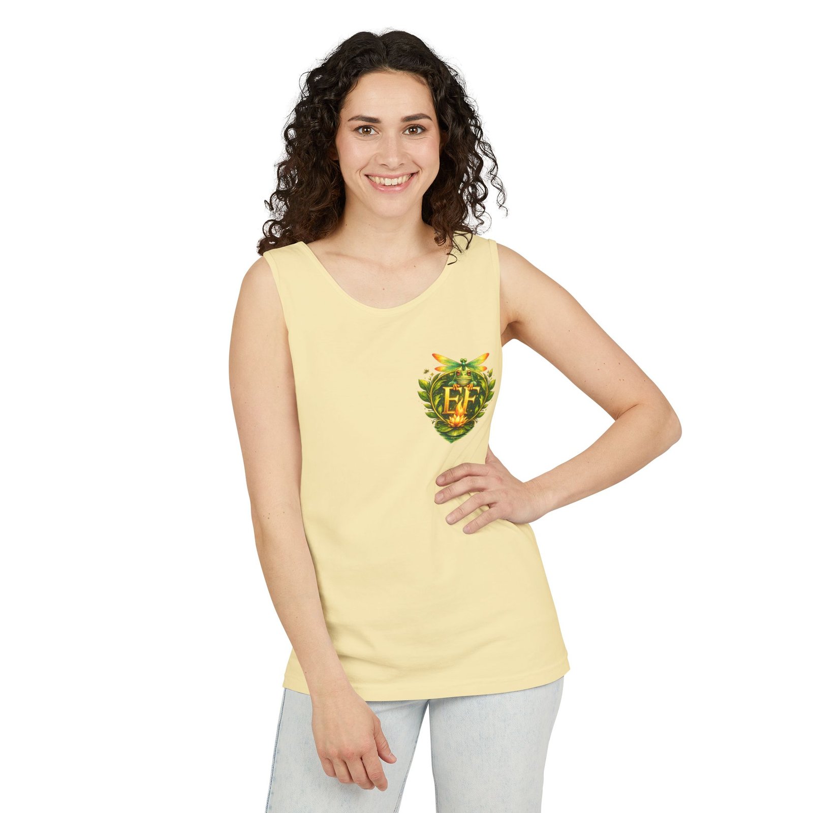 Light, breathable, and quietly playful — this garment-dyed tank brings a sunlit, outdoorsy vibe to slow afternoons and warm-weather adventures. A small crest on the chest hints at woodland mischief, while the back features a vivid frog mid-snap, tongue stretched toward a tiny golden prize. It sits relaxed across the shoulders and moves with you, whether you’re wandering a river trail, tending a summer garden, or lingering on a porch at dusk. The softened, lived-in color and comfortable medium-weight cotton make it easy to layer or wear on its own — a casually expressive piece for someone who loves nature, storytelling, and a little unexpected charm.