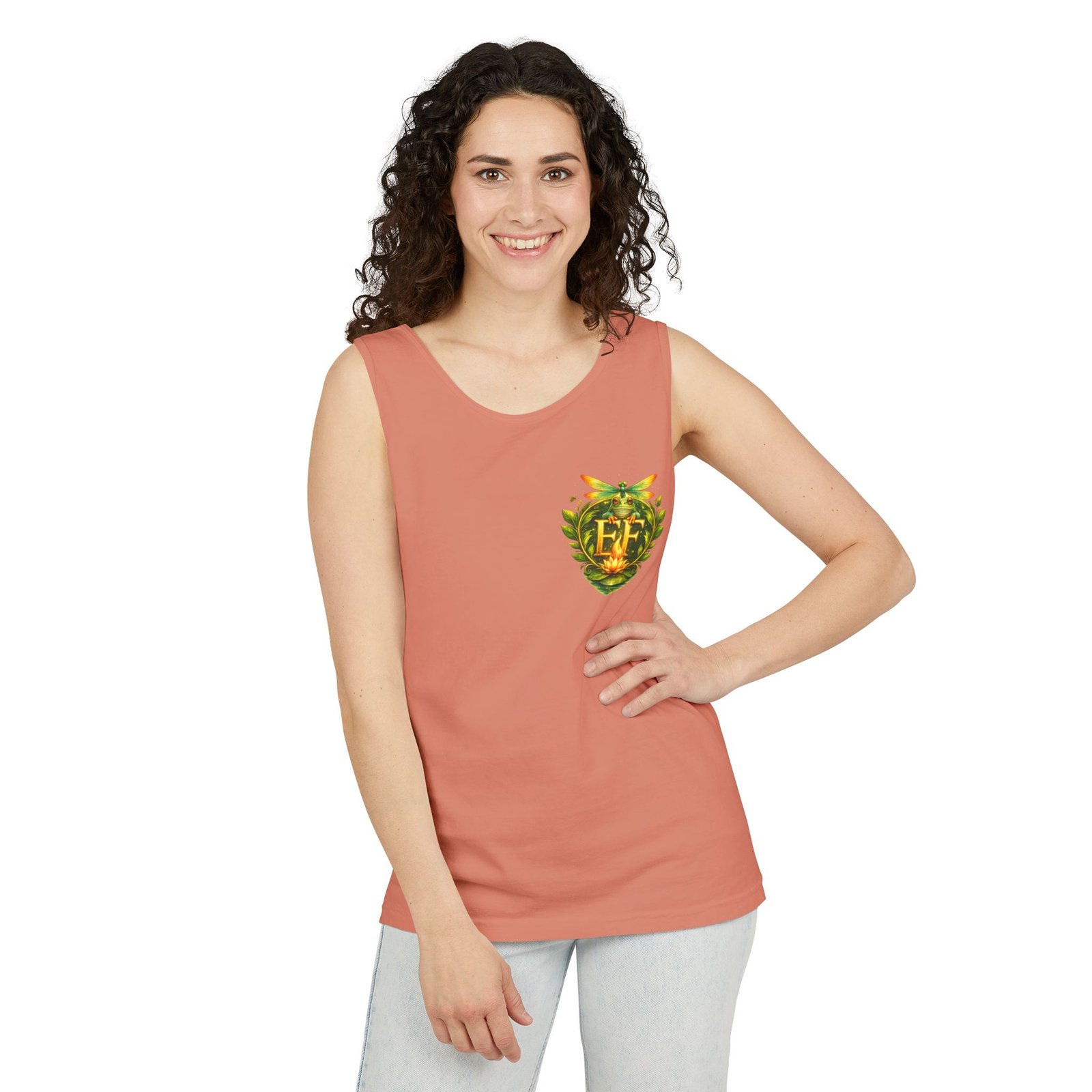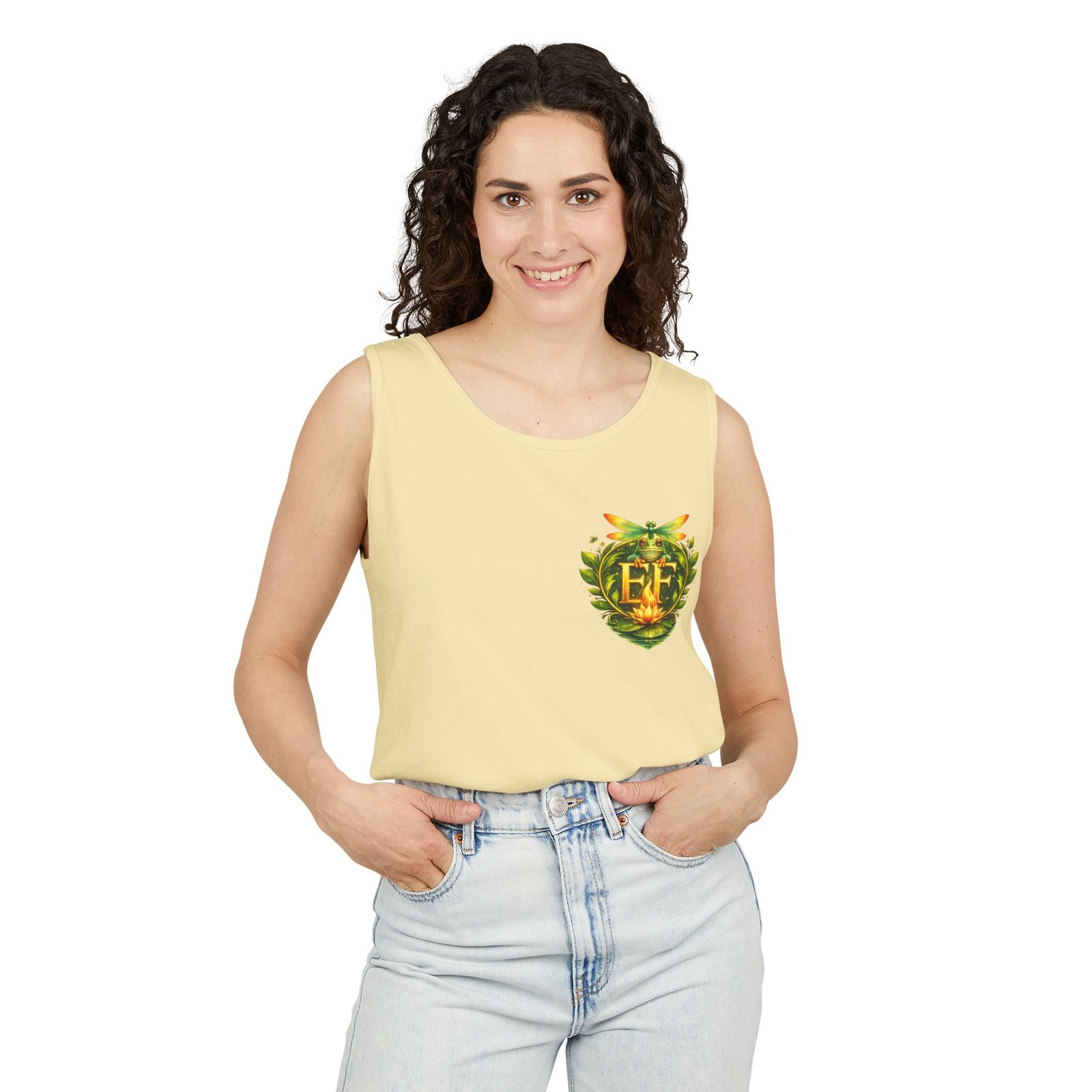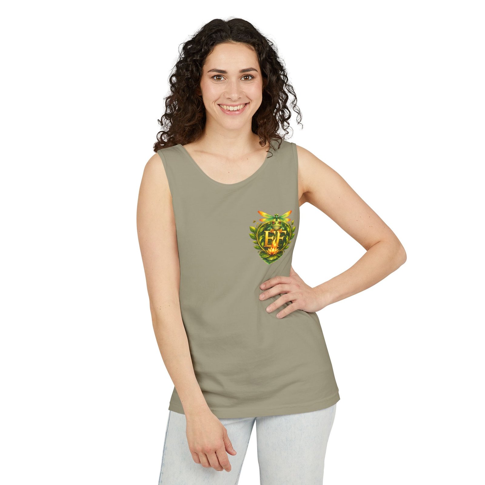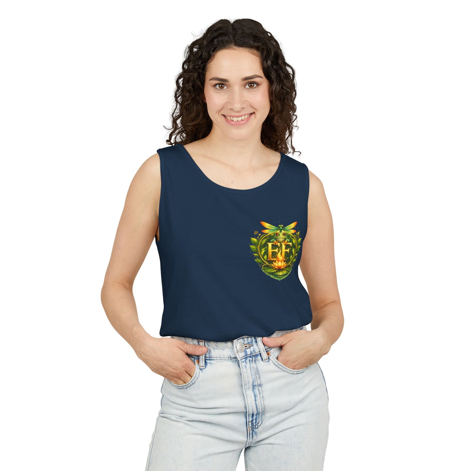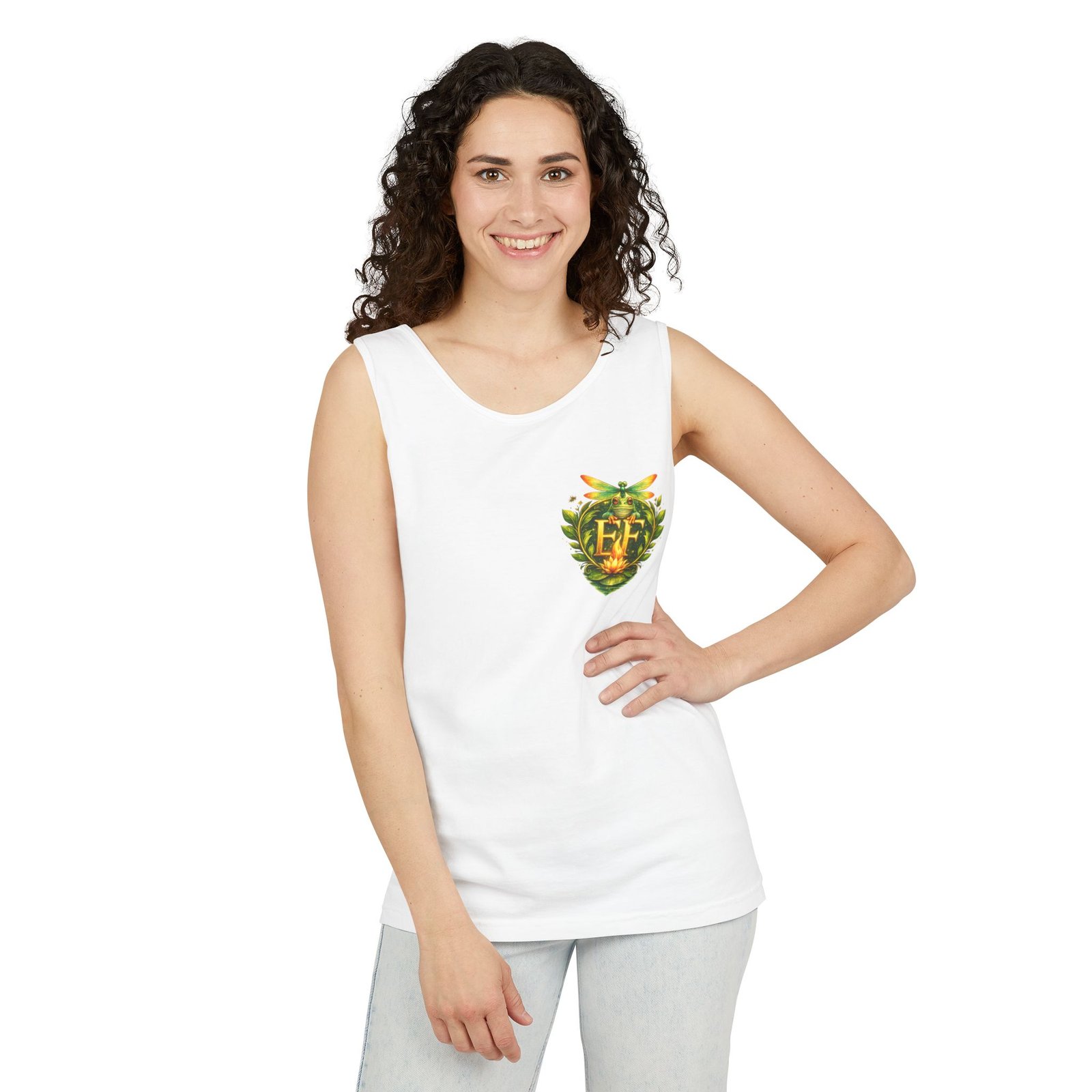 Light, breathable, and quietly playful — this garment-dyed tank brings a sunlit, outdoorsy vibe to slow afternoons and warm-weather adventures. A small crest on the chest hints at woodland mischief, while the back features a vivid frog mid-snap, tongue stretched toward a tiny golden prize. It sits relaxed across the shoulders and moves with you, whether you’re wandering a river trail, tending a summer garden, or lingering on a porch at dusk. The softened, lived-in color and comfortable medium-weight cotton make it easy to layer or wear on its own — a casually expressive piece for someone who loves nature, storytelling, and a little unexpected charm.