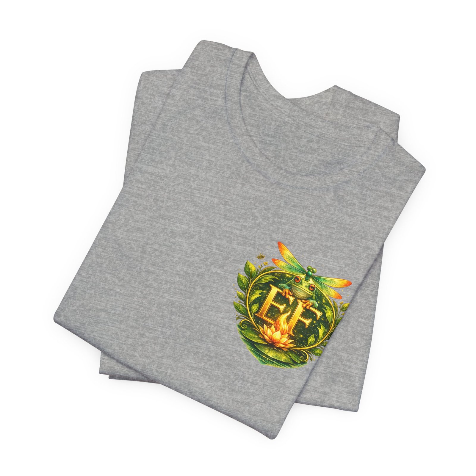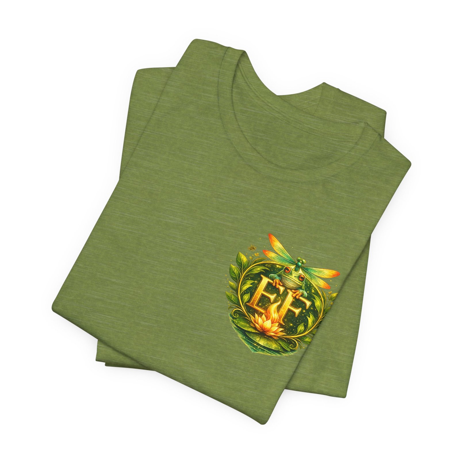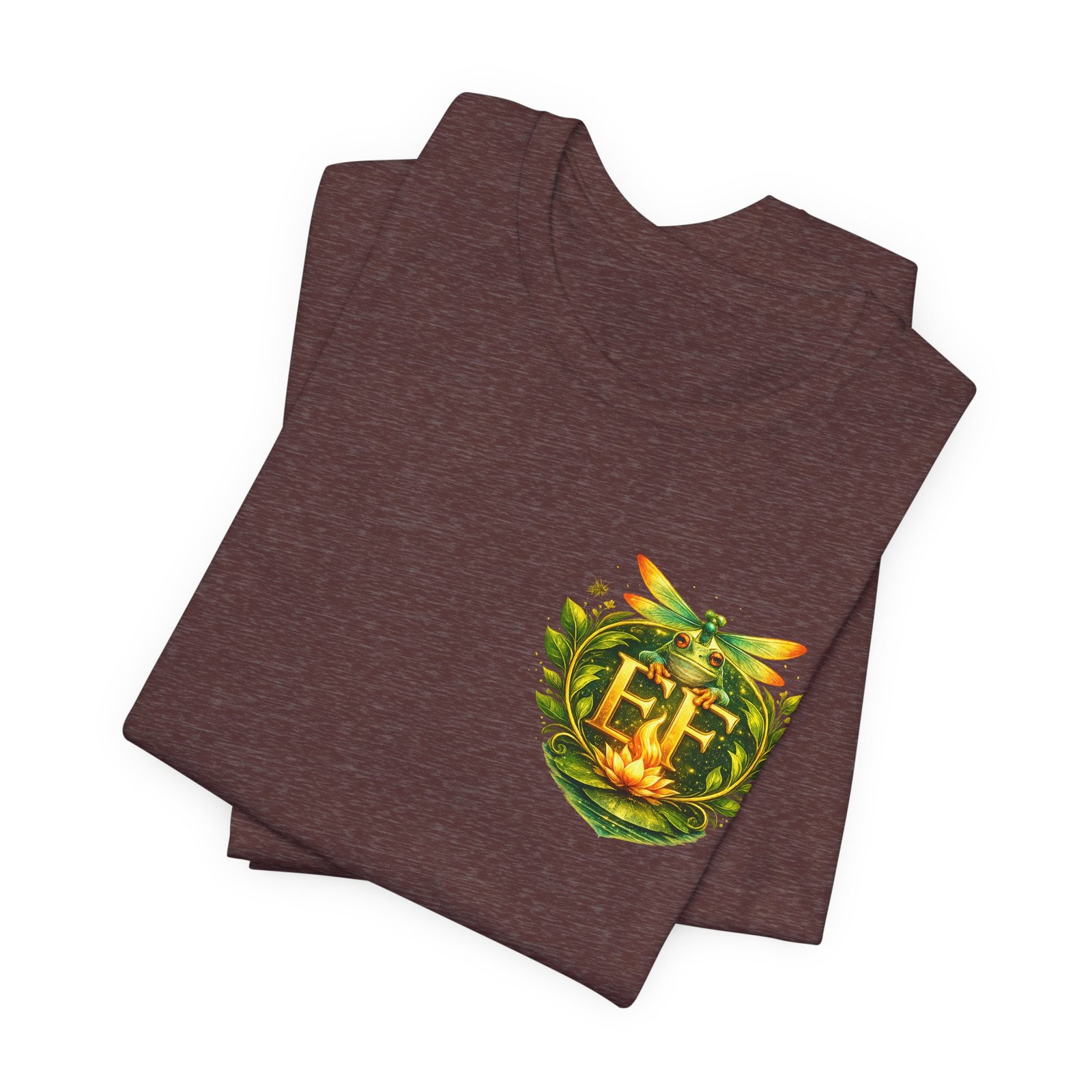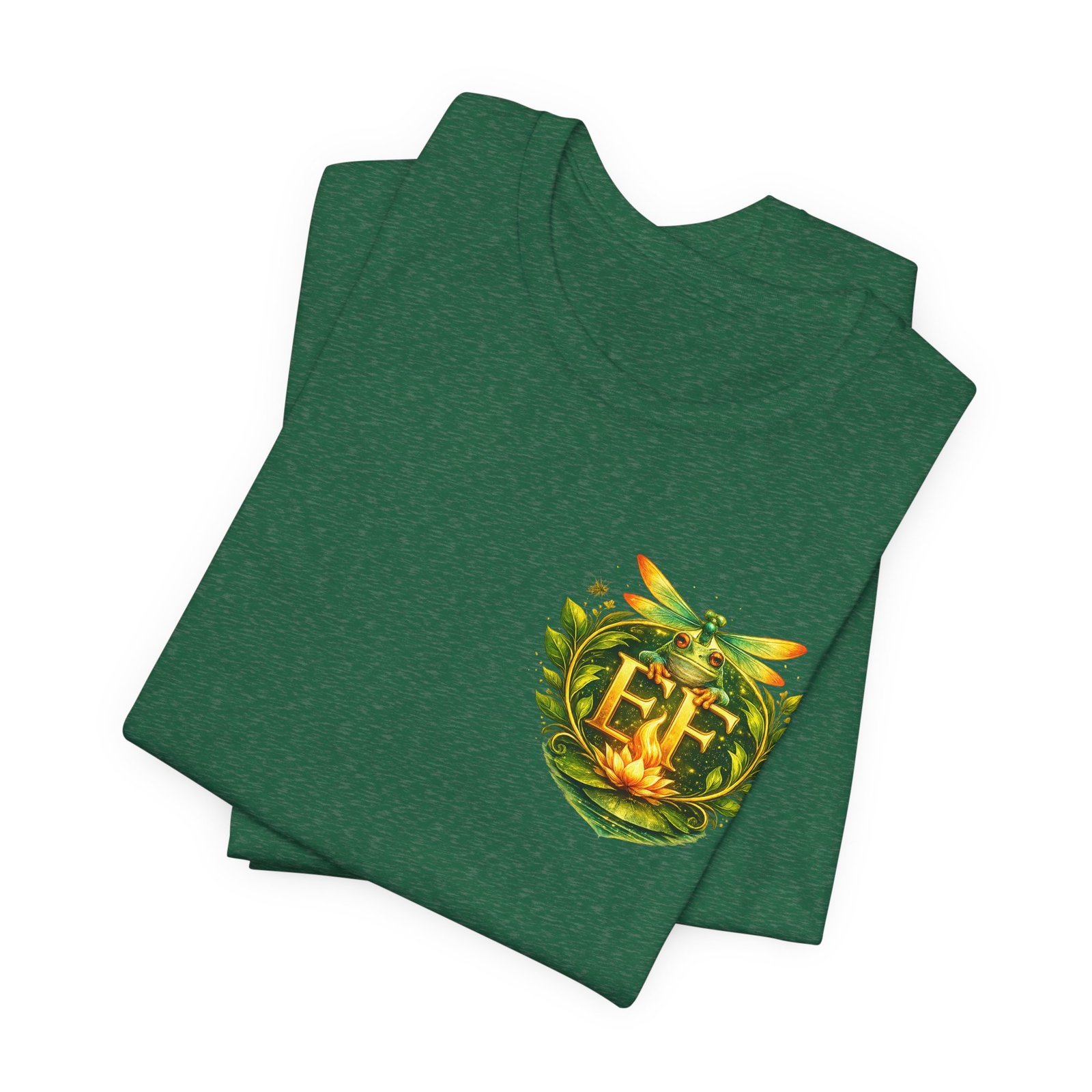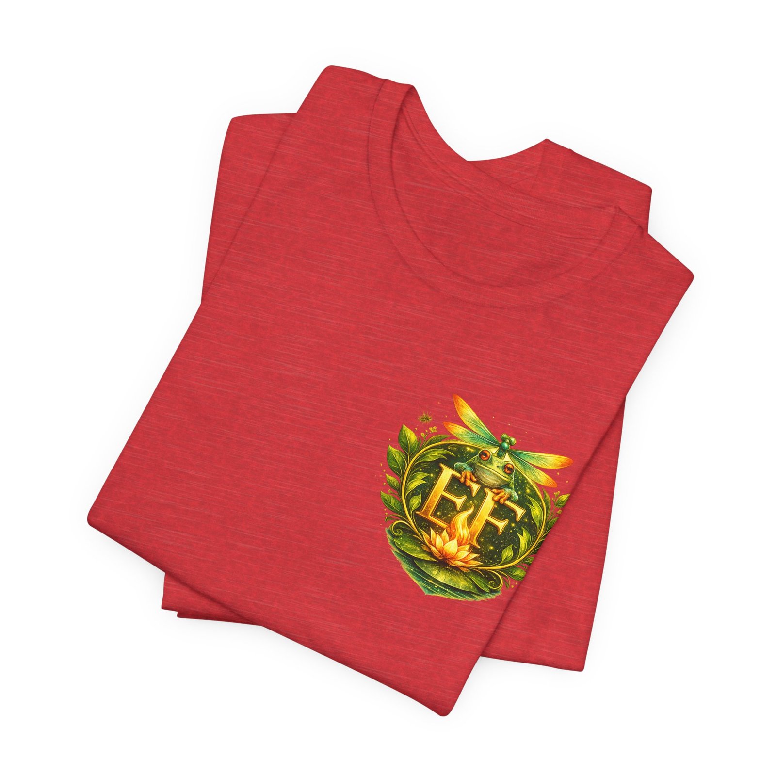 Lightweight, breathable, and subtly playful — this tee brings a touch of countryside charm to everyday wear. The front chest features a small laurel-emblem with initials, while the back reveals a lively frog mid-tongue-snap, adding a wink of personality when you move. Soft Airlume combed and ring-spun cotton keeps the shirt comfortable against the skin; thoughtful details like a ribbed knit collar, side seams, and shoulder tape keep the shape crisp after many wears. Wear it on slow mornings with coffee, at backyard gatherings, or layered under an open shirt for an easy nod to nature and quiet humor.