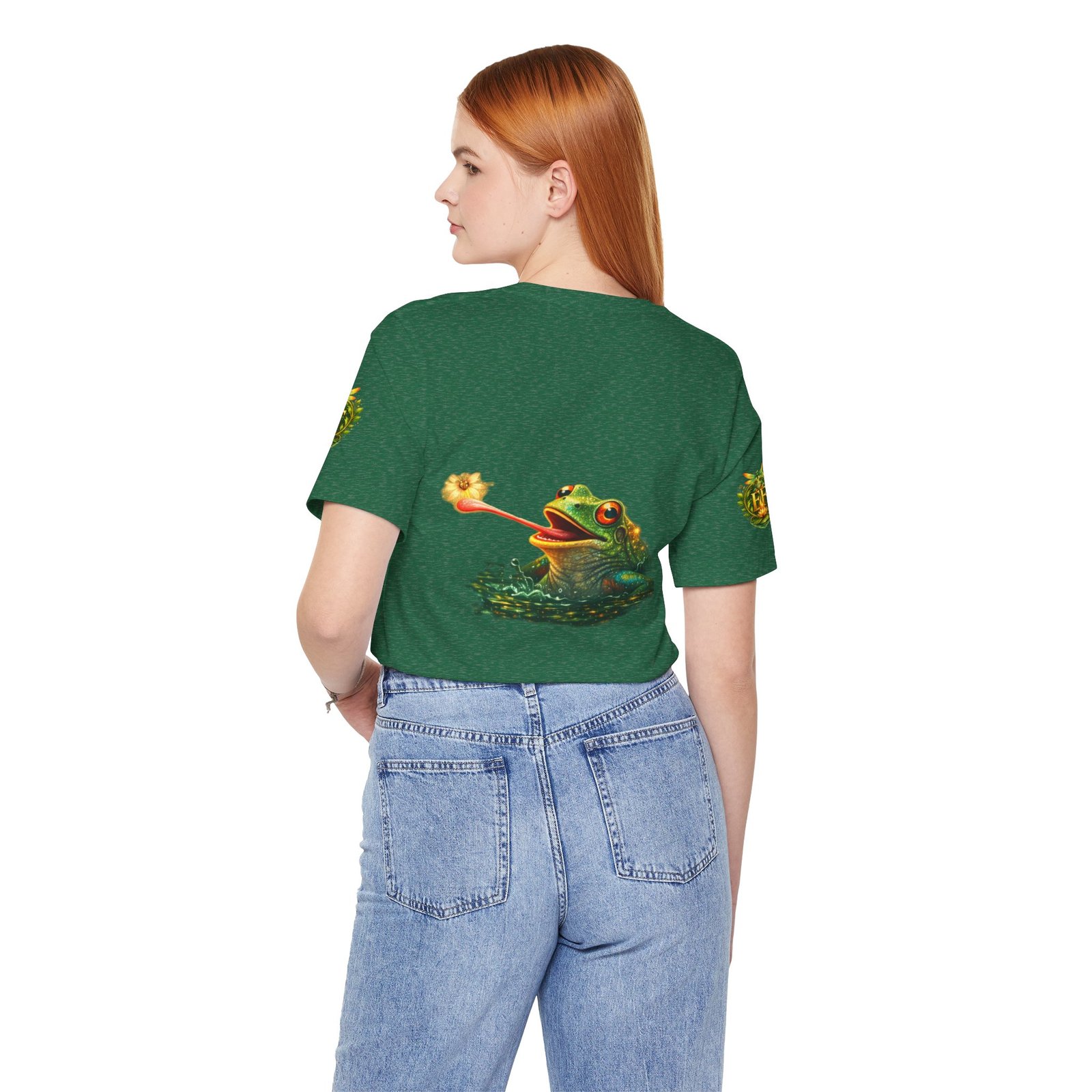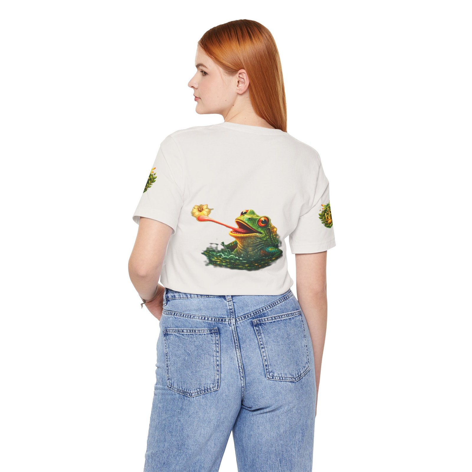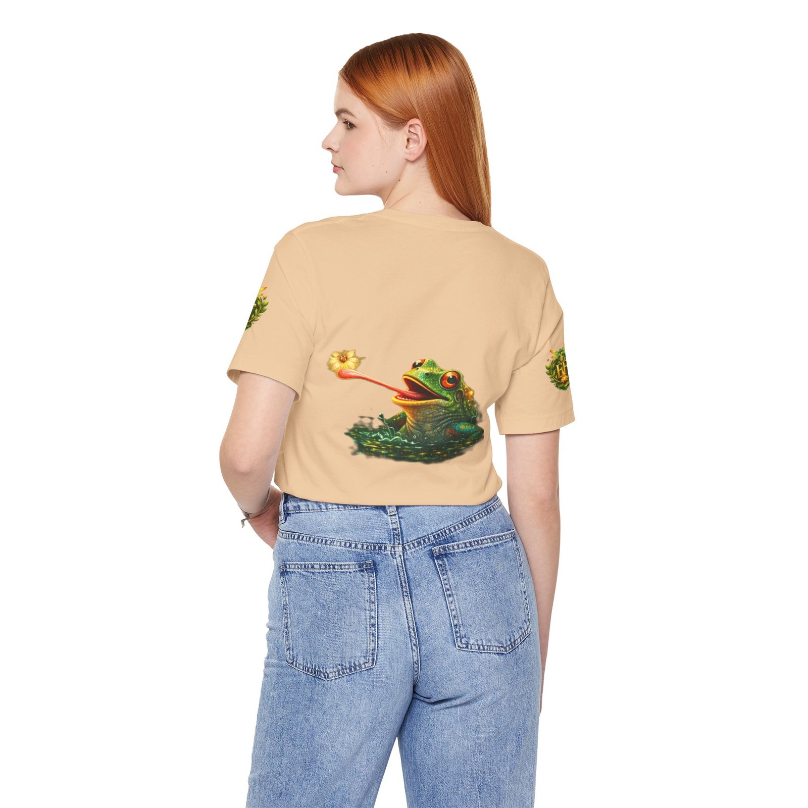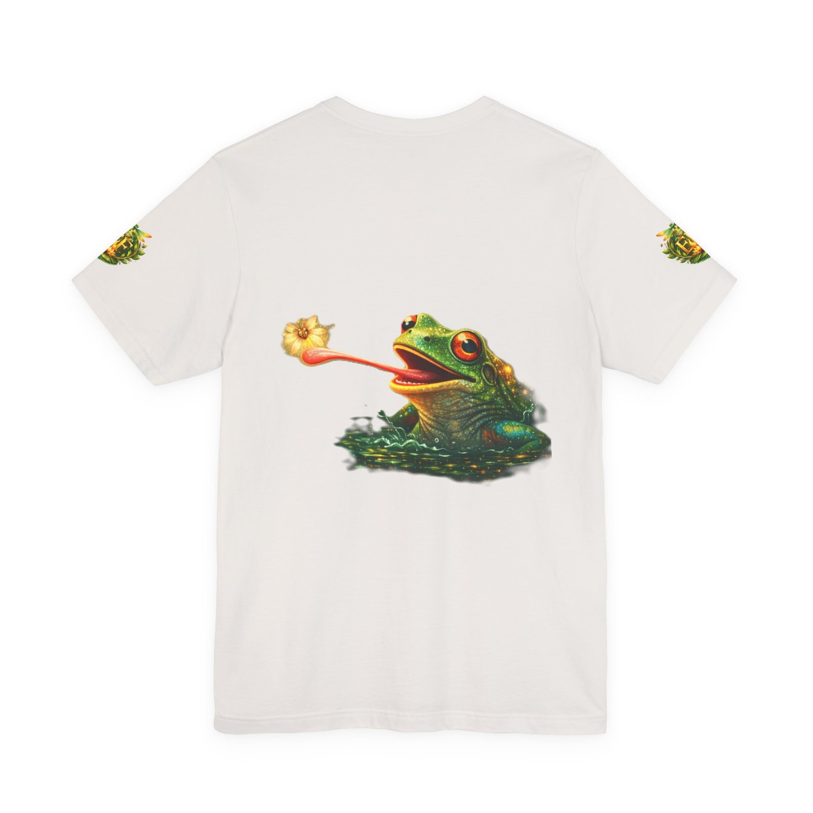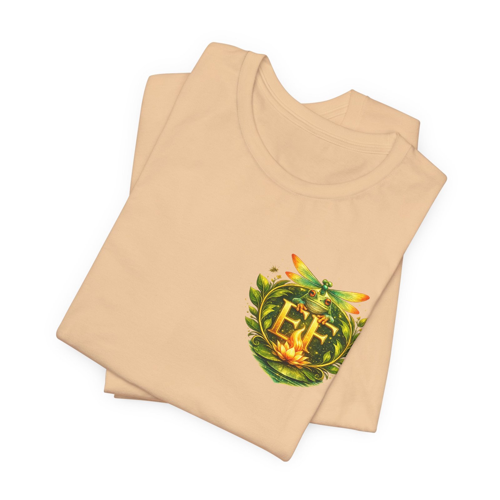Lightweight, breathable, and subtly playful — this tee brings a touch of countryside charm to everyday wear. The front chest features a small laurel-emblem with initials, while the back reveals a lively frog mid-tongue-snap, adding a wink of personality when you move. Soft Airlume combed and ring-spun cotton keeps the shirt comfortable against the skin; thoughtful details like a ribbed knit collar, side seams, and shoulder tape keep the shape crisp after many wears. Wear it on slow mornings with coffee, at backyard gatherings, or layered under an open shirt for an easy nod to nature and quiet humor.