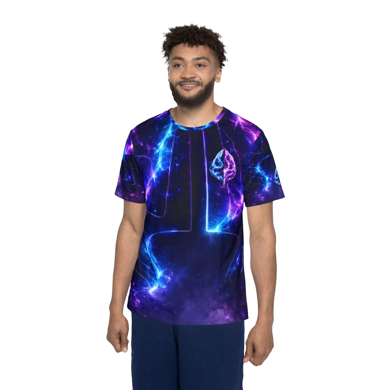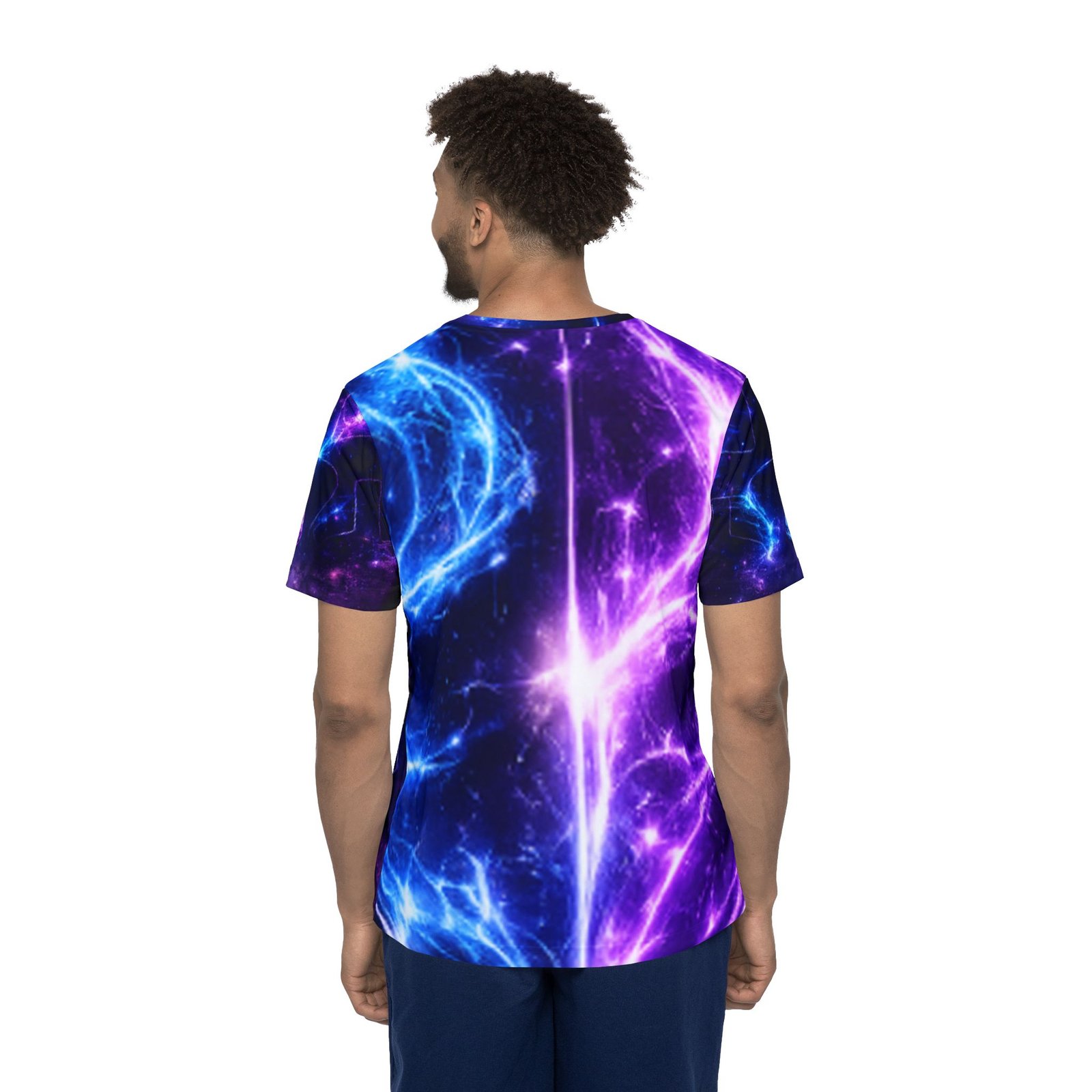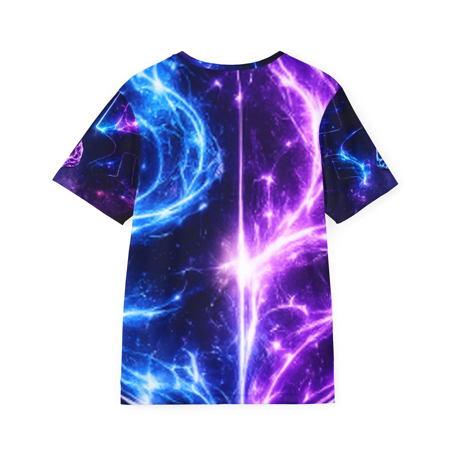 A vivid, all-over print sports jersey that feels like stepping into a neon nebula. Lightweight and breathable, it moves moisture away from your skin while holding bright, electric blues and purples that don’t fade. The ribbed collar and armholes stretch comfortably as you pull it on, then return to a neat fit. Wear it during intense runs, late-night pickup games, or while streaming creative sessions—the galactic pattern turns motion into light and gives everyday training a charged, otherworldly vibe.
