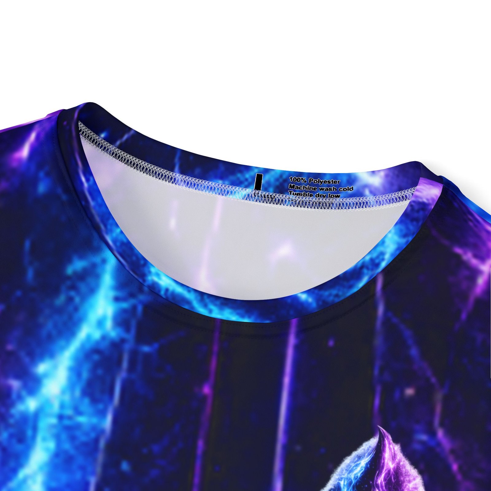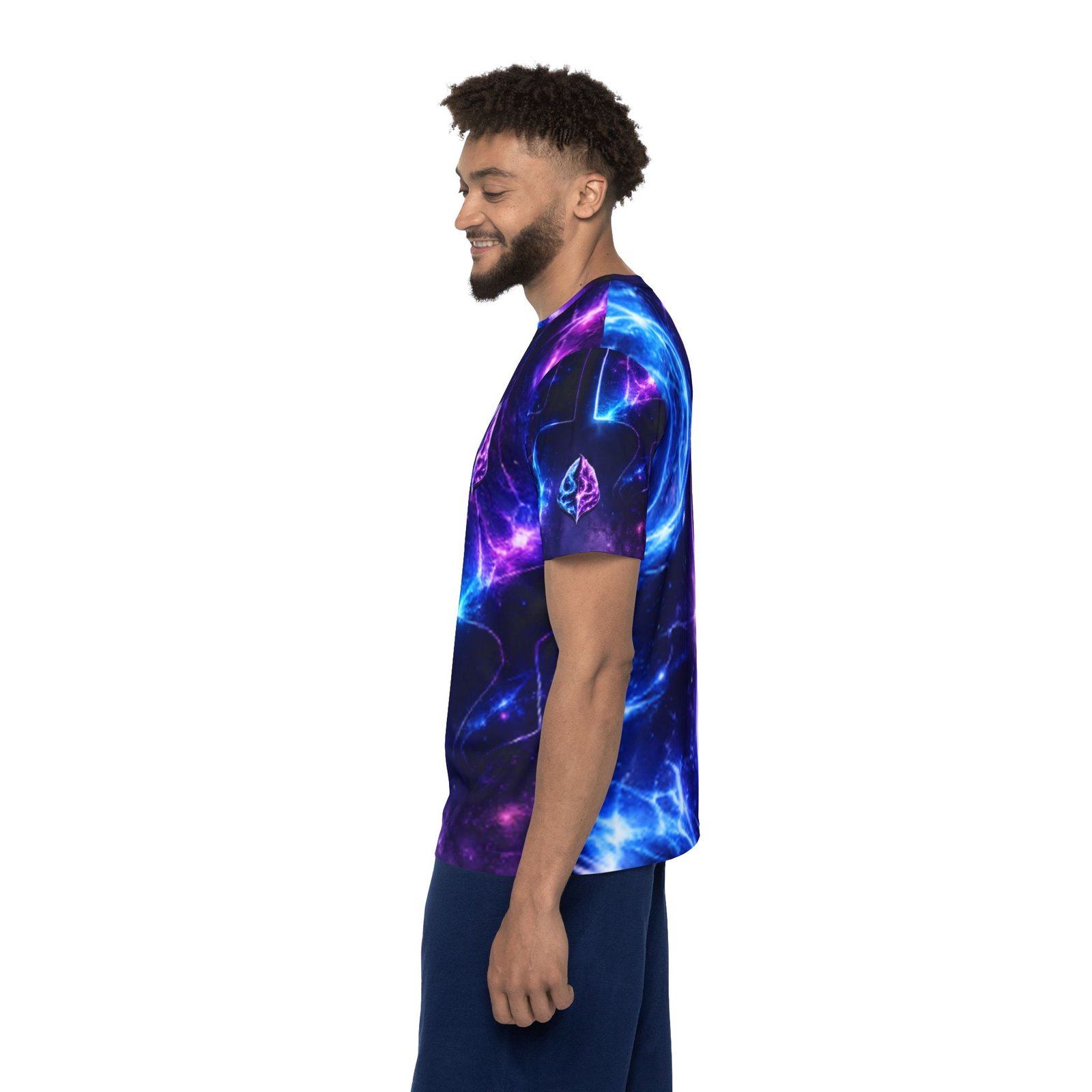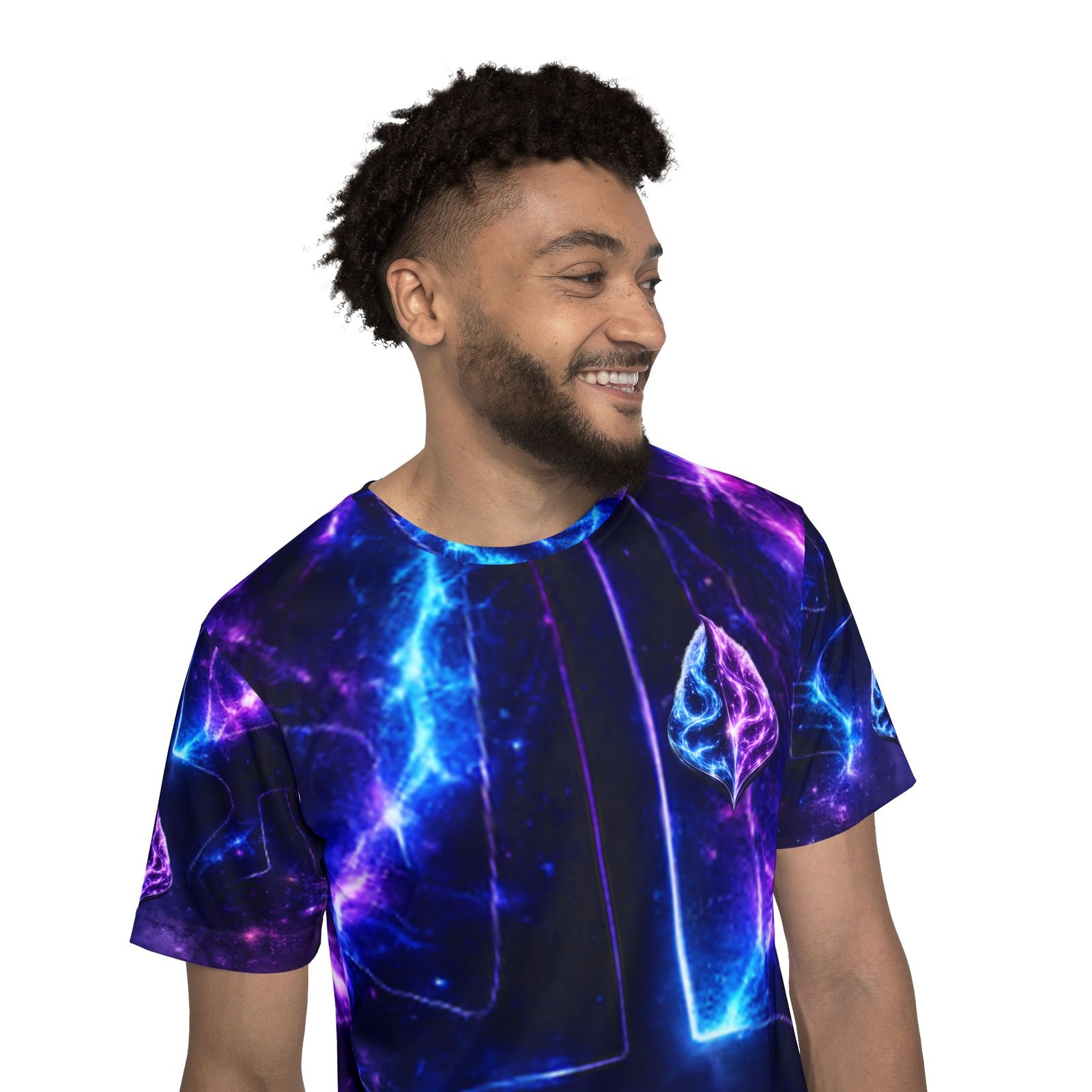 A vivid, all-over print sports jersey that feels like stepping into a neon nebula. Lightweight and breathable, it moves moisture away from your skin while holding bright, electric blues and purples that don’t fade. The ribbed collar and armholes stretch comfortably as you pull it on, then return to a neat fit. Wear it during intense runs, late-night pickup games, or while streaming creative sessions—the galactic pattern turns motion into light and gives everyday training a charged, otherworldly vibe.