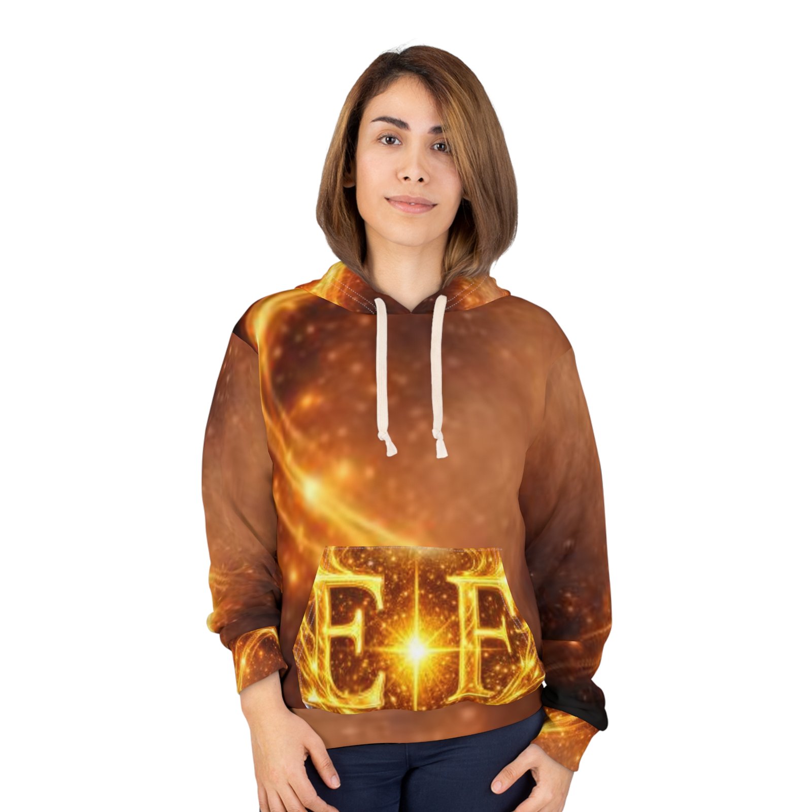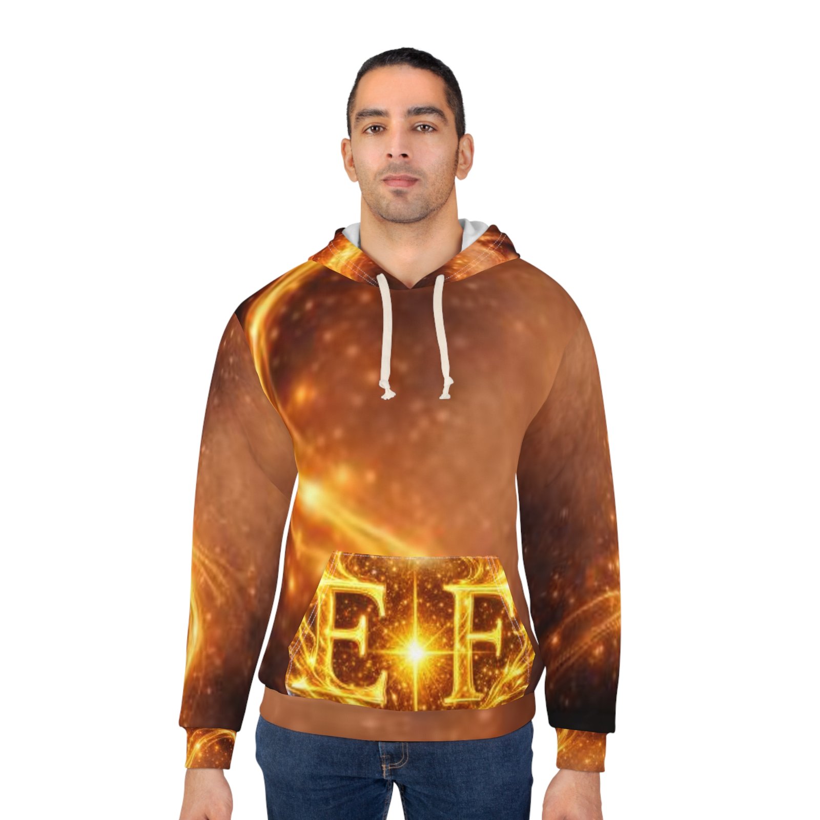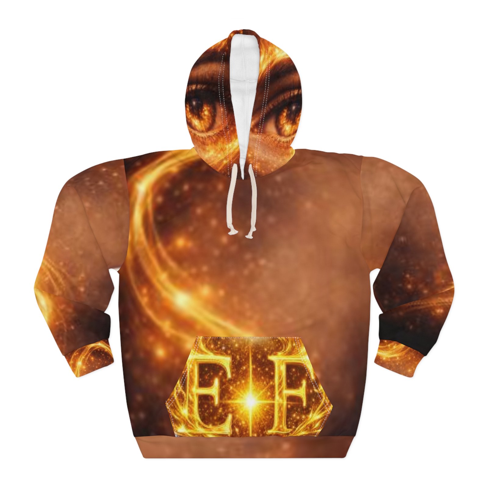 This all-over print hoodie feels like wearing a piece of the cosmos. Golden embers swirl across the fabric, converging into an intense, watchful eye on the back and a luminous emblem on the front pocket—an otherworldly blend of mystic art and street-ready comfort. The medium-weight polyester holds vibrant color and contours for a clean, bold silhouette whether you’re layered up for a night out or lounging at home. Let it be the quiet statement in your wardrobe that hints at curiosity, late-night wonder, and a taste for the dramatic.