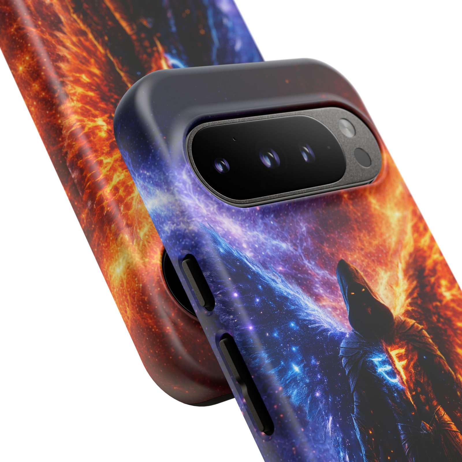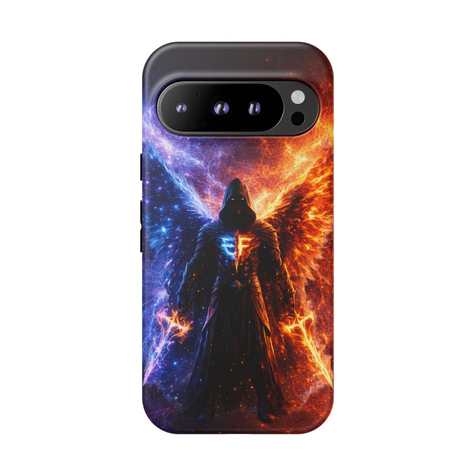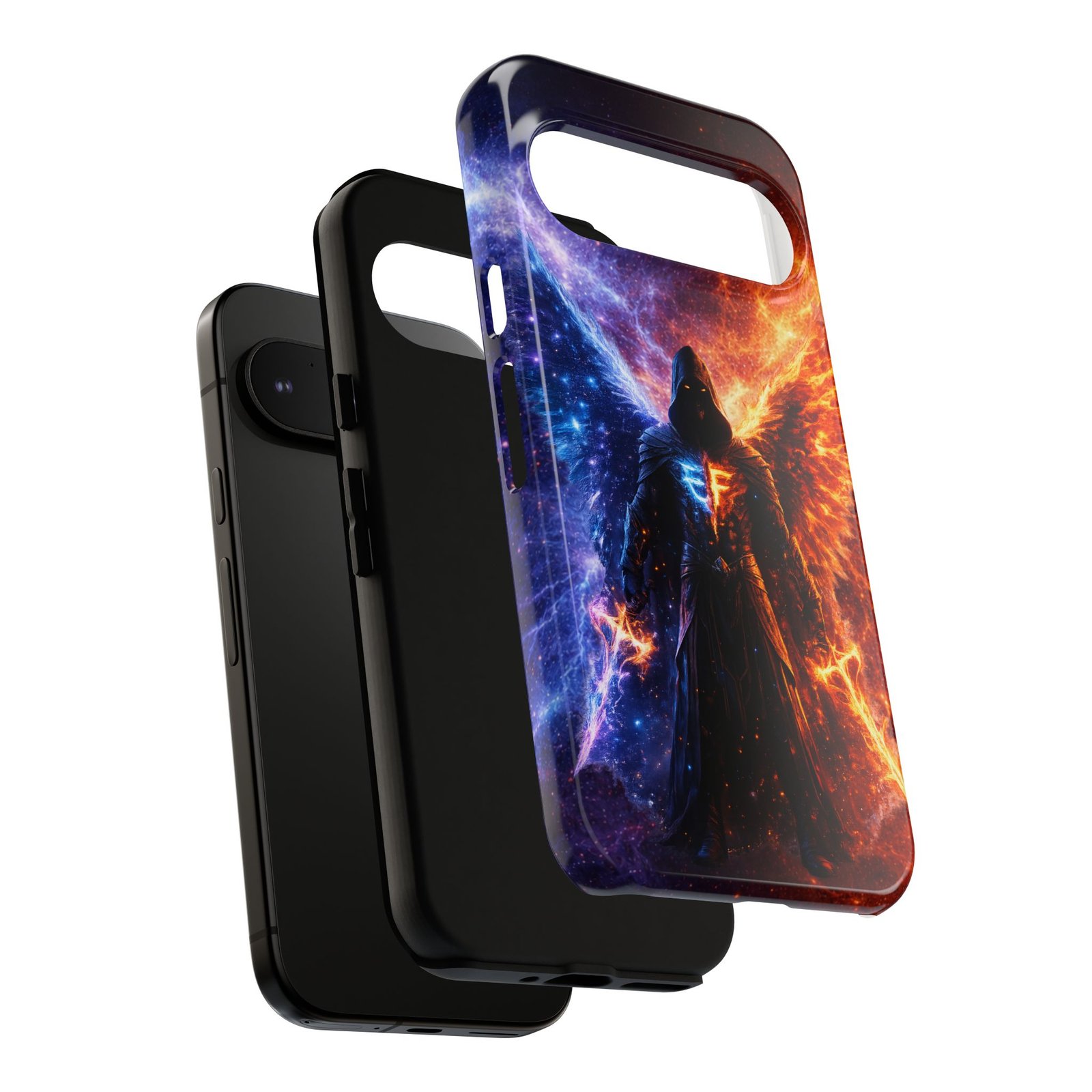 This slim, dual-layer phone case wraps your device in an otherworldly scene: a hooded sentinel with blazing wings standing between a searing orange inferno and a cool, electric blue nebula. The image is printed edge-to-edge with full ink density for vibrant color and sharp detail that reads like a miniature poster. A soft TPU liner cushions against impacts while the hard polycarbonate shell resists drops and abrasion. The case stays functional with clear port cutouts and supports wireless charging, so your phone keeps its style and everyday utility. For collectors of dark-fantasy art and people who wear their imagination on the outside, this case turns a phone into a statement — bold, dramatic, and built to last.