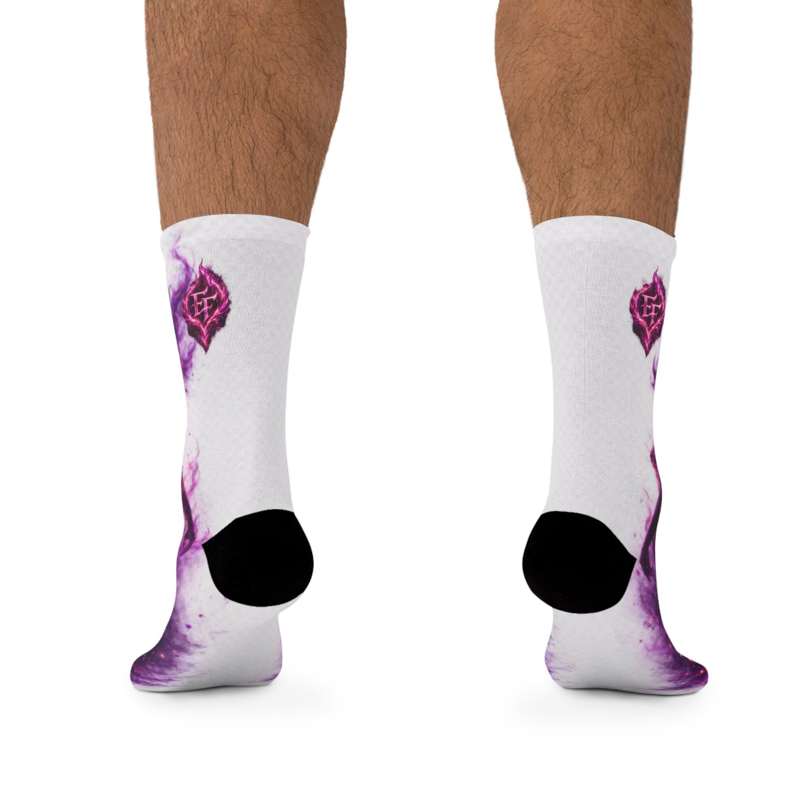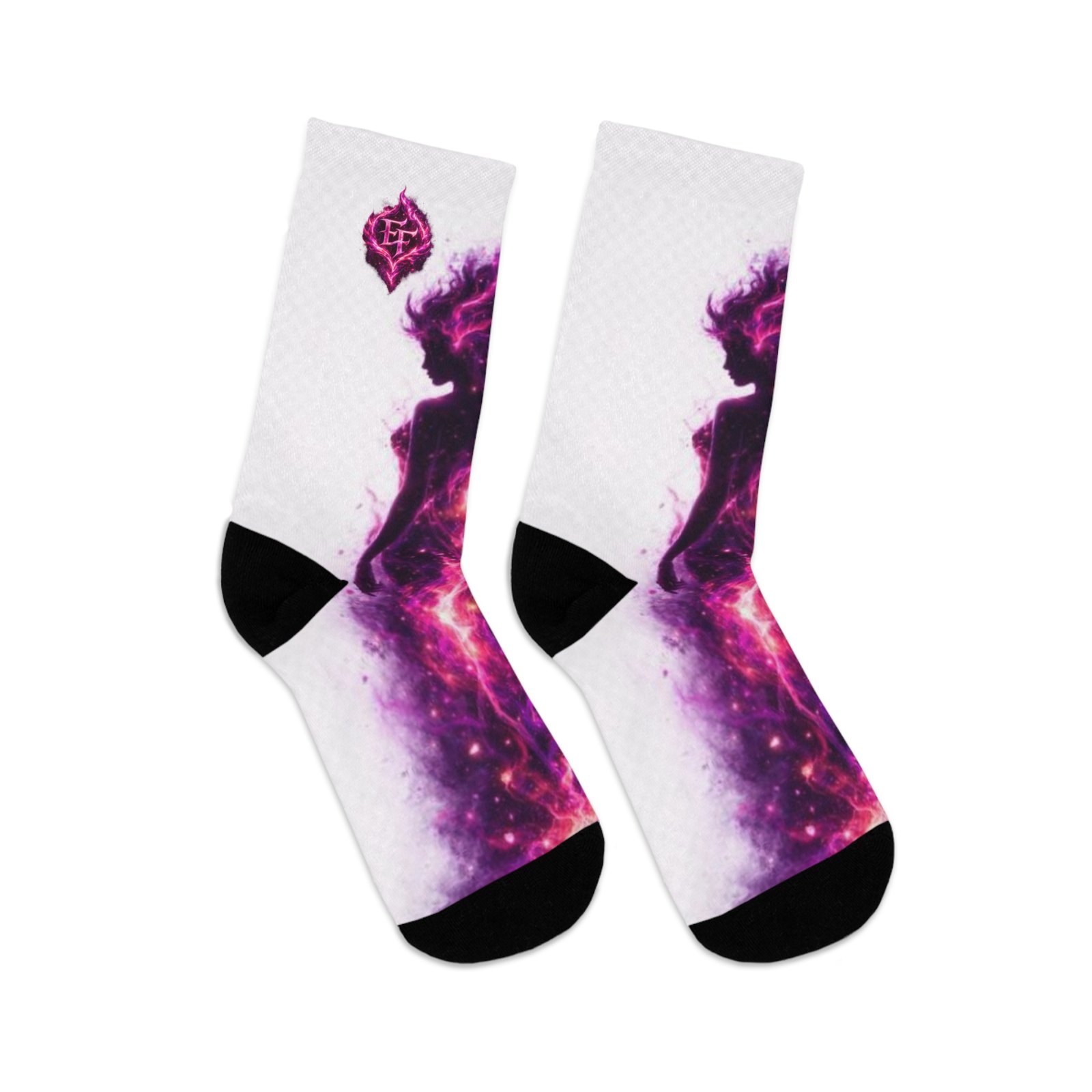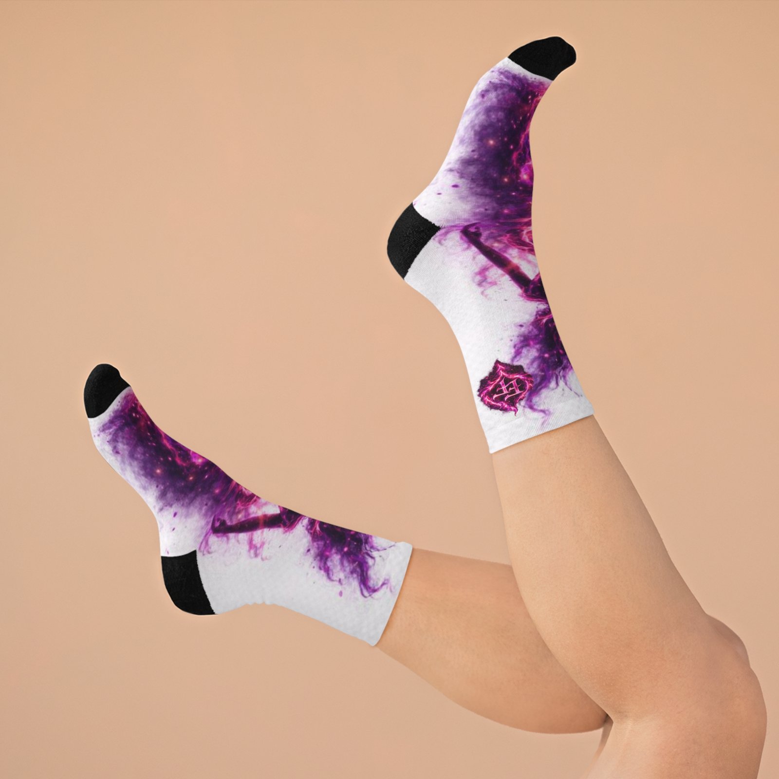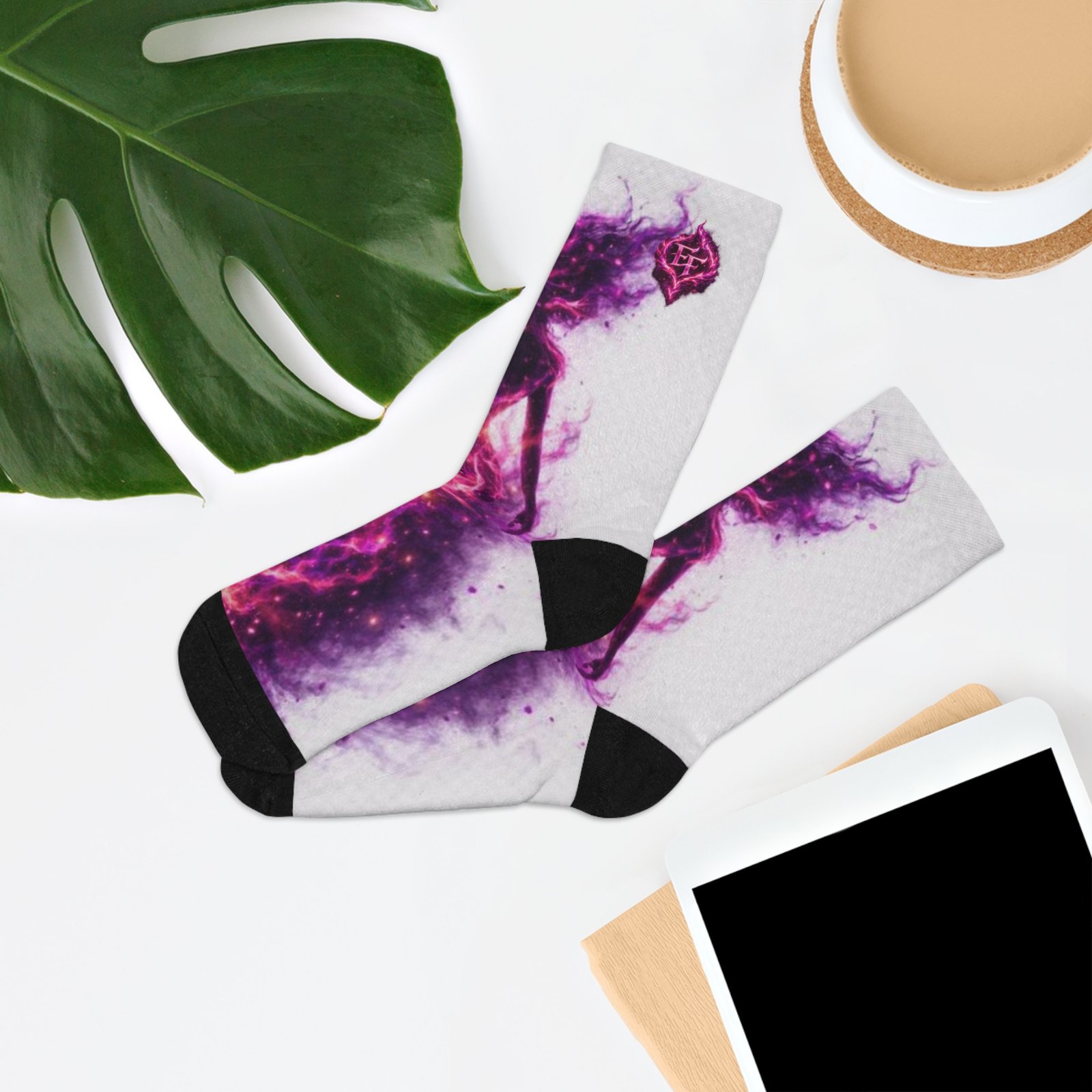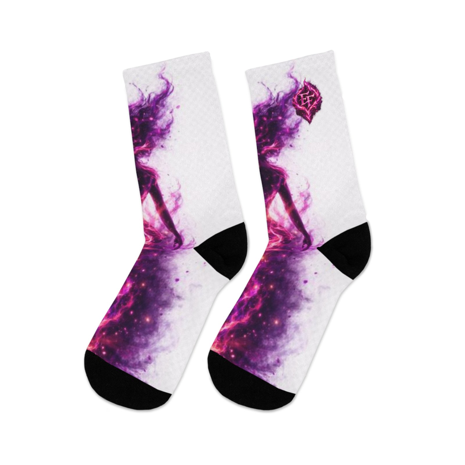 Slide into socks that feel like stepping into a nebula. These recycled-poly crew socks wrap your feet in a painterly swirl of magenta and violet, where wisps of starlit dust form a ghostly silhouette. They hold color boldly across the entire sock so the design reads from every angle, while the textured 200-needle knit gives a smooth, durable fit. Wear them when you want an everyday touch of cosmic flair — under denim, with boots, or tucked into a favorite lounge set. The recycled-rich fabric is soft against skin and carries a thoughtful footprint, though bright colors may release a little dye on the first wash (wash separately to keep that vibrancy).