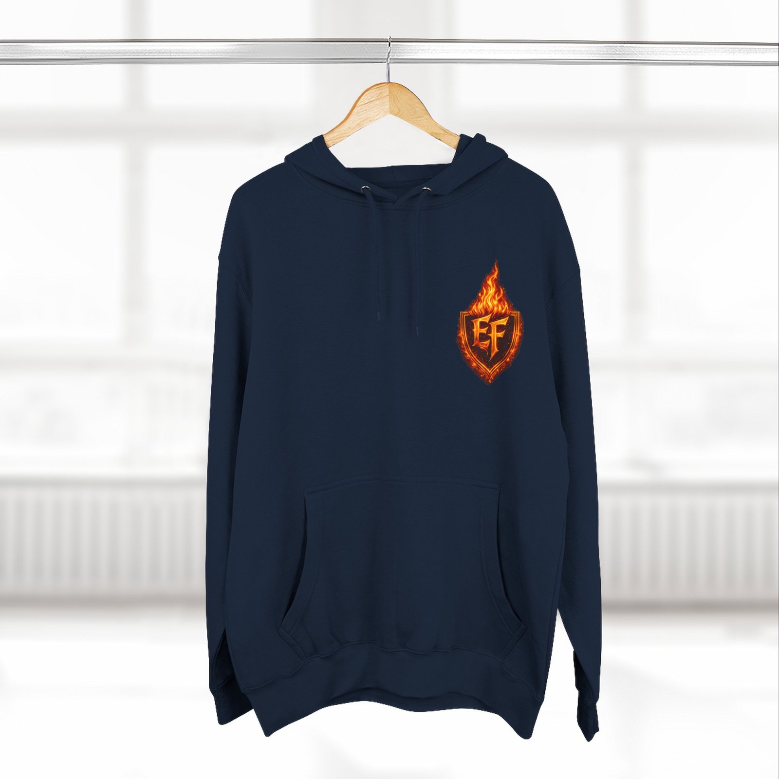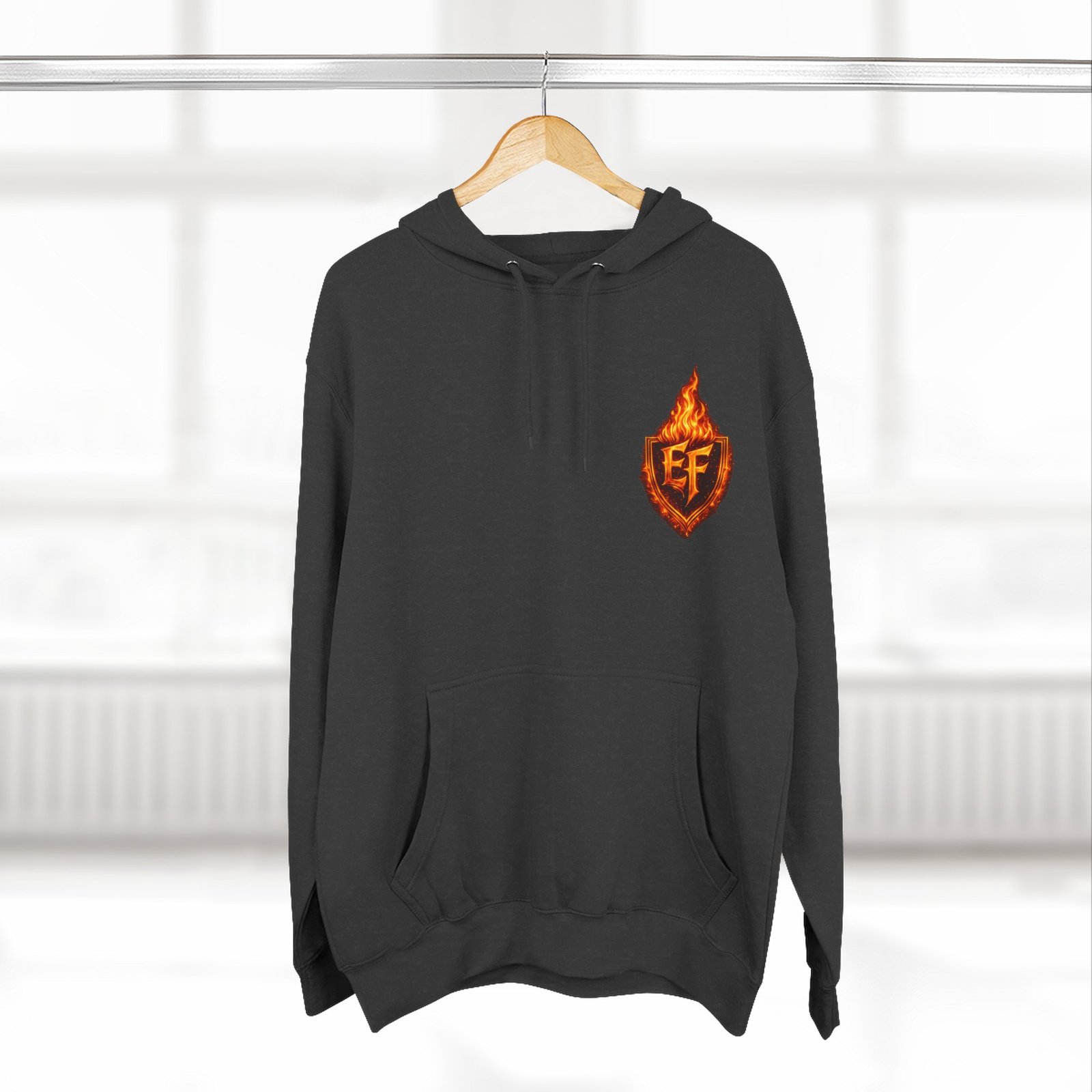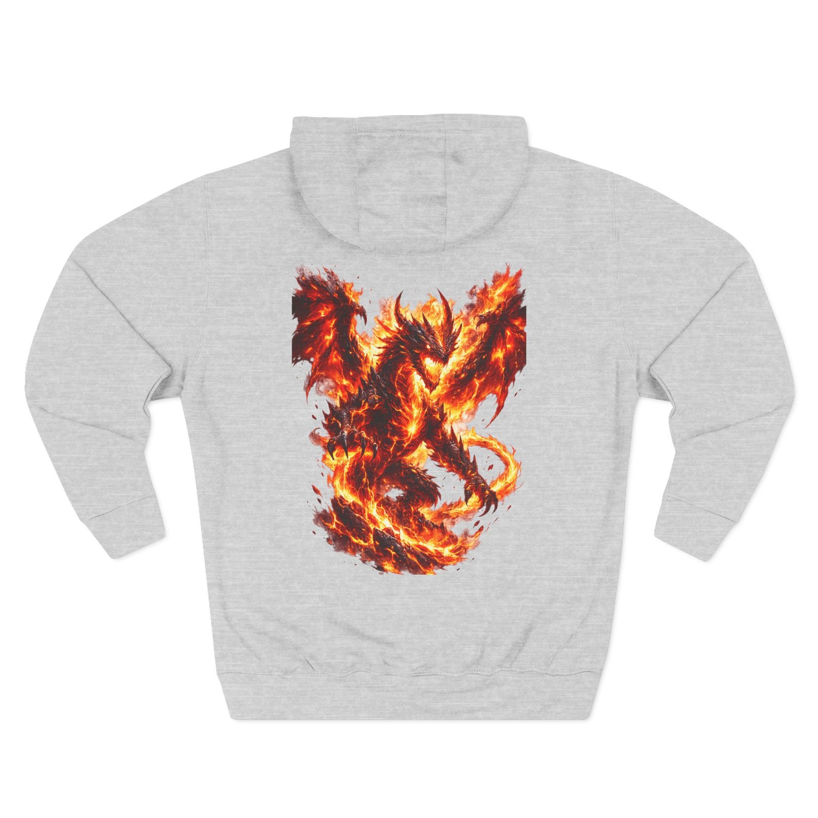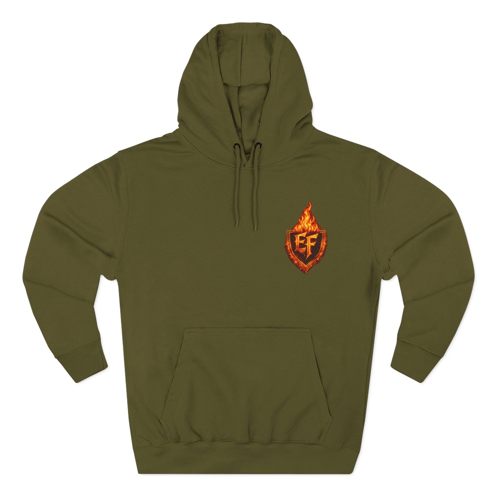 This fleece hoodie brings a fiery, expressive energy to quiet days and busy nights. Built with a soft, medium-heavy fleece and a roomy kangaroo pocket, it feels substantial without weighing you down. The front chest carries a small, embroidered flame emblem while the back explodes into a bold, phoenix-like blaze in vivid, print-ready detail — a statement piece that reads as both art and armor. The adjustable hood, durable double-stitched seams, and shrink-resistant knit mean this will be a go-to layer that stays true after repeated wears. Wear it when you want to stand out without shouting: pairing athletic ease with handcrafted, elemental imagery.