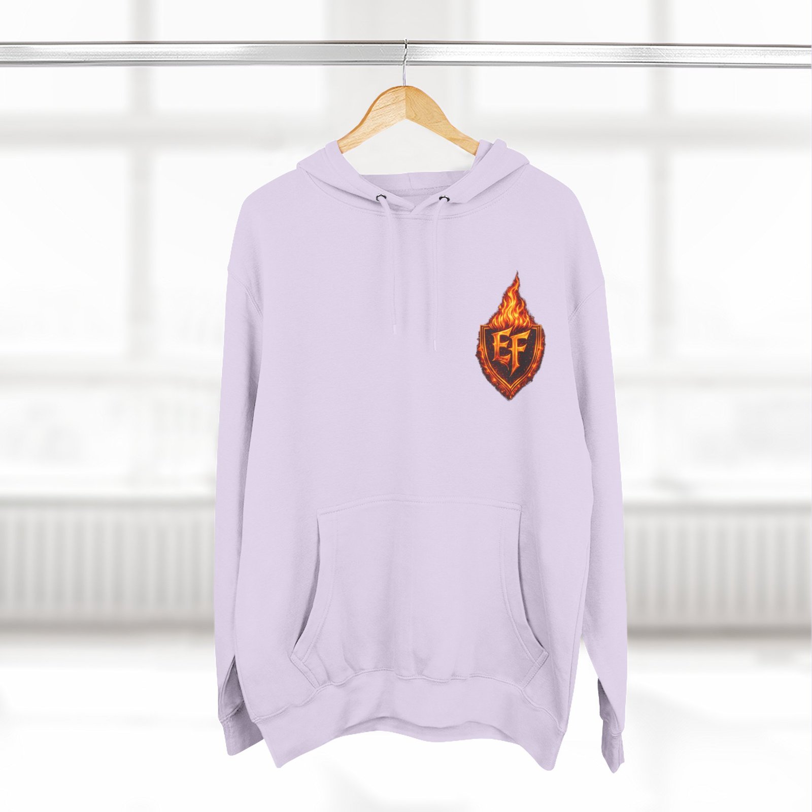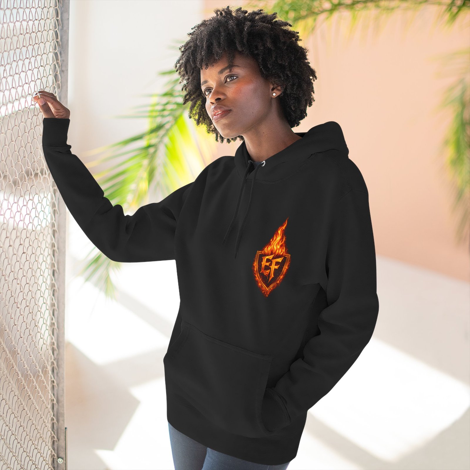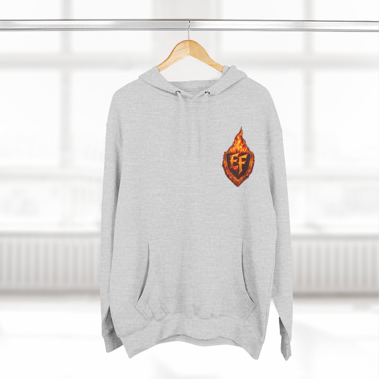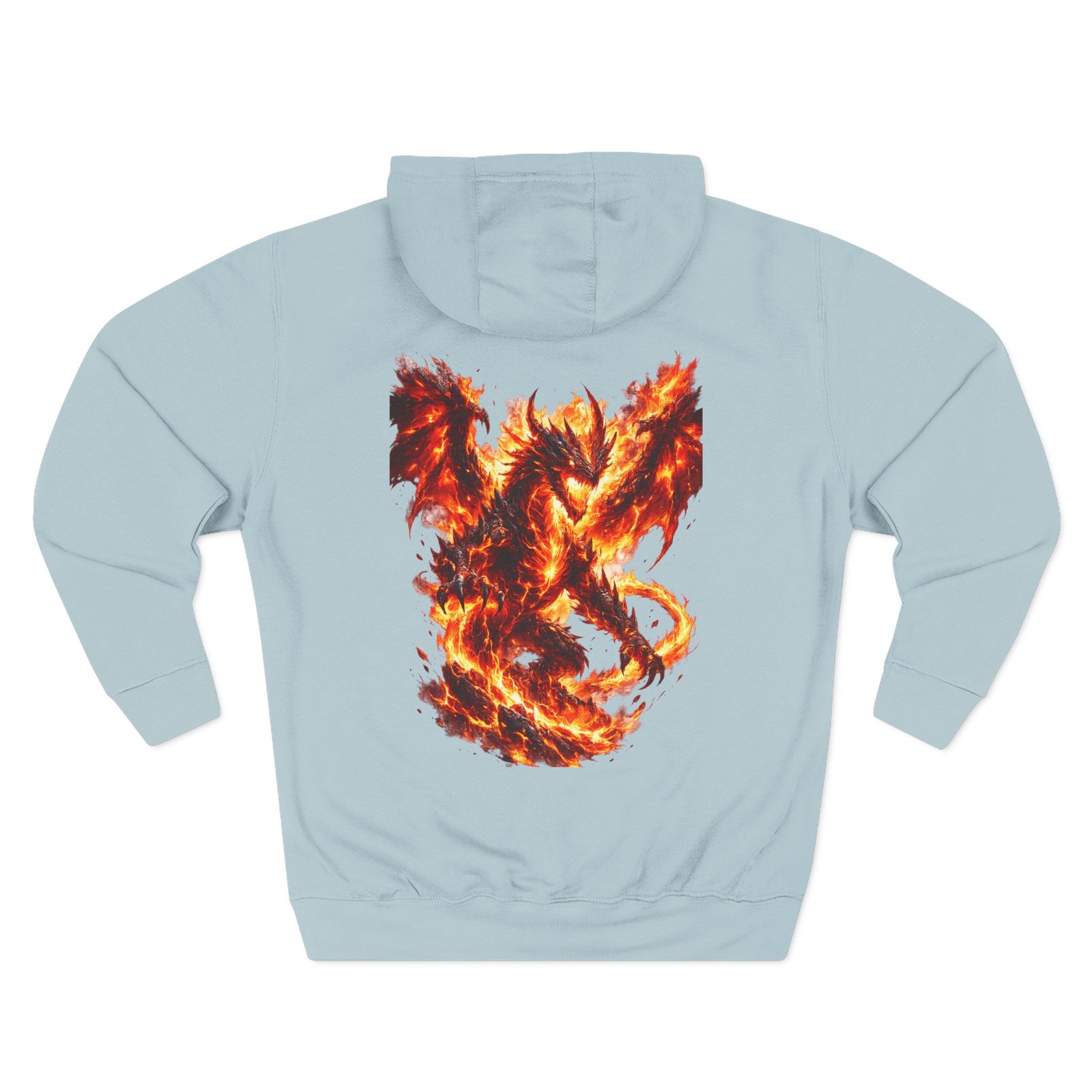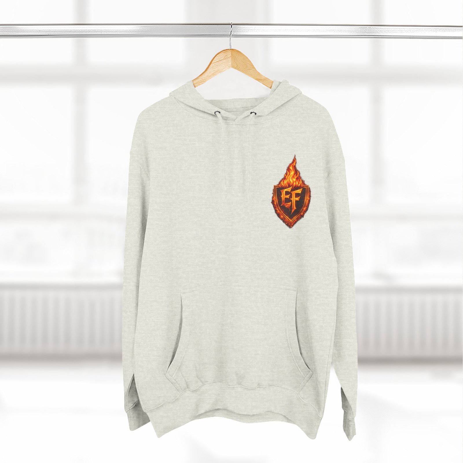 This fleece hoodie brings a fiery, expressive energy to quiet days and busy nights. Built with a soft, medium-heavy fleece and a roomy kangaroo pocket, it feels substantial without weighing you down. The front chest carries a small, embroidered flame emblem while the back explodes into a bold, phoenix-like blaze in vivid, print-ready detail — a statement piece that reads as both art and armor. The adjustable hood, durable double-stitched seams, and shrink-resistant knit mean this will be a go-to layer that stays true after repeated wears. Wear it when you want to stand out without shouting: pairing athletic ease with handcrafted, elemental imagery.