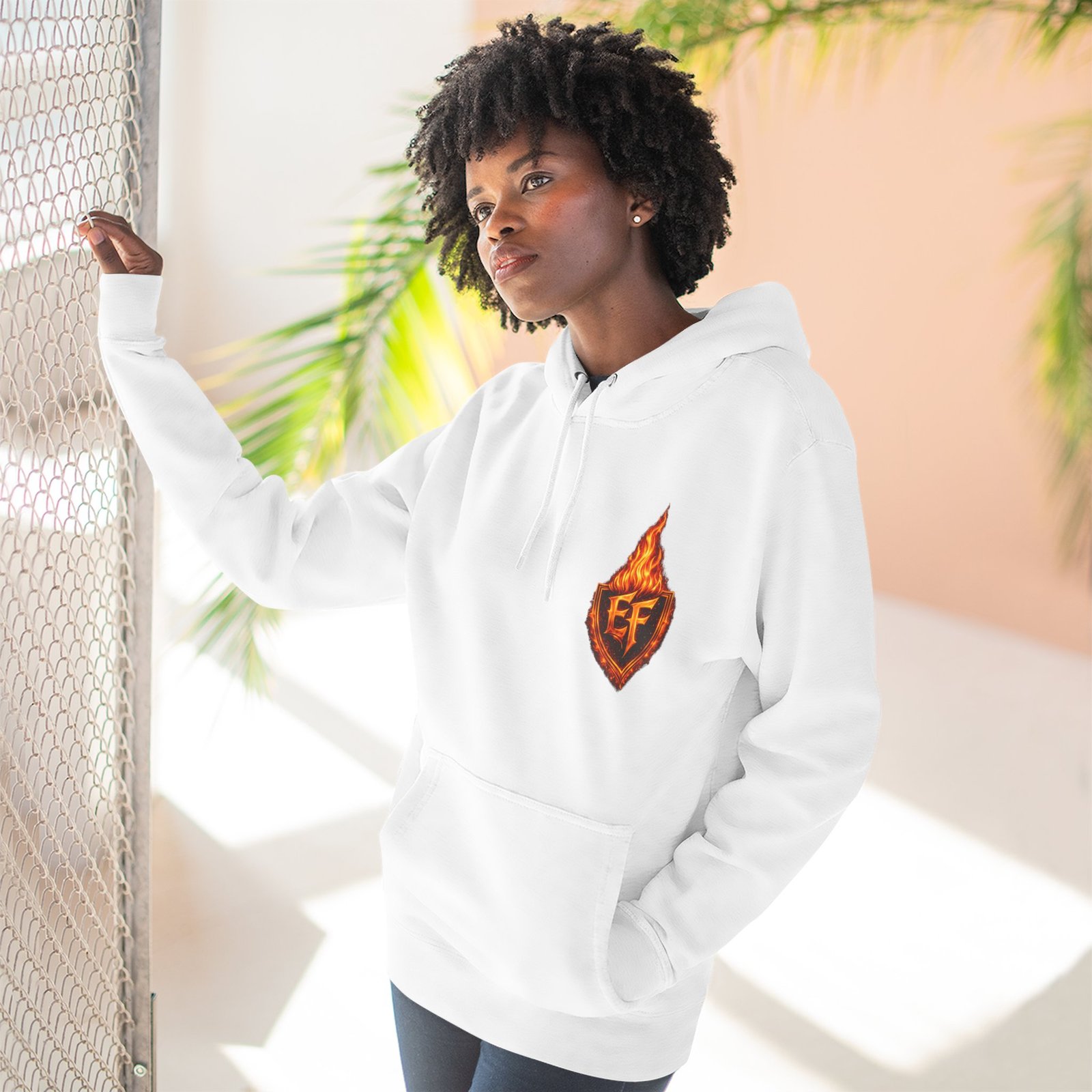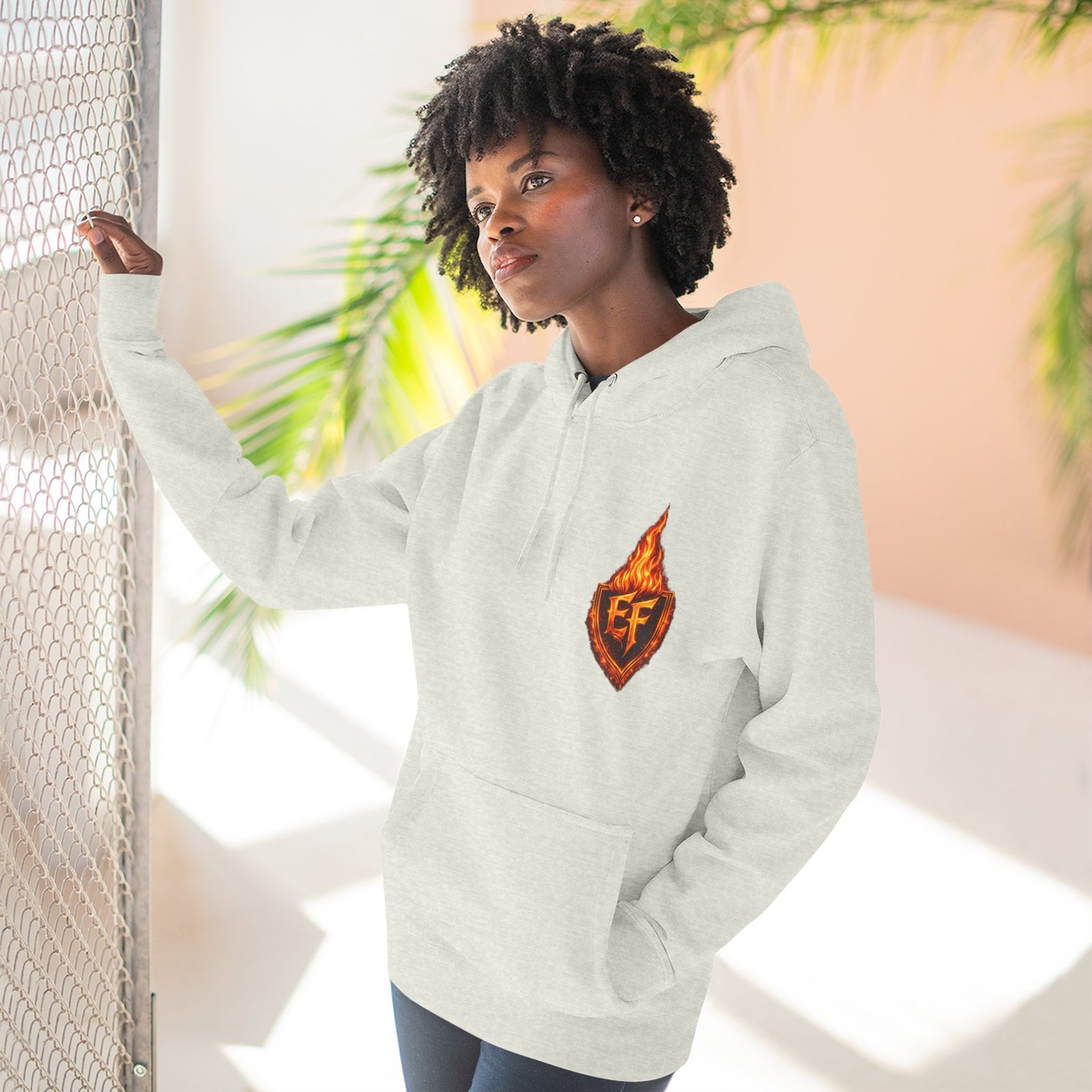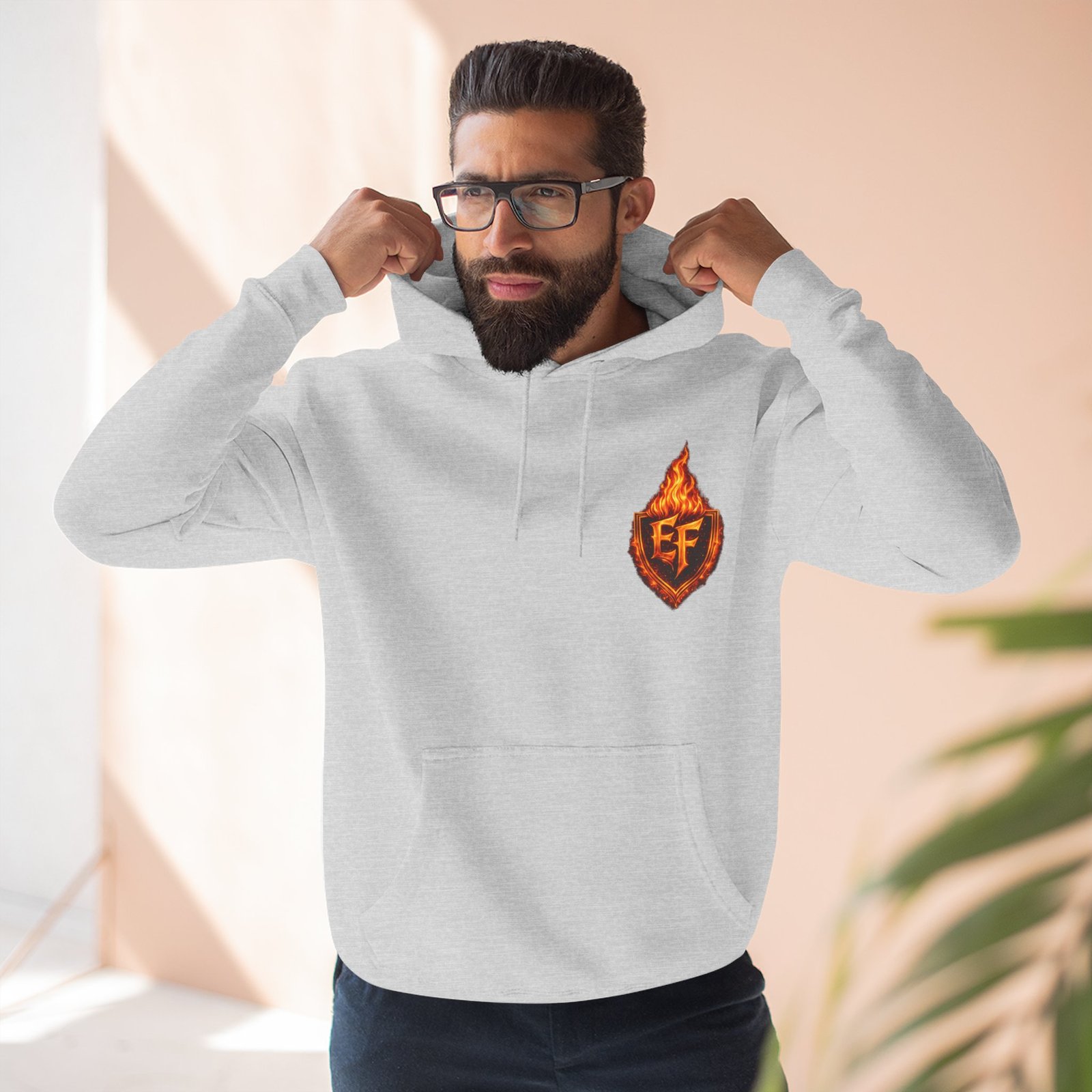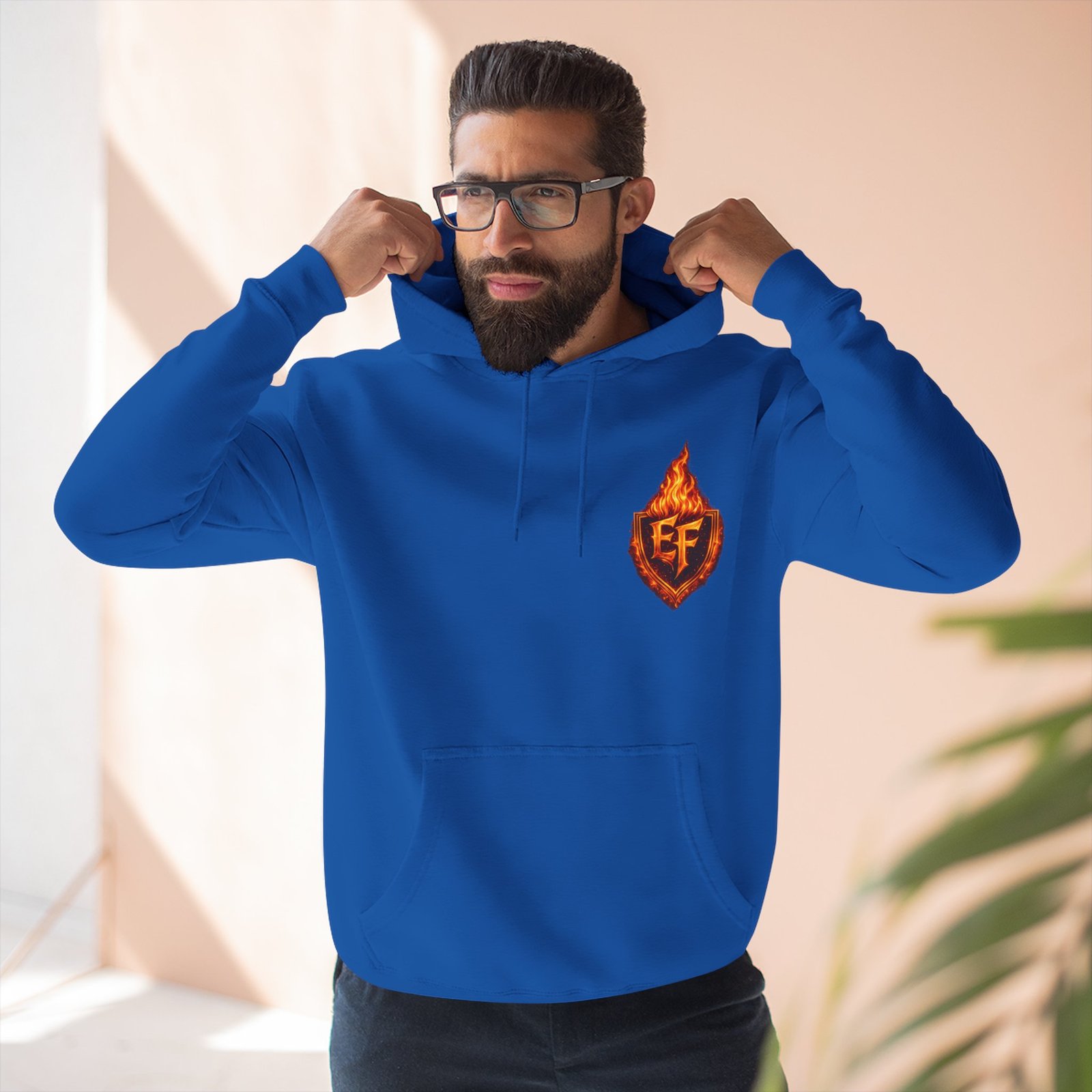 This fleece hoodie brings a fiery, expressive energy to quiet days and busy nights. Built with a soft, medium-heavy fleece and a roomy kangaroo pocket, it feels substantial without weighing you down. The front chest carries a small, embroidered flame emblem while the back explodes into a bold, phoenix-like blaze in vivid, print-ready detail — a statement piece that reads as both art and armor. The adjustable hood, durable double-stitched seams, and shrink-resistant knit mean this will be a go-to layer that stays true after repeated wears. Wear it when you want to stand out without shouting: pairing athletic ease with handcrafted, elemental imagery.