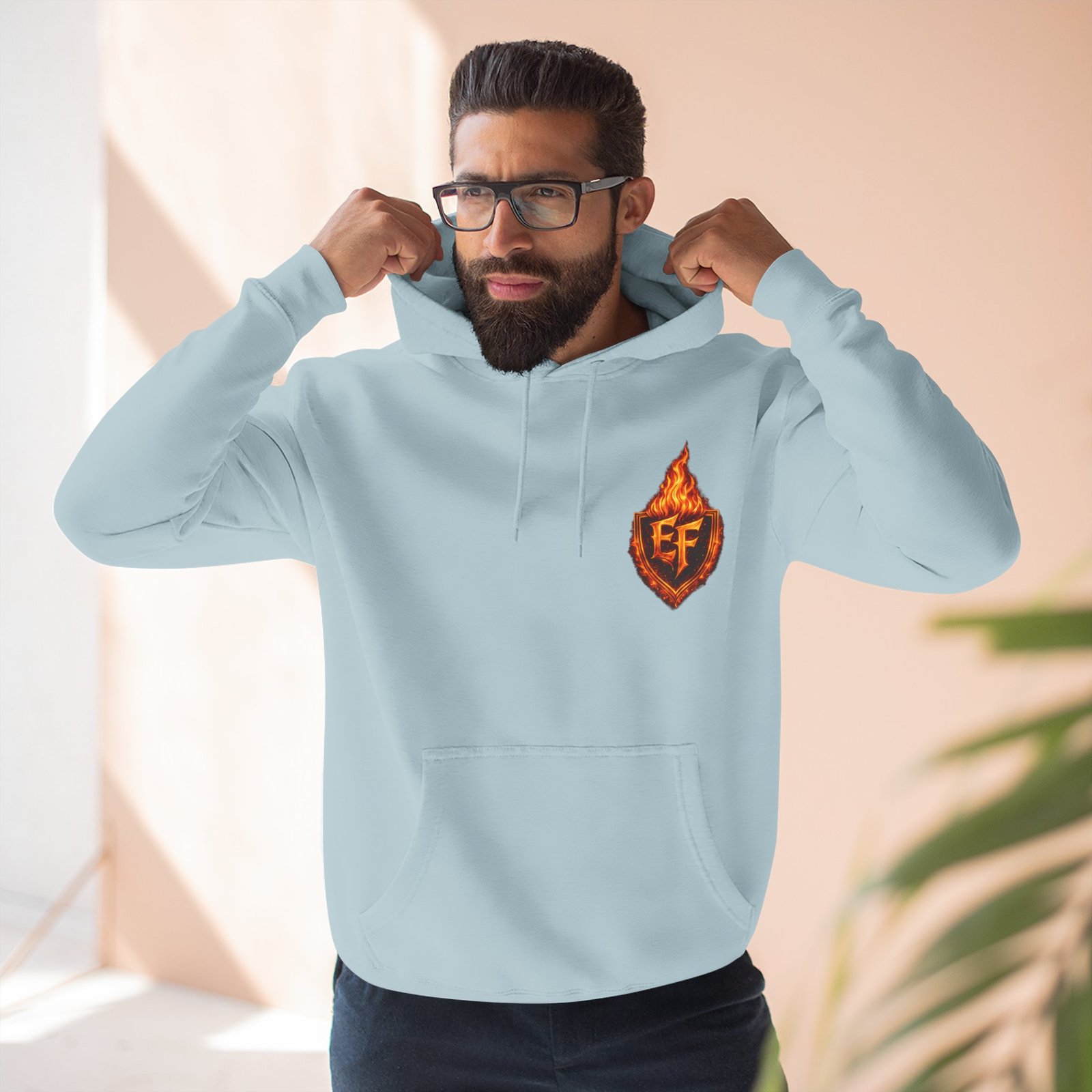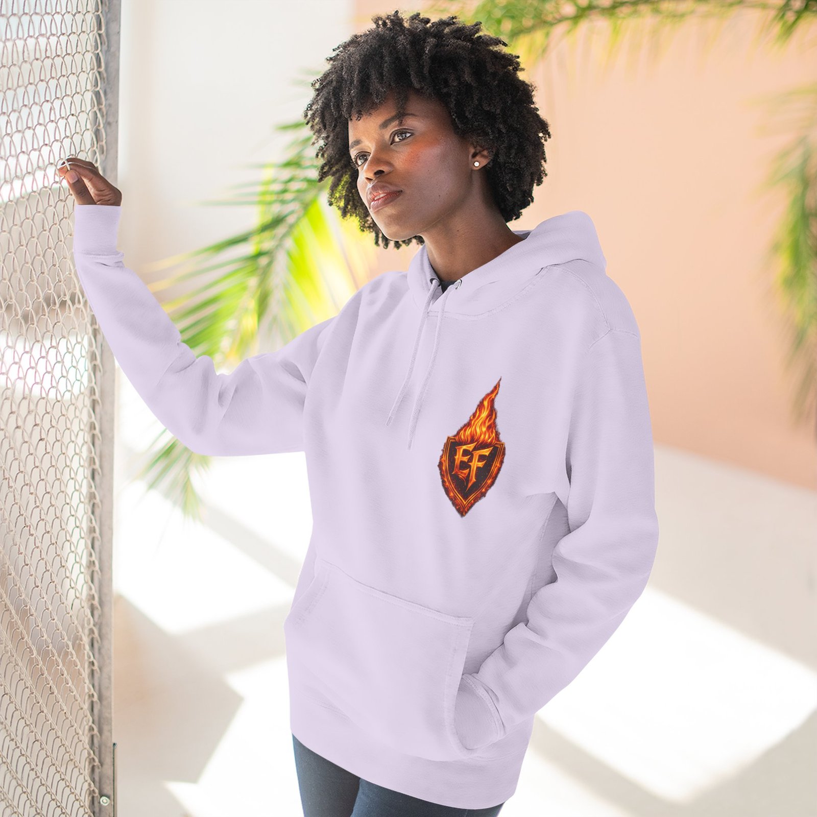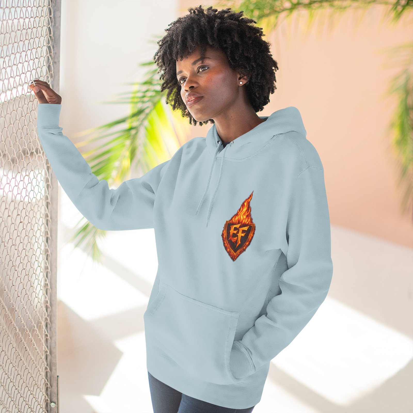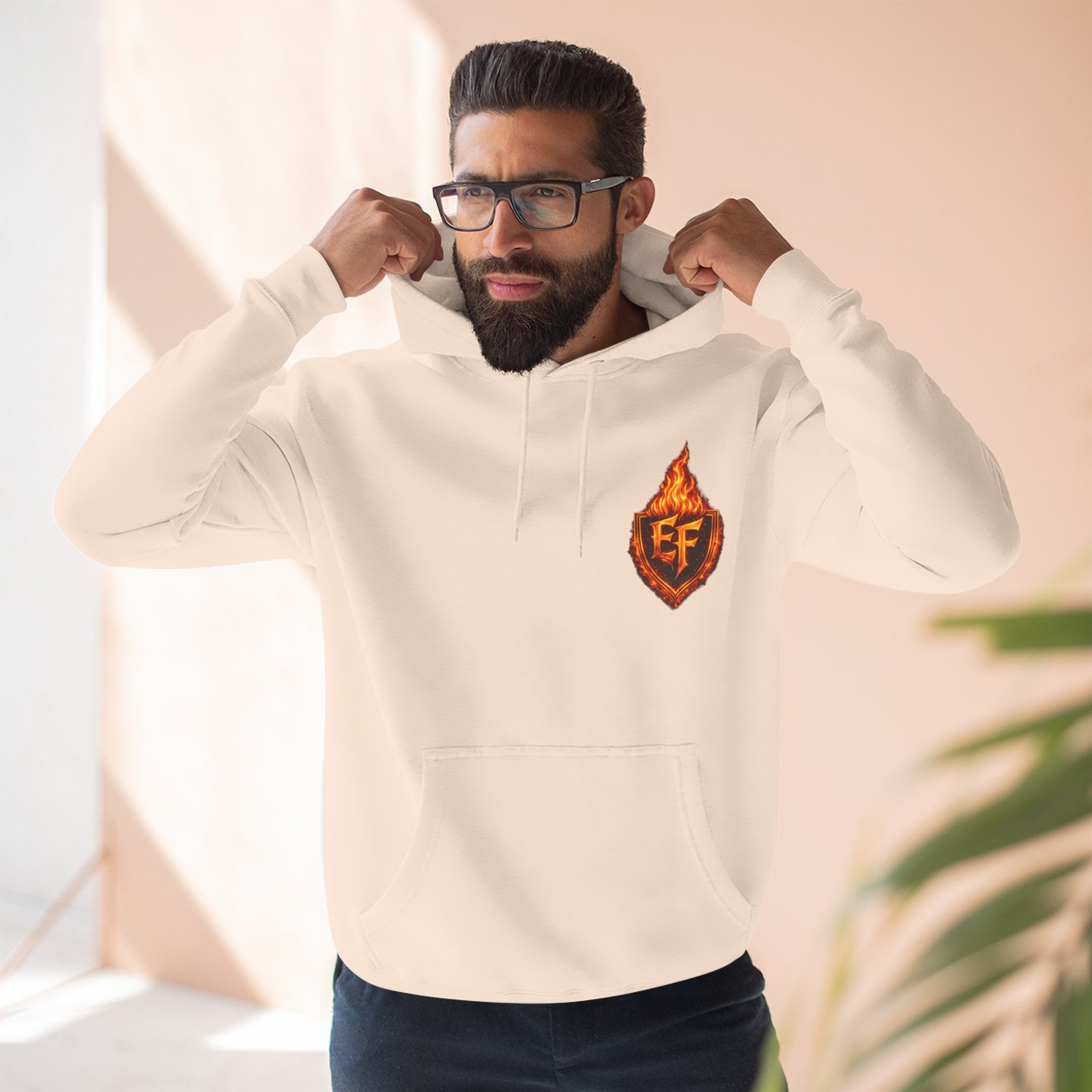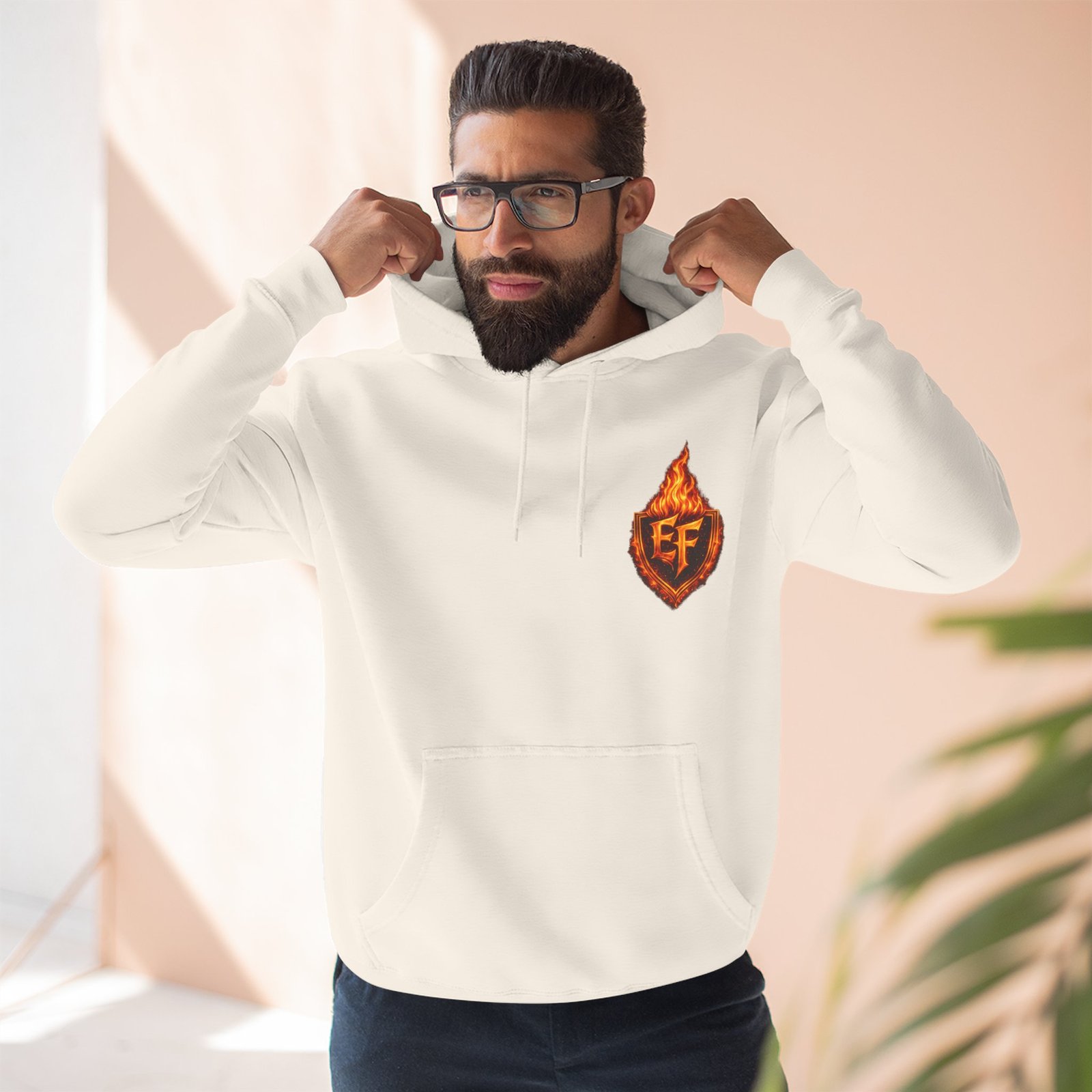 This fleece hoodie brings a fiery, expressive energy to quiet days and busy nights. Built with a soft, medium-heavy fleece and a roomy kangaroo pocket, it feels substantial without weighing you down. The front chest carries a small, embroidered flame emblem while the back explodes into a bold, phoenix-like blaze in vivid, print-ready detail — a statement piece that reads as both art and armor. The adjustable hood, durable double-stitched seams, and shrink-resistant knit mean this will be a go-to layer that stays true after repeated wears. Wear it when you want to stand out without shouting: pairing athletic ease with handcrafted, elemental imagery.