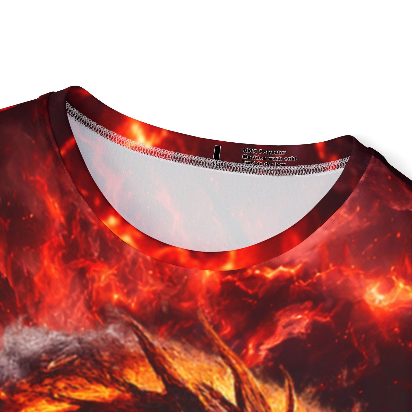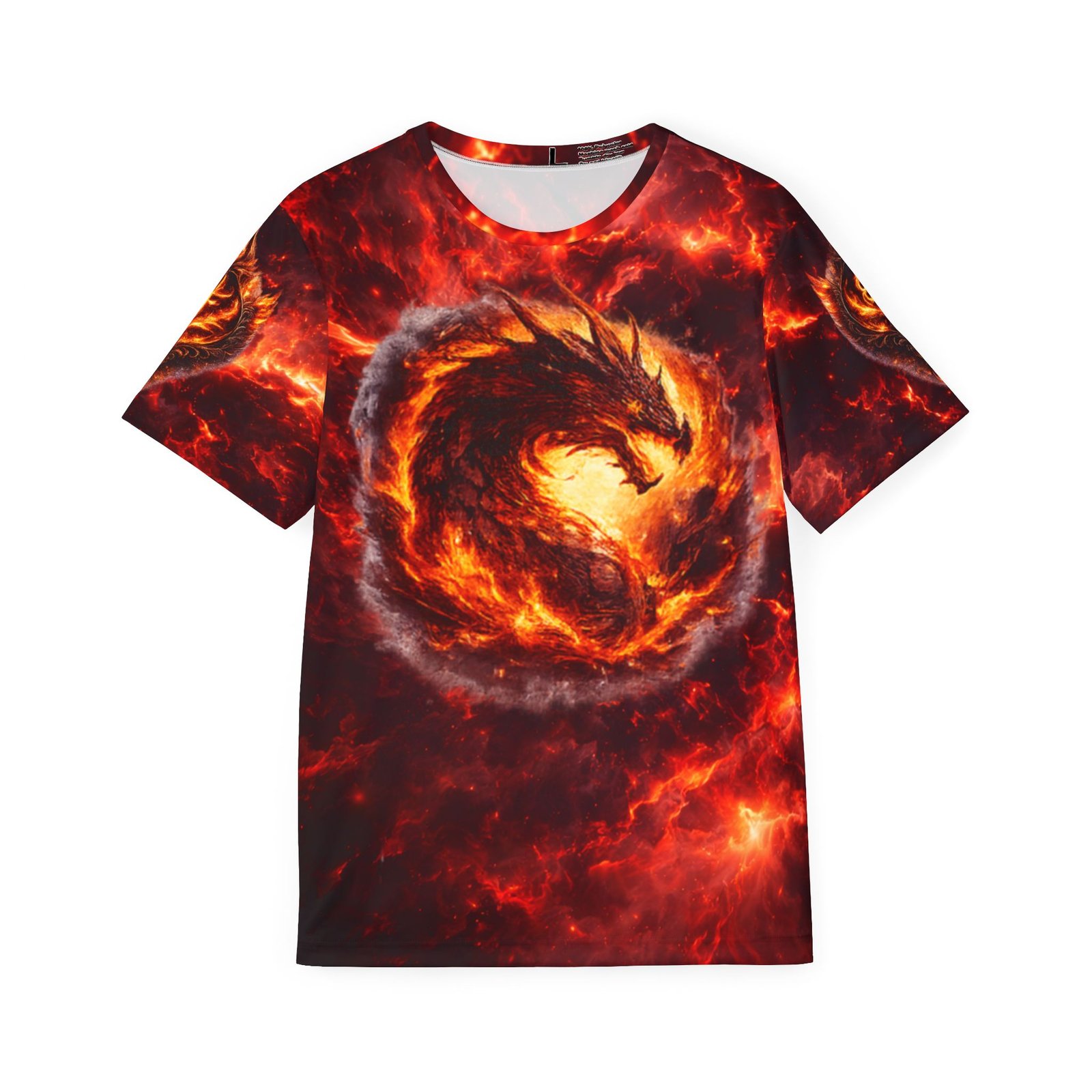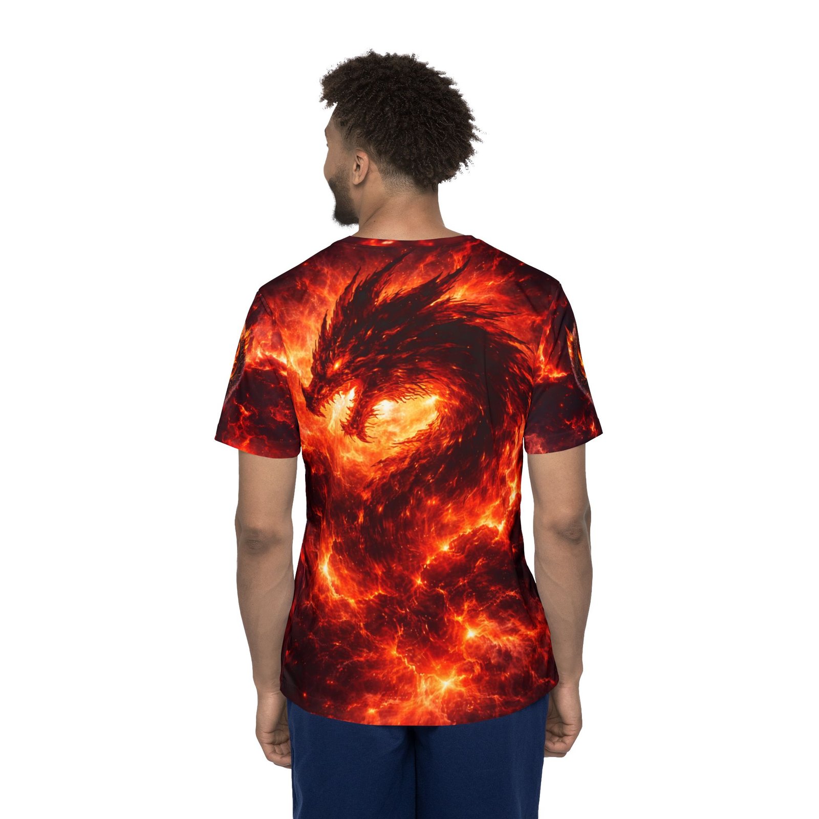 This all-over-print sports jersey brings molten energy to your active wardrobe. A swirling fire-drake motif wraps the front and back in deep reds, ember-gold highlights, and smoky contrasts — made to move with you whether you’re training, gaming, or heading out with friends. The lightweight, moisture-wicking polyester keeps you cool through intense sessions while the ribbed collar and armholes stretch on and spring back for a comfortable, classic fit. Bright, durable printing preserves the dramatic colors so the design stays vivid wash after wash. Wear it when you want bold, kinetic style that reads as fierce confidence rather than background noise.