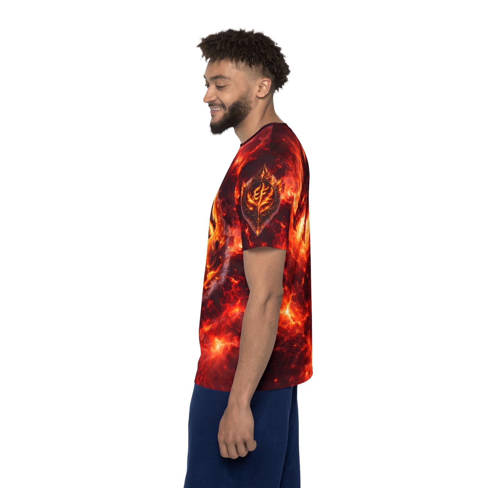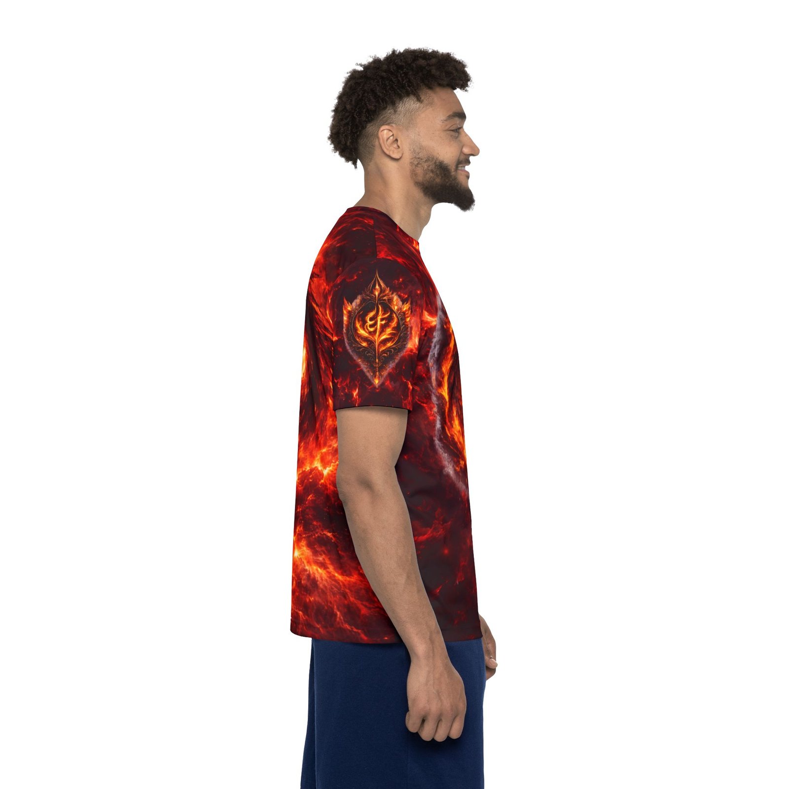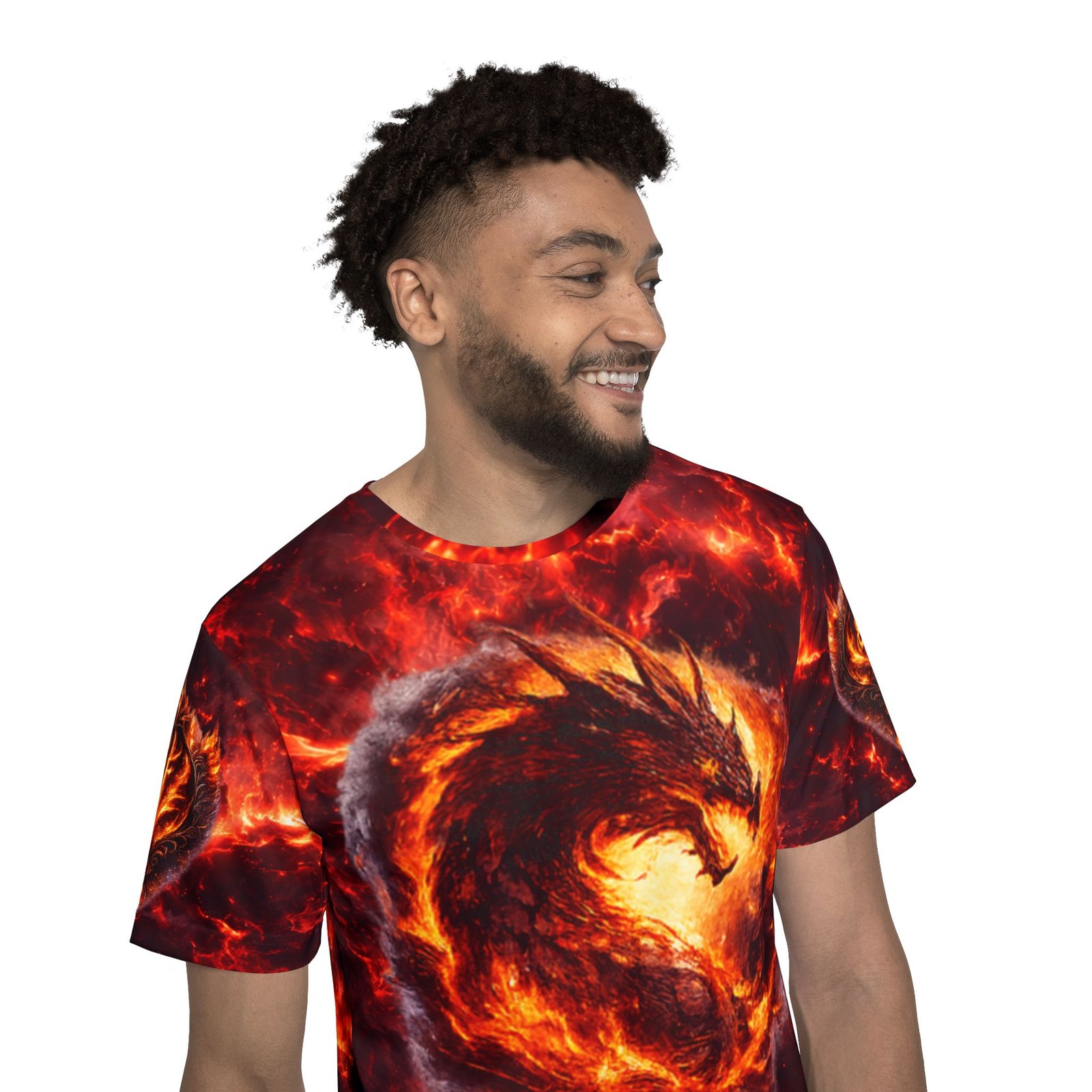 This all-over-print sports jersey brings molten energy to your active wardrobe. A swirling fire-drake motif wraps the front and back in deep reds, ember-gold highlights, and smoky contrasts — made to move with you whether you’re training, gaming, or heading out with friends. The lightweight, moisture-wicking polyester keeps you cool through intense sessions while the ribbed collar and armholes stretch on and spring back for a comfortable, classic fit. Bright, durable printing preserves the dramatic colors so the design stays vivid wash after wash. Wear it when you want bold, kinetic style that reads as fierce confidence rather than background noise.