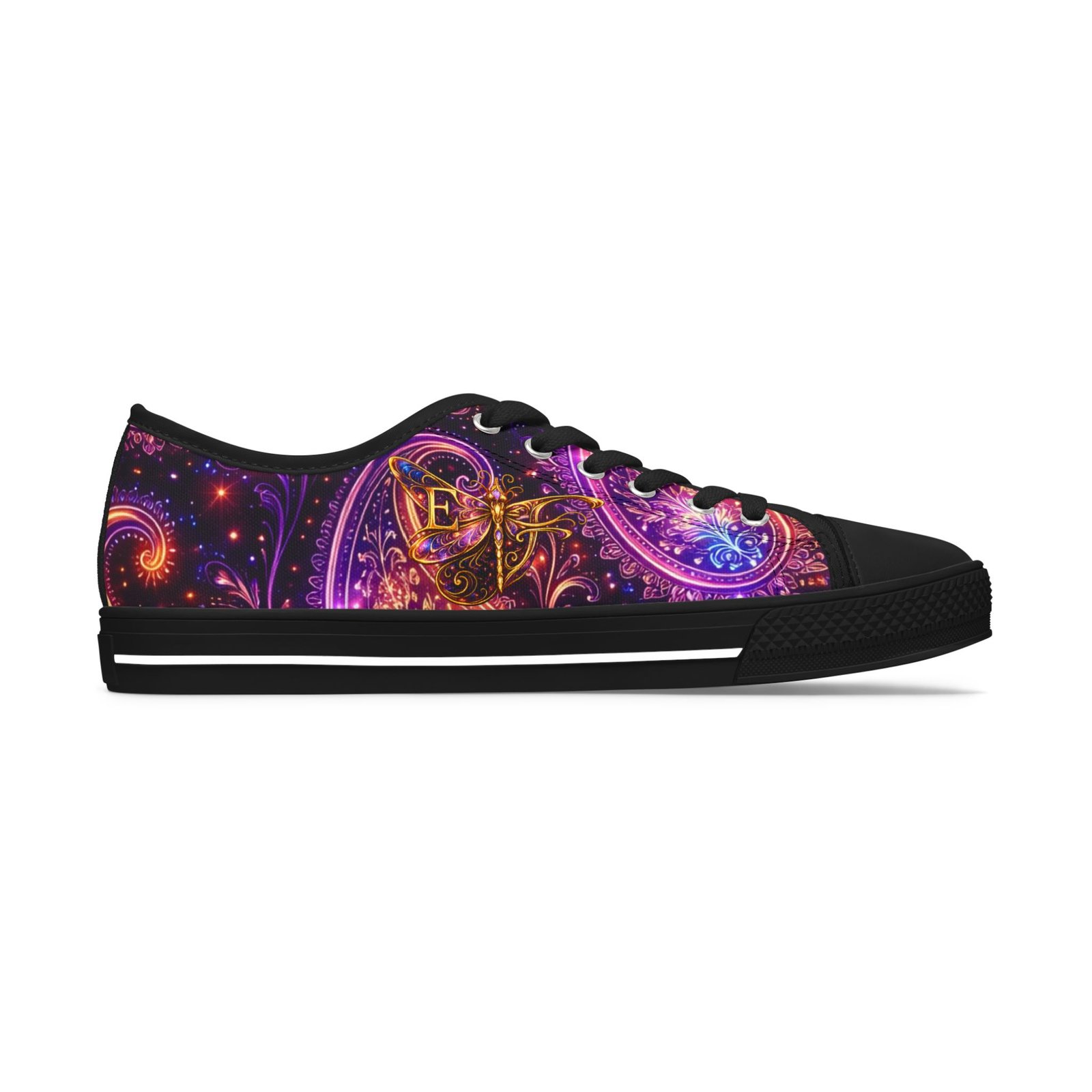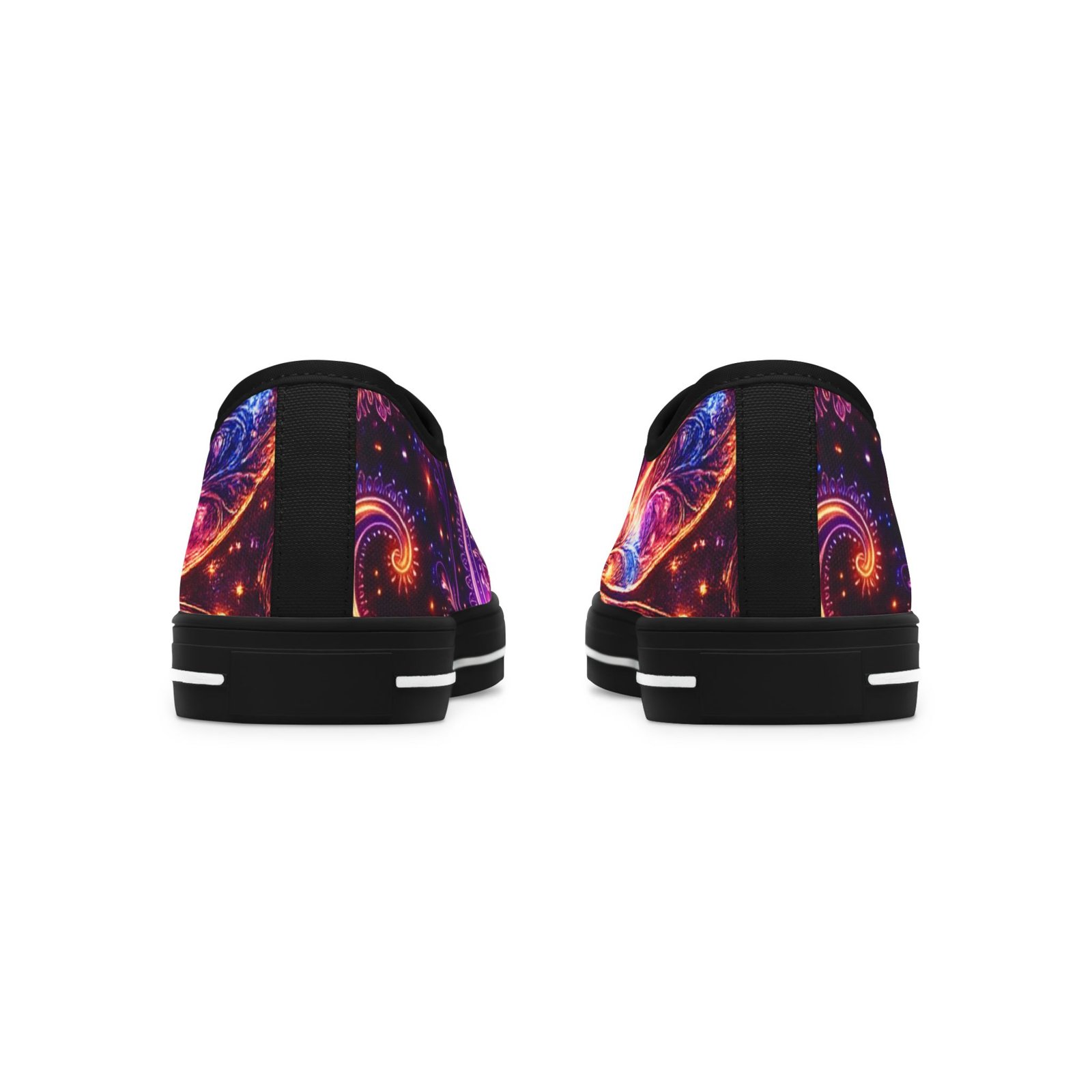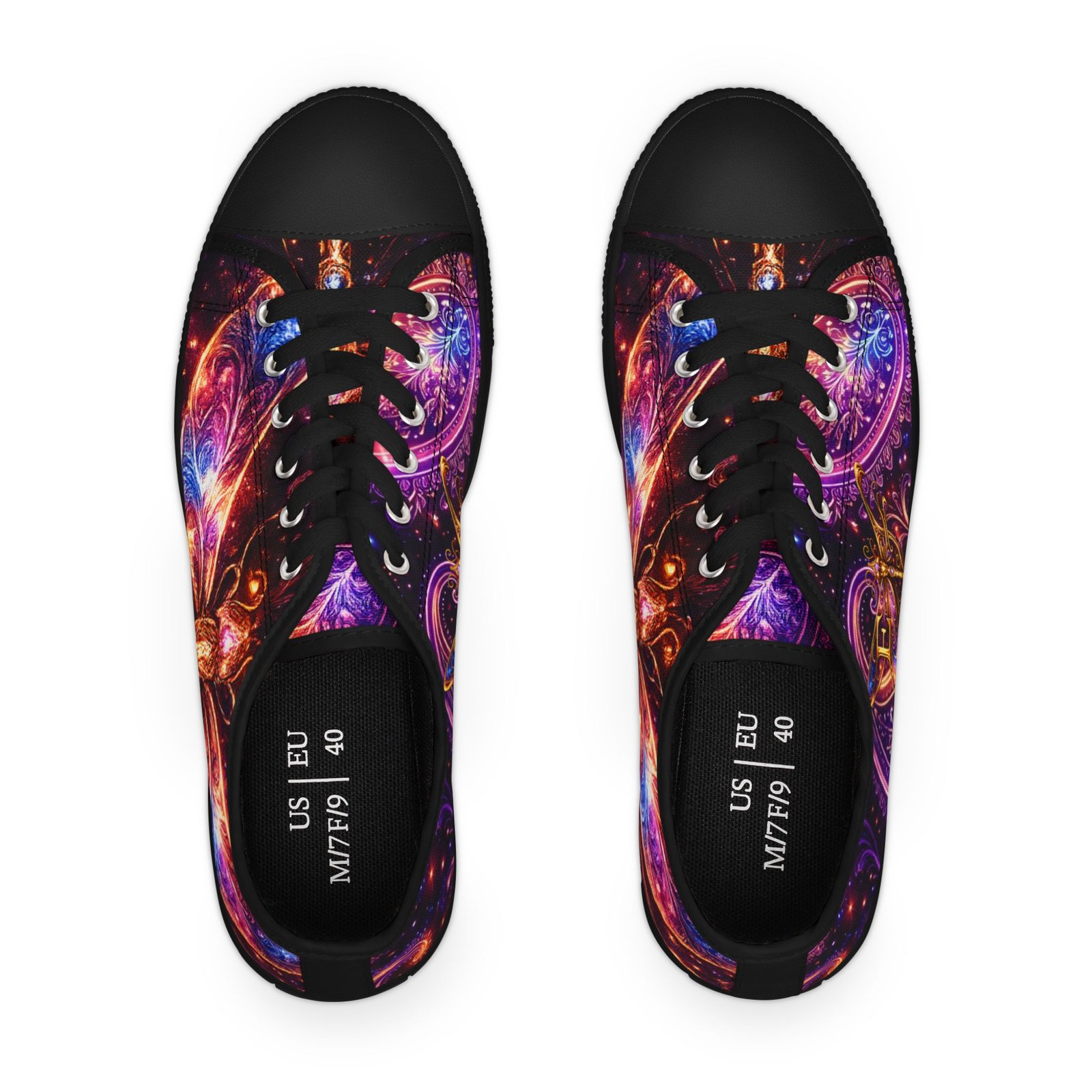 Step into color and movement with these low-top canvas sneakers that feel like wearable art. The full wraparound print brings a luminous, mandala-like design alive—rich purples, warm ambers, and electric blues swirl together around a central floral motif. Lightweight EVA soles and memory-foam insoles cushion each step, while a pleather-covered toe and durable rubber outsole stand up to daily wear. Silver metal eyelets and clean black-or-white trim keep the look polished. These shoes pair with jeans, flowy skirts, or festival outfits and carry a sense of wanderlust and late-night wonder wherever you go.