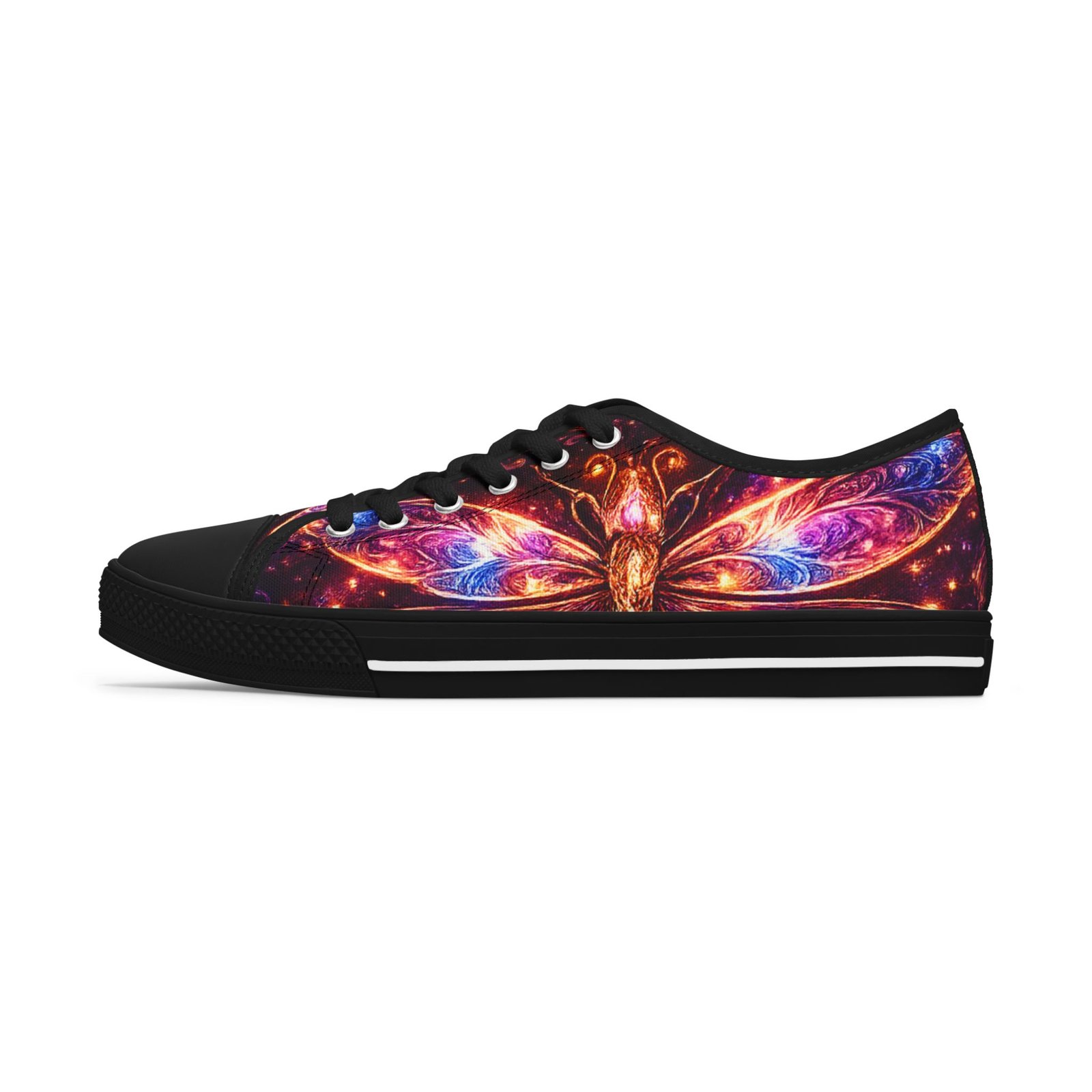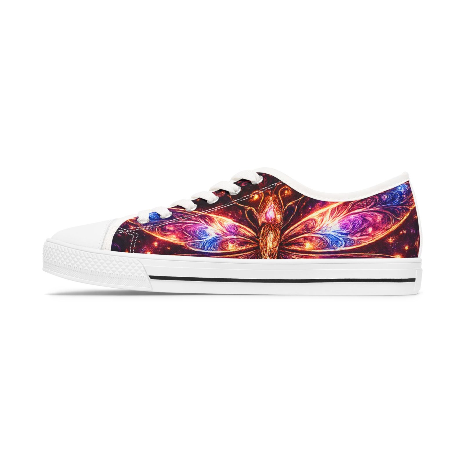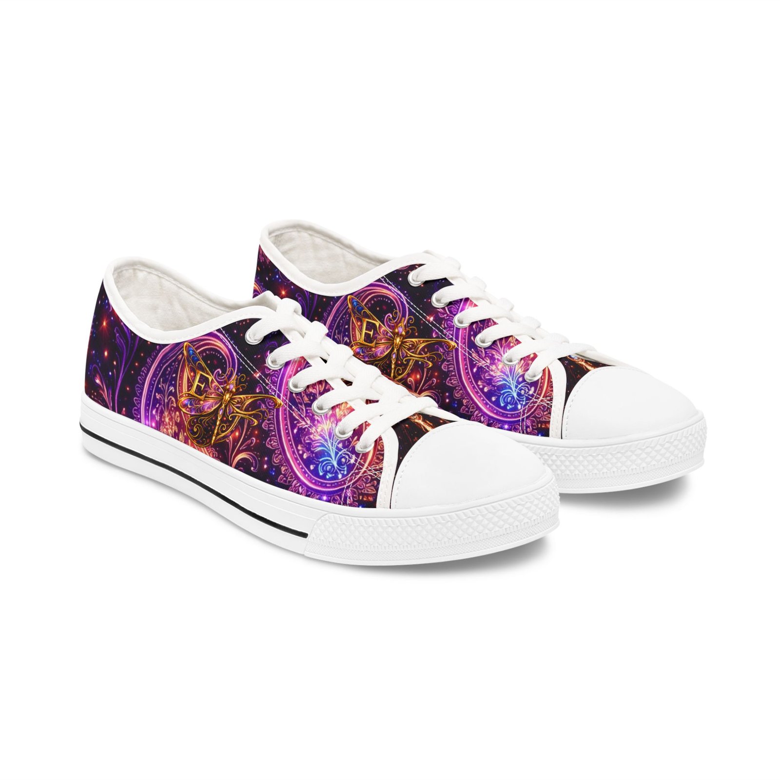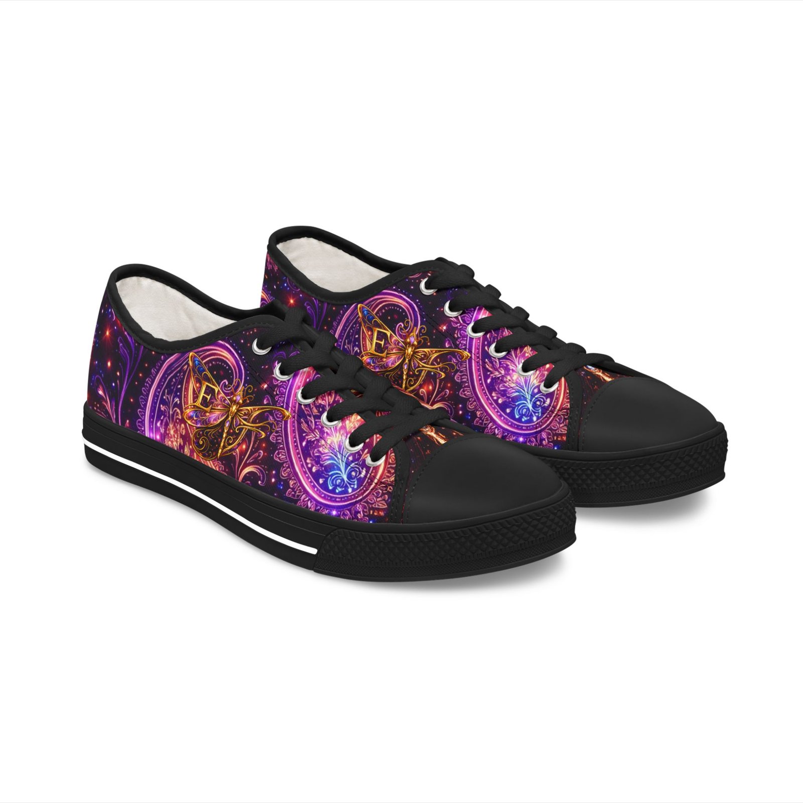 Step into color and movement with these low-top canvas sneakers that feel like wearable art. The full wraparound print brings a luminous, mandala-like design alive—rich purples, warm ambers, and electric blues swirl together around a central floral motif. Lightweight EVA soles and memory-foam insoles cushion each step, while a pleather-covered toe and durable rubber outsole stand up to daily wear. Silver metal eyelets and clean black-or-white trim keep the look polished. These shoes pair with jeans, flowy skirts, or festival outfits and carry a sense of wanderlust and late-night wonder wherever you go.