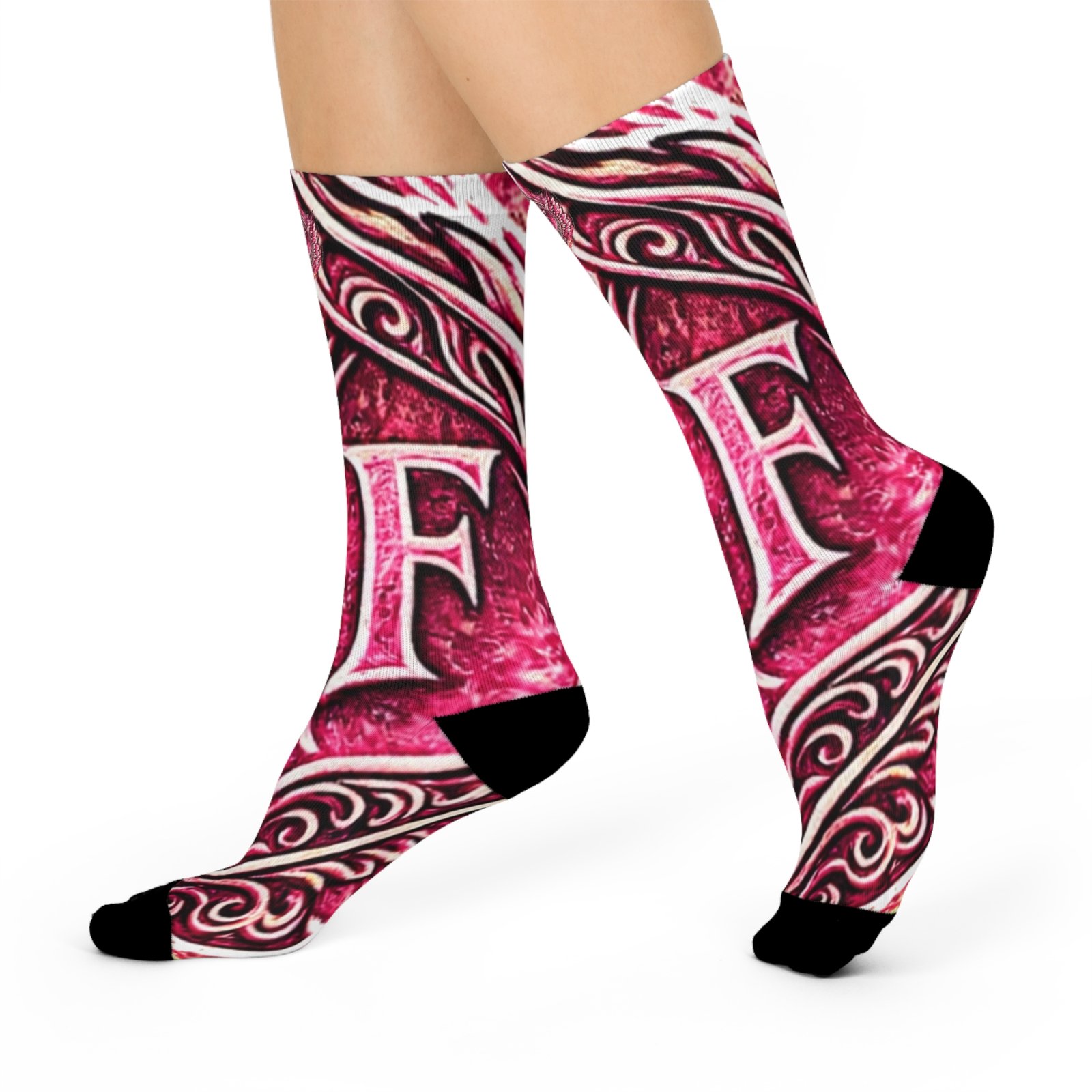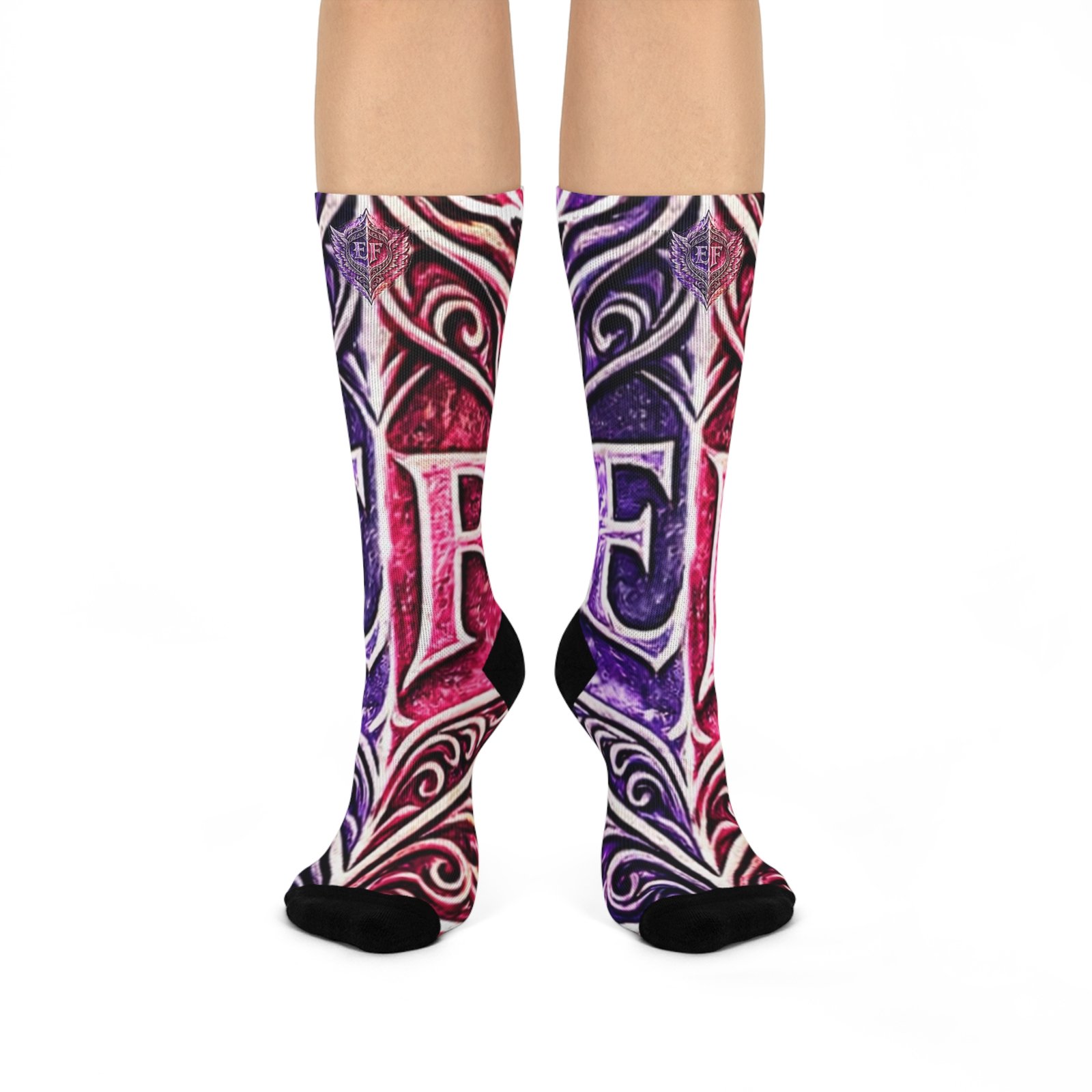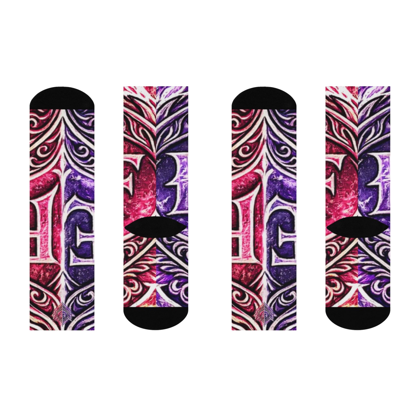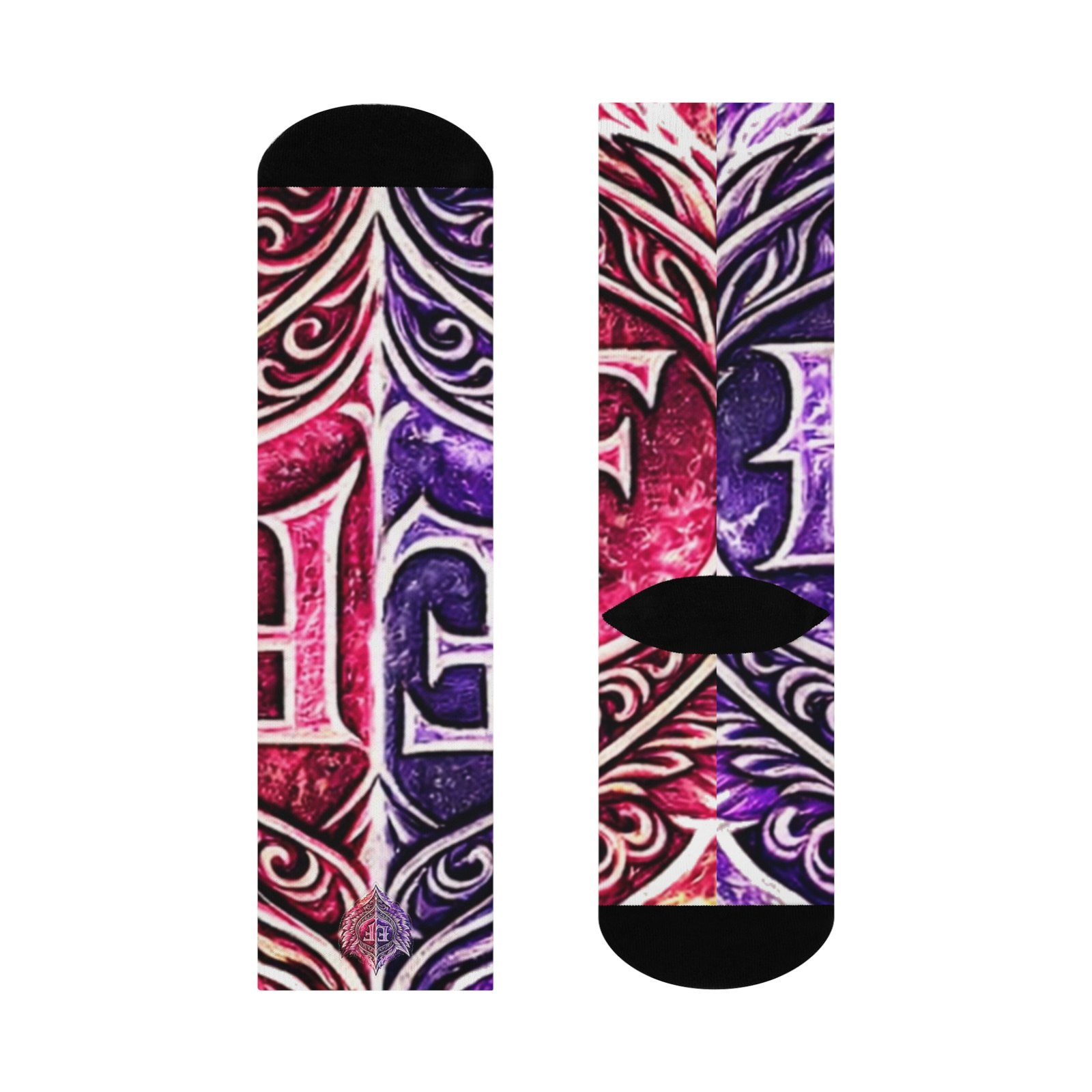 These cushioned crew socks bring bold, artistic energy to everyday wear. Lively magenta and deep purple swirl together in an ornamental, tattoo-inspired pattern that wraps the leg, while the black heel and toe add contrast and durability. The knit is smooth and stretchy, so the printed design stays vibrant and detailed through movement. With plush cushioning underfoot, they hold up from morning runs to long shifts on your feet, and the one-size stretch fits a wide range of sizes for easy grabbing and going. They slip into casual sneakers or dress shoes and add a confident, creative accent to any outfit. Product features – All-over print with bold magenta and purple ornamental pattern – Cushioned bottoms for added comfort during long wear – 200-needle premium knit for detailed, crisp printing – Stretchy, smooth fabric blend (73% polyester, 18% nylon, 3% cotton, 6% spandex) – One size fits women’s US 5 to men’s US 12; solid black heel and toe for durability Care instructions – Do not dryclean – Do not iron – Do not tumble dry – Do not bleach – Machine wash: cold (max 30C or 90F)