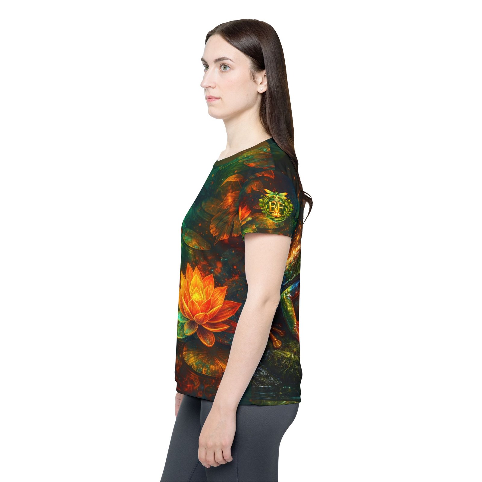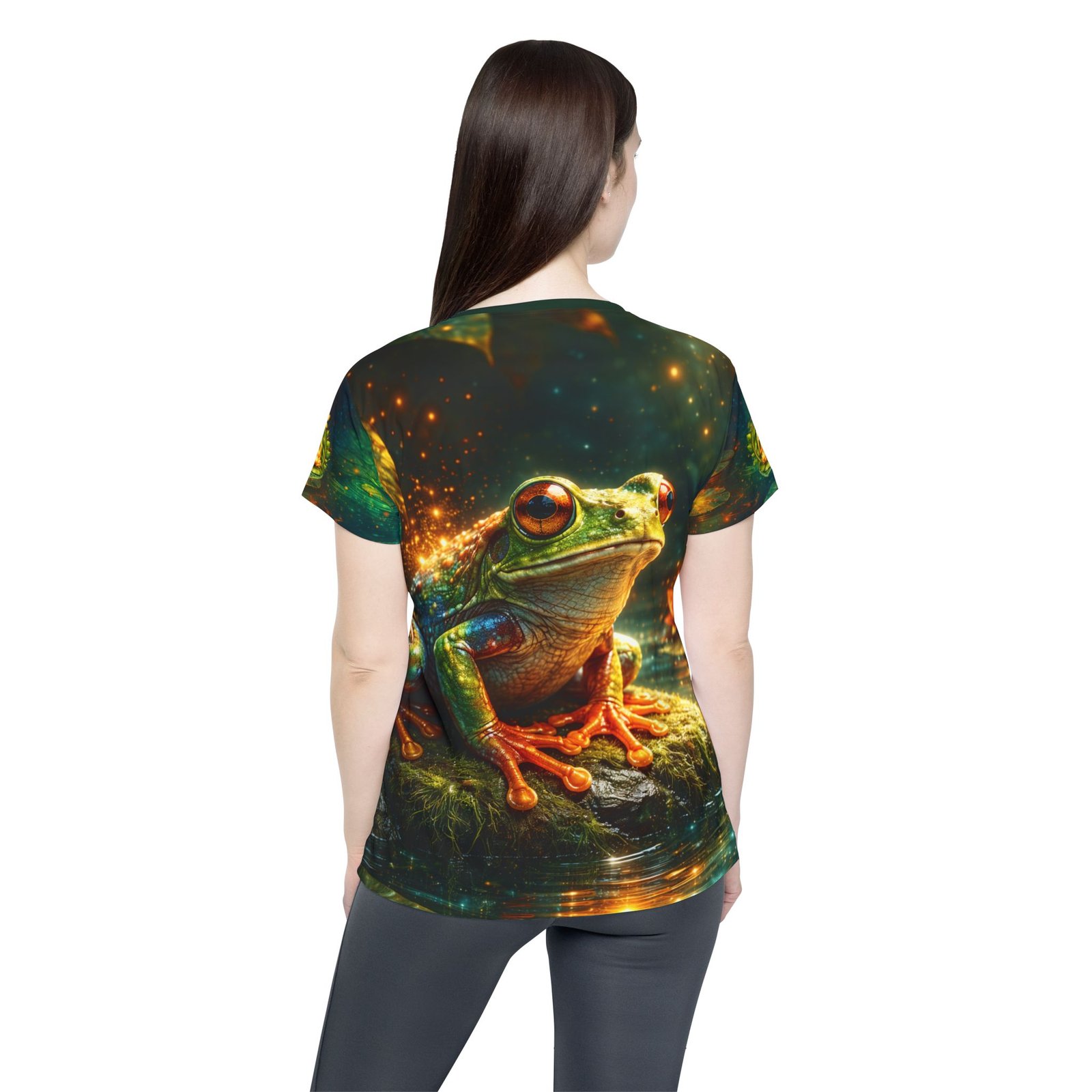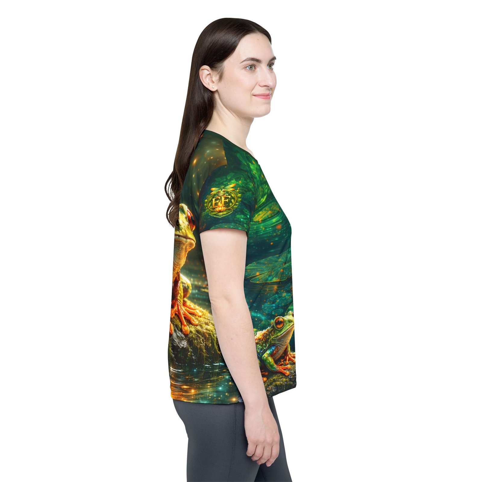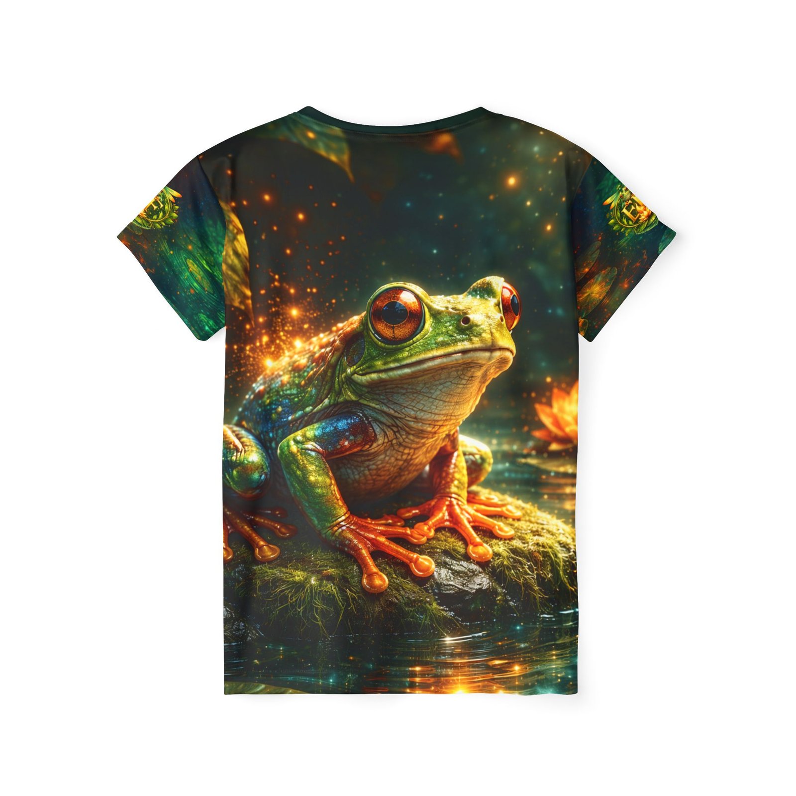 This lightweight jersey brings a pocket of enchanted wetlands into everyday wear. Deep emeralds and glowing amber swirl across the fabric, framing a curious tree frog perched beside a luminous lotus. The print feels like a quiet midnight pond — warm light on water, soft moss beneath your feet, and a tiny, watchful companion at the edge. Wear it when you want color that tells a story: during evening walks, art nights, or whenever you need a little nature magic in your day. The fit sits close but comfortable, and the fabric moves with you whether you’re stretching in yoga or pairing it with jeans for a casual outing.