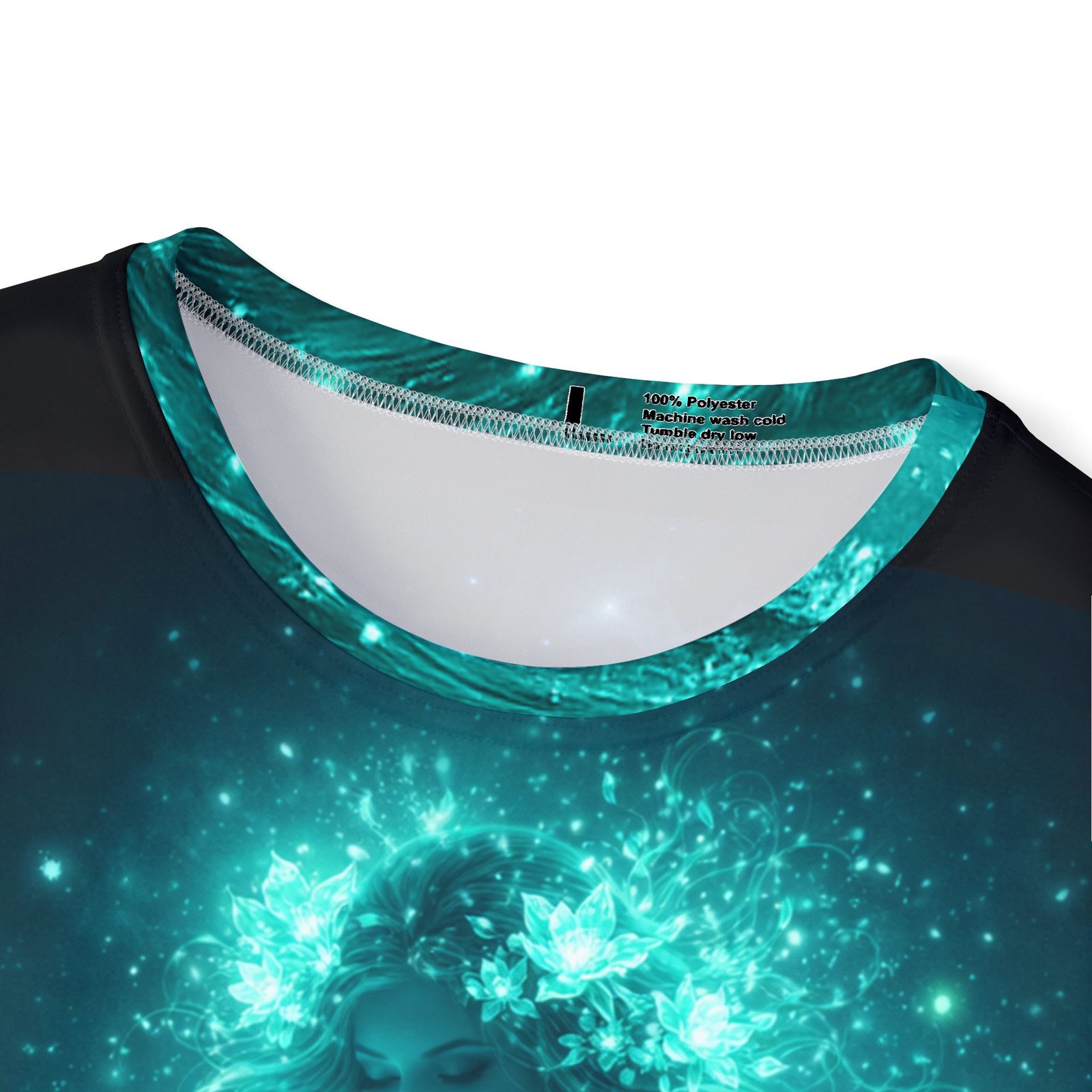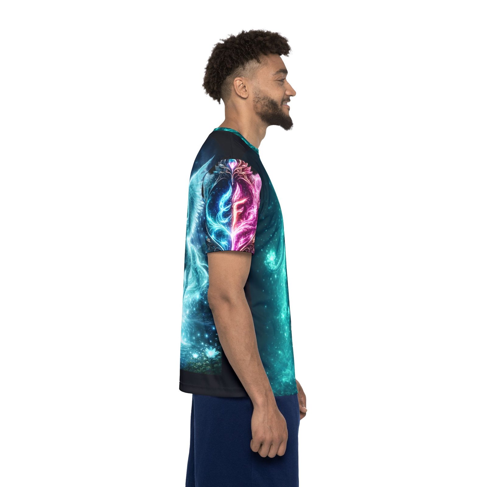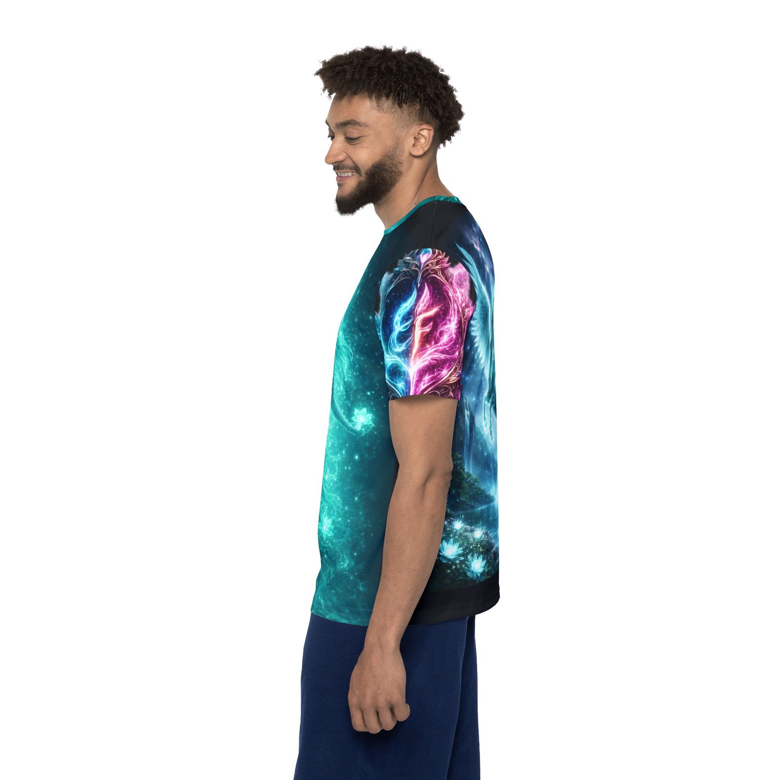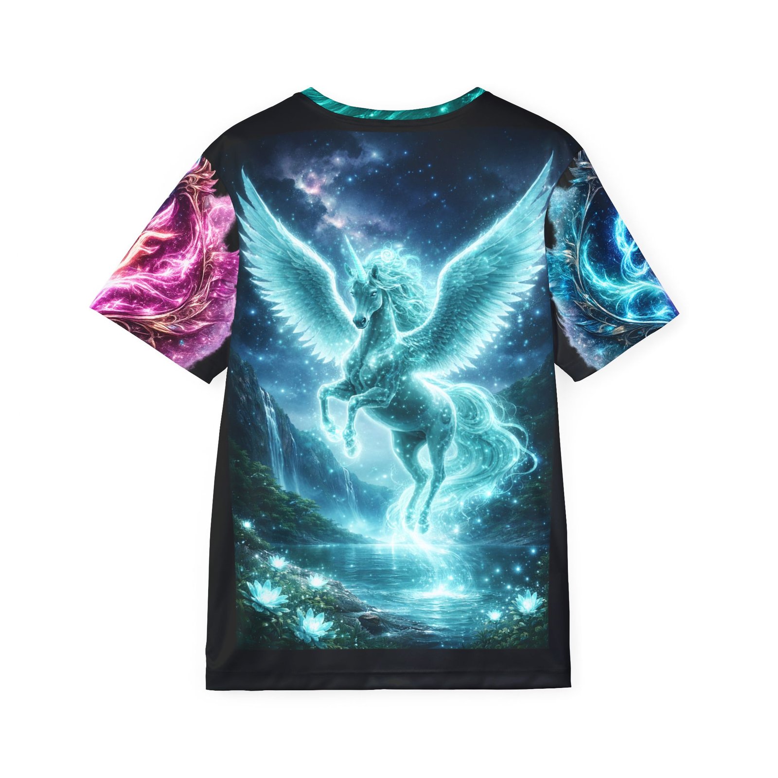 This all-over print sports jersey brings fantasy skies and luminous creatures into everyday movement. Lightweight, moisture-wicking polyester keeps you cool while the vibrant dye-sublimated artwork—glowing teal spirit figure on the front and a radiant winged unicorn on the back—wraps the shirt edge-to-edge. The 1×1 ribbed collar and armholes stretch with you and spring back for a clean, athletic fit. Wear it for training, long summer rides, or when you want your activewear to feel like a portal to another world. The extra-light fabric moves with you; crisp colors stay bright wash after wash thanks to advanced printing. Assembled in the USA with printed care labels, this jersey blends performance details with bold, otherworldly style.