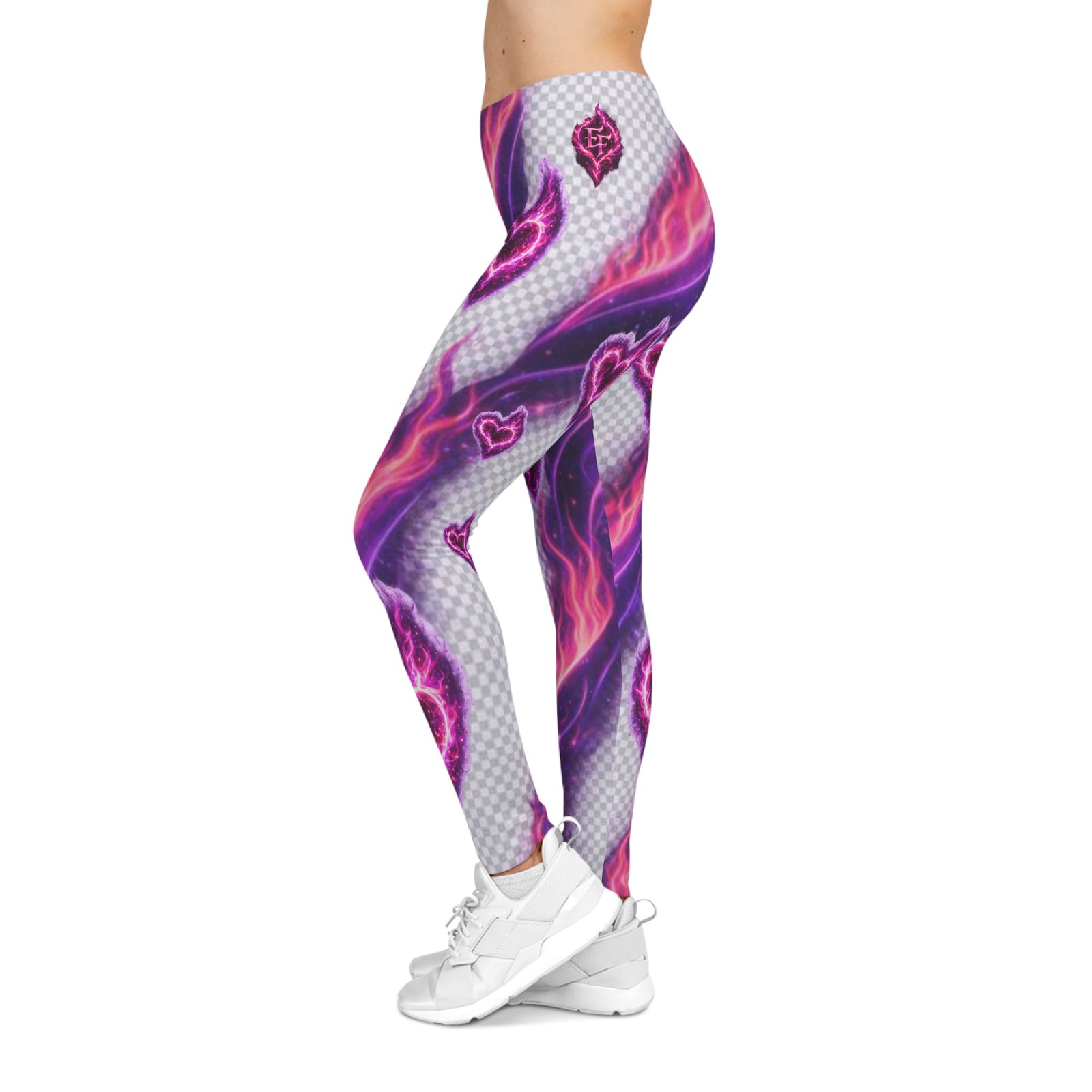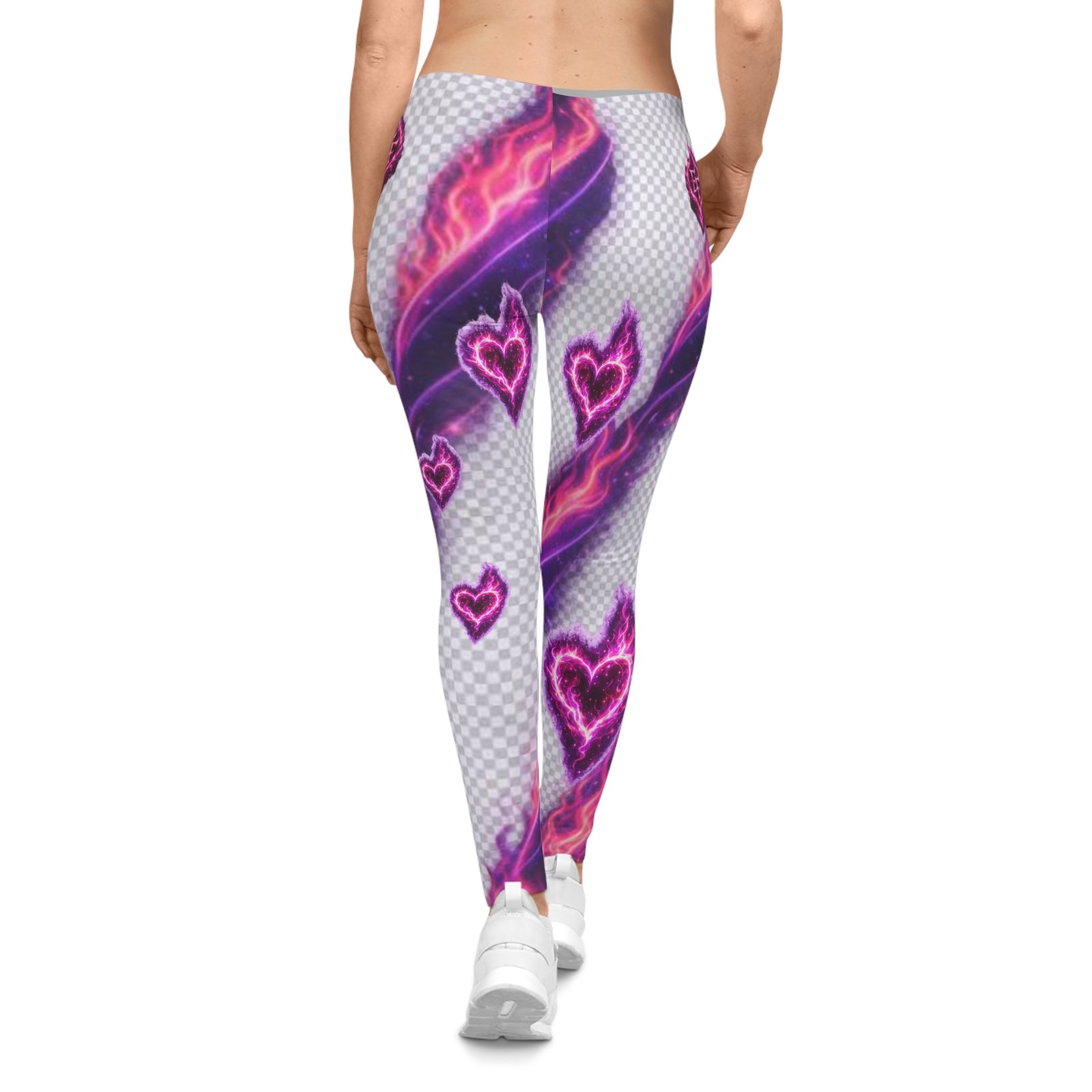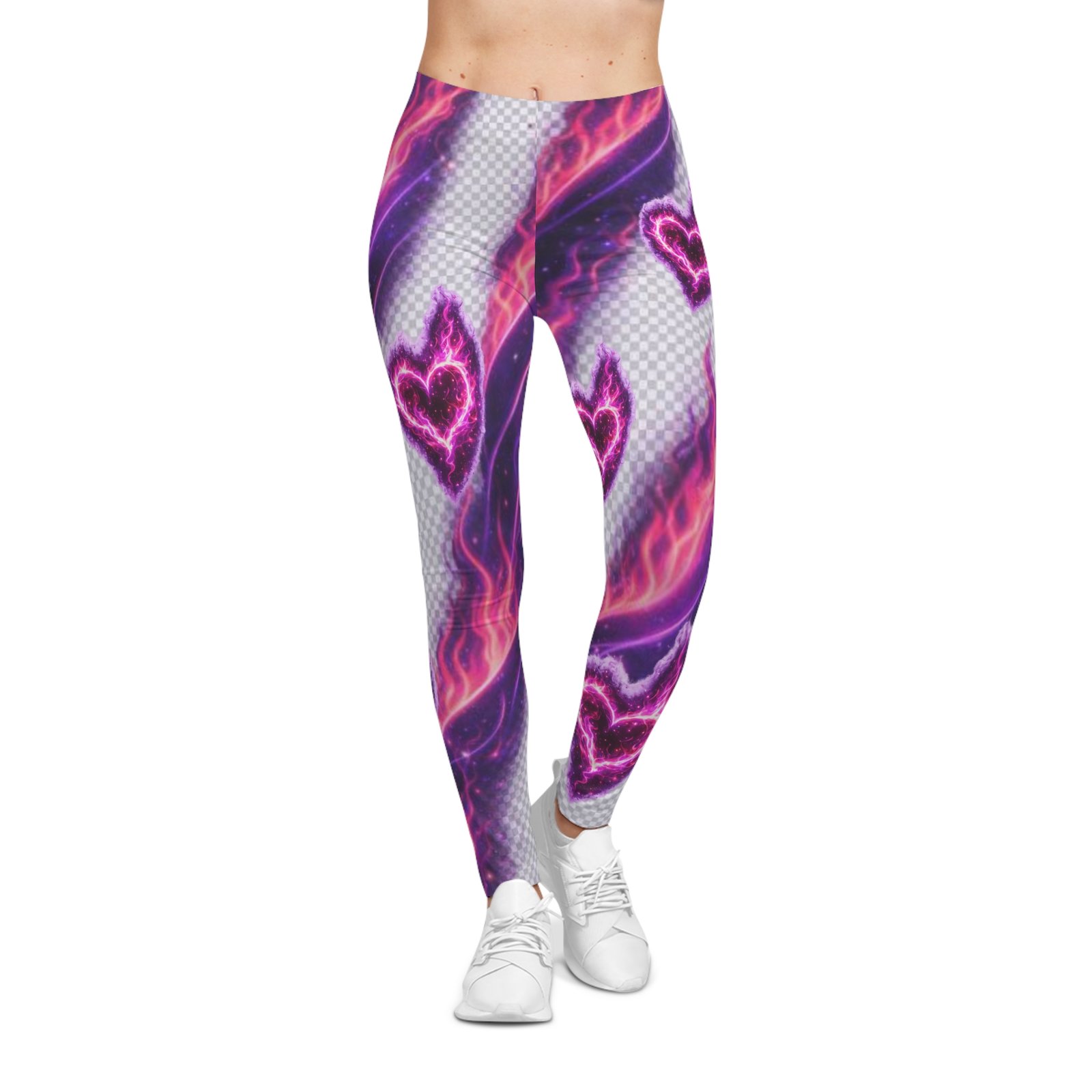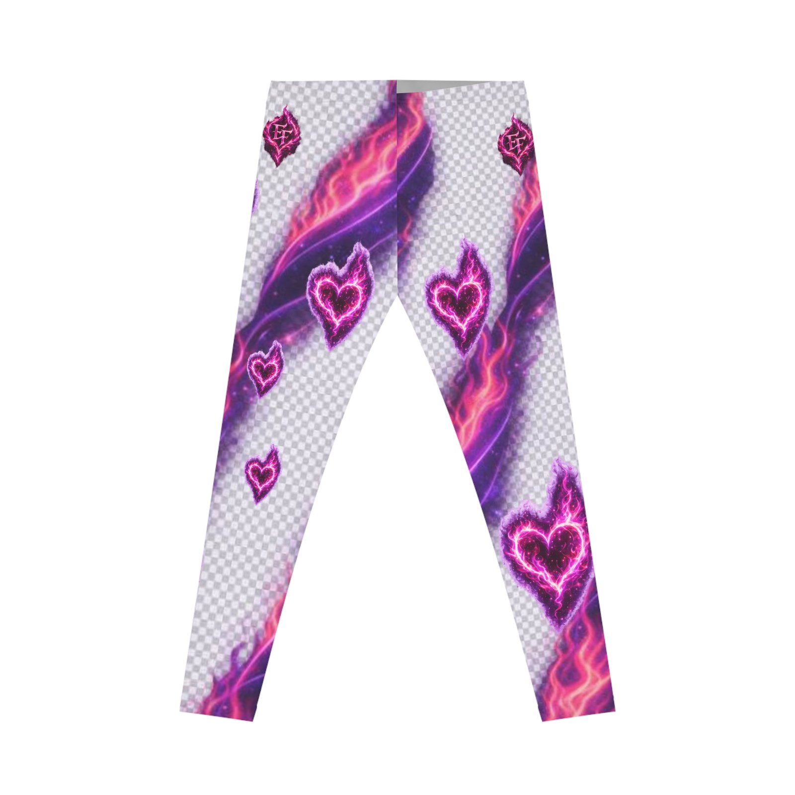 Electric, playful, and unapologetically bold — these leggings put neon romance into motion. Soft, stretchy fabric wraps you in a silky sheen while electric pink hearts and streaks of purple flame pulse across the print. They move with you: yoga flows, city walks at dusk, or tucked under an oversized sweater for late-night coffee runs. The mid-rise elastic waistband sits comfortably and keeps the silhouette sleek without digging in. Wear them when you want your outfit to feel like a mood — loud, colorful, and confident.