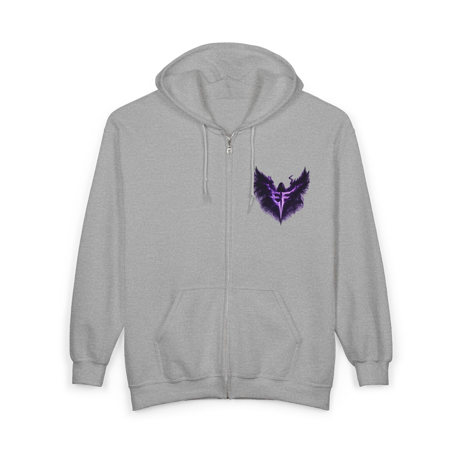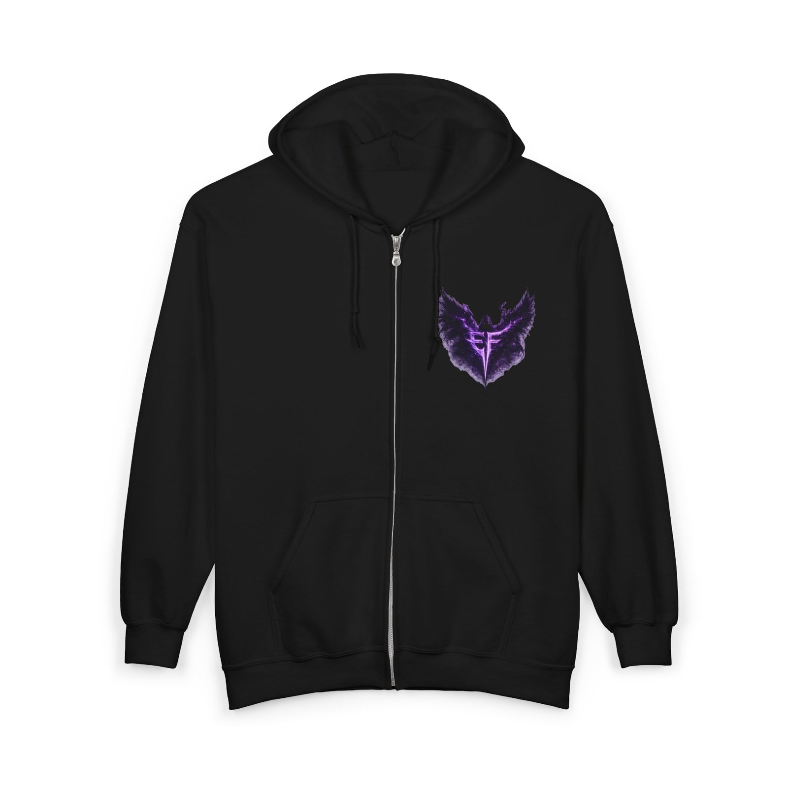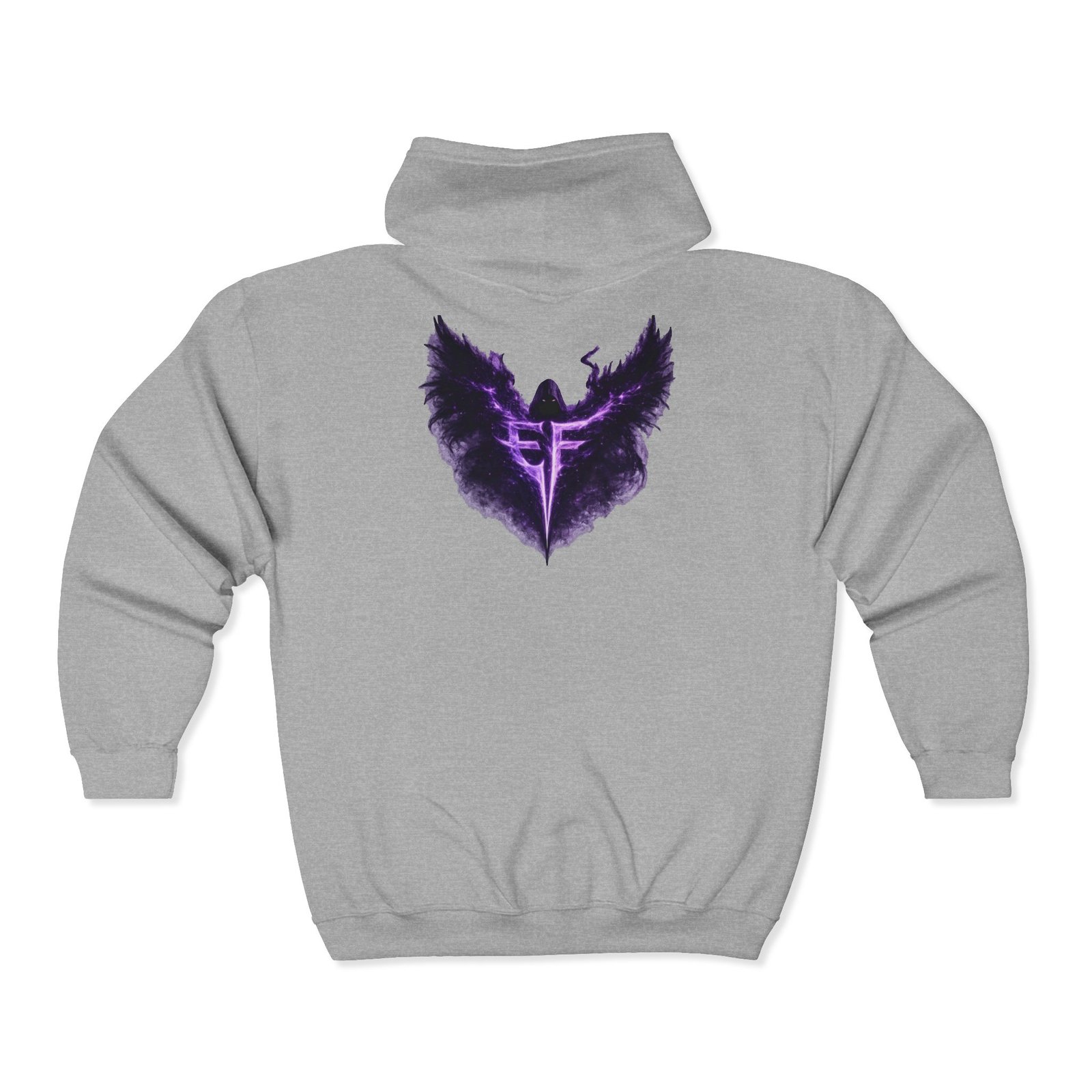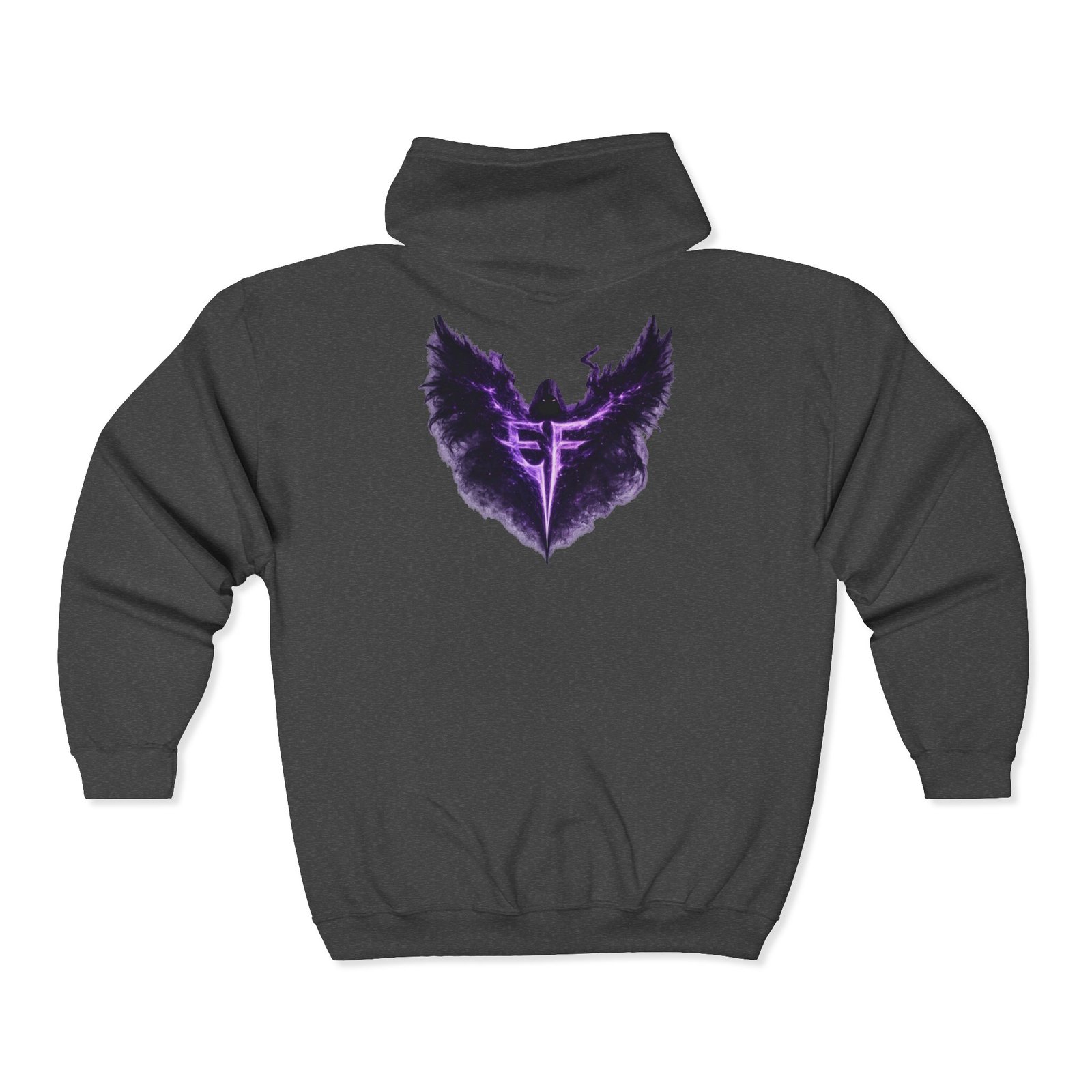 Slip into a zip-up that feels like armor for late-night drives, rehearsal breaks, and those quiet moments before a show. The charcoal hoodie carries a deep, smoky purple sigil—wings unfurling around a sharp, vertical glyph—embroidered on the left chest and echoed larger across the back in a soft, slightly nebulous print. It sits heavy and steady: a structured, classic fit with roomy pockets that hold your phone and keys, a solid metal zipper that won’t quit, and an adjustable hood that tucks in against wind and stage lights. Wear it over a band tee, with denim or joggers, or layered under a coat when the air turns cold. It’s for people who like their outerwear dark, textural, and quietly iconic—something that reads like a personal emblem when you move through a crowd or stand under a single lamp.