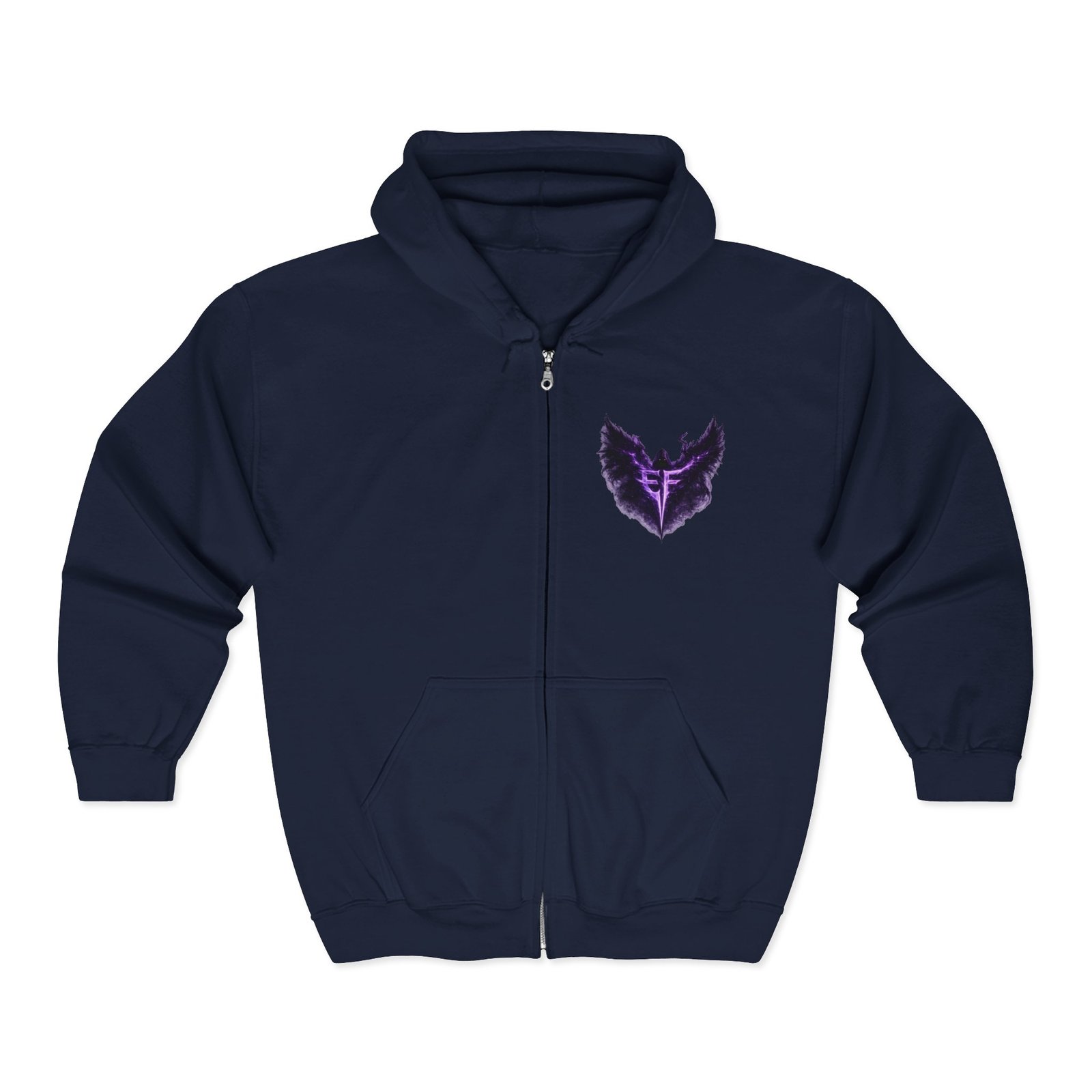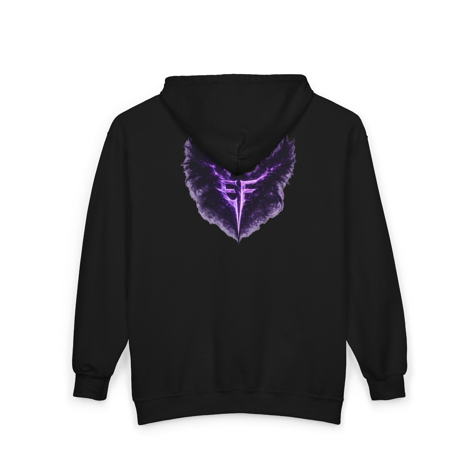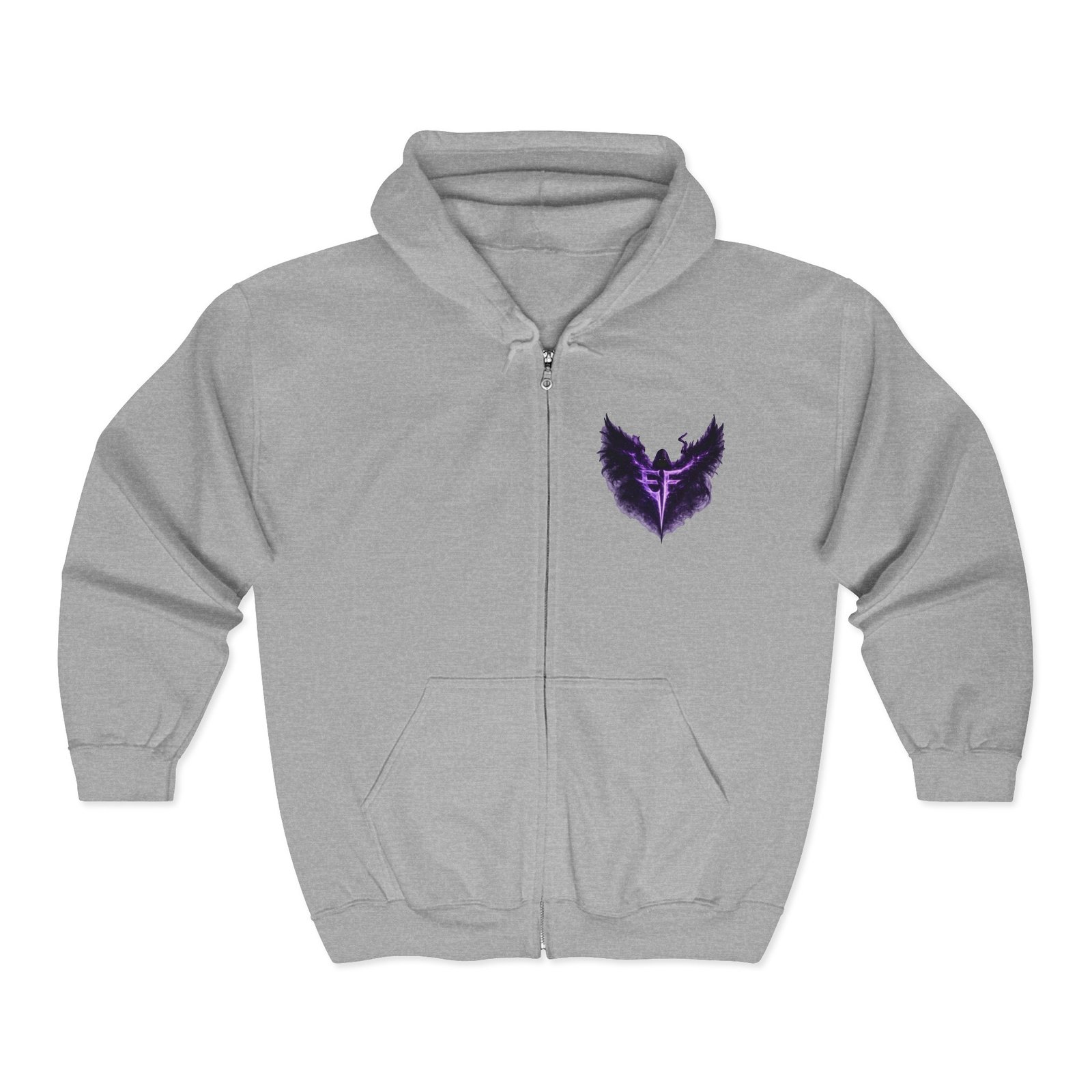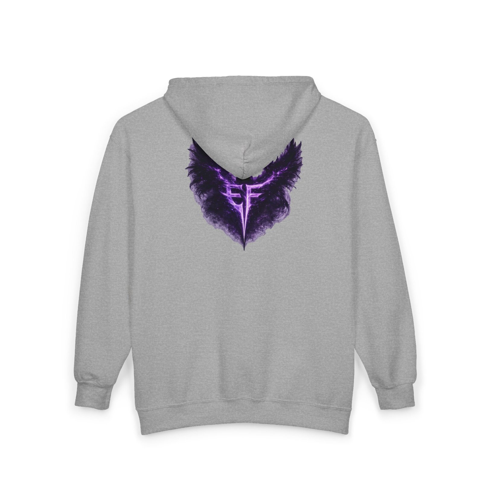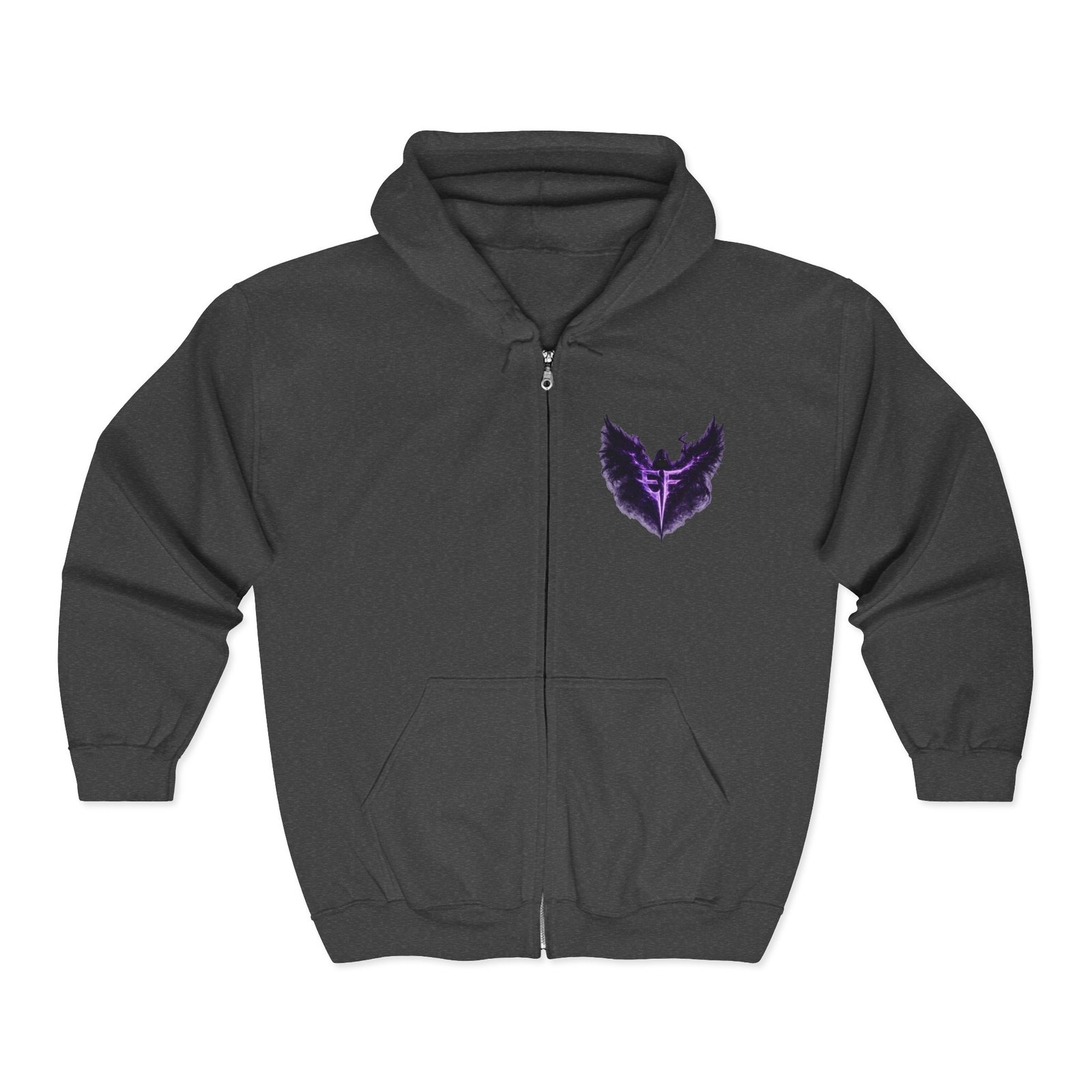 Slip into a zip-up that feels like armor for late-night drives, rehearsal breaks, and those quiet moments before a show. The charcoal hoodie carries a deep, smoky purple sigil—wings unfurling around a sharp, vertical glyph—embroidered on the left chest and echoed larger across the back in a soft, slightly nebulous print. It sits heavy and steady: a structured, classic fit with roomy pockets that hold your phone and keys, a solid metal zipper that won’t quit, and an adjustable hood that tucks in against wind and stage lights. Wear it over a band tee, with denim or joggers, or layered under a coat when the air turns cold. It’s for people who like their outerwear dark, textural, and quietly iconic—something that reads like a personal emblem when you move through a crowd or stand under a single lamp.