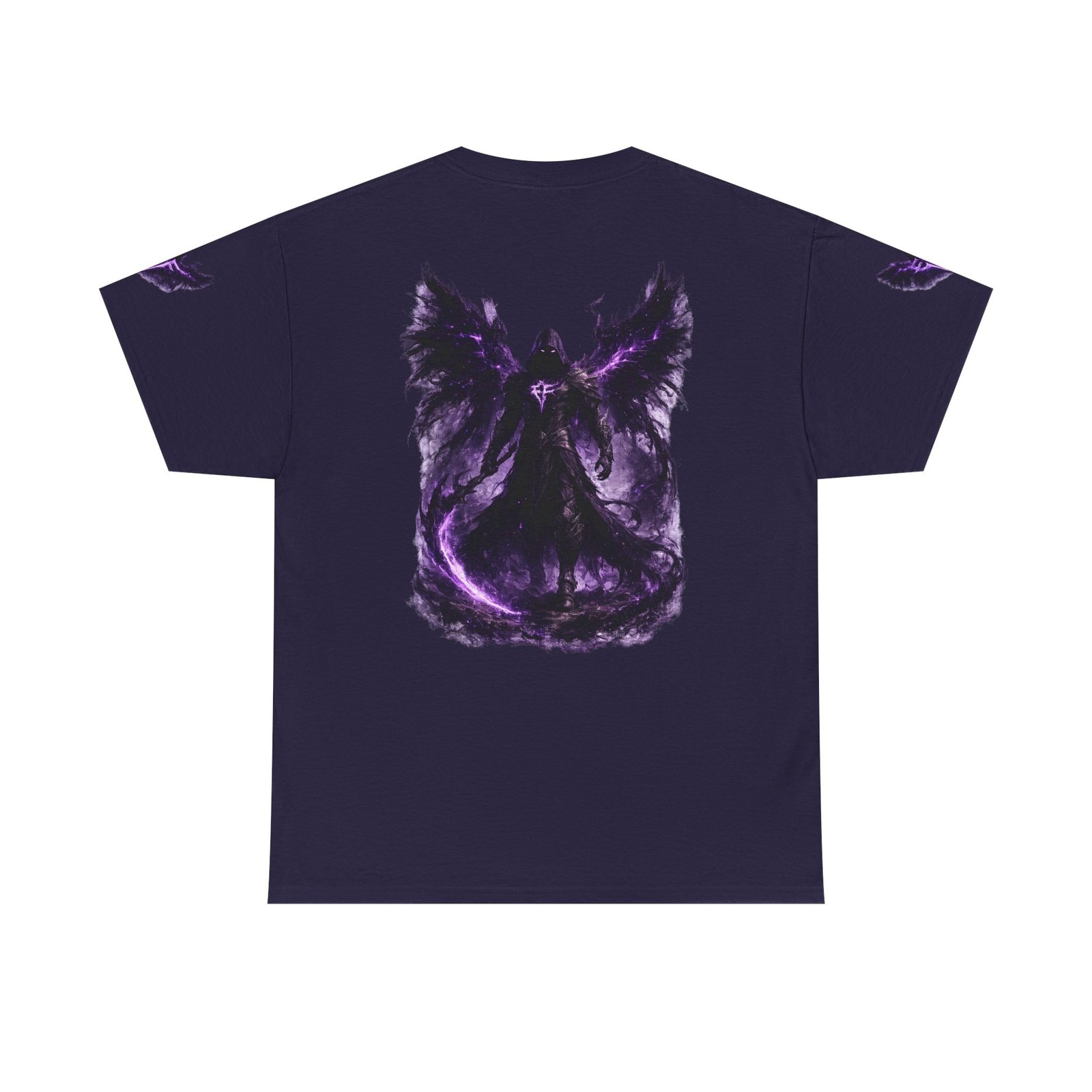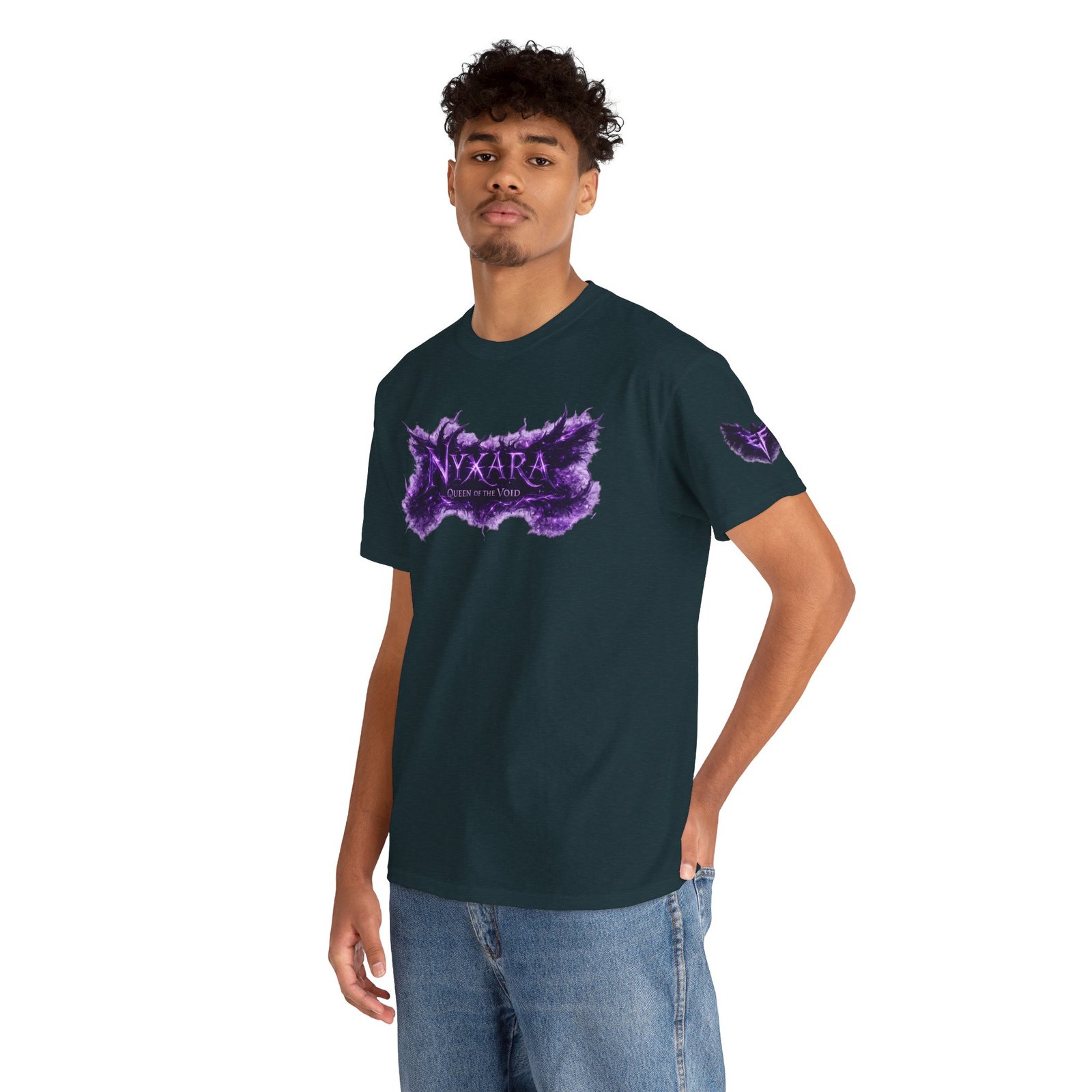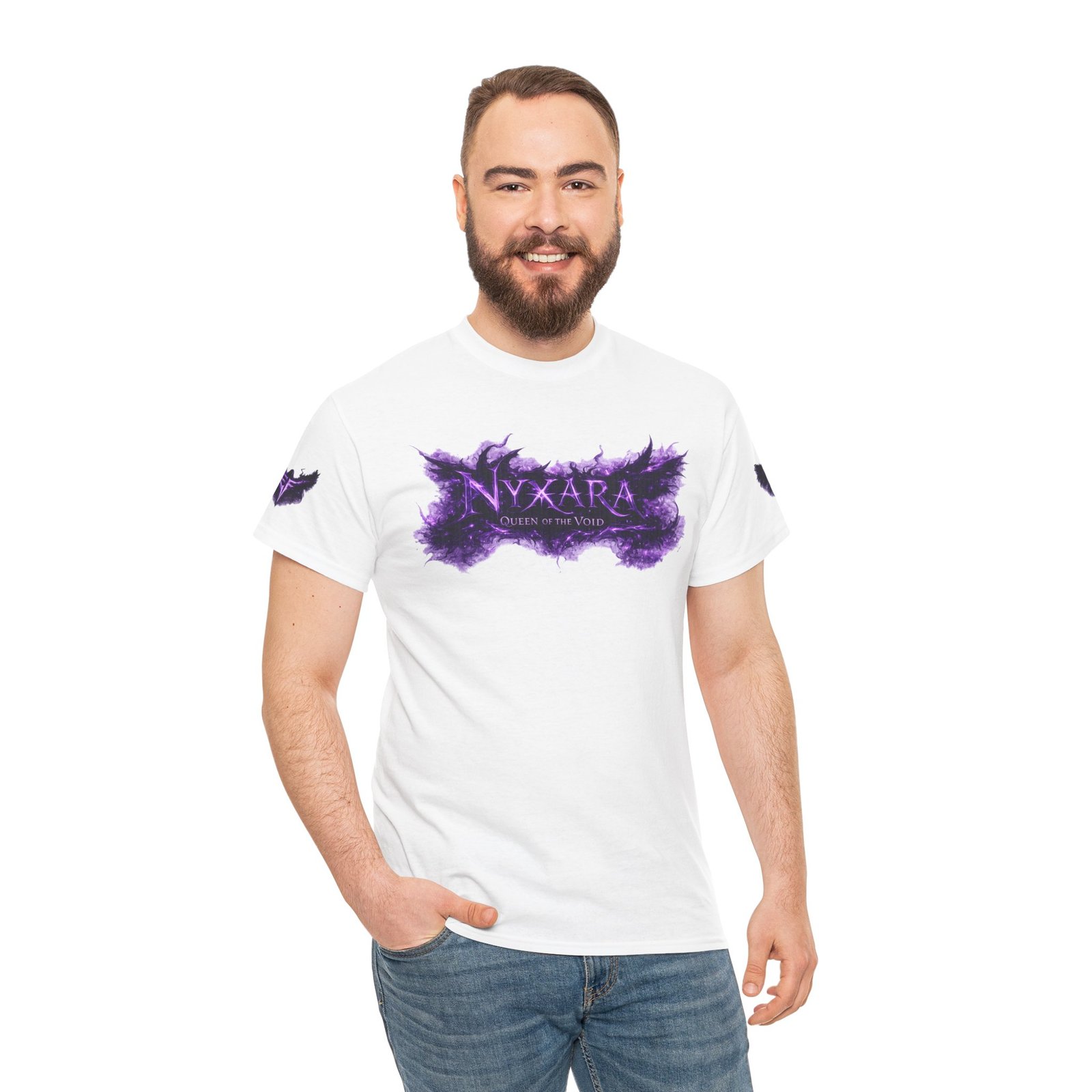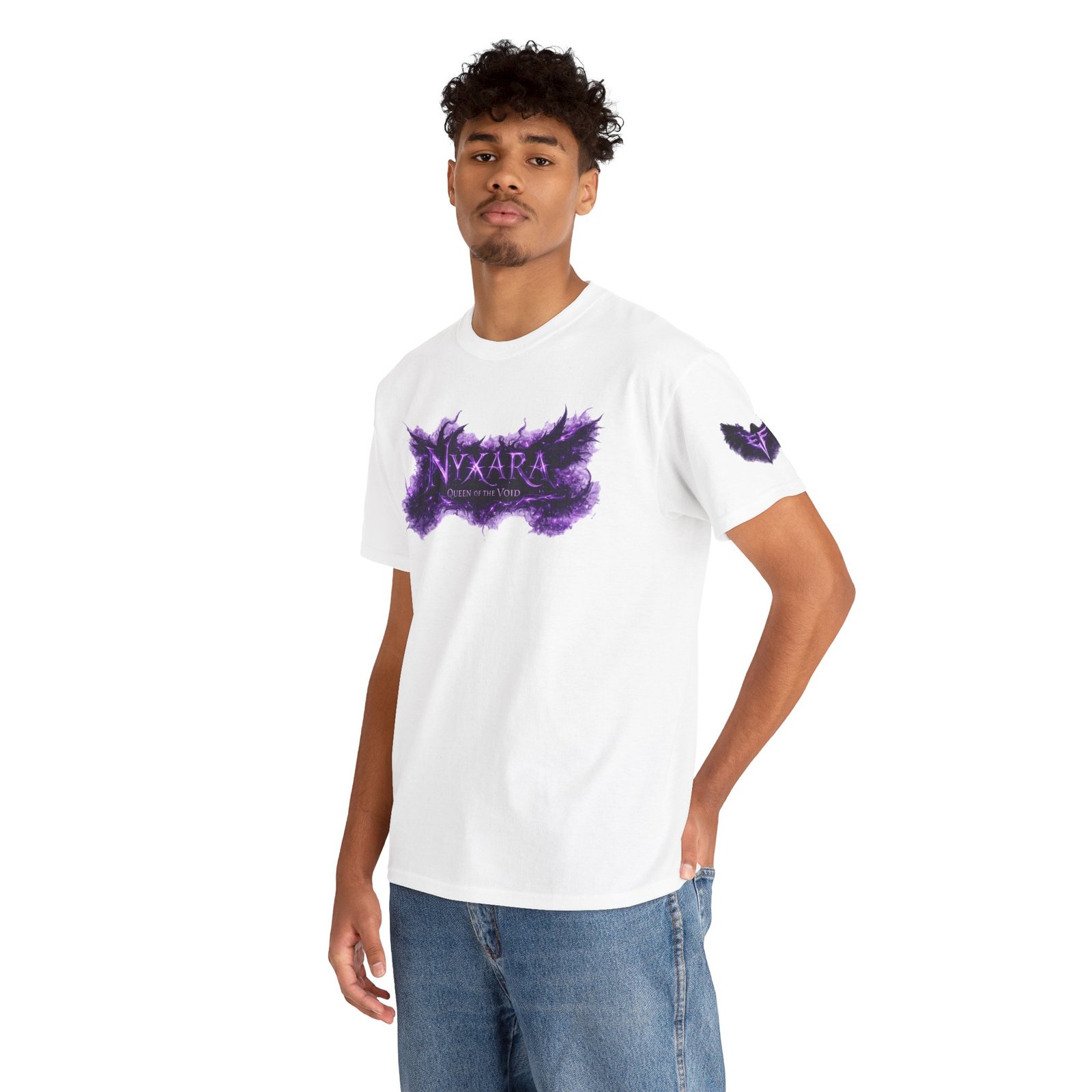 A soft, sturdy cotton tee that wears like a favorite from day one. The front shows a smoky purple sigil with the word “Nyxara” drifting in shadow; the back reveals a winged, hooded figure rising from a swirl of violet mist. Small matching motifs sit on the sleeves and inside the neck for a cohesive, lore-driven look. The medium-weight cotton drapes comfortably while holding crisp, detailed prints that keep their depth wash after wash. Wear it layered under a jacket for game nights, at late-night meetups, or anywhere you want to bring a touch of mysterious, fantasy energy to your outfit.