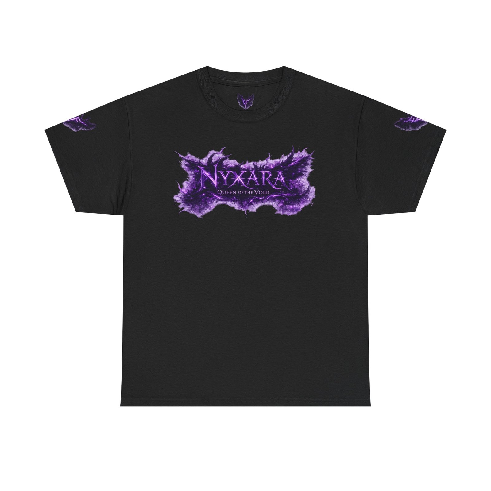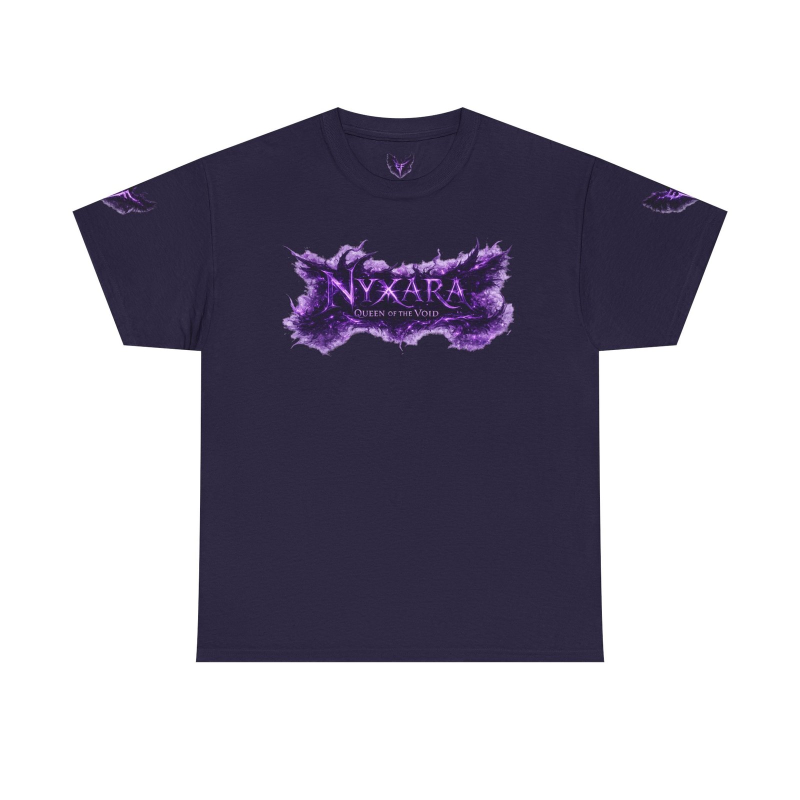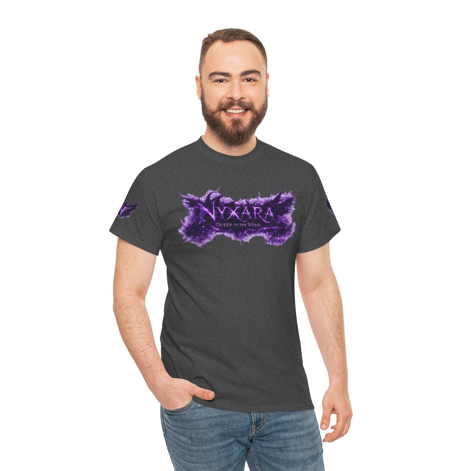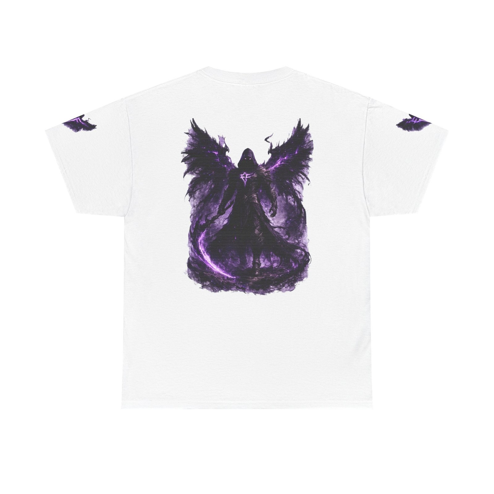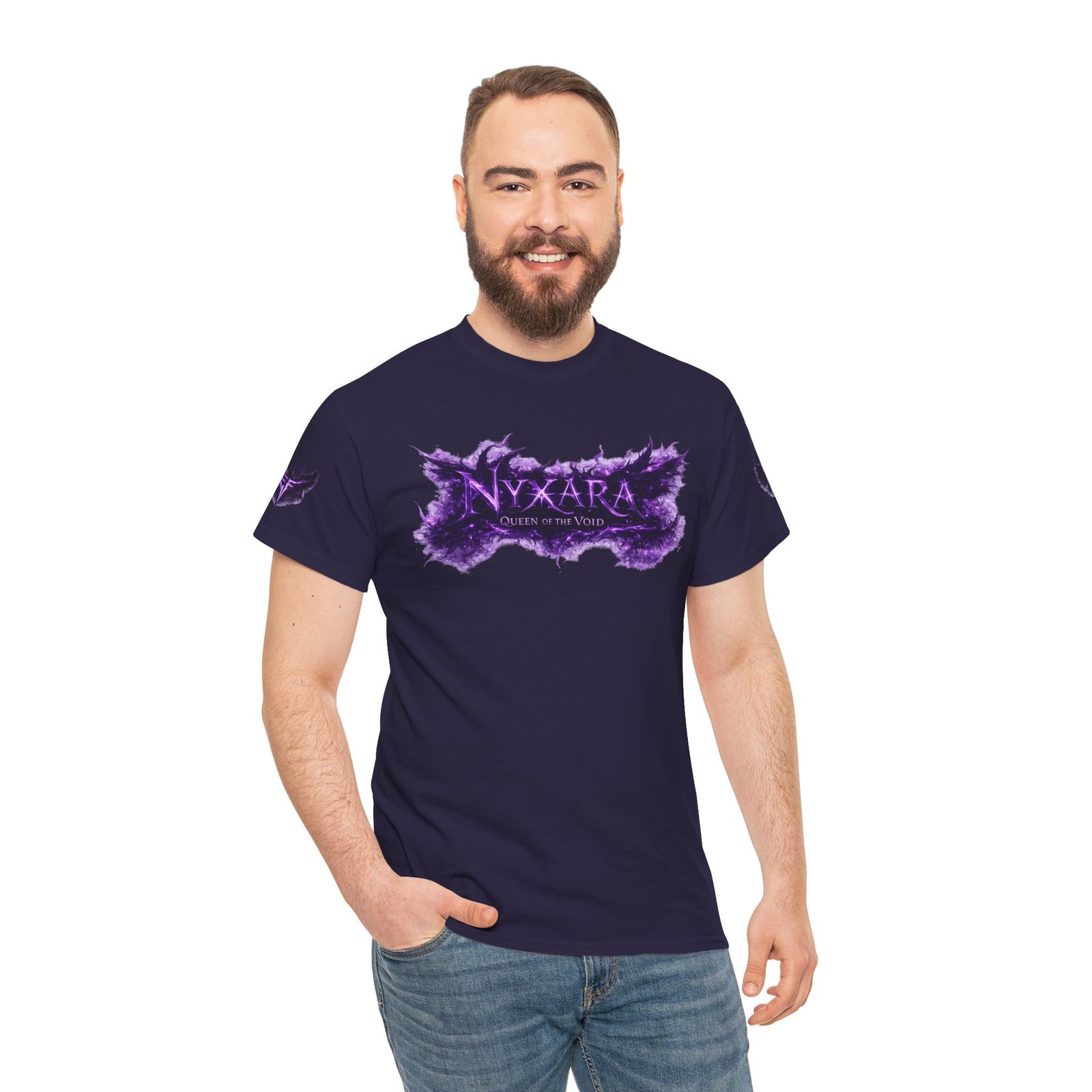 A soft, sturdy cotton tee that wears like a favorite from day one. The front shows a smoky purple sigil with the word “Nyxara” drifting in shadow; the back reveals a winged, hooded figure rising from a swirl of violet mist. Small matching motifs sit on the sleeves and inside the neck for a cohesive, lore-driven look. The medium-weight cotton drapes comfortably while holding crisp, detailed prints that keep their depth wash after wash. Wear it layered under a jacket for game nights, at late-night meetups, or anywhere you want to bring a touch of mysterious, fantasy energy to your outfit.
