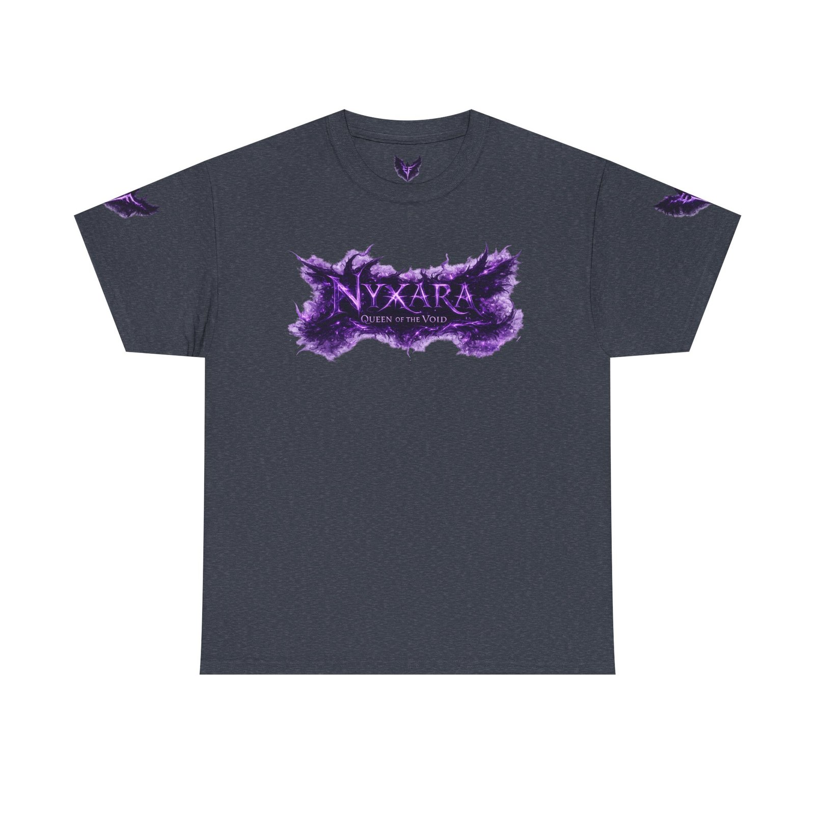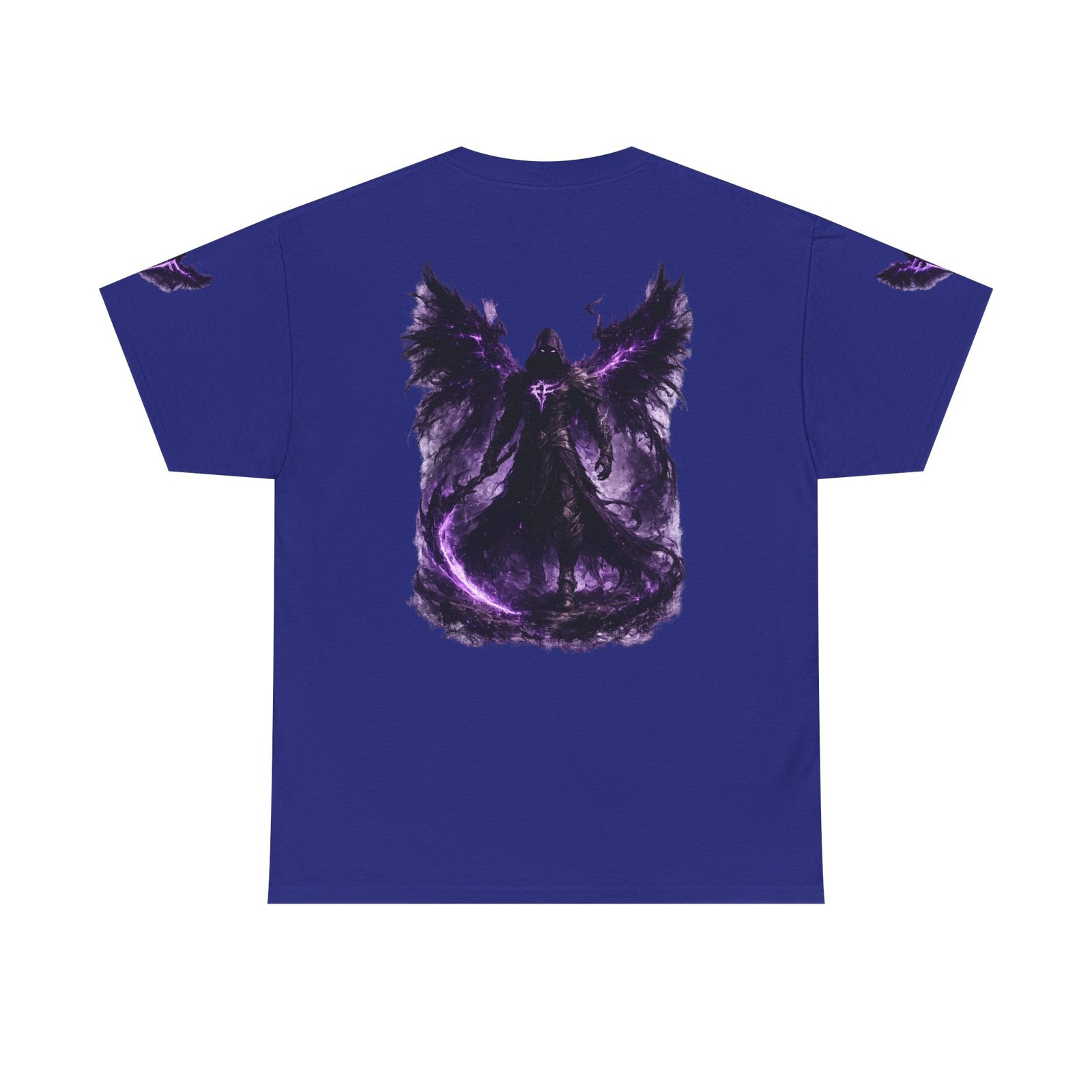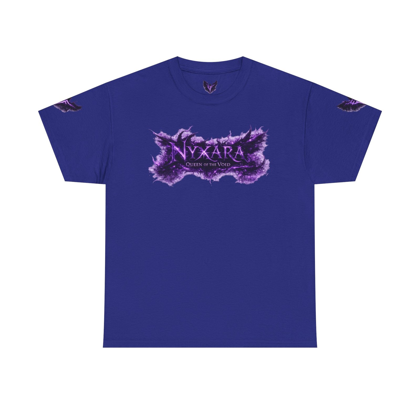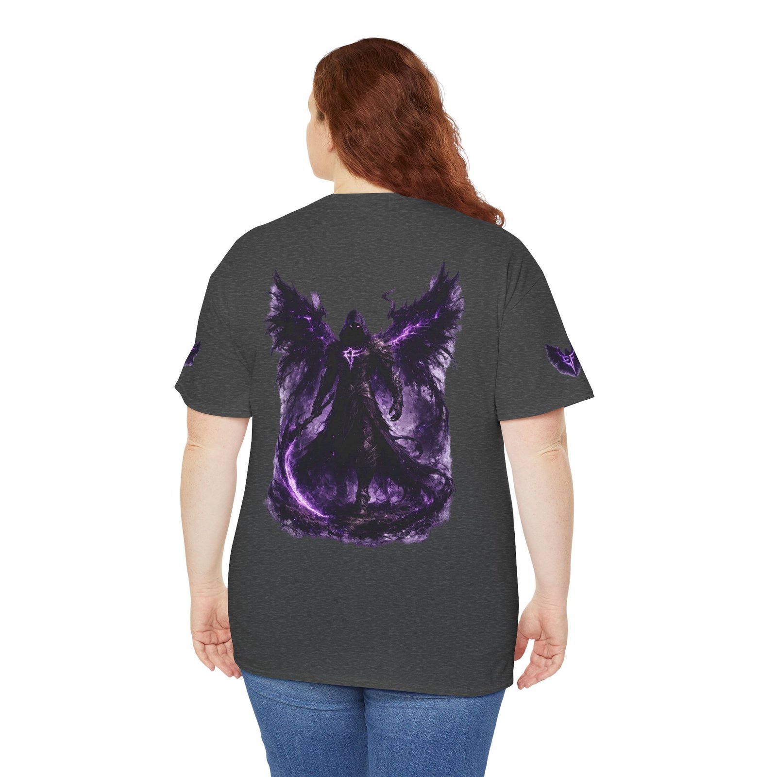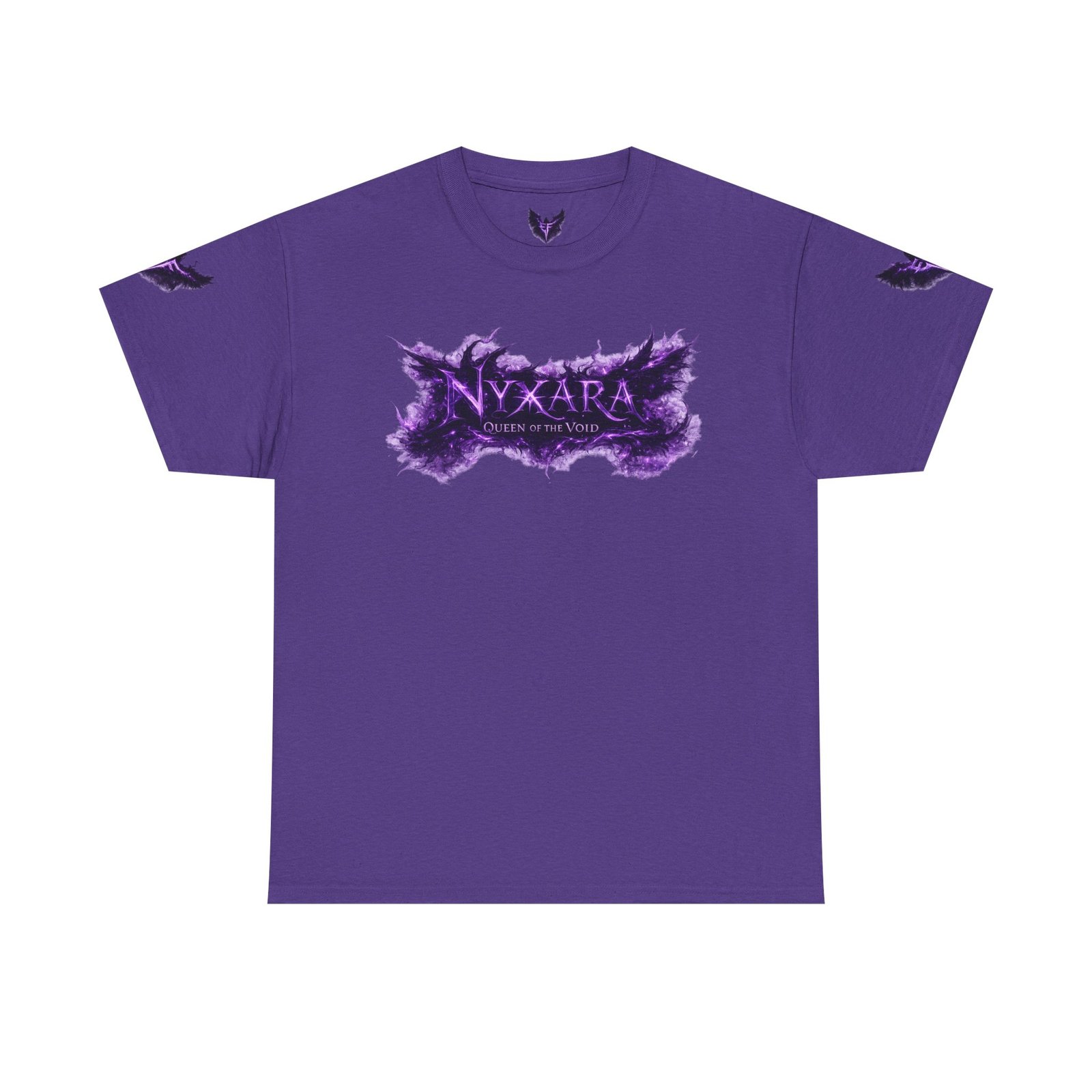 A soft, sturdy cotton tee that wears like a favorite from day one. The front shows a smoky purple sigil with the word “Nyxara” drifting in shadow; the back reveals a winged, hooded figure rising from a swirl of violet mist. Small matching motifs sit on the sleeves and inside the neck for a cohesive, lore-driven look. The medium-weight cotton drapes comfortably while holding crisp, detailed prints that keep their depth wash after wash. Wear it layered under a jacket for game nights, at late-night meetups, or anywhere you want to bring a touch of mysterious, fantasy energy to your outfit.