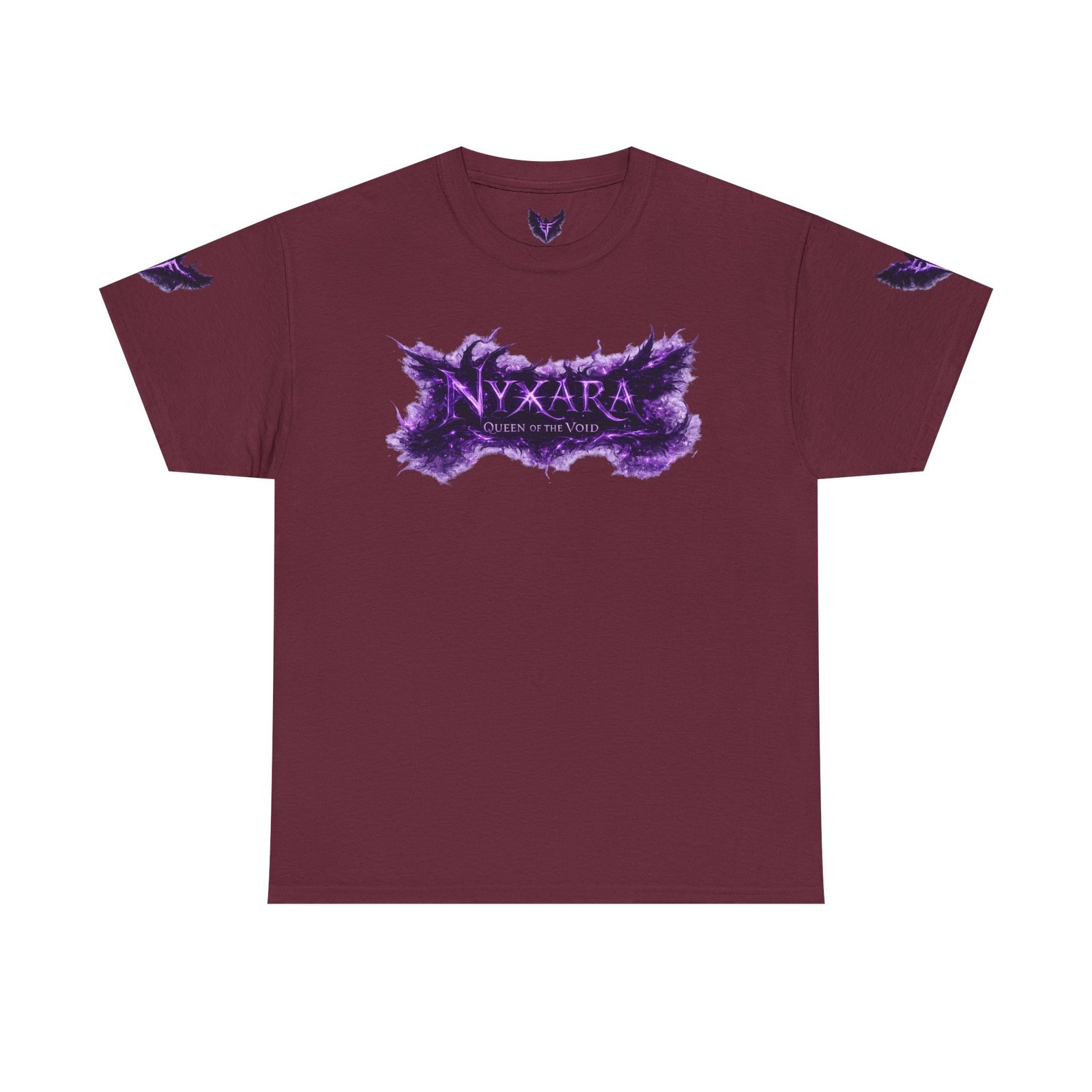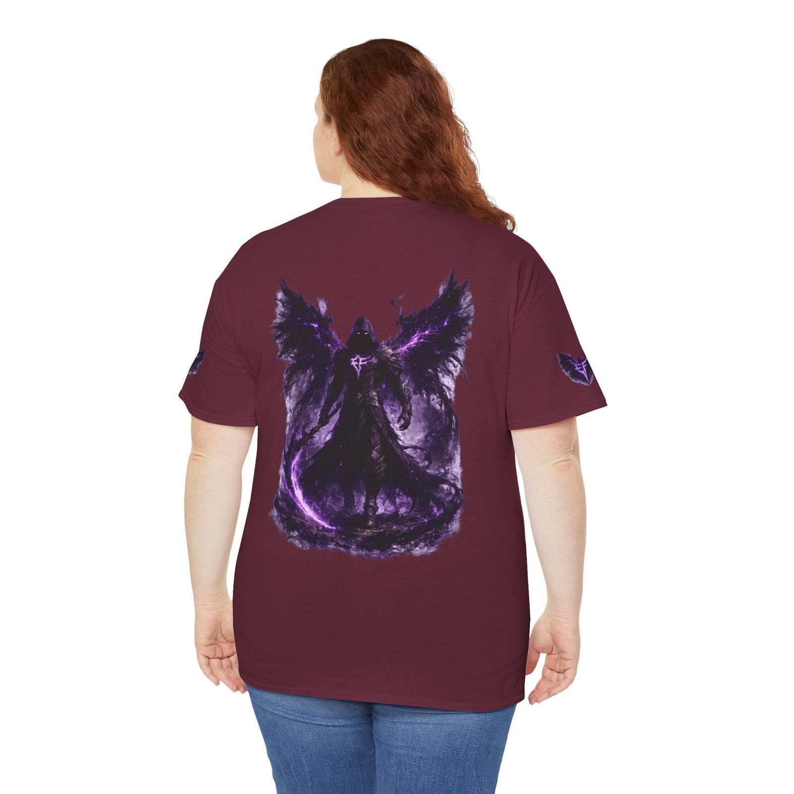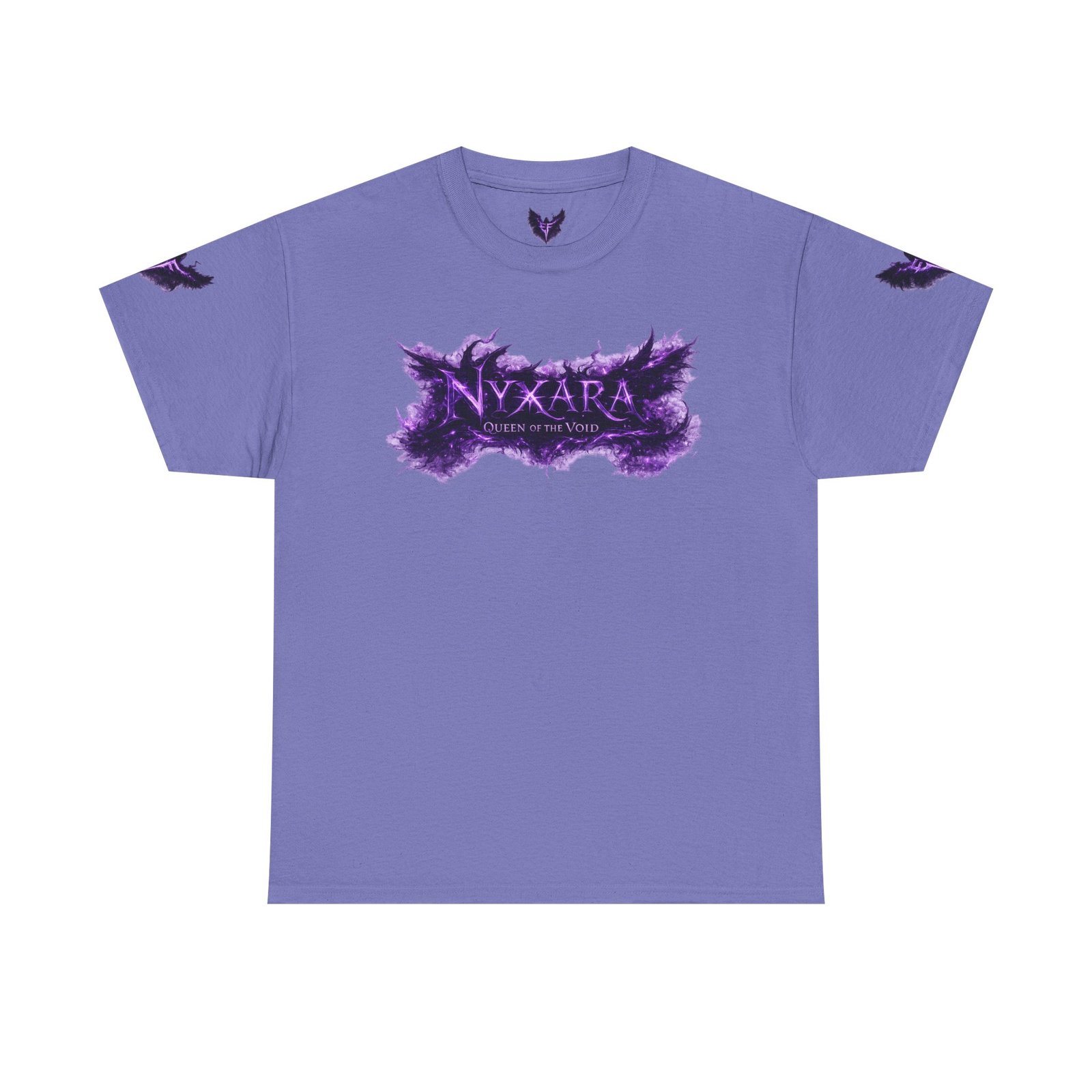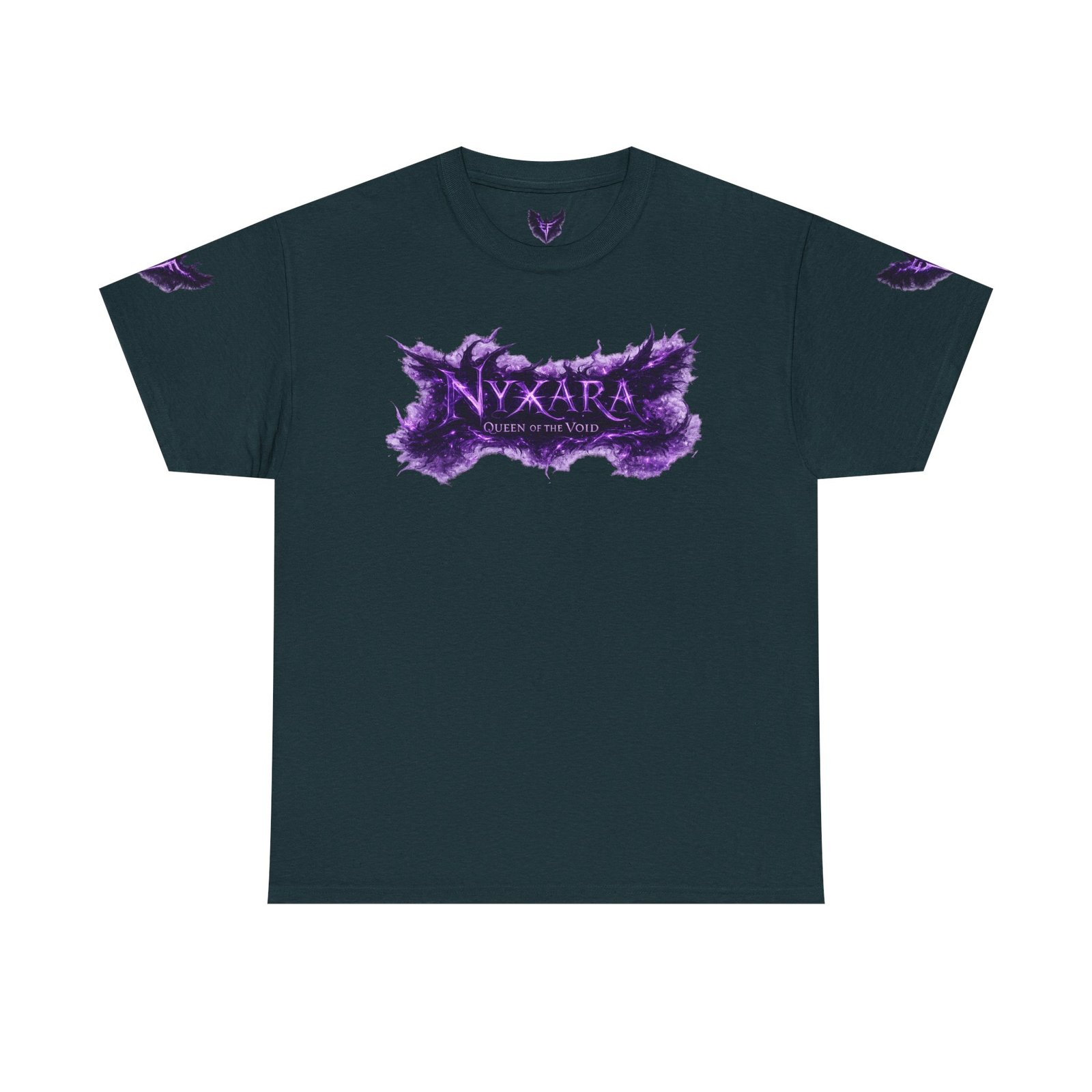 A soft, sturdy cotton tee that wears like a favorite from day one. The front shows a smoky purple sigil with the word “Nyxara” drifting in shadow; the back reveals a winged, hooded figure rising from a swirl of violet mist. Small matching motifs sit on the sleeves and inside the neck for a cohesive, lore-driven look. The medium-weight cotton drapes comfortably while holding crisp, detailed prints that keep their depth wash after wash. Wear it layered under a jacket for game nights, at late-night meetups, or anywhere you want to bring a touch of mysterious, fantasy energy to your outfit.
