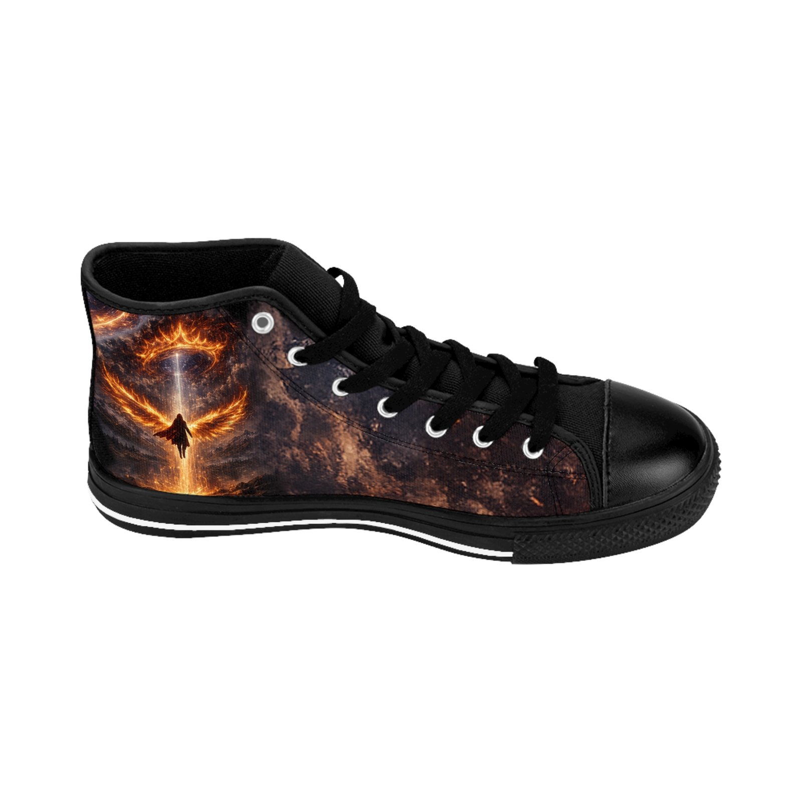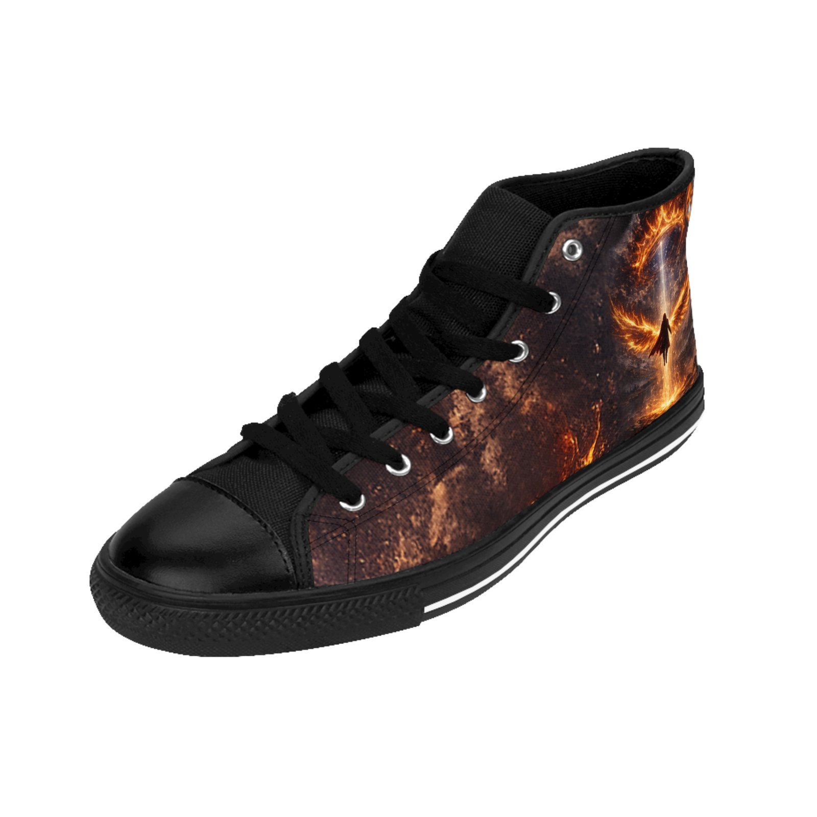 These high-top canvas sneakers bring a fierce, fiery edge to everyday wear. Dark, smoky backgrounds set the stage for a blazing phoenix motif that seems to flare and pulse with movement as you walk. The 5″ calf height and reinforced pleather toe give a classic silhouette a tough, lived-in attitude — great for nights out, street-style looks, or when you want footwear that speaks as loudly as your outfit. The cushioned foam insole keeps long days comfortable while the durable rubber outsole stands up to city miles. Black stitching, metal eyelets, and a richly textured nylon canvas complete the look with a cohesive, rugged finish.