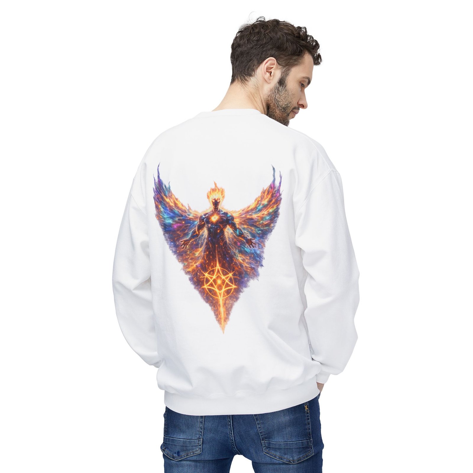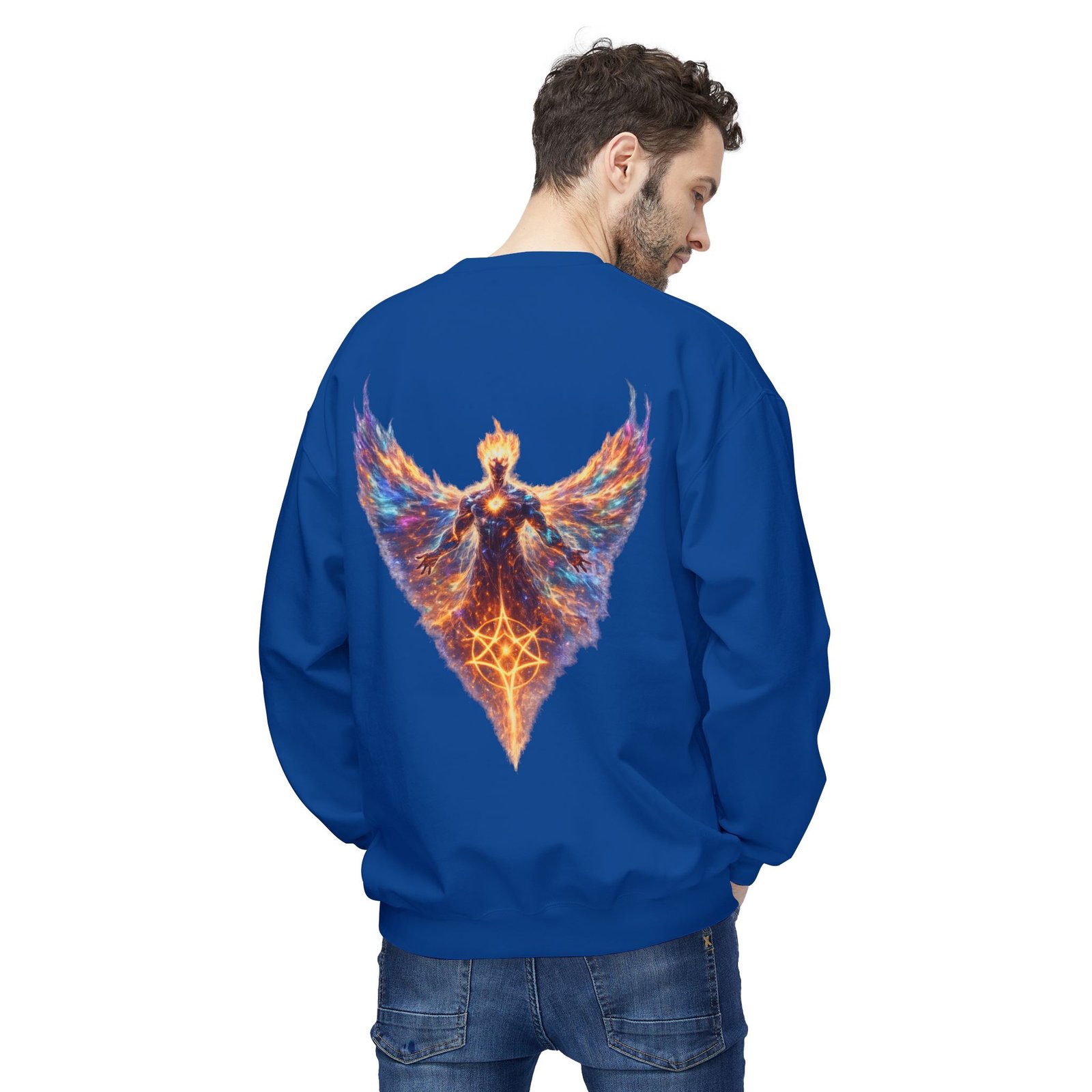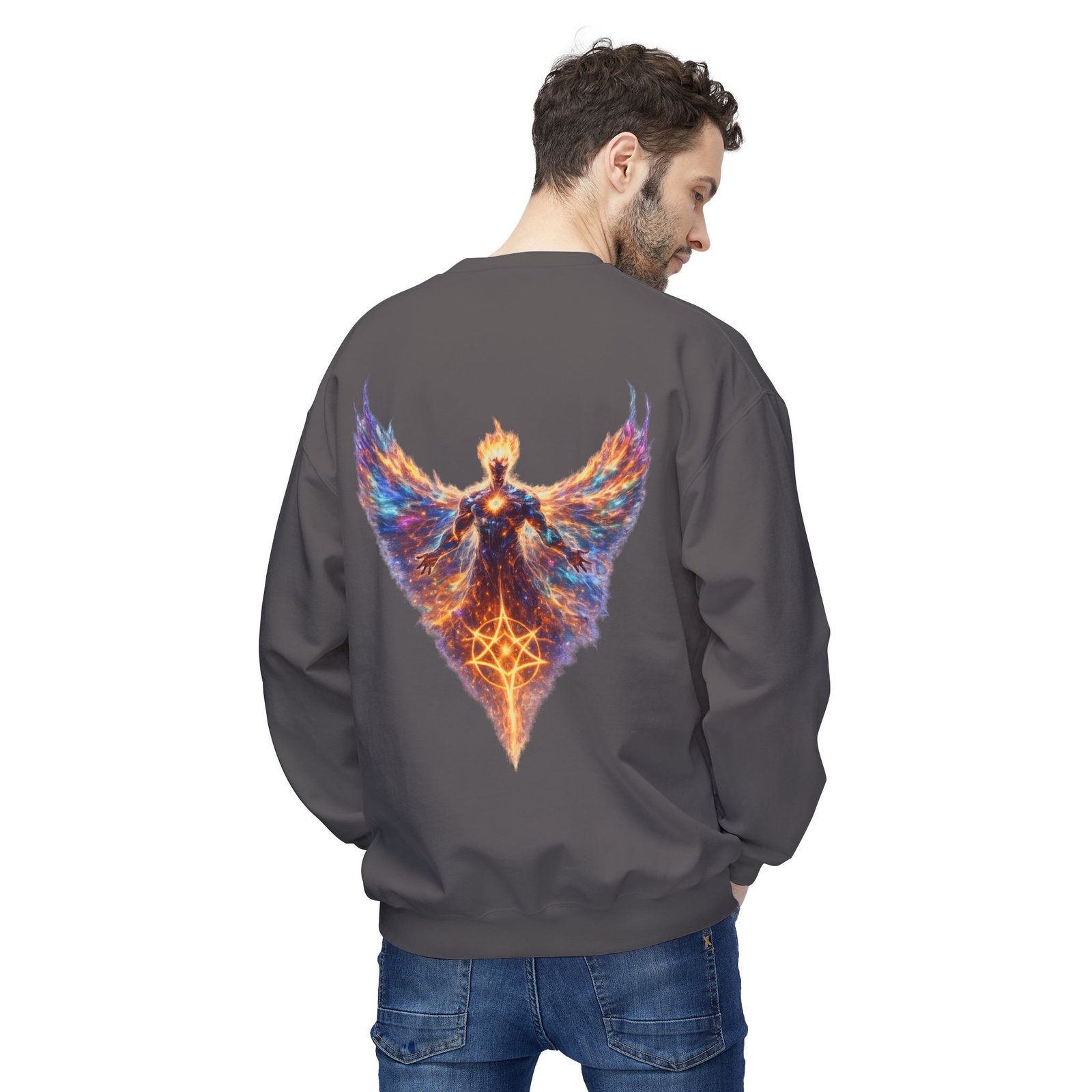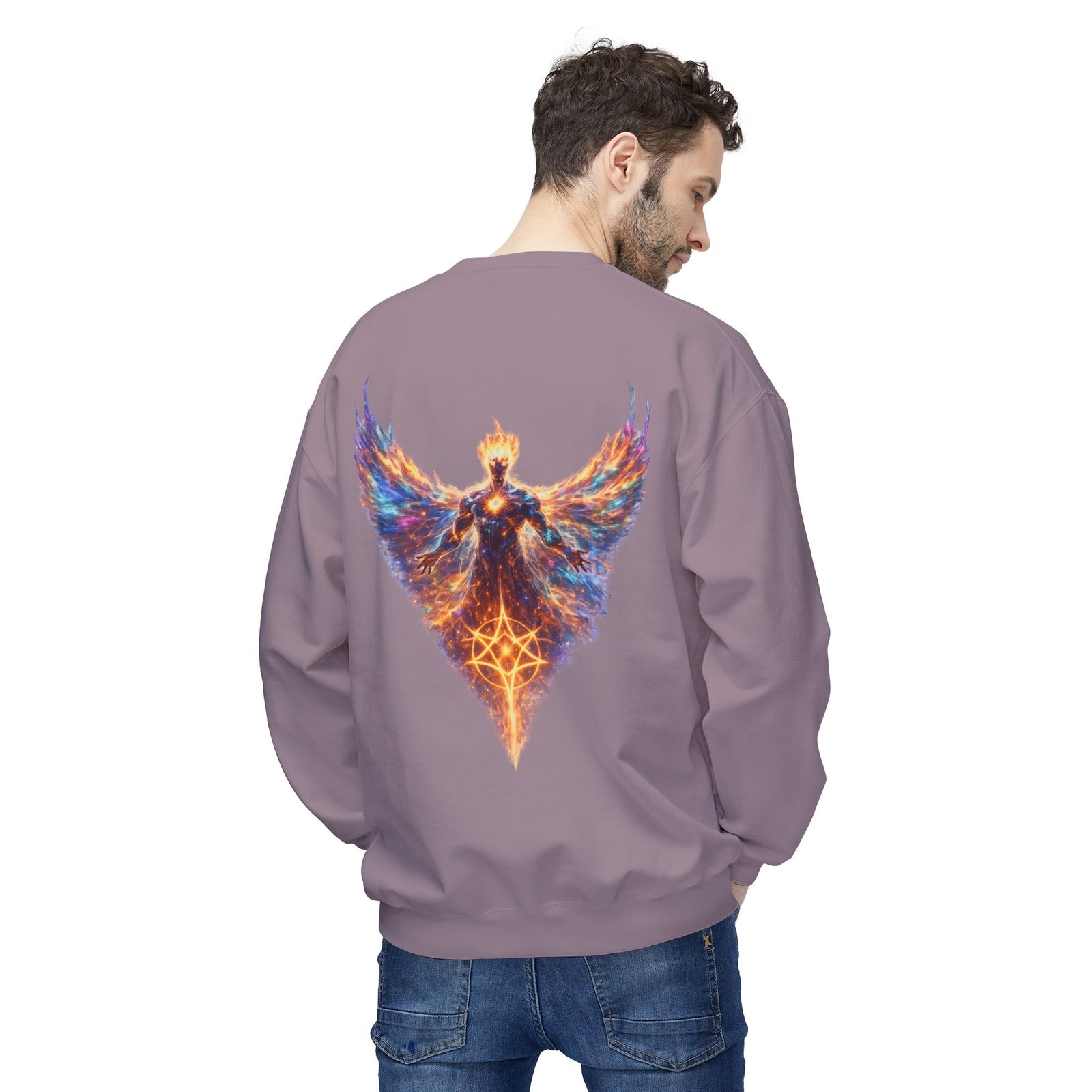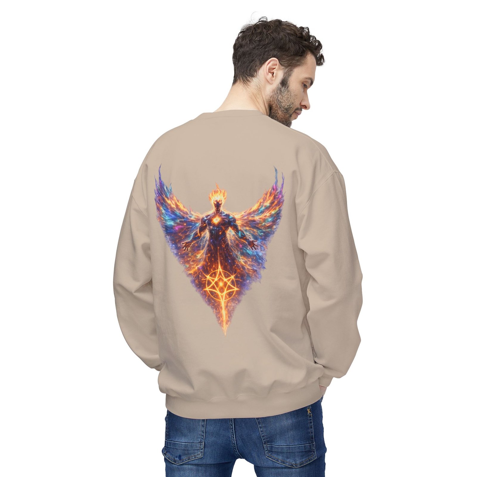 A midweight crewneck sweatshirt that carries a bold, painterly angel motif — wings unfurled in flares of gold, violet, and ember. Wear it when you want warmth without bulk and a statement without shouting. The softened cotton-blend drapes with a relaxed, dropped-shoulder silhouette that invites lingering on chilly evenings, rooftop bonfires, or quiet mornings with coffee. The artwork on the back reads like a small myth: luminous, protective, and a little fierce. It settles comfortably into everyday routines for people who collect meaningful pieces and like their clothes to feel lived-in from the first wear.