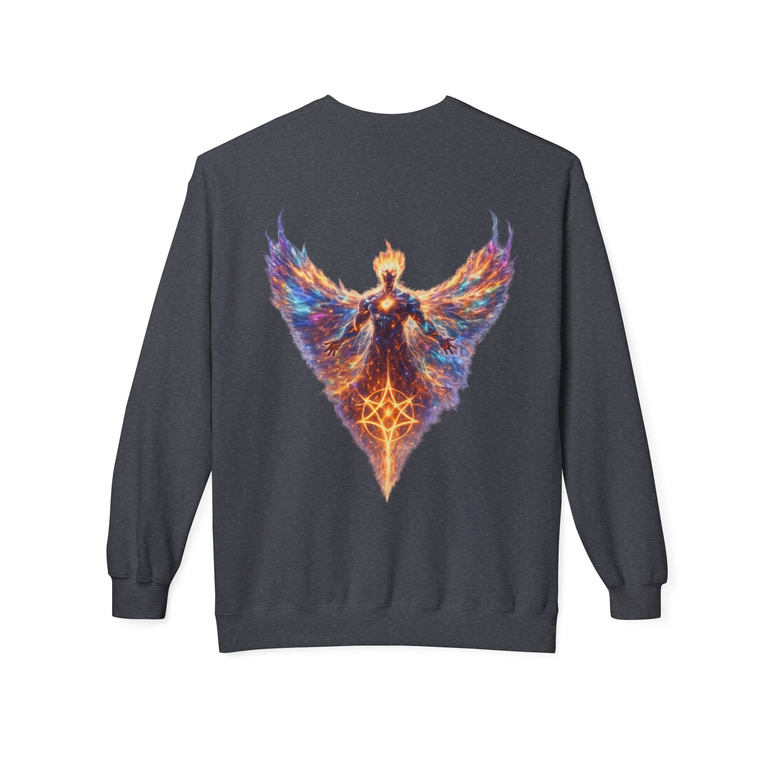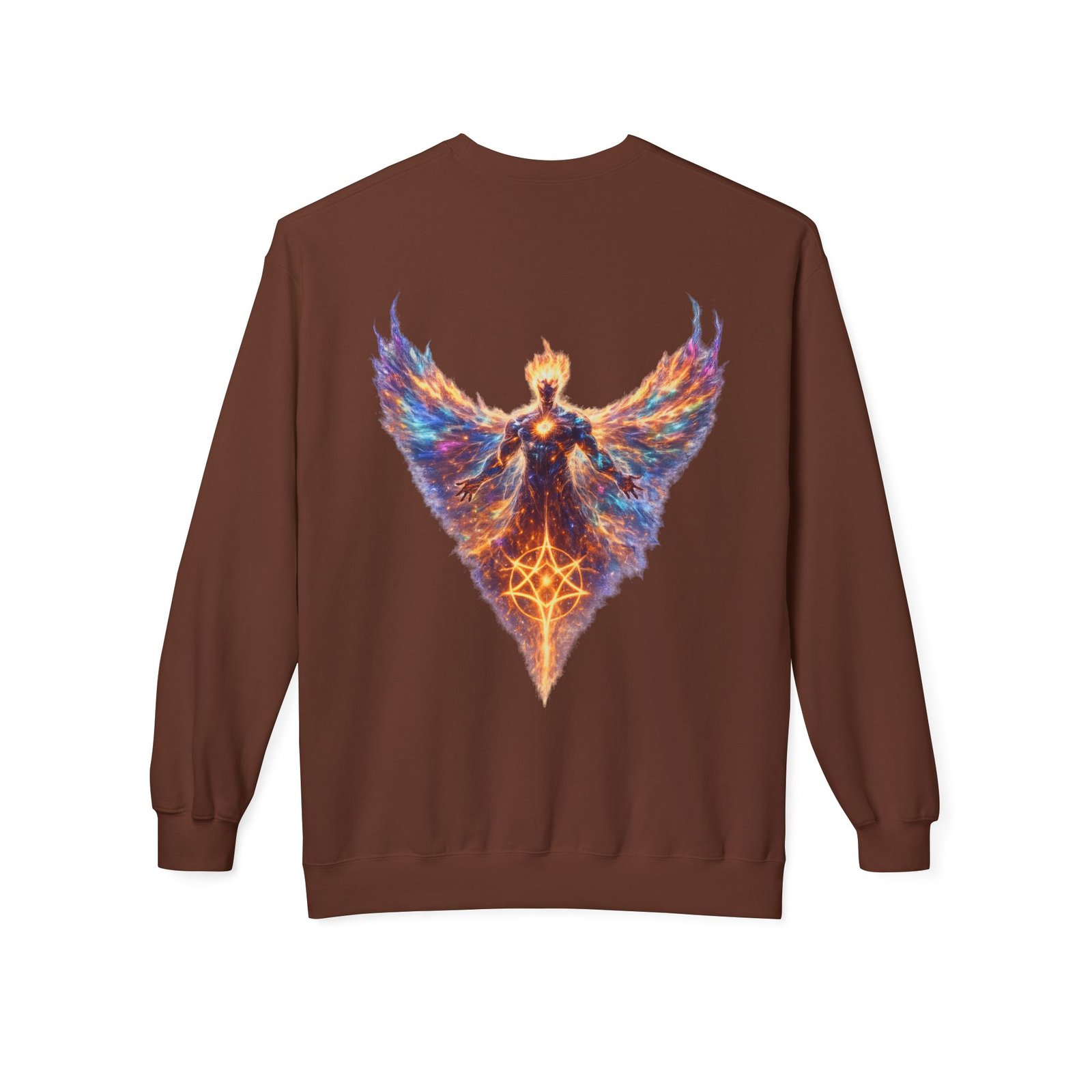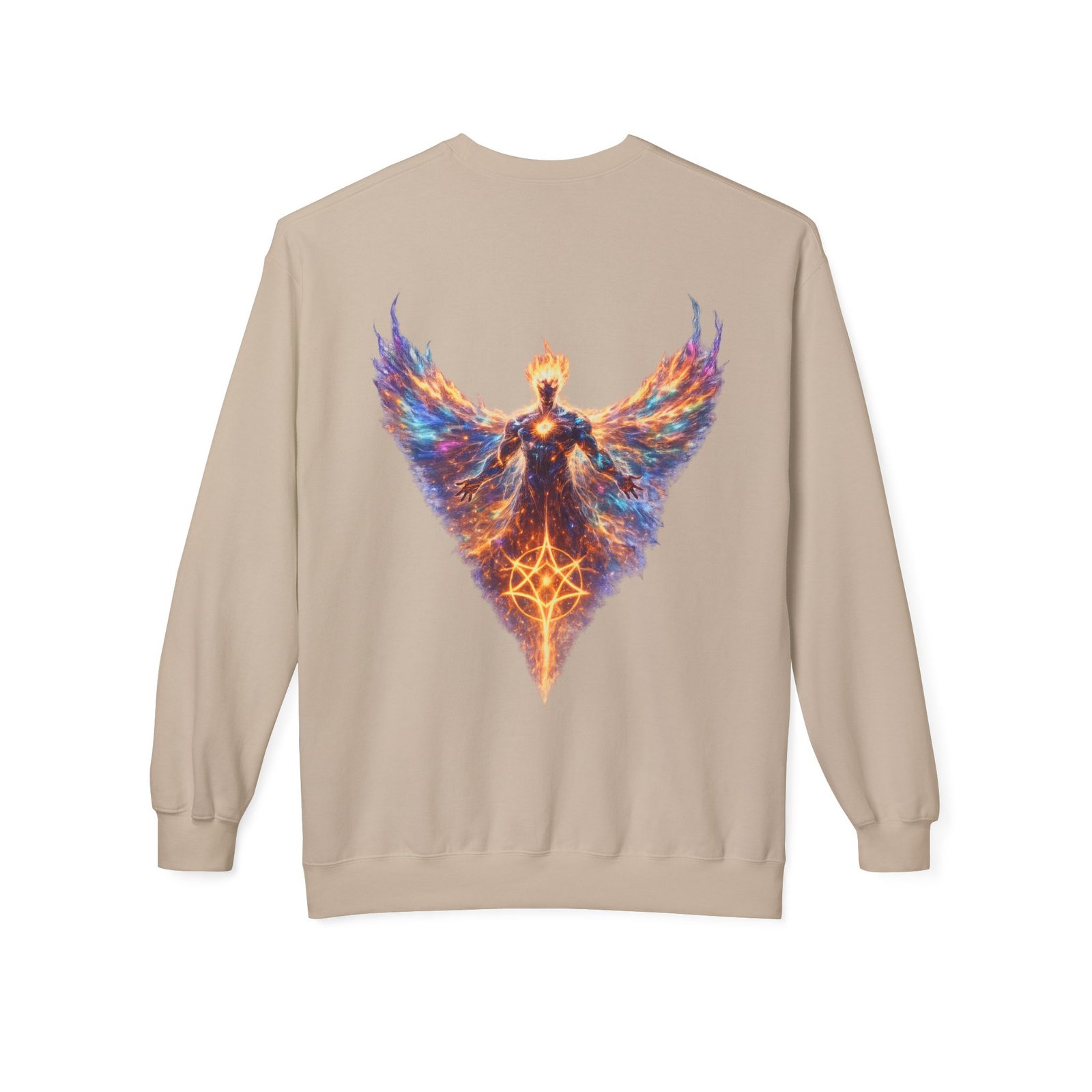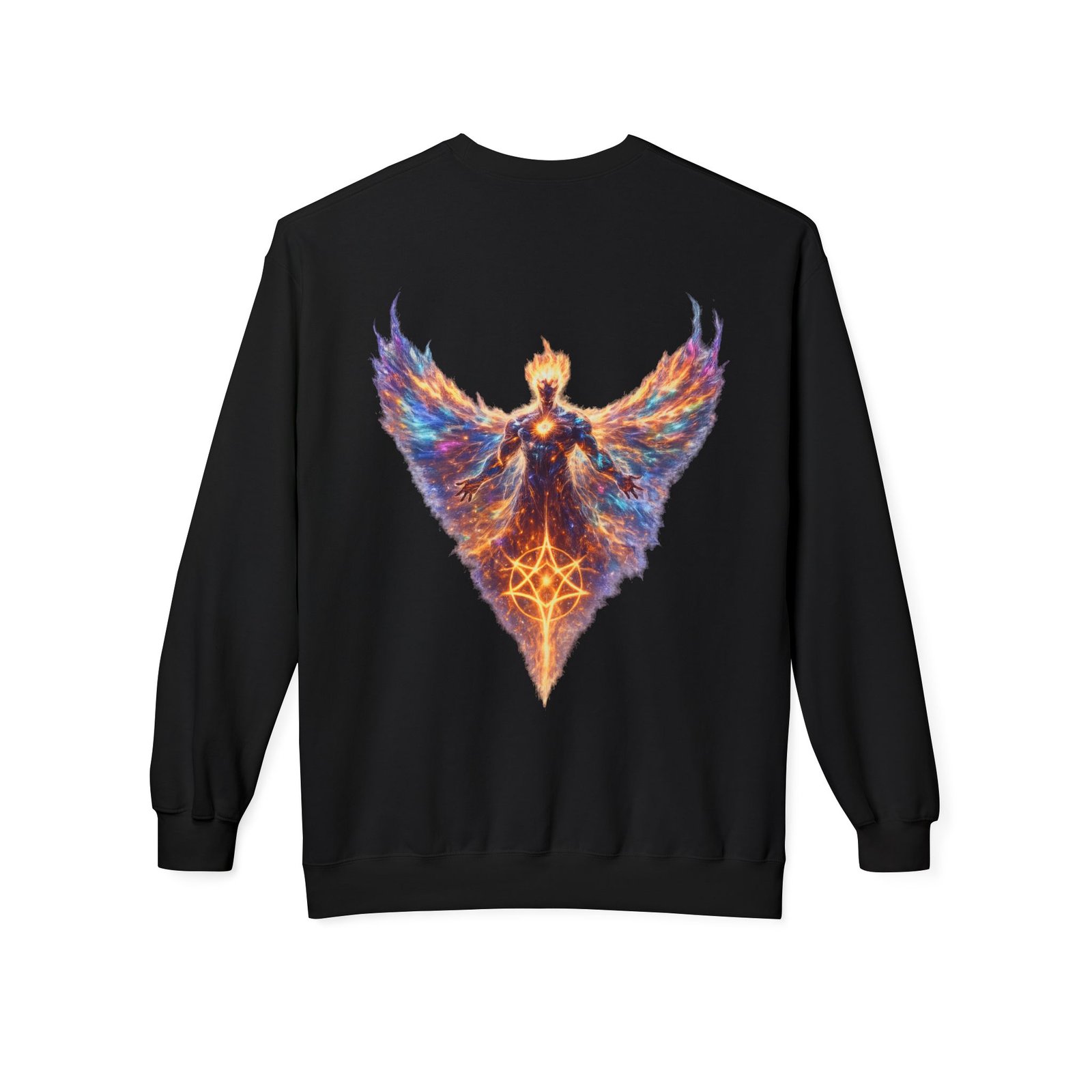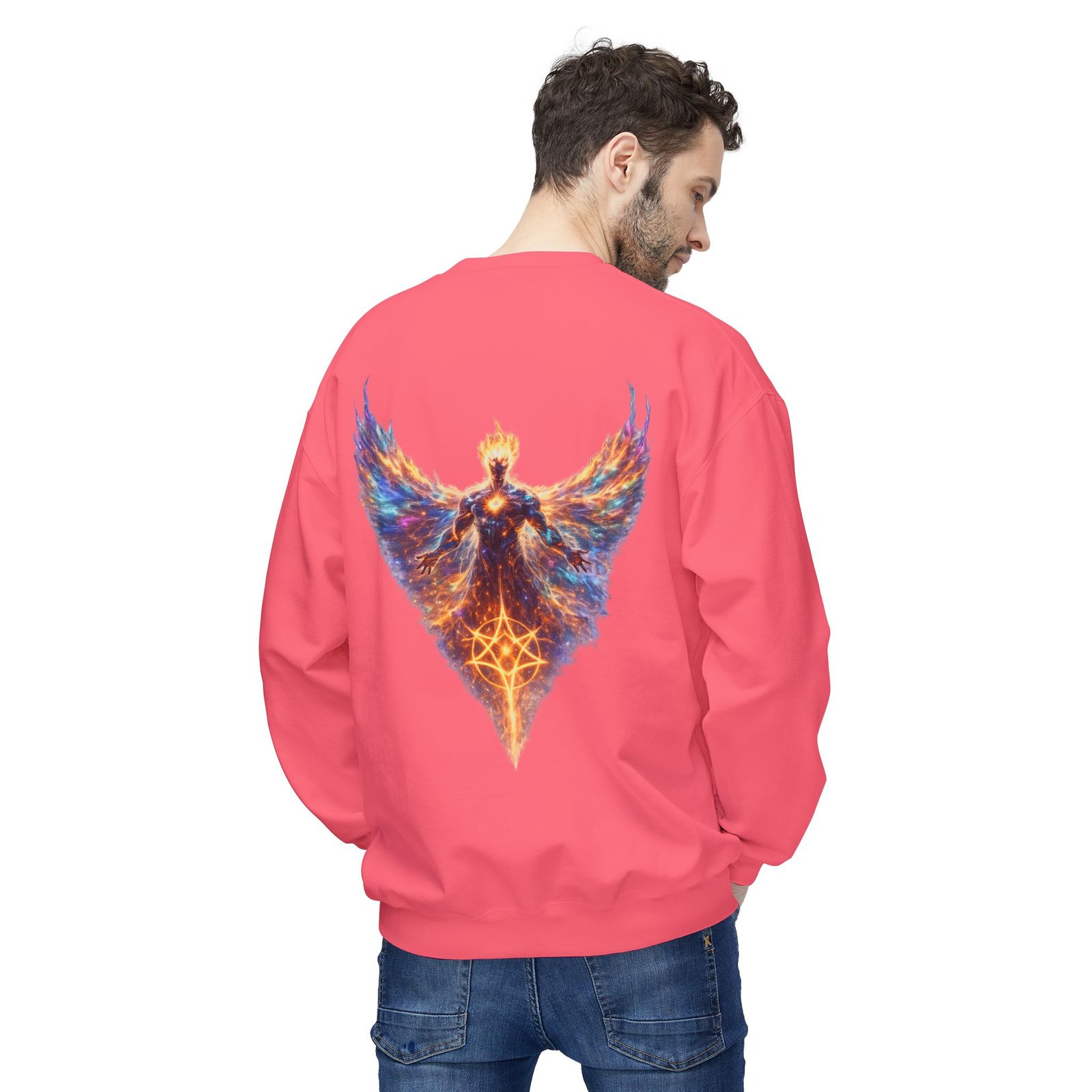 A midweight crewneck sweatshirt that carries a bold, painterly angel motif — wings unfurled in flares of gold, violet, and ember. Wear it when you want warmth without bulk and a statement without shouting. The softened cotton-blend drapes with a relaxed, dropped-shoulder silhouette that invites lingering on chilly evenings, rooftop bonfires, or quiet mornings with coffee. The artwork on the back reads like a small myth: luminous, protective, and a little fierce. It settles comfortably into everyday routines for people who collect meaningful pieces and like their clothes to feel lived-in from the first wear.