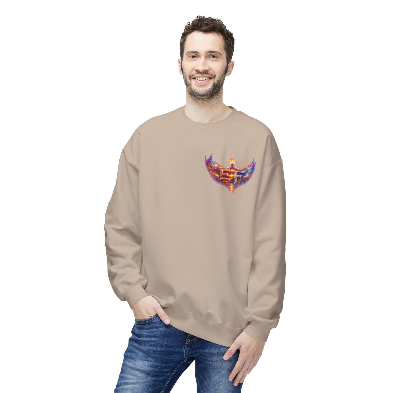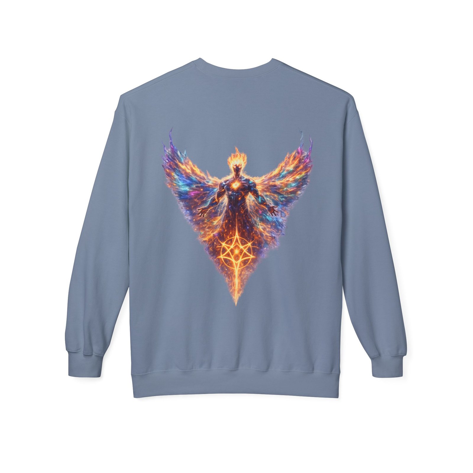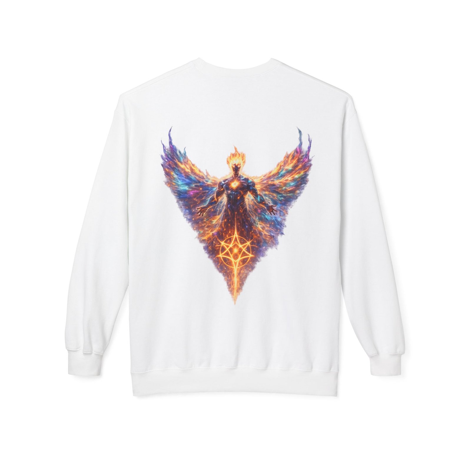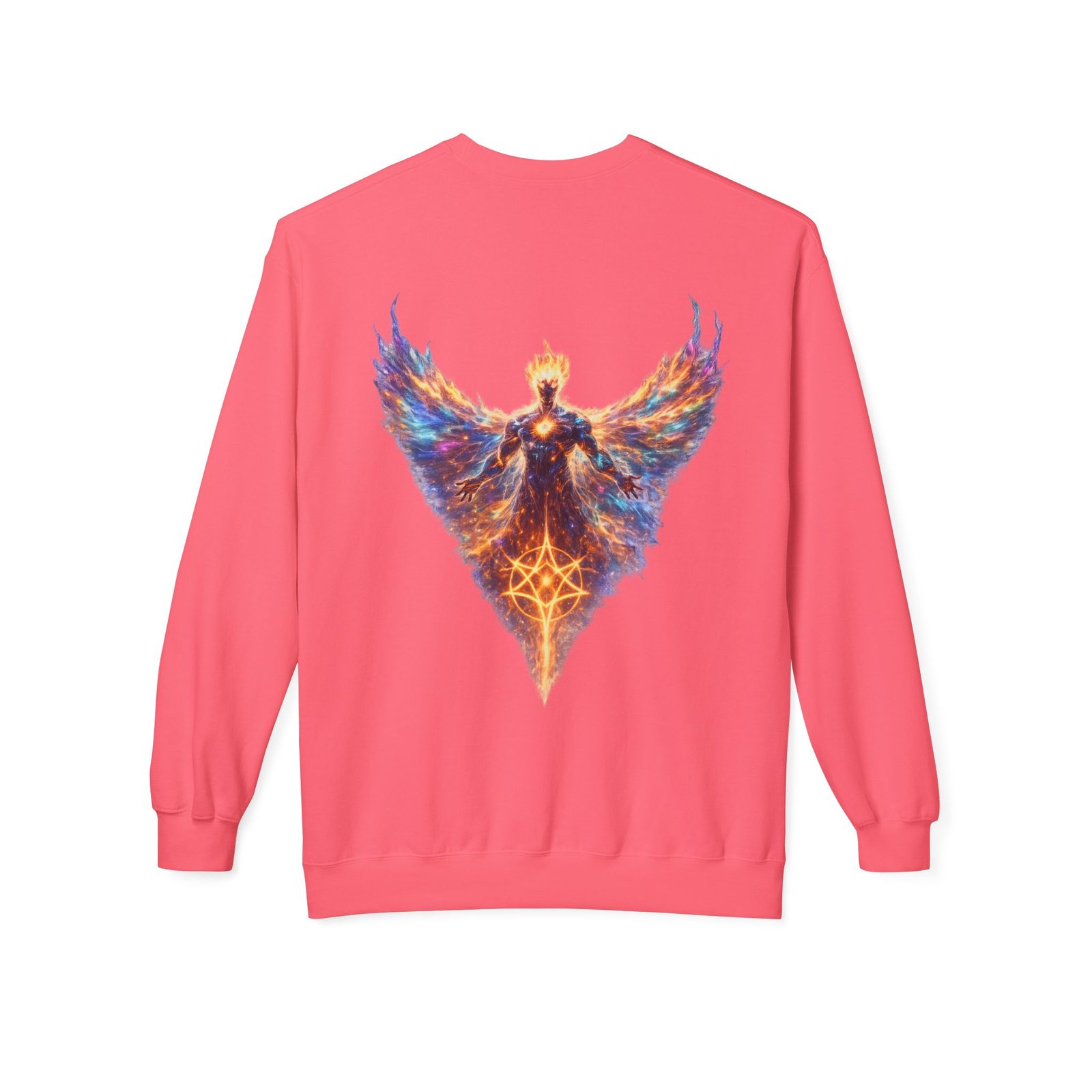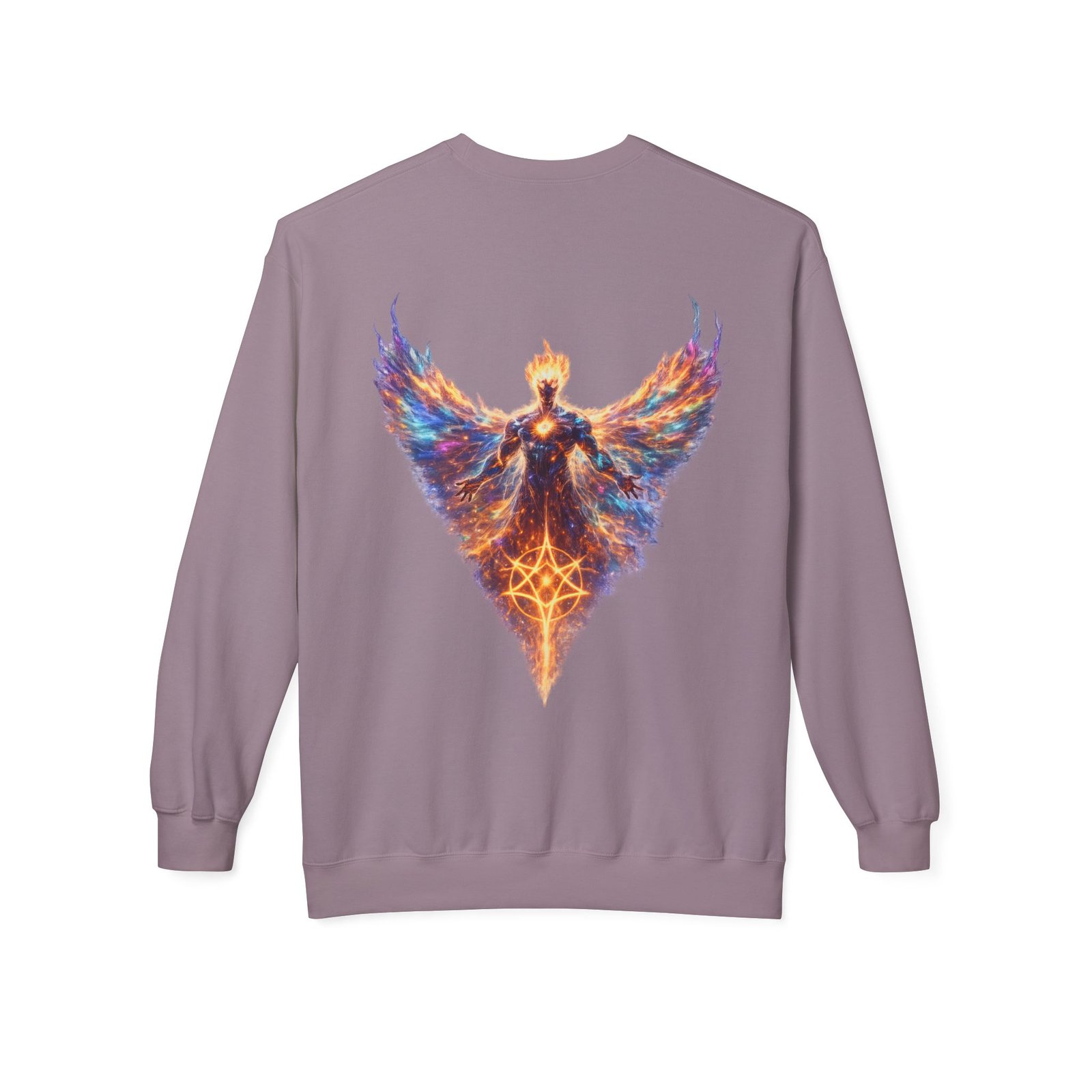 A midweight crewneck sweatshirt that carries a bold, painterly angel motif — wings unfurled in flares of gold, violet, and ember. Wear it when you want warmth without bulk and a statement without shouting. The softened cotton-blend drapes with a relaxed, dropped-shoulder silhouette that invites lingering on chilly evenings, rooftop bonfires, or quiet mornings with coffee. The artwork on the back reads like a small myth: luminous, protective, and a little fierce. It settles comfortably into everyday routines for people who collect meaningful pieces and like their clothes to feel lived-in from the first wear.