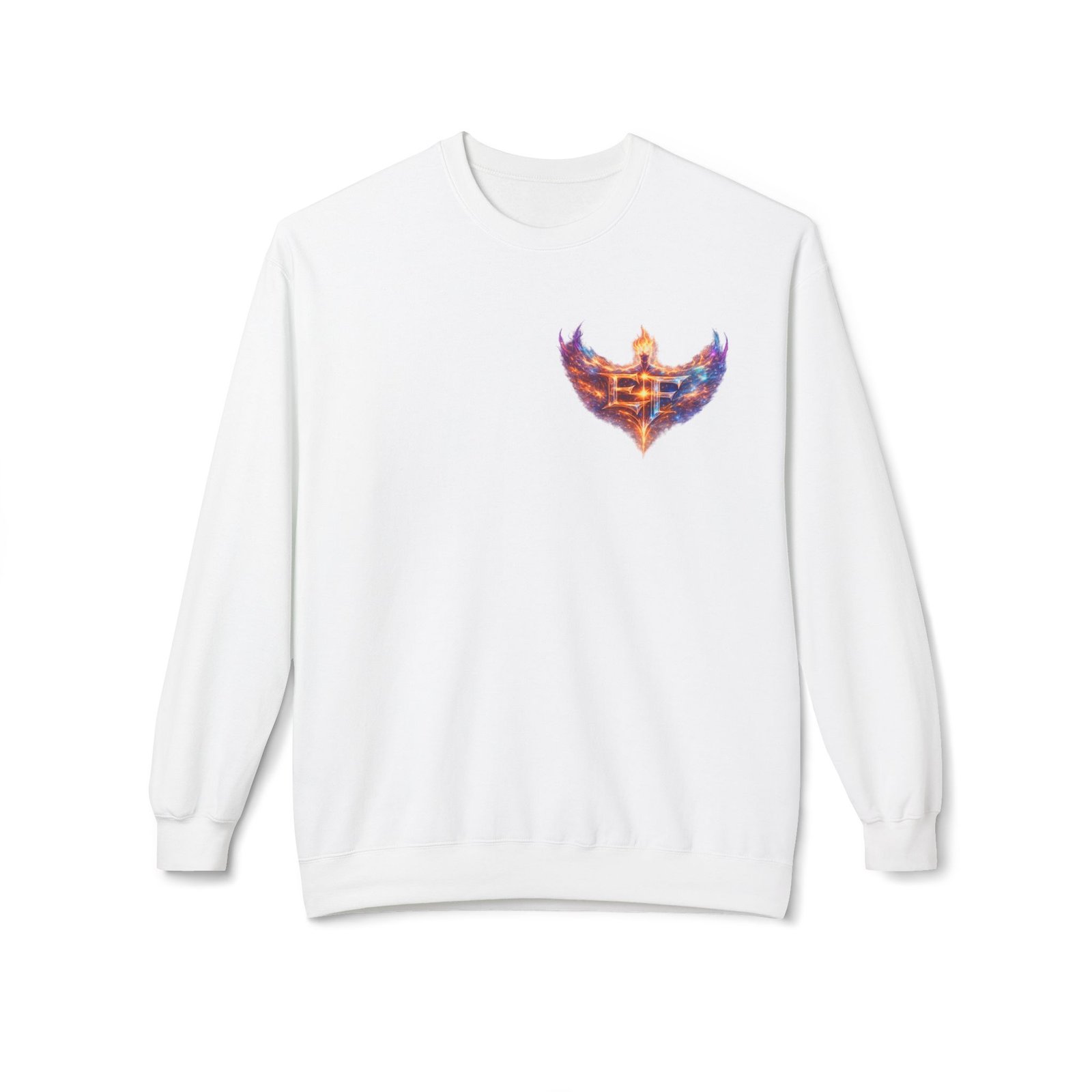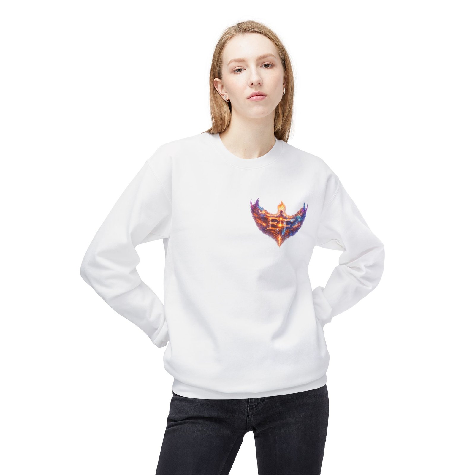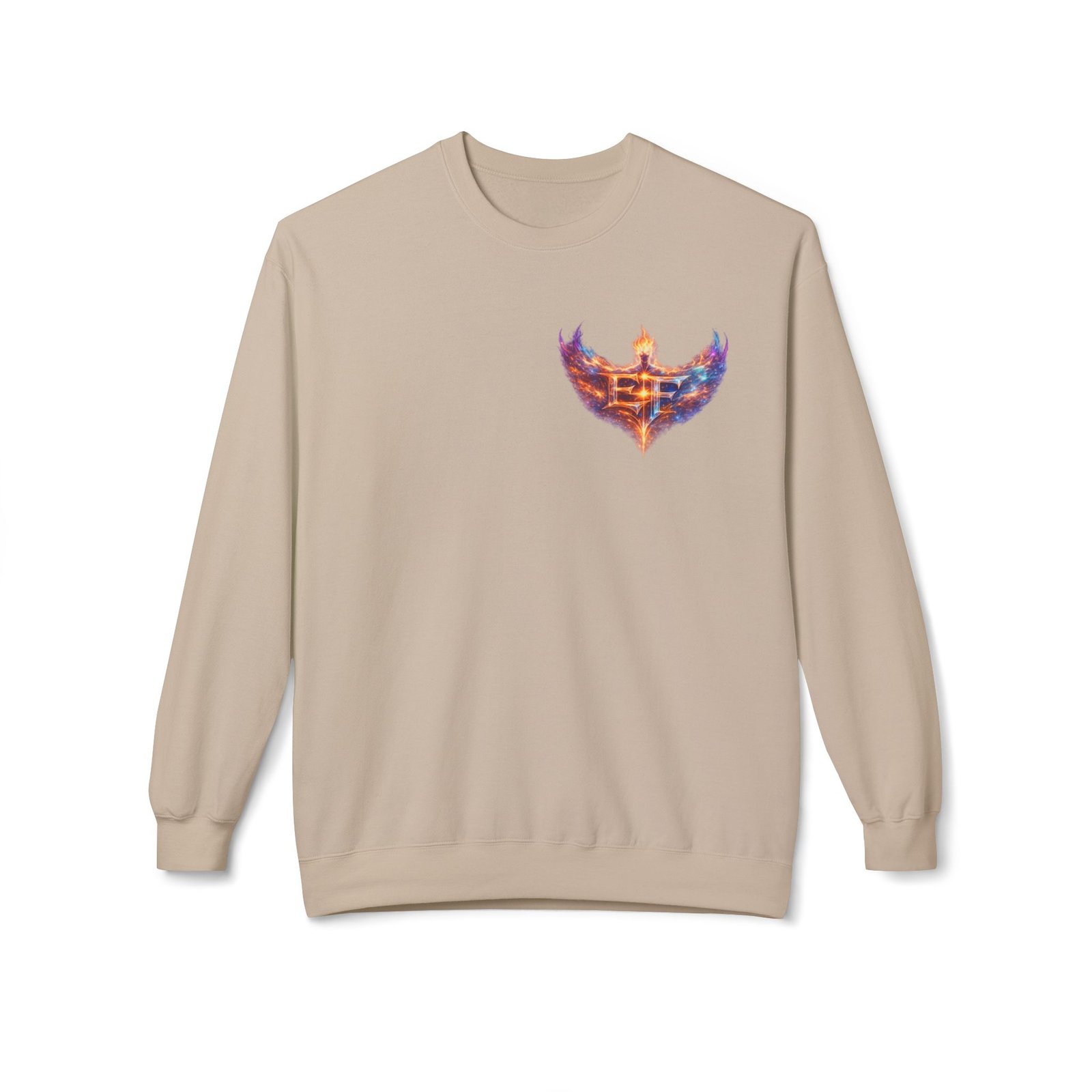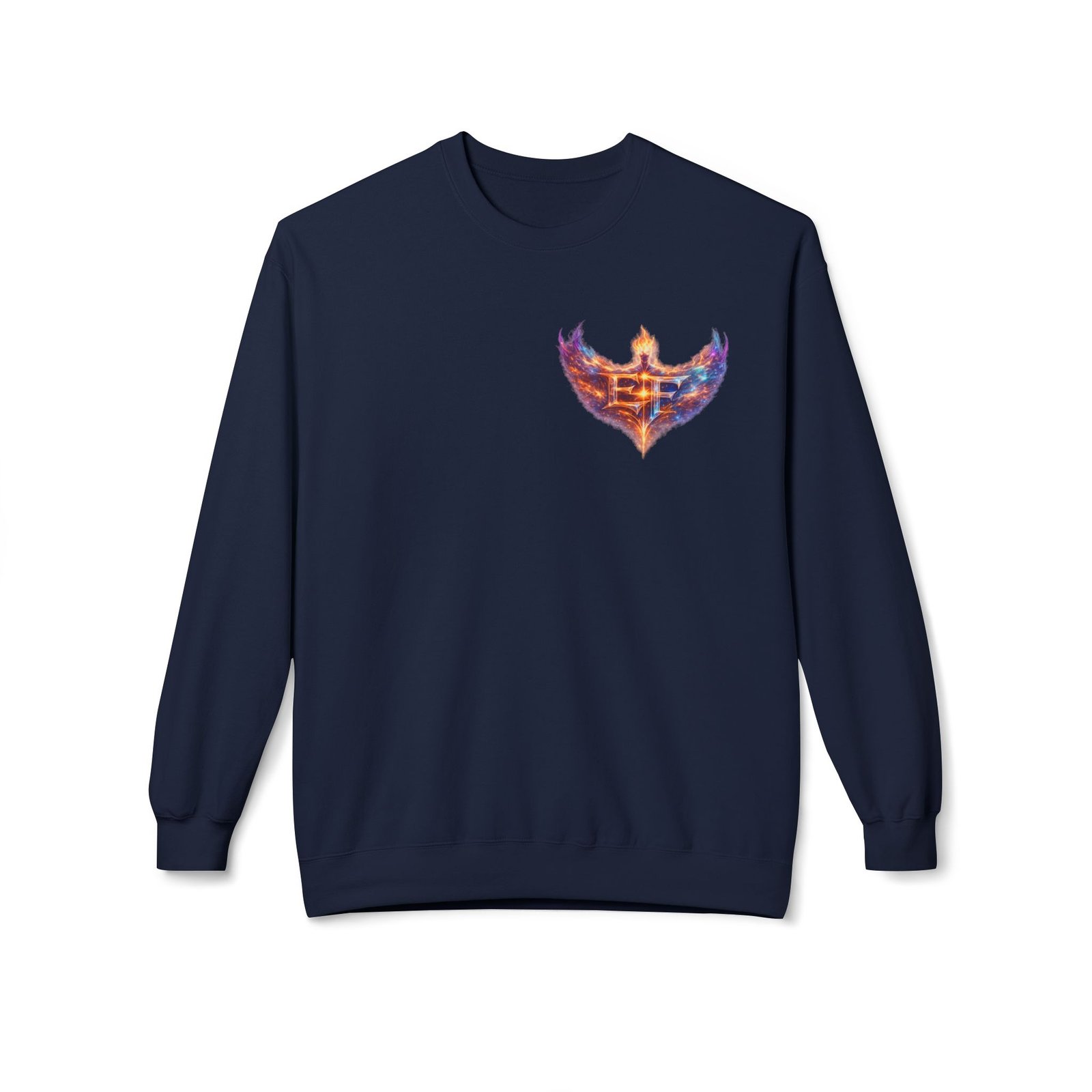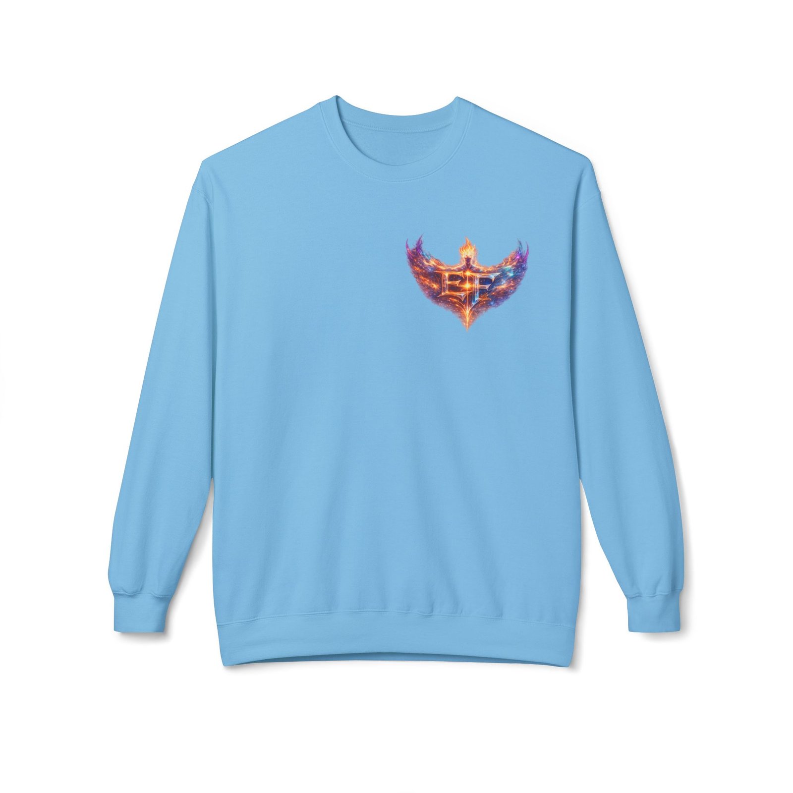 A midweight crewneck sweatshirt that carries a bold, painterly angel motif — wings unfurled in flares of gold, violet, and ember. Wear it when you want warmth without bulk and a statement without shouting. The softened cotton-blend drapes with a relaxed, dropped-shoulder silhouette that invites lingering on chilly evenings, rooftop bonfires, or quiet mornings with coffee. The artwork on the back reads like a small myth: luminous, protective, and a little fierce. It settles comfortably into everyday routines for people who collect meaningful pieces and like their clothes to feel lived-in from the first wear.