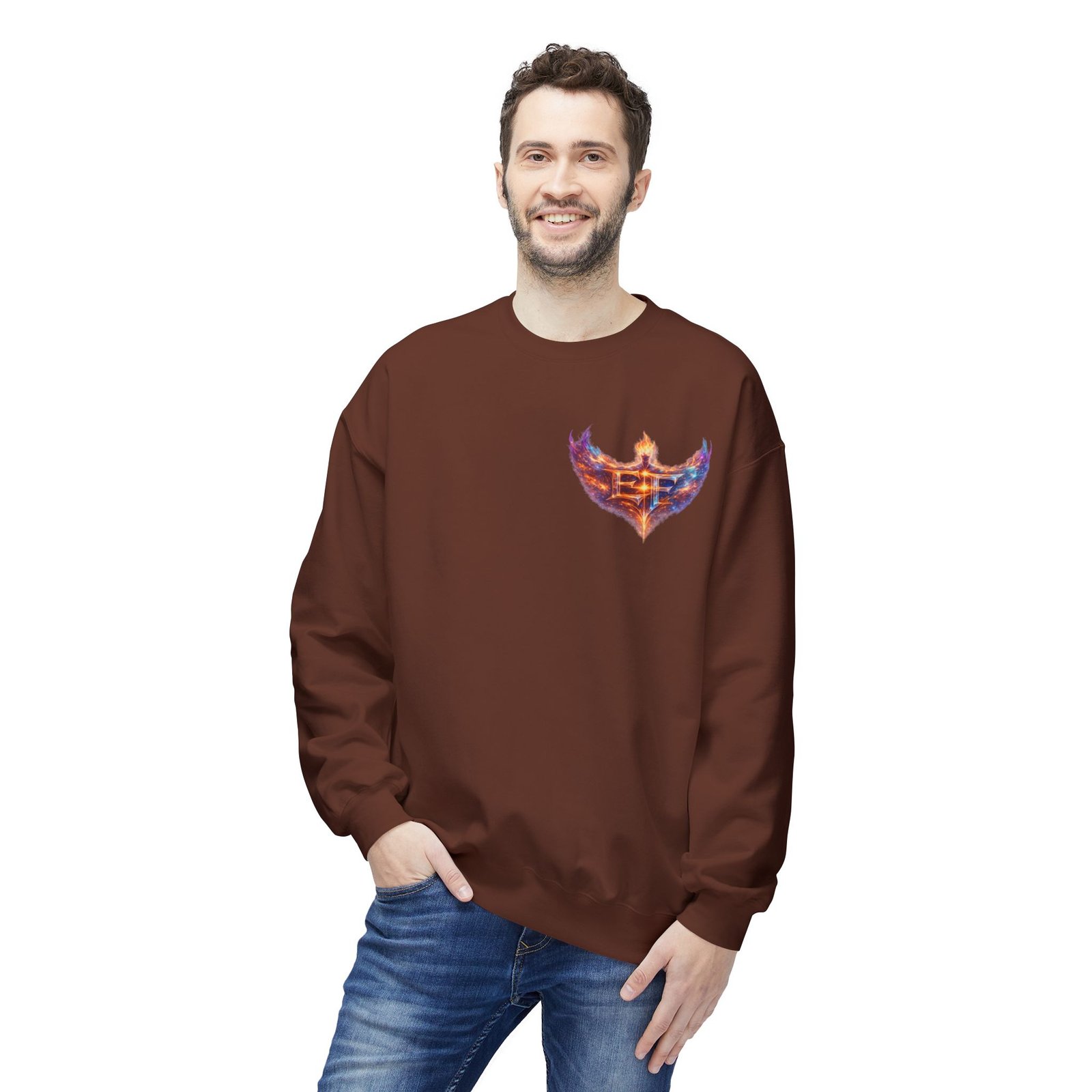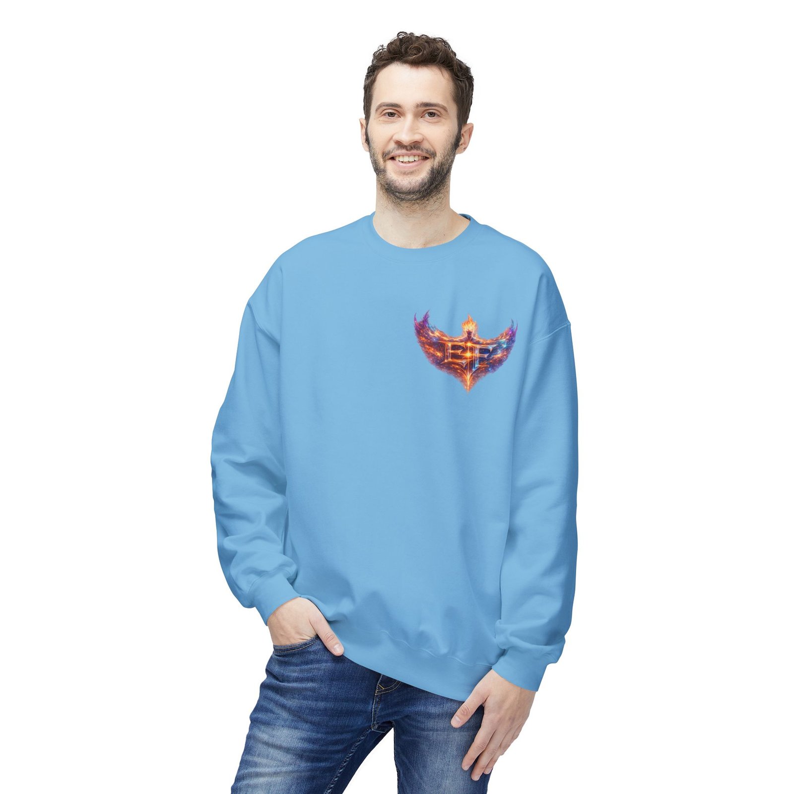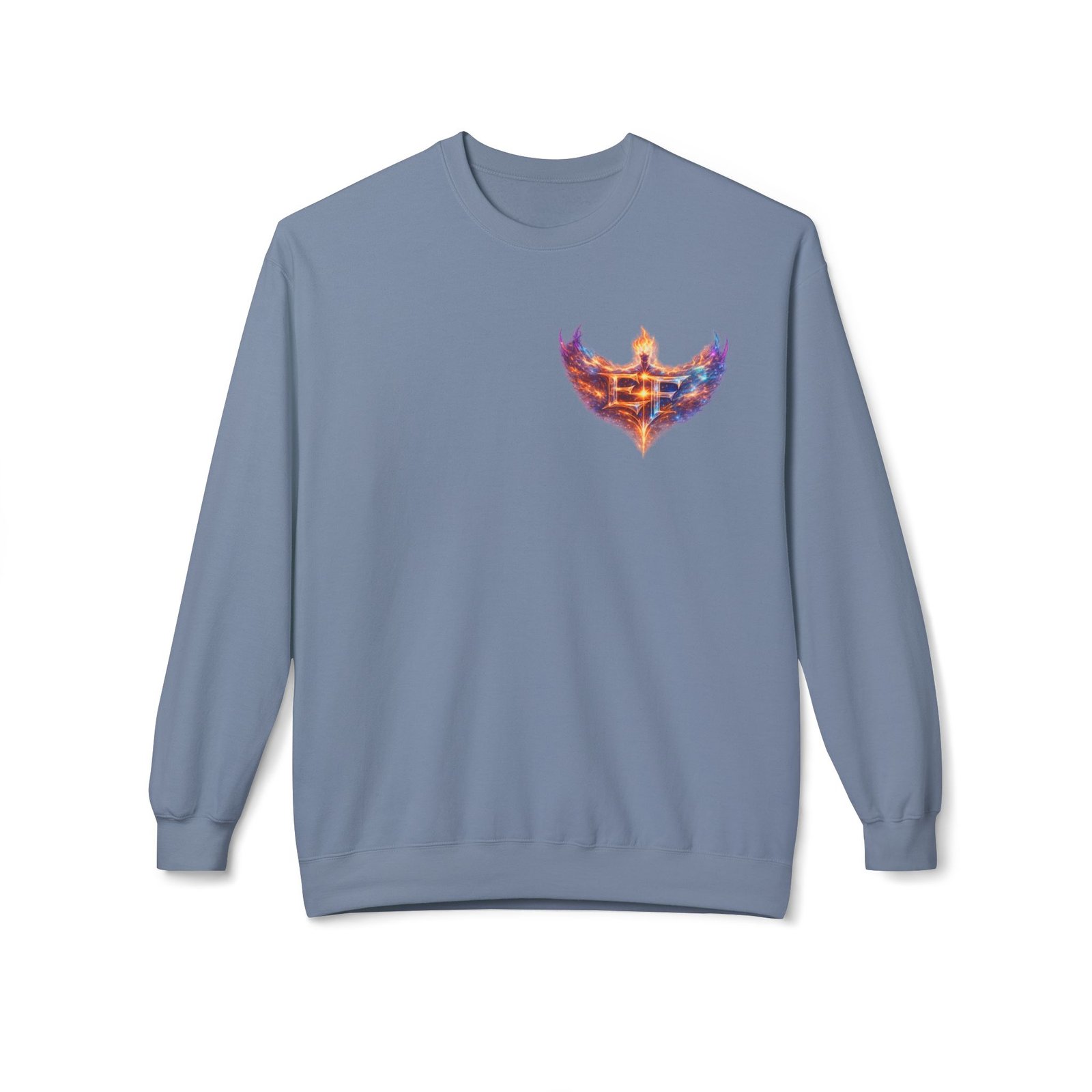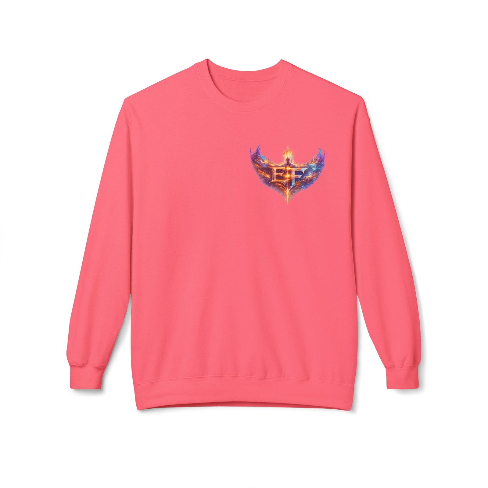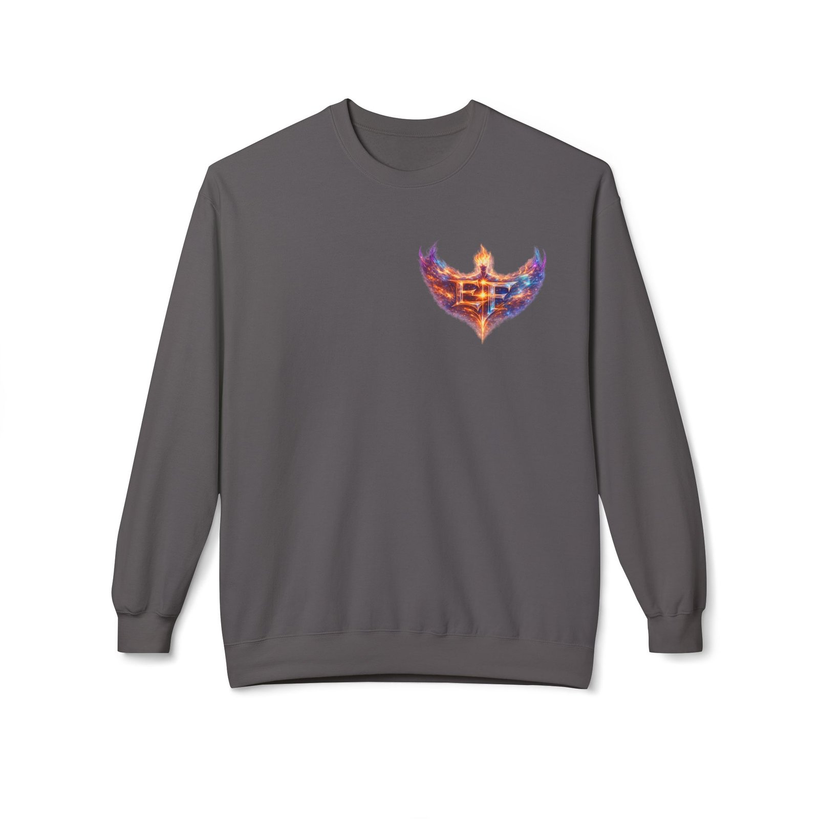 A midweight crewneck sweatshirt that carries a bold, painterly angel motif — wings unfurled in flares of gold, violet, and ember. Wear it when you want warmth without bulk and a statement without shouting. The softened cotton-blend drapes with a relaxed, dropped-shoulder silhouette that invites lingering on chilly evenings, rooftop bonfires, or quiet mornings with coffee. The artwork on the back reads like a small myth: luminous, protective, and a little fierce. It settles comfortably into everyday routines for people who collect meaningful pieces and like their clothes to feel lived-in from the first wear.