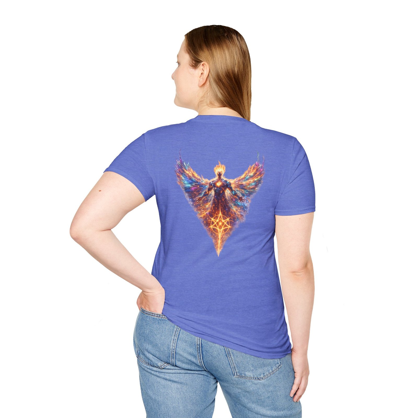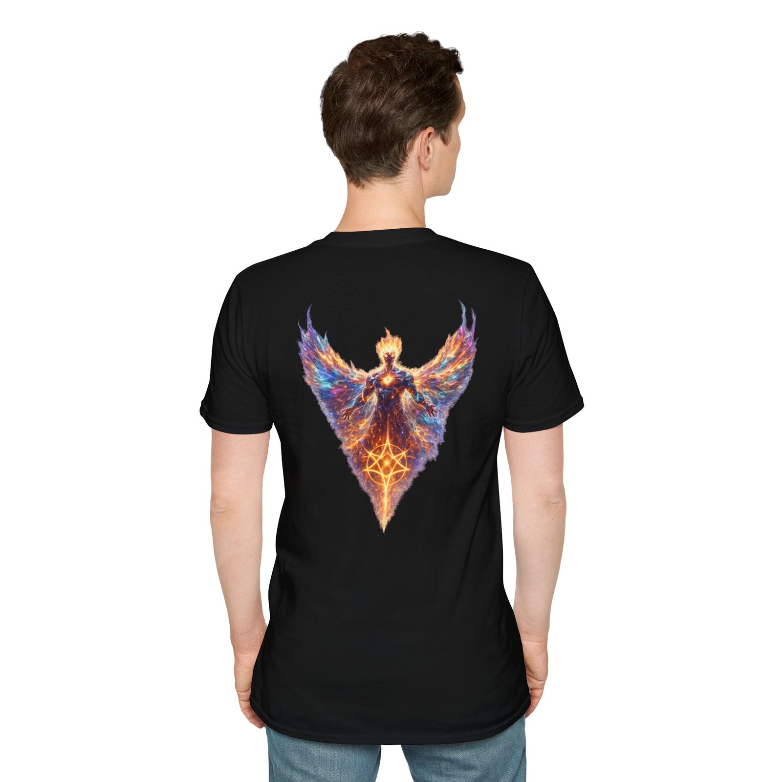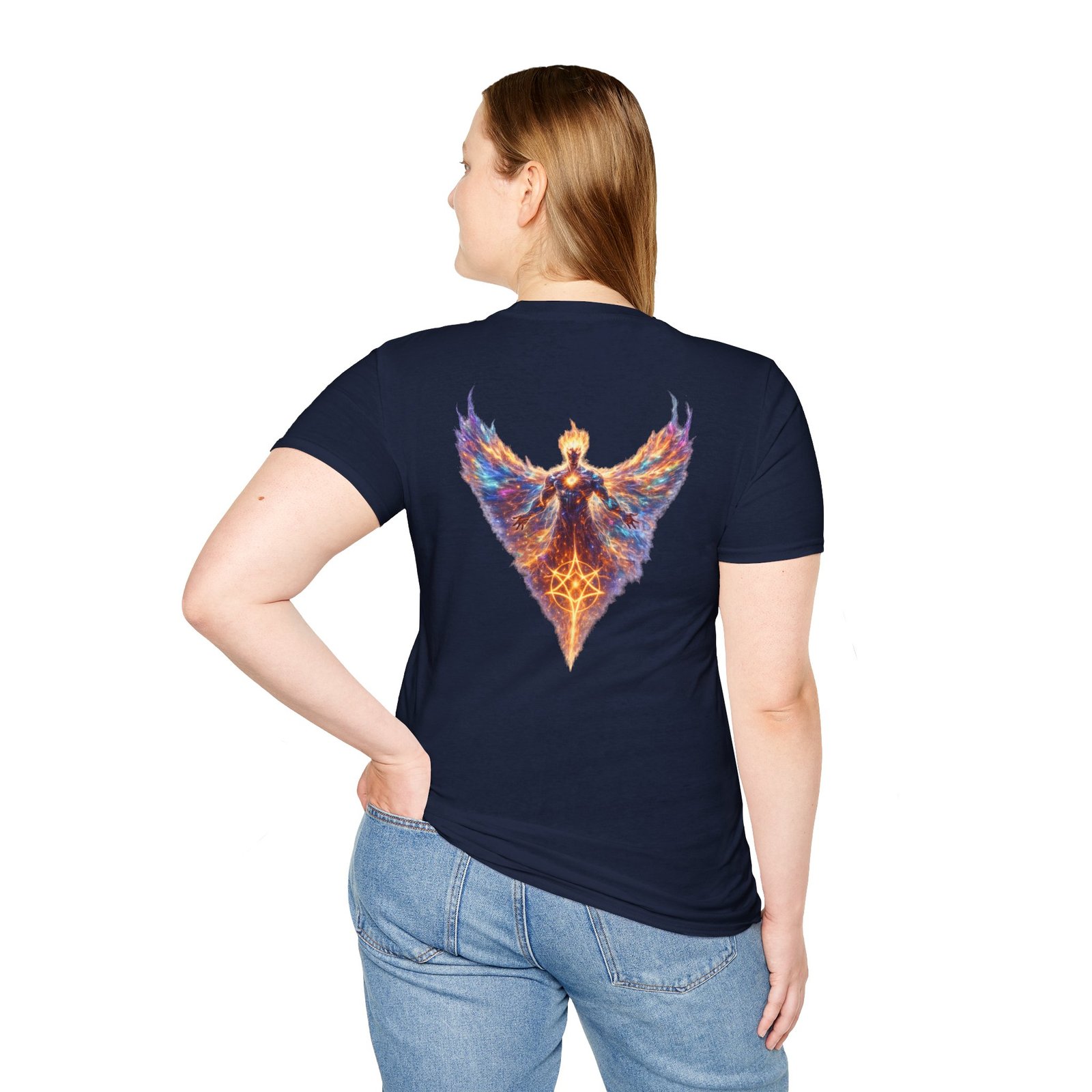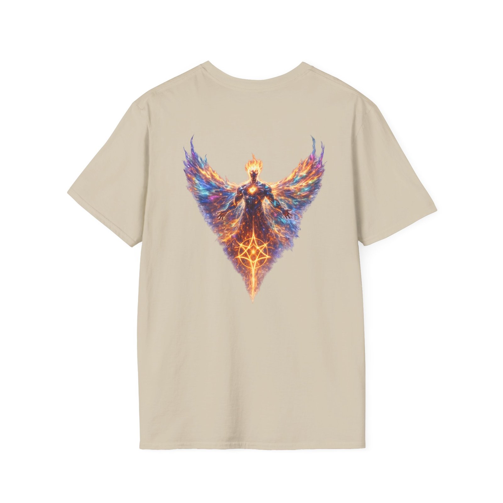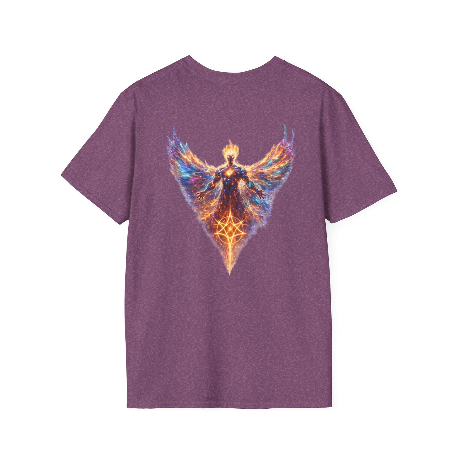 This lightweight tee carries a bold, painterly emblem that feels equal parts myth and sunrise. The front shows a stylized winged crest glowing with ember tones; the back expands into a full, radiant angelic figure whose feathers blur into watercolor-streaked light. Wear it when you want an everyday piece with an artful, mystical energy—something that suggests resilience, quiet power, and a lived-in creative spirit. Short sleeves and a classic crew give it easy layering potential: pair with a worn denim jacket, an open flannel, or let it sit solo on warmer days. The artwork reads like a story in color—fiery oranges, deep purples, and electric blues—so it stands out while still feeling like something you’d reach for again and again.