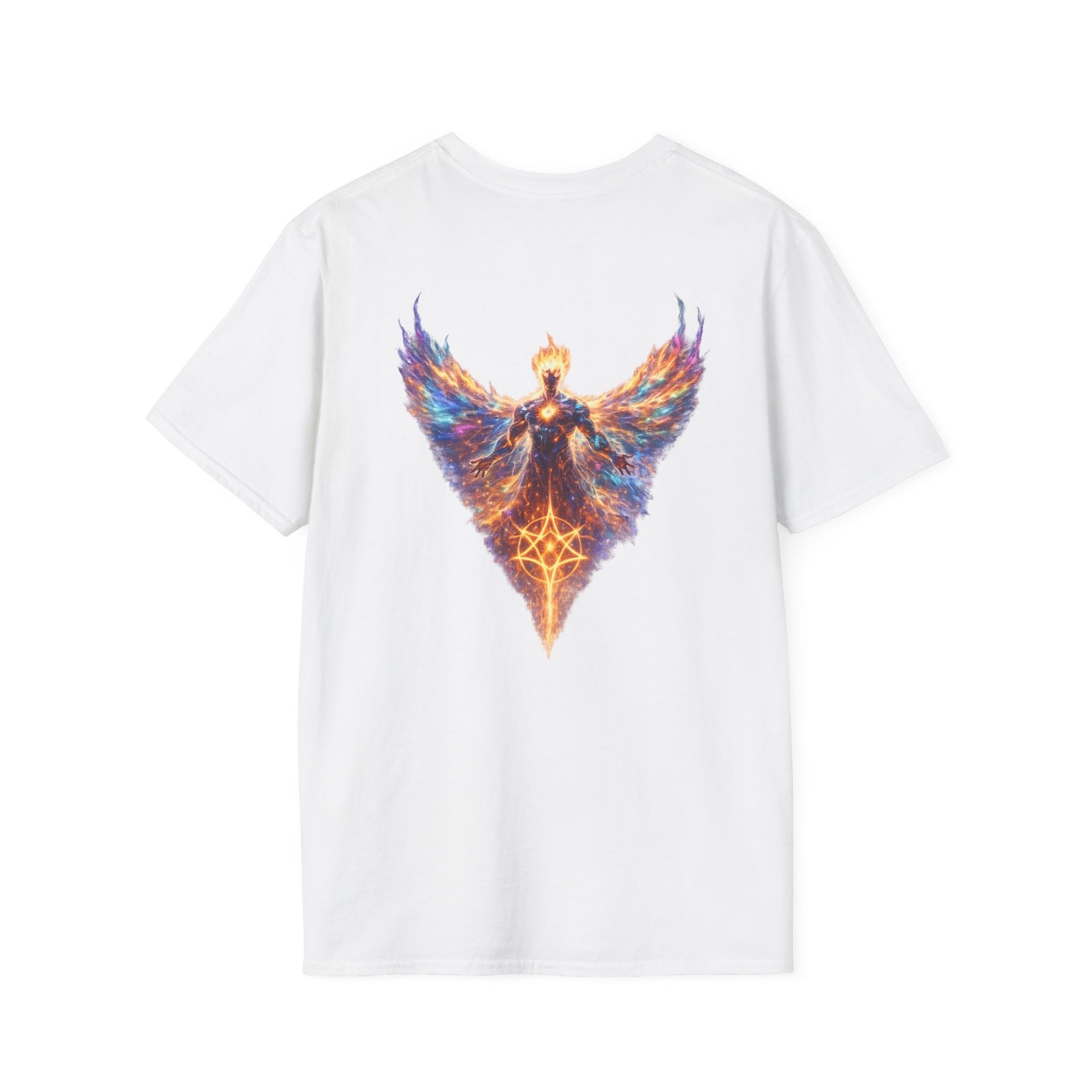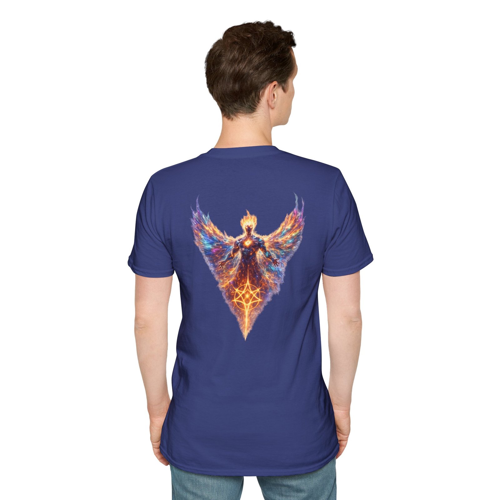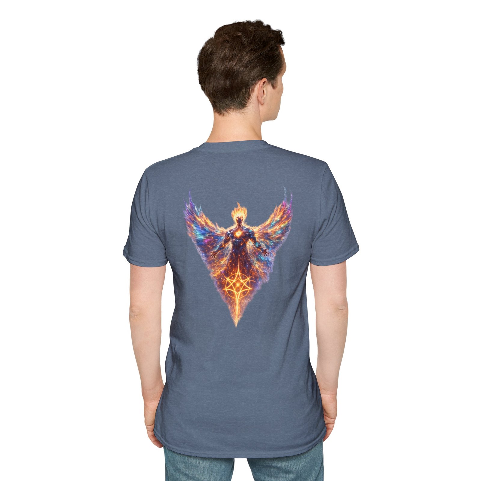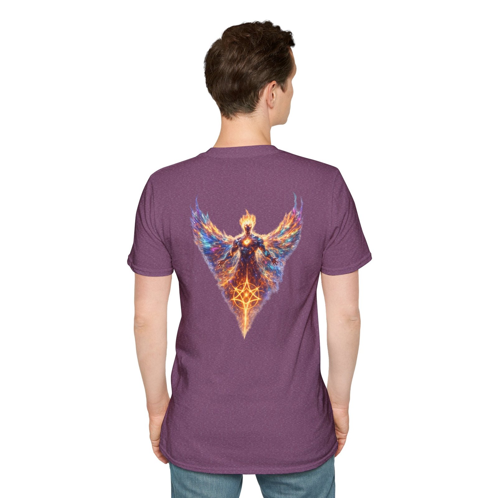 This lightweight tee carries a bold, painterly emblem that feels equal parts myth and sunrise. The front shows a stylized winged crest glowing with ember tones; the back expands into a full, radiant angelic figure whose feathers blur into watercolor-streaked light. Wear it when you want an everyday piece with an artful, mystical energy—something that suggests resilience, quiet power, and a lived-in creative spirit. Short sleeves and a classic crew give it easy layering potential: pair with a worn denim jacket, an open flannel, or let it sit solo on warmer days. The artwork reads like a story in color—fiery oranges, deep purples, and electric blues—so it stands out while still feeling like something you’d reach for again and again.