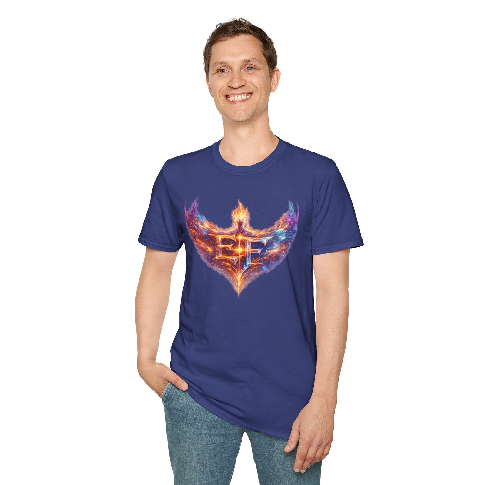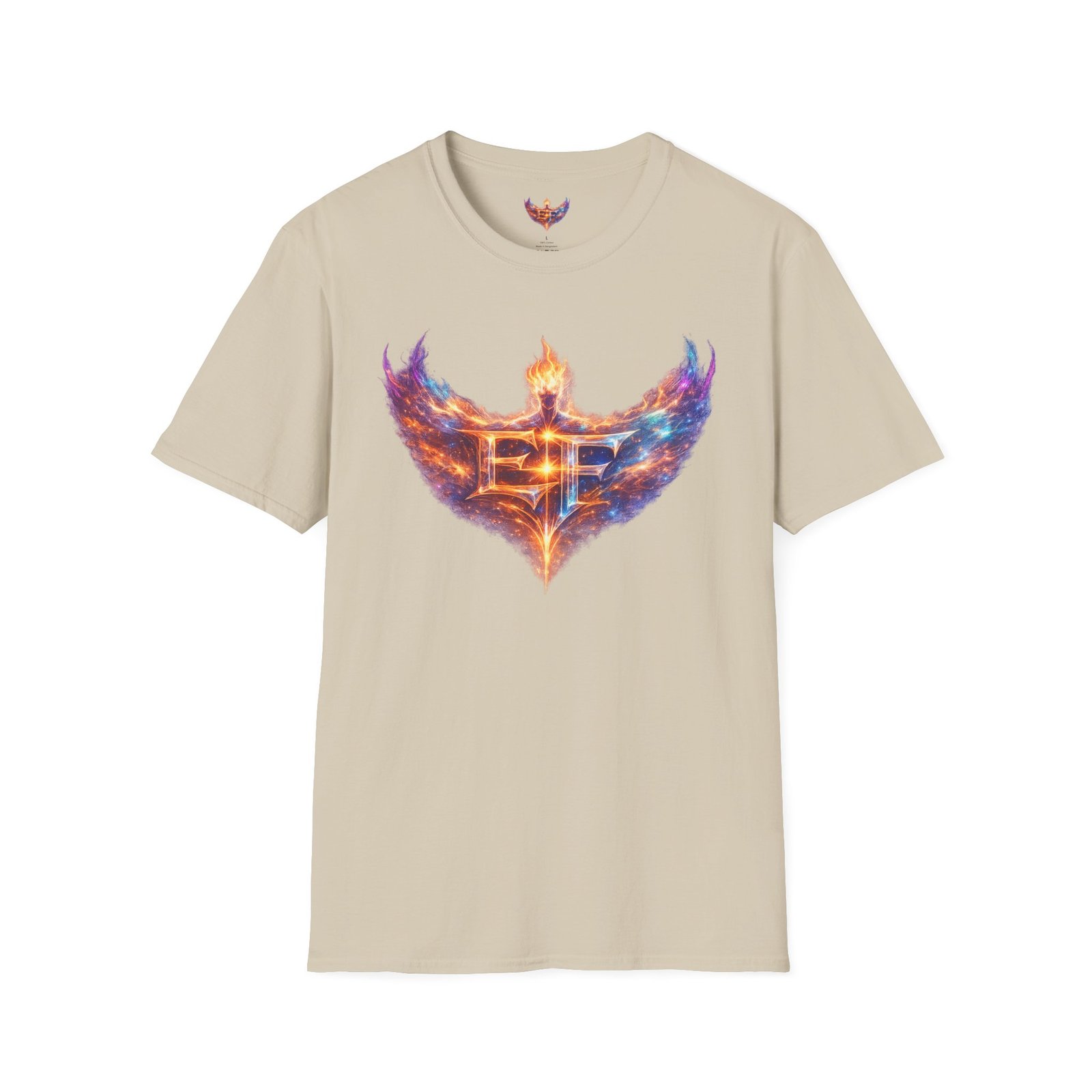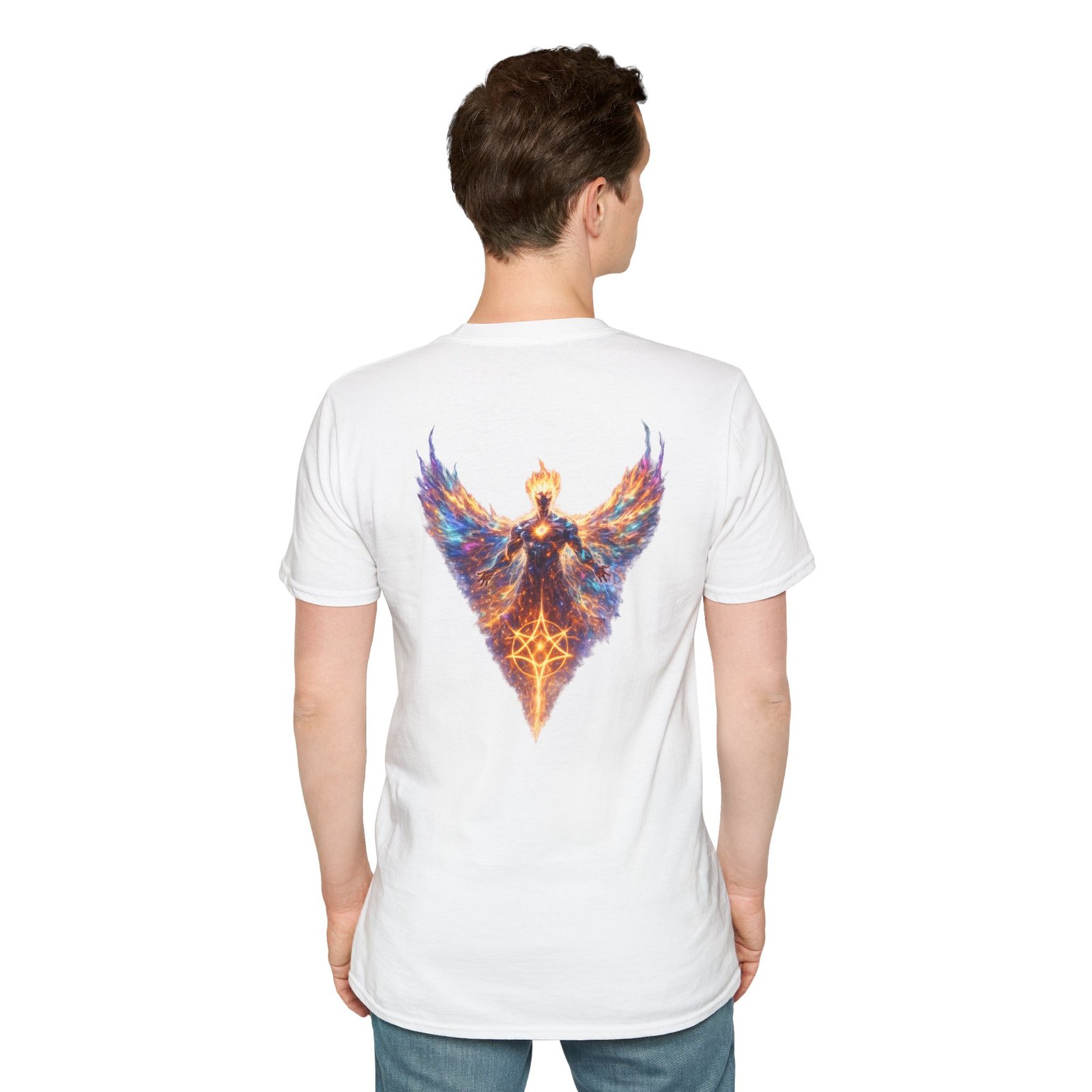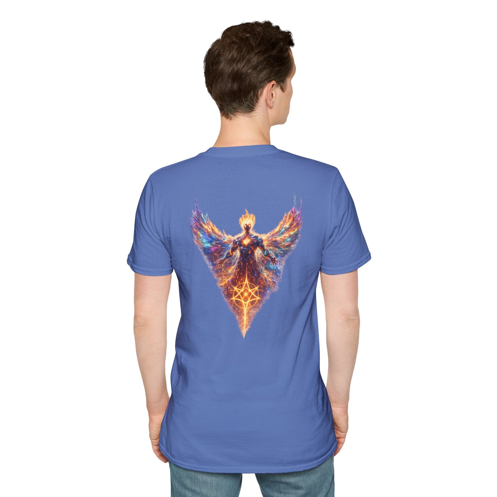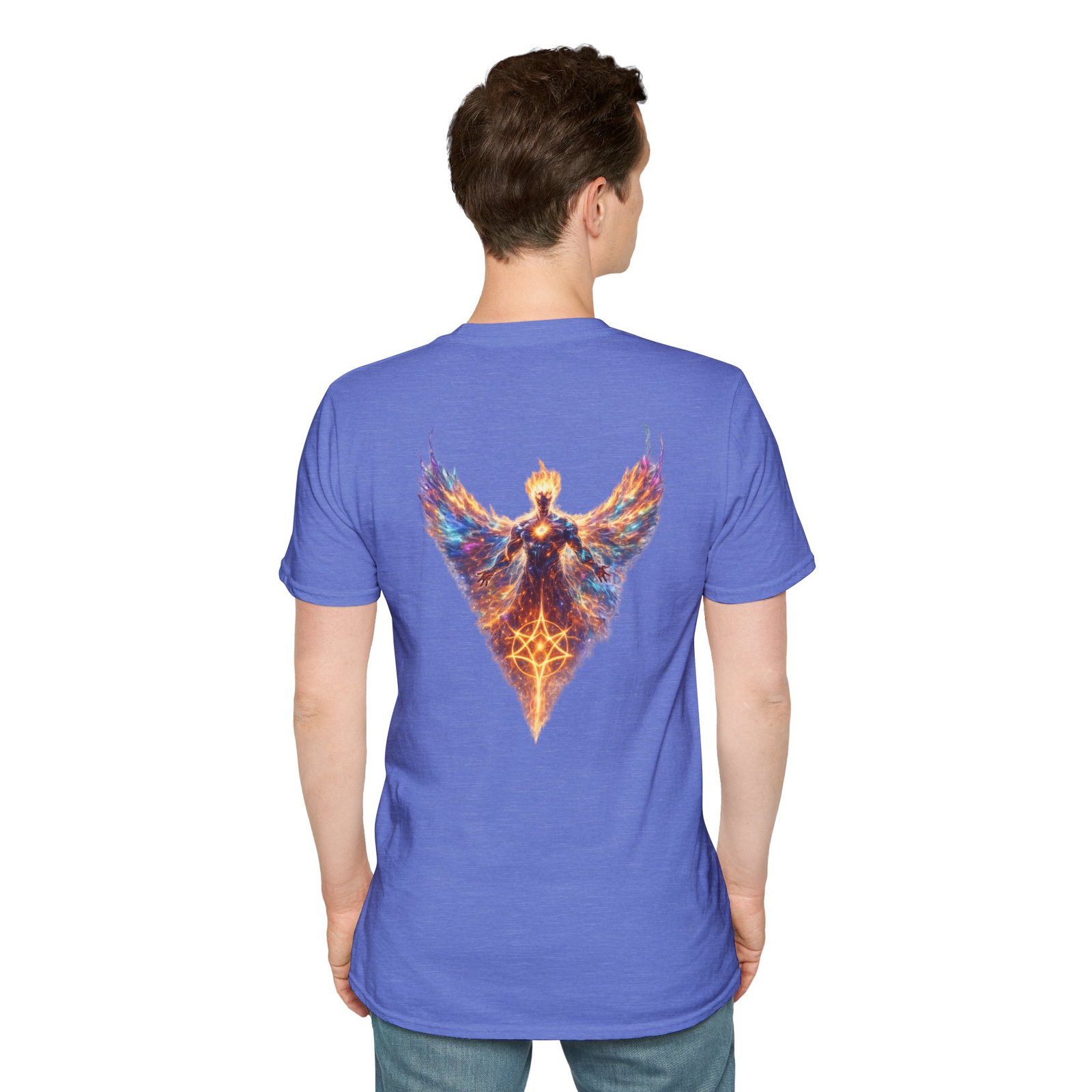This lightweight tee carries a bold, painterly emblem that feels equal parts myth and sunrise. The front shows a stylized winged crest glowing with ember tones; the back expands into a full, radiant angelic figure whose feathers blur into watercolor-streaked light. Wear it when you want an everyday piece with an artful, mystical energy—something that suggests resilience, quiet power, and a lived-in creative spirit. Short sleeves and a classic crew give it easy layering potential: pair with a worn denim jacket, an open flannel, or let it sit solo on warmer days. The artwork reads like a story in color—fiery oranges, deep purples, and electric blues—so it stands out while still feeling like something you’d reach for again and again.