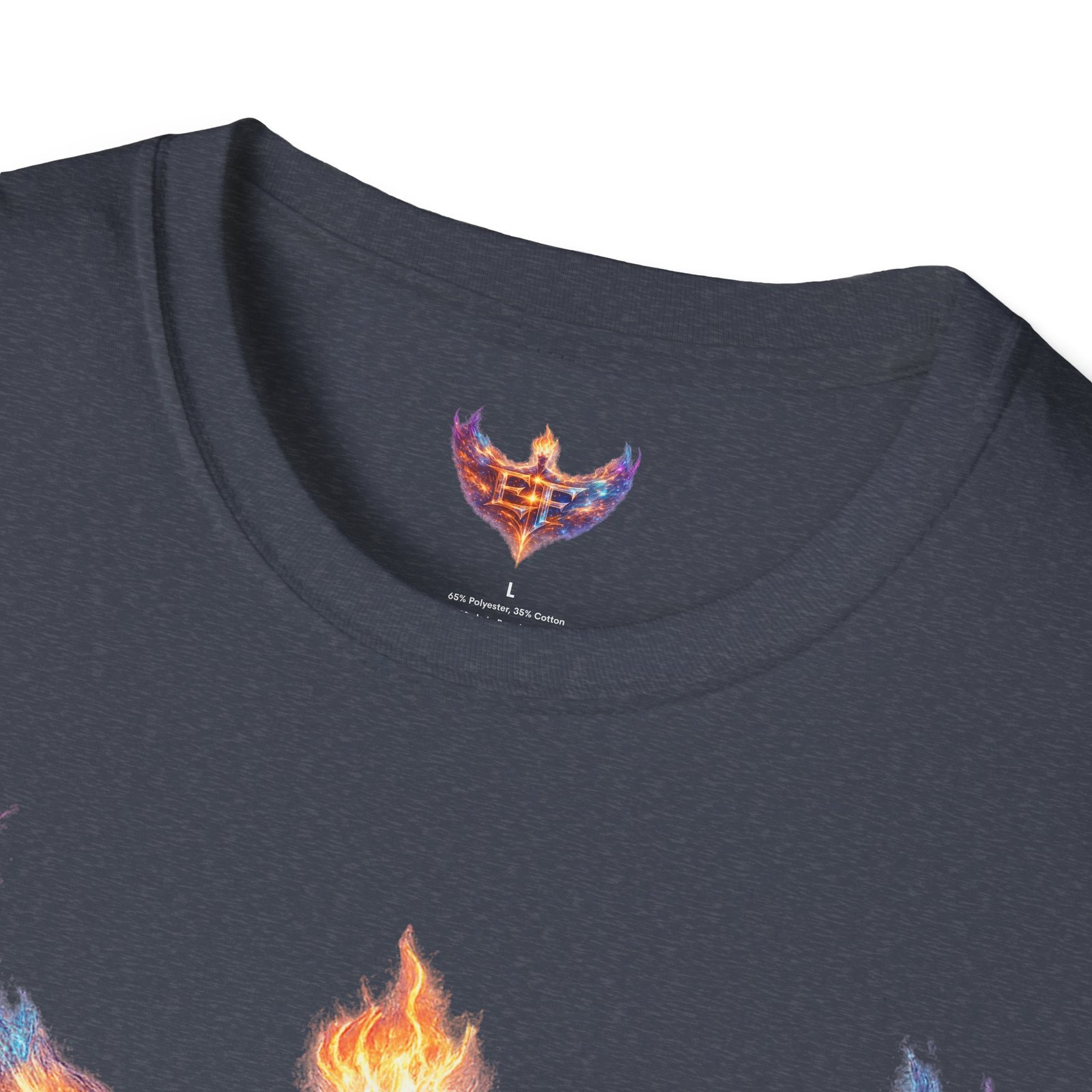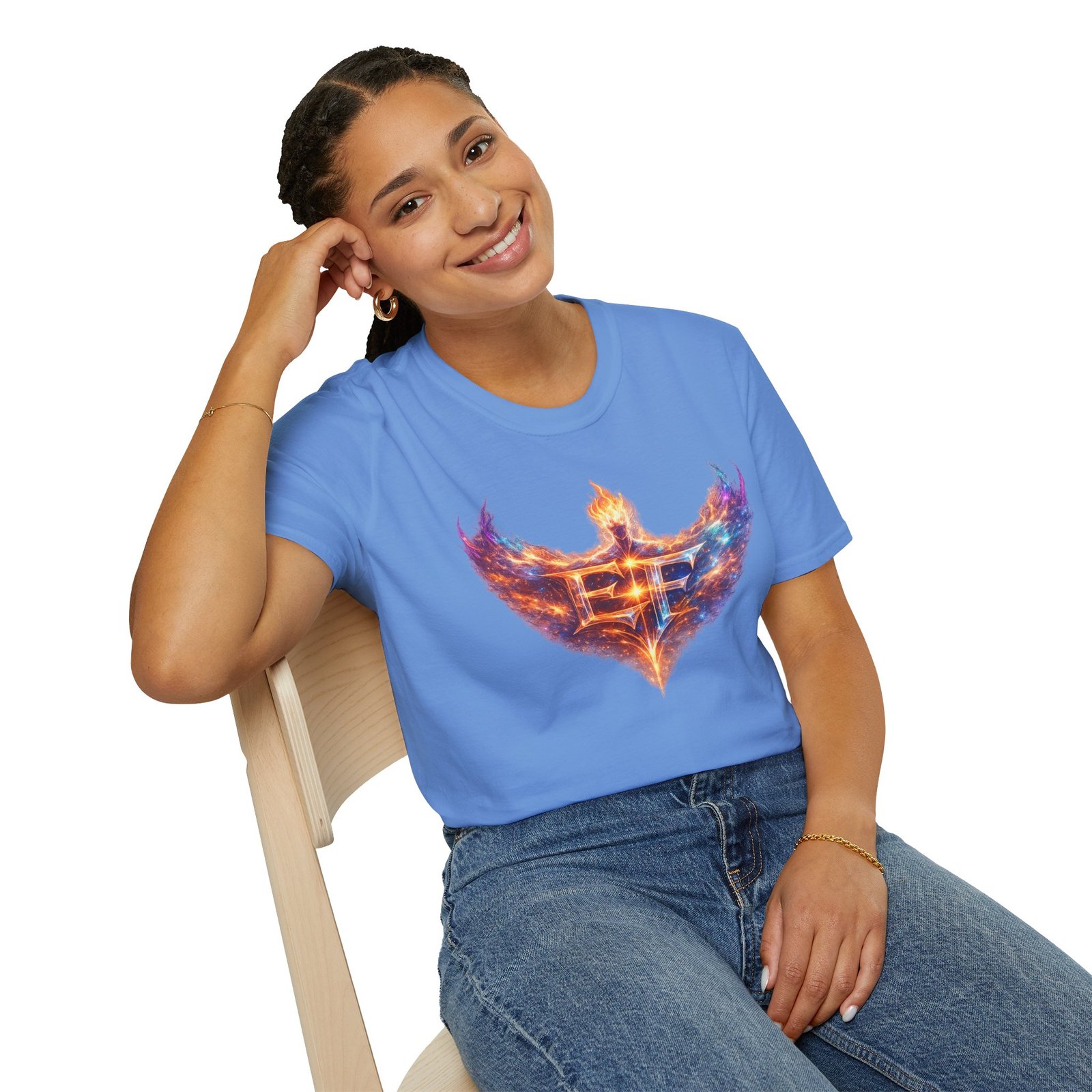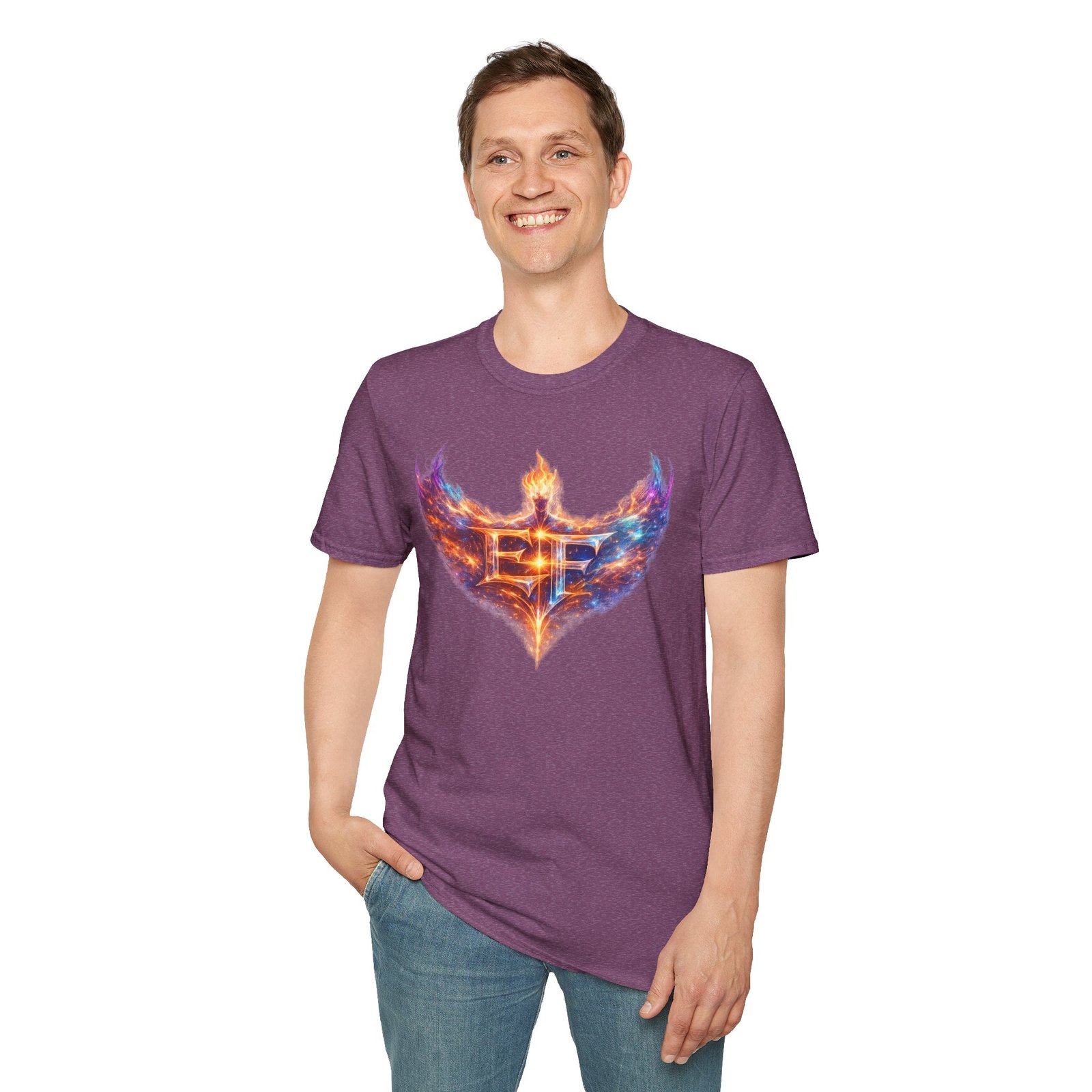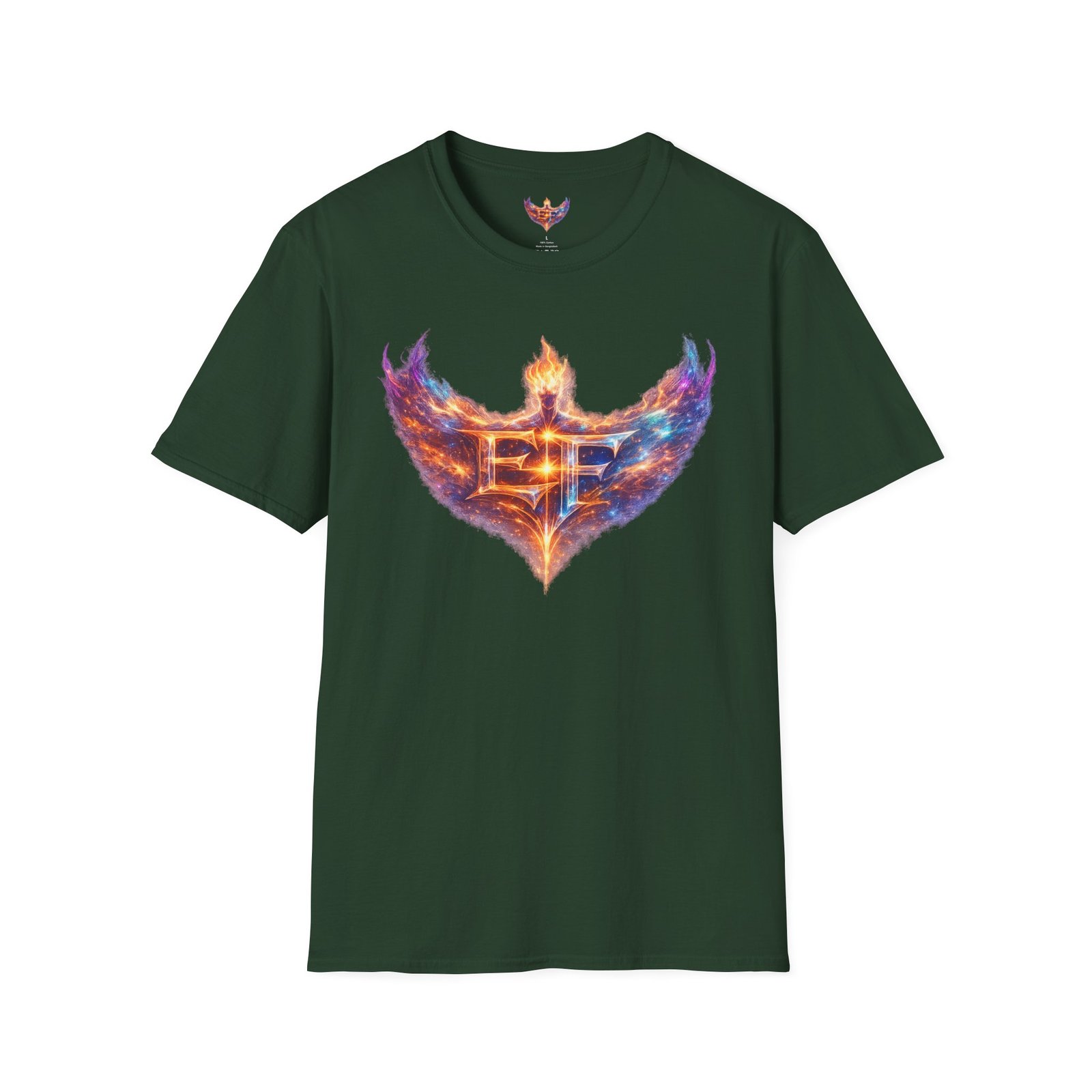 This lightweight tee carries a bold, painterly emblem that feels equal parts myth and sunrise. The front shows a stylized winged crest glowing with ember tones; the back expands into a full, radiant angelic figure whose feathers blur into watercolor-streaked light. Wear it when you want an everyday piece with an artful, mystical energy—something that suggests resilience, quiet power, and a lived-in creative spirit. Short sleeves and a classic crew give it easy layering potential: pair with a worn denim jacket, an open flannel, or let it sit solo on warmer days. The artwork reads like a story in color—fiery oranges, deep purples, and electric blues—so it stands out while still feeling like something you’d reach for again and again.
