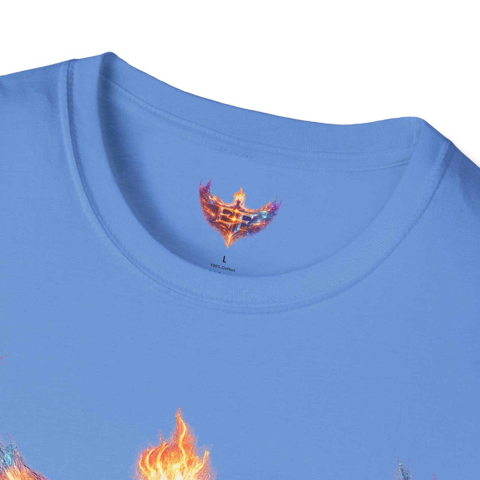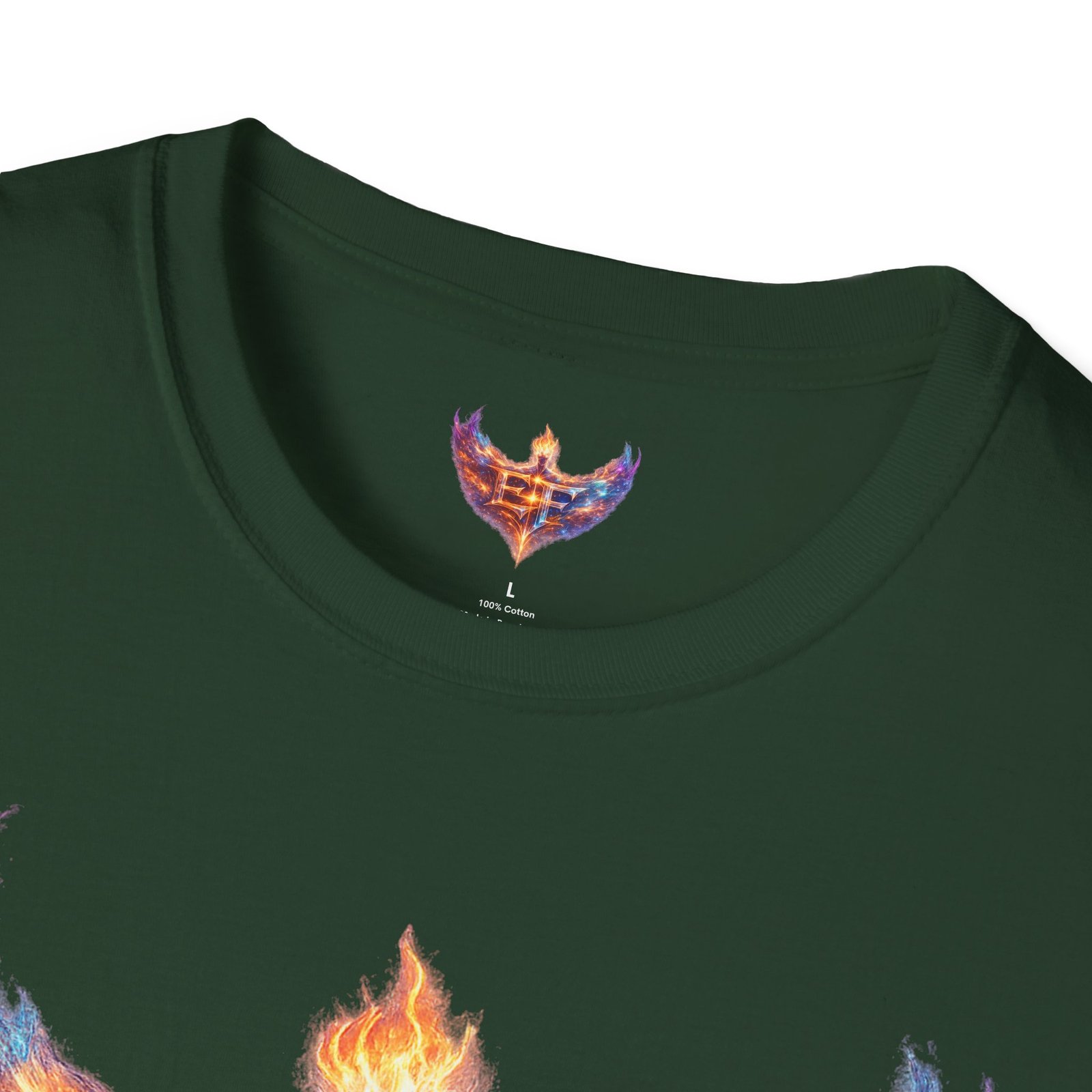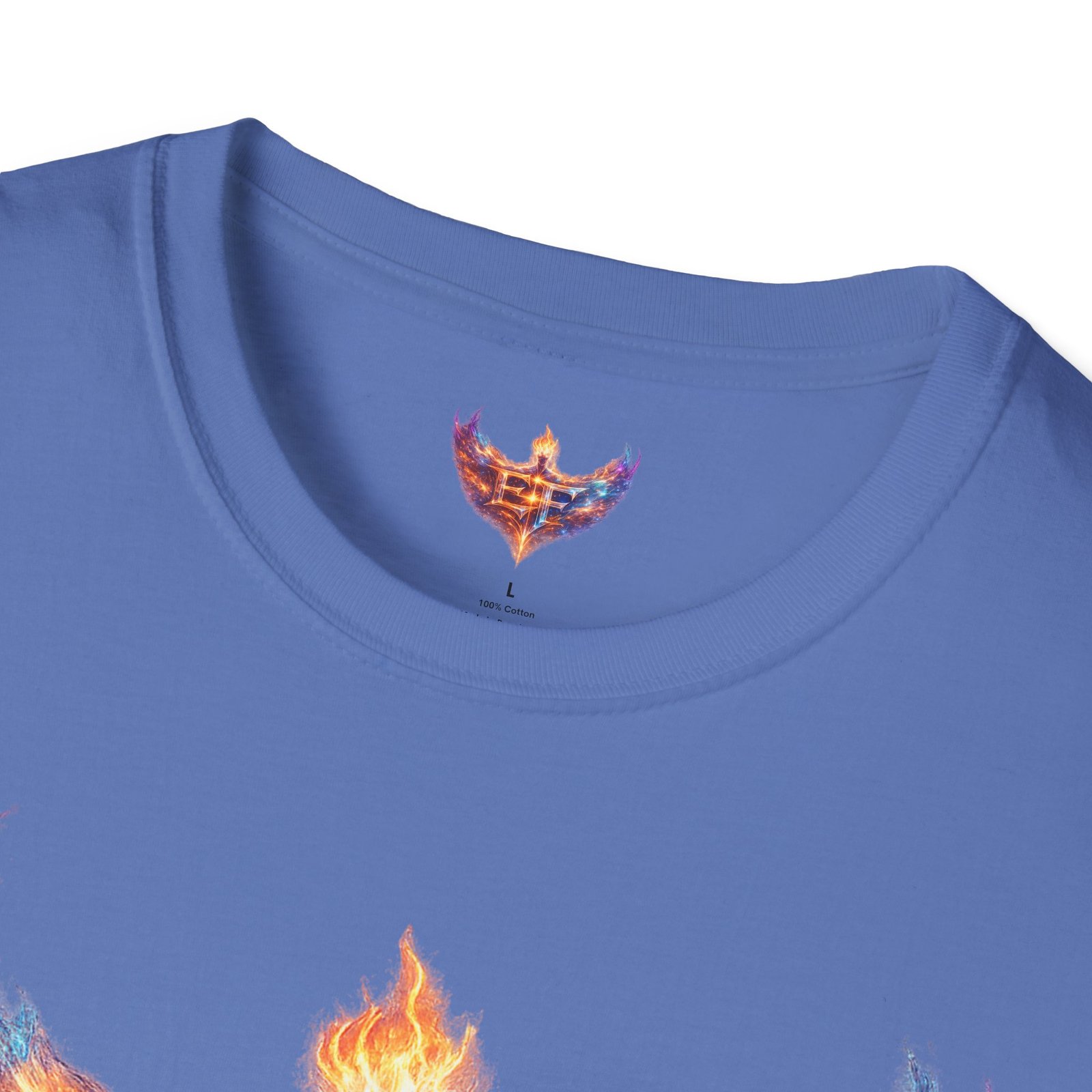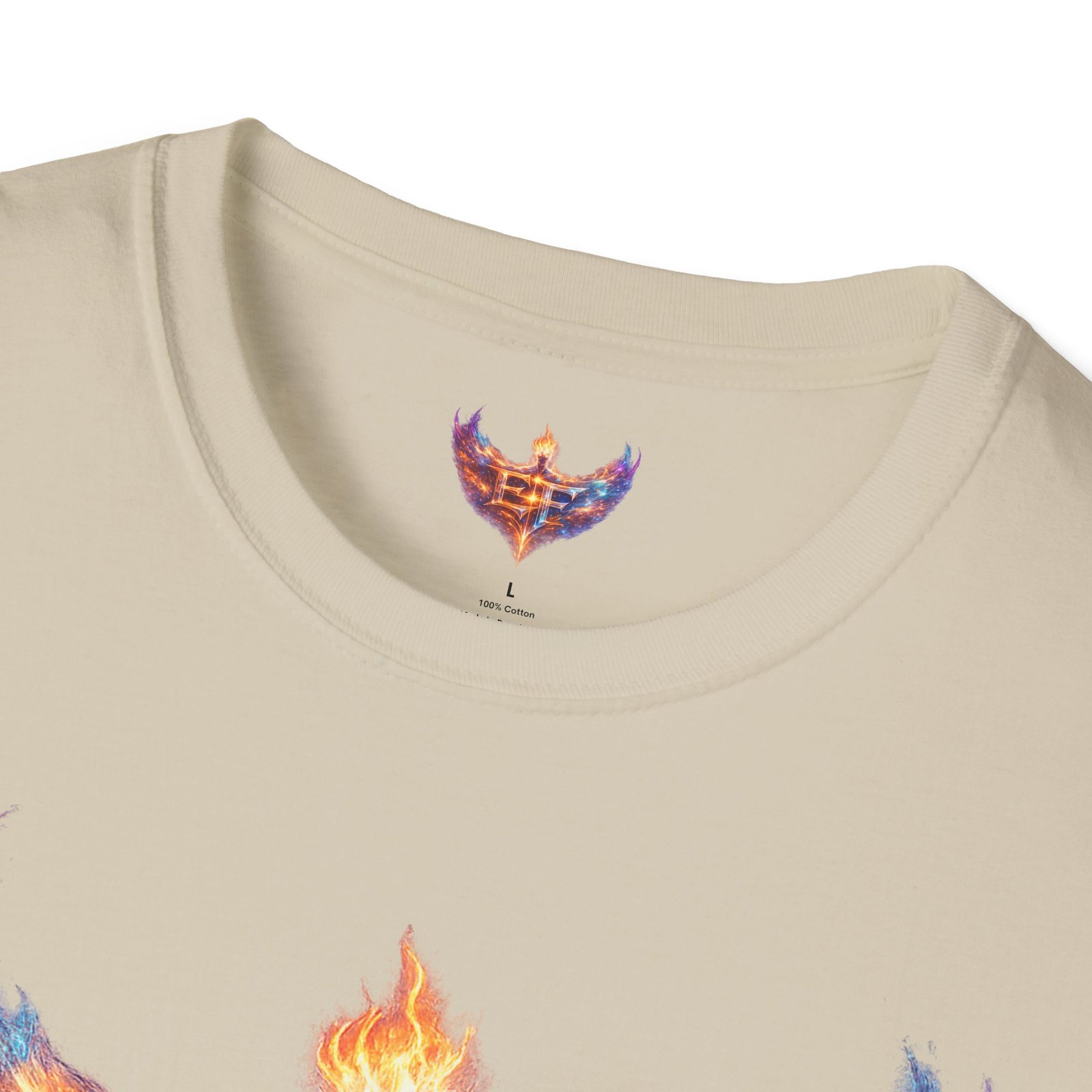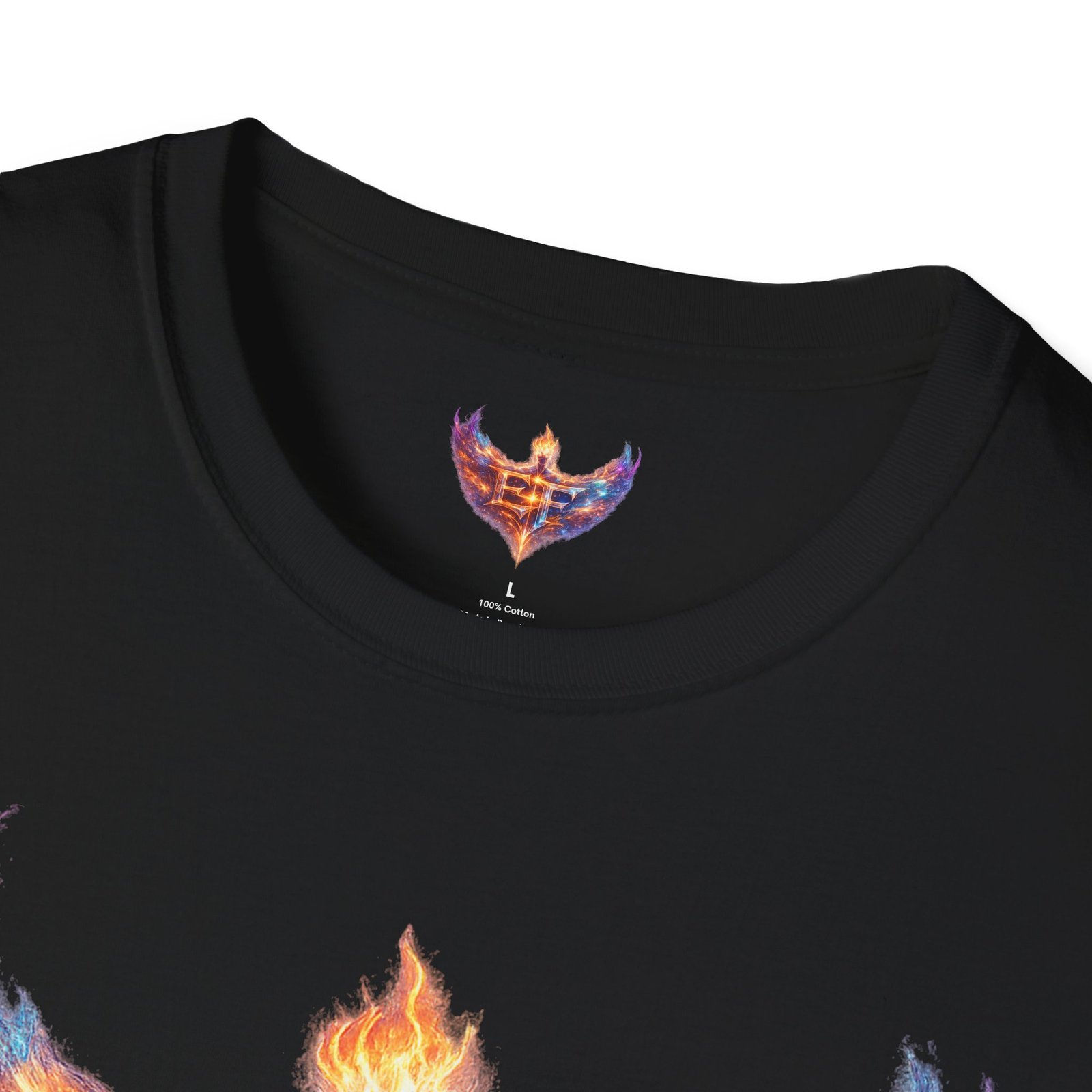 This lightweight tee carries a bold, painterly emblem that feels equal parts myth and sunrise. The front shows a stylized winged crest glowing with ember tones; the back expands into a full, radiant angelic figure whose feathers blur into watercolor-streaked light. Wear it when you want an everyday piece with an artful, mystical energy—something that suggests resilience, quiet power, and a lived-in creative spirit. Short sleeves and a classic crew give it easy layering potential: pair with a worn denim jacket, an open flannel, or let it sit solo on warmer days. The artwork reads like a story in color—fiery oranges, deep purples, and electric blues—so it stands out while still feeling like something you’d reach for again and again.