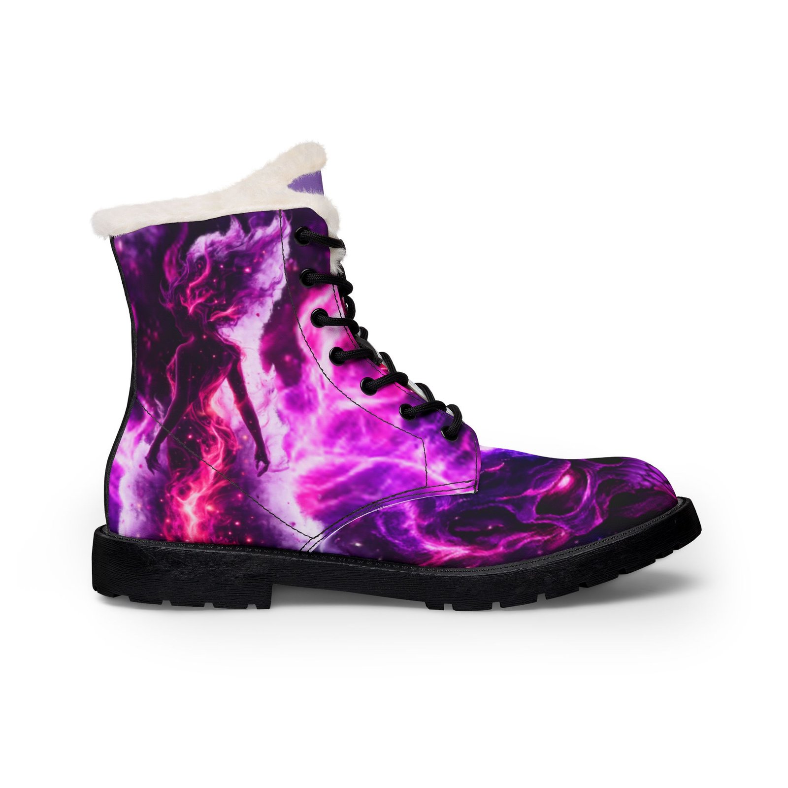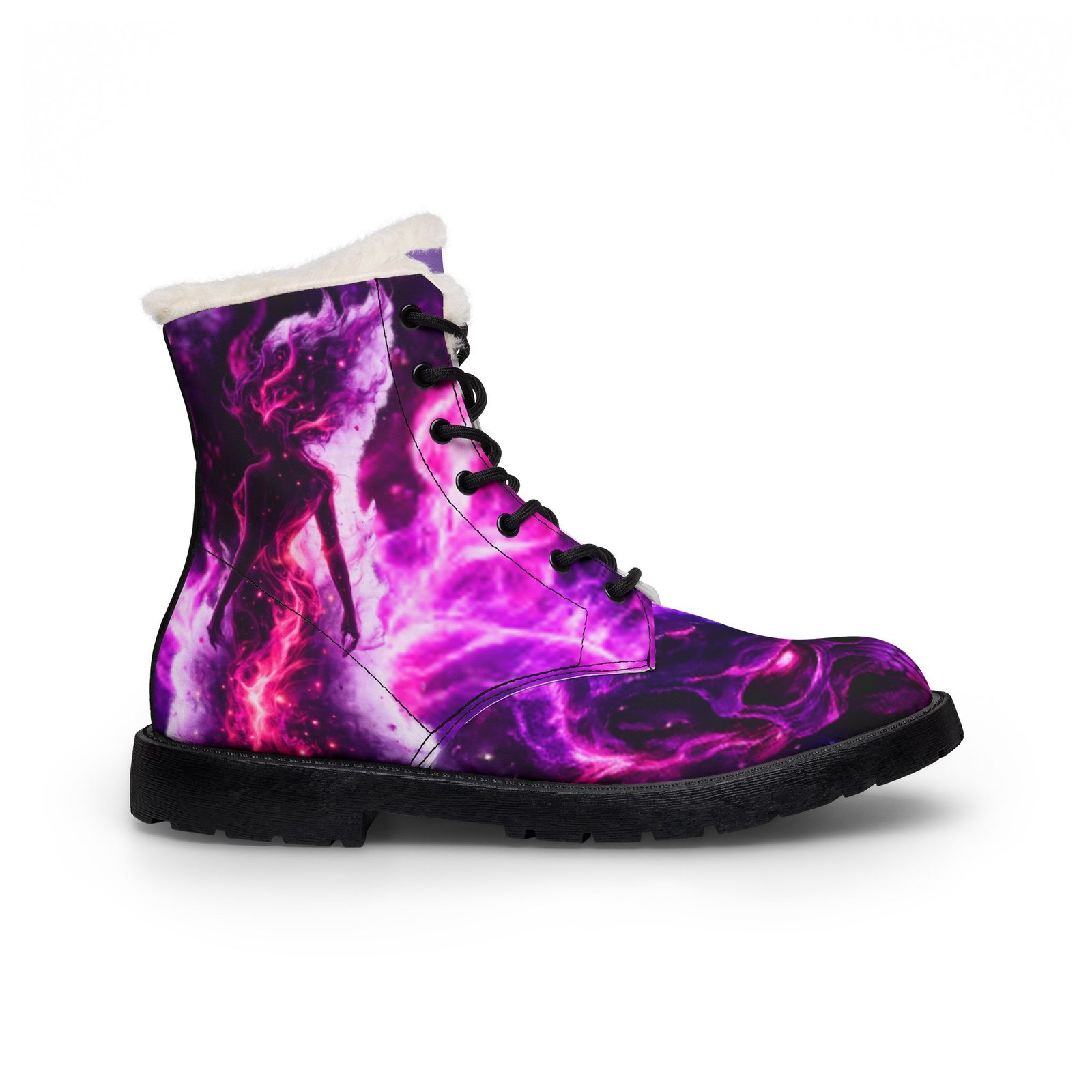 Step into bold warmth with these fur-lined leather boots, where vibrant, cosmic swirls meet practical everyday wear. The plush fleece interior cushions your feet while locking in heat on chilly walks. A durable microfiber upper showcases the intense purple nebula print with vivid, high-resolution color—made possible by eco-friendly, vegan-friendly leather fabric that holds the design beautifully. The sturdy PVC outsole grips wet or slick surfaces and stands up to both street and light outdoor use. These boots pair with layered winter looks, late-night outings, or creative closet statements when you want color and comfort to speak louder than words.