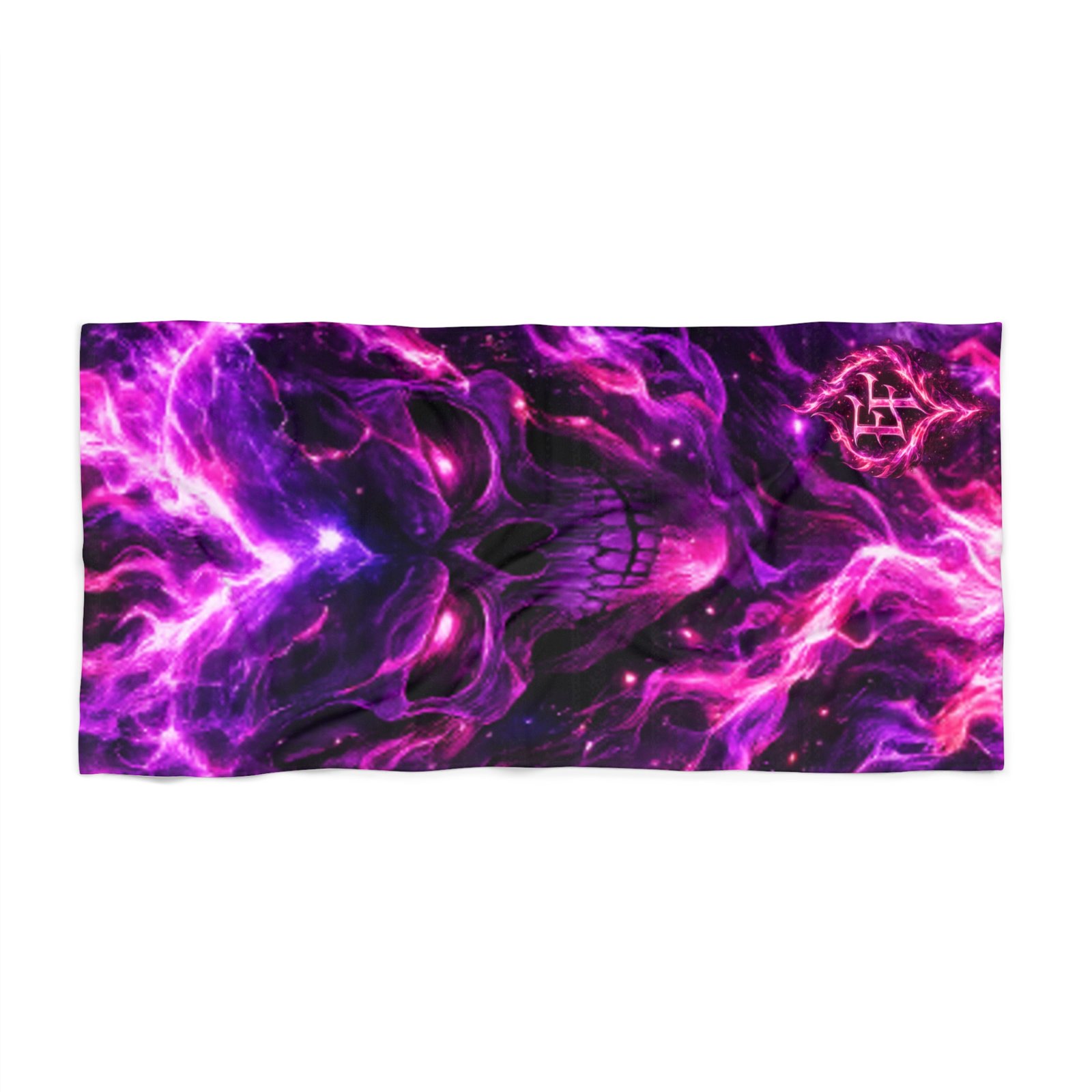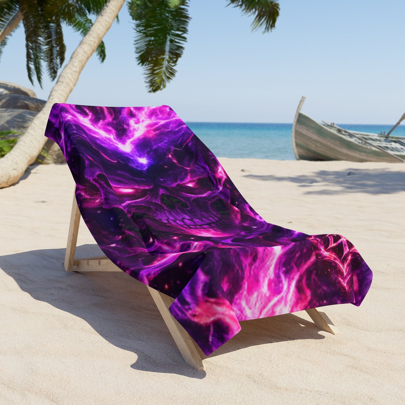A bold, high-energy beach towel that reads like a neon storm on sand. Vivid magenta and purple swirls form smoky, electric waves around a subtle skull motif—edgy, atmospheric, and unmistakable from a distance. Lightweight polyester print on the front keeps colors intense and resistant to fading, while a soft cotton loop backing soaks up water and feels gentle against sun-warmed skin. Choose the shorter 30″×60″ for poolside lounging or the roomy 36″×72″ to stretch out and make a statement. This towel brings late-night synthwave vibes to daytime beach rituals—perfect for people who favor dramatic color, striking contrasts, and a slightly rebellious aesthetic.