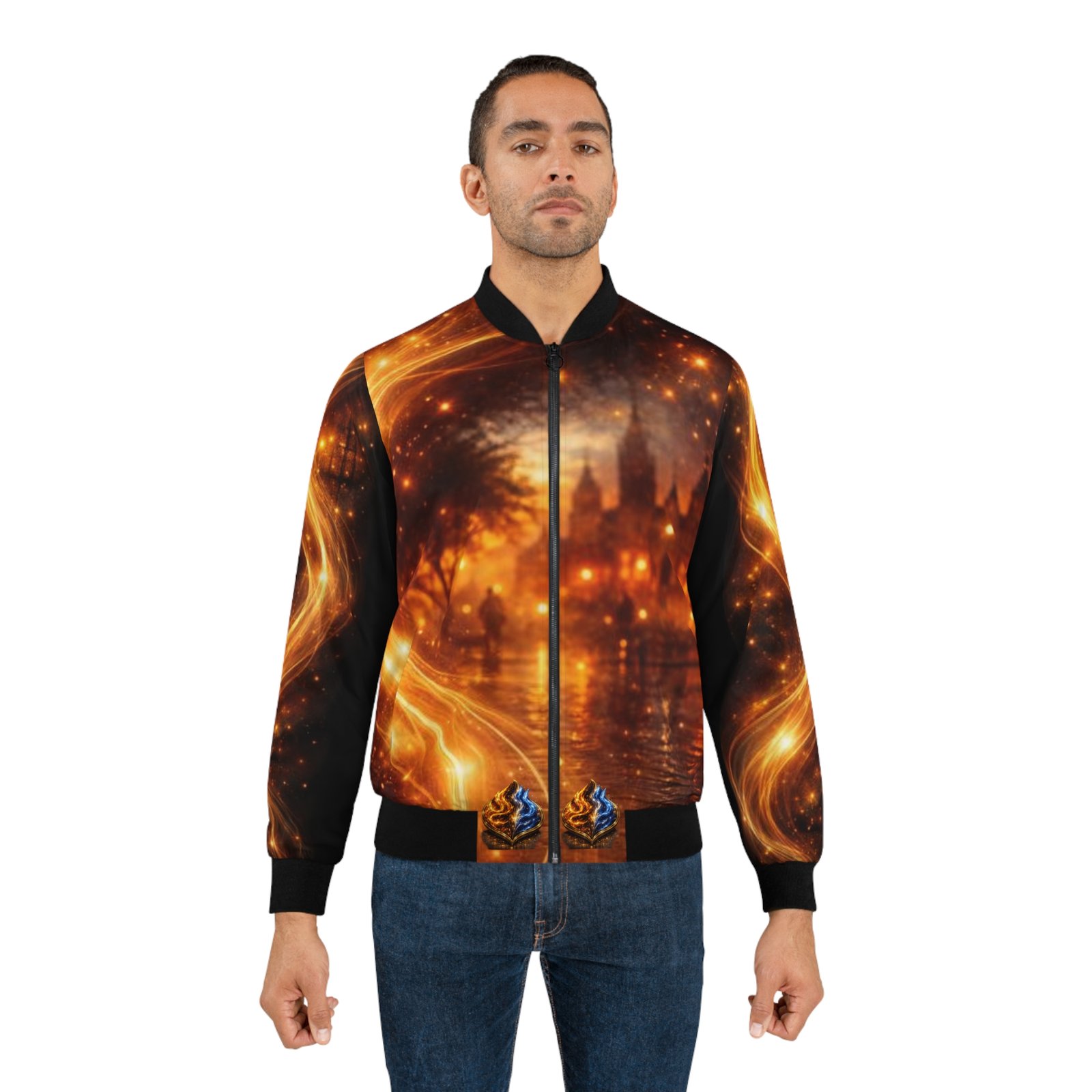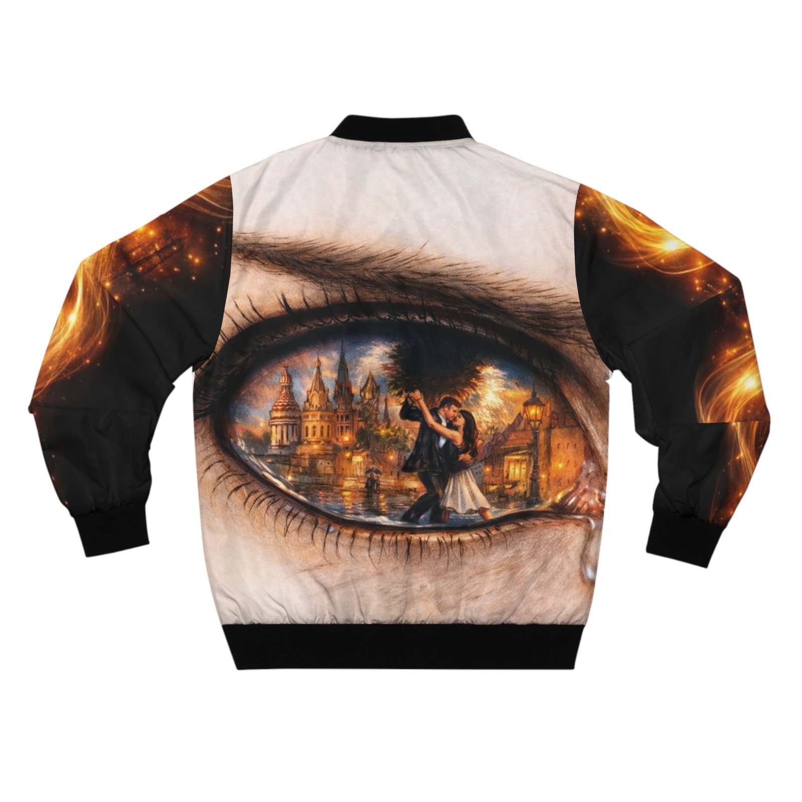 This bomber jacket carries a story across every panel — warm amber lights, swirling golden flares, and a romantic city scene captured inside the reflection of an eye. Wear it when you want an outer layer that feels cinematic and intimate: it reads like a night of lantern-lit streets and whispered dances by the water. The smooth polyester holds the rich, all-over print so the glow and fine details stay vivid. Black rib-knit cuffs and hem give structure to the flowing design, while a full metal zipper and lined pockets make it practical for nights out or slow, wandering walks through city squares.