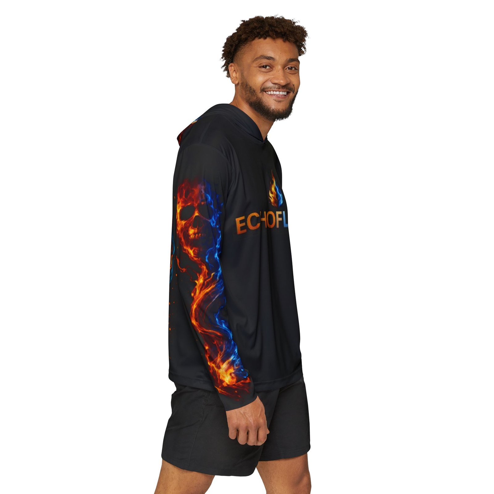 This lightweight sports warmup hoodie brings heat and motion to practice and streetwear alike. The all-over design pairs electric blue and molten orange flames with a bold skull motif and the word ECHOFLAME across the chest and hood — a look that reads as high-energy, rebellious, and fiercely focused. Built from quick-drying, moisture-wicking polyester, the hoodie stays light during intense drills and long warmups while offering UPF 50 sun protection for outdoor sessions. The printed interior care label and matched seam thread keep the silhouette clean. Wear it to signal intensity at the gym, stand out at late-night skate sessions, or layer for chilly outdoor runs — it moves with you, dries fast, and keeps the fiery energy visible.