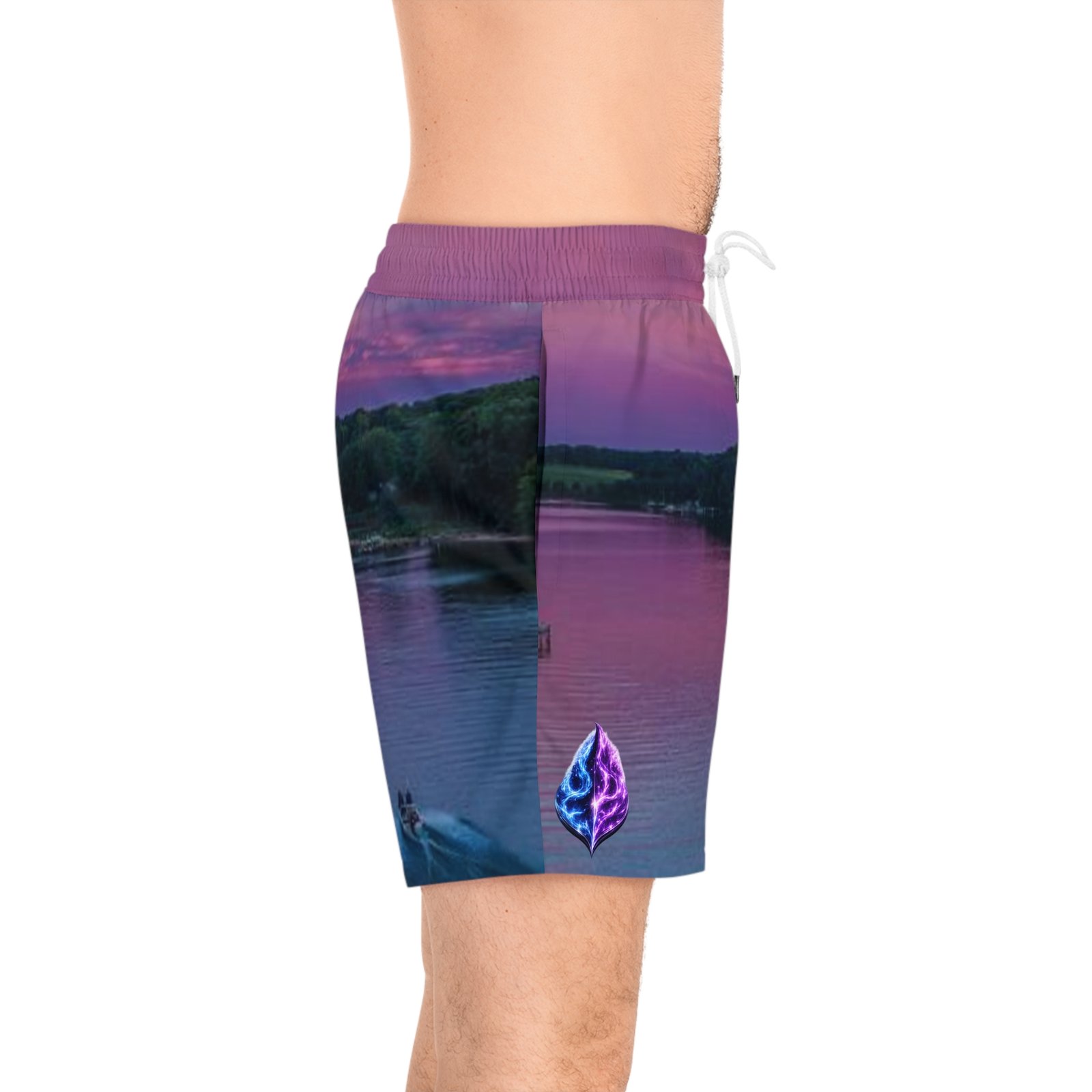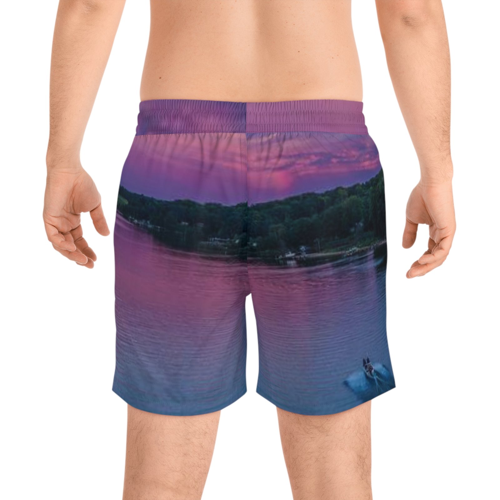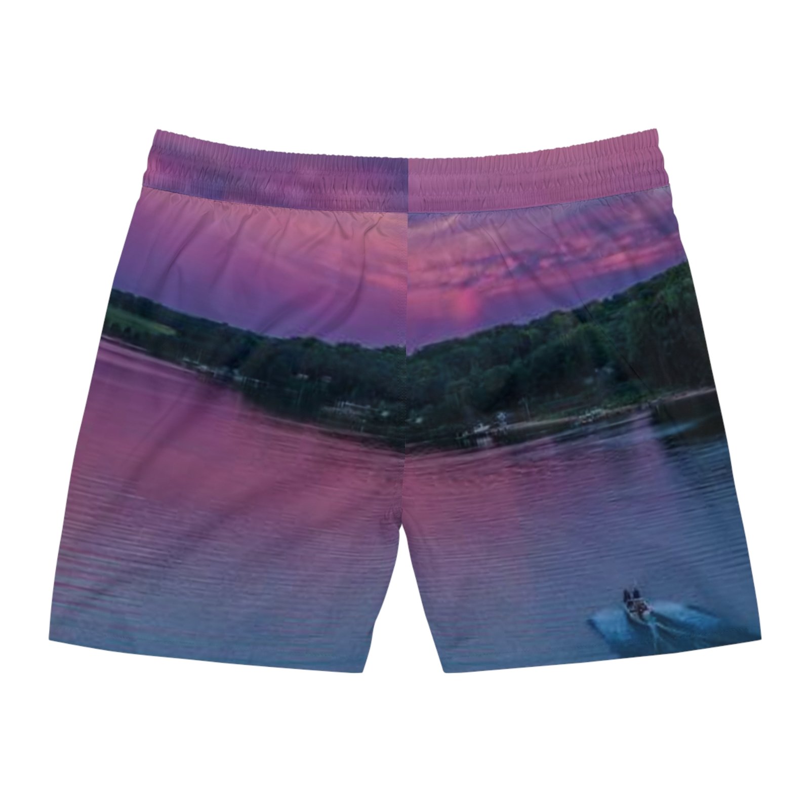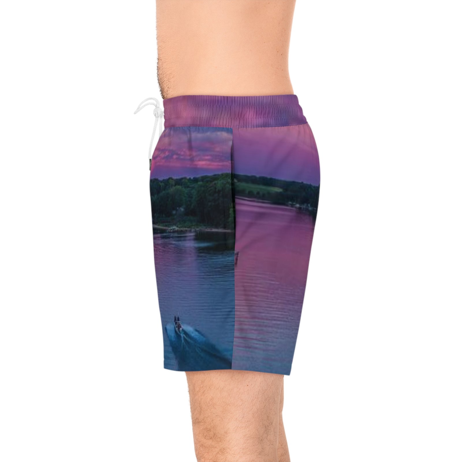 A pair of mid-length swim shorts printed all-over with a tranquil lakeside sunset in shades of pink and indigo. The shorts sit at mid-thigh, with an elastic drawstring waist and a soft inner mesh brief for comfortable coverage during long days on the water. Two mesh side pockets keep essentials close, while the lightweight polyester-spandex knit moves with you whether you’re paddling, jogging along the shore, or winding down at a lakeside fire. Small, subtle details — like matched seam thread and clean black or white drawstrings — keep the look polished so these shorts transition easily from active swims to relaxed evenings watching the sky shift color. Product features – 95% polyester, 5% spandex knit — soft, lightweight, and slightly stretchy – Elastic waistband with adjustable drawstring (black or white) for a secure fit – Inner mesh brief for comfortable coverage – Two side-entry mesh pockets for small essentials – All-over printed design with matched seam thread for a seamless look Care instructions – Do not dryclean – Do not iron – Tumble dry: low heat – Do not bleach – Machine wash: cold (max 30C or 90F)